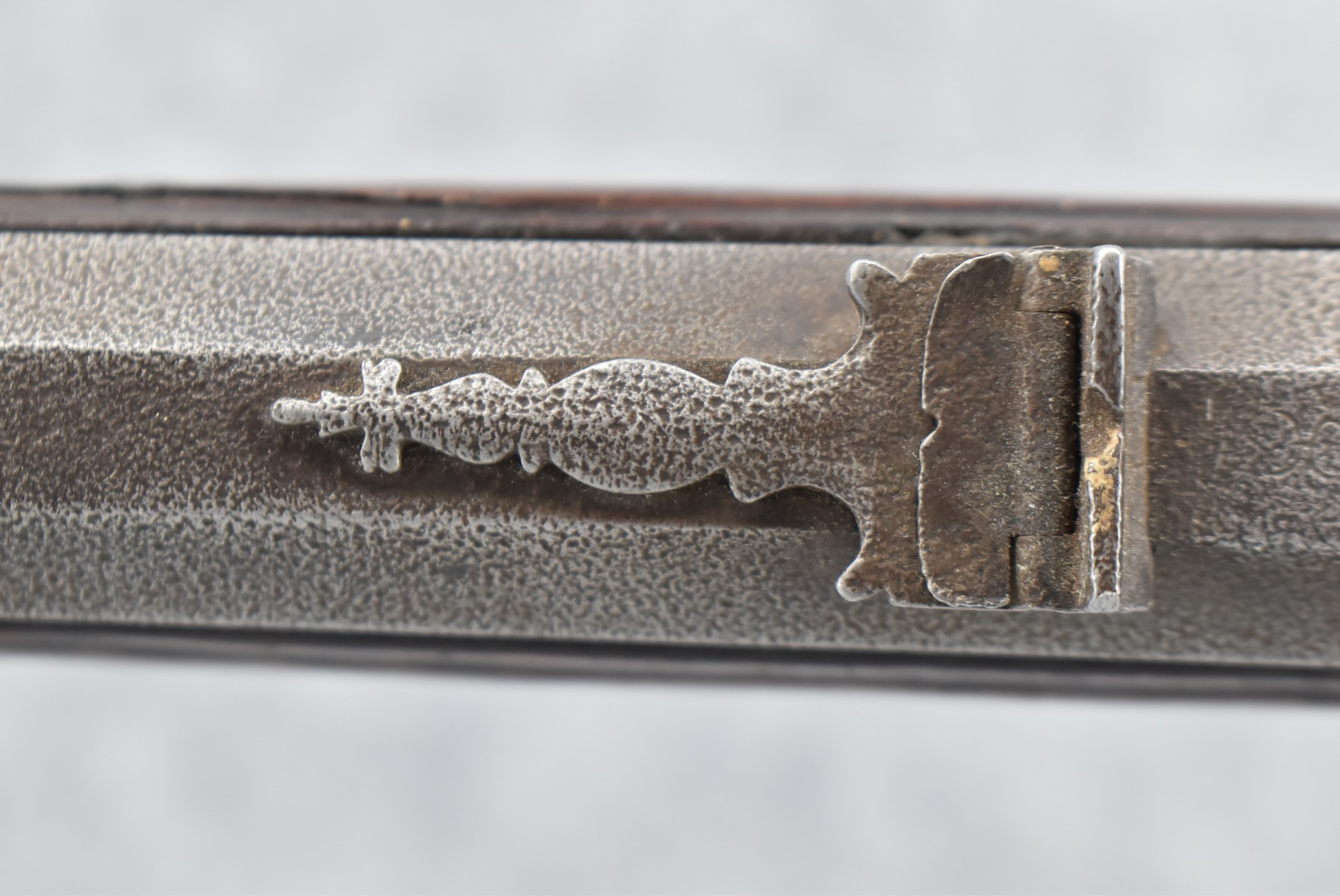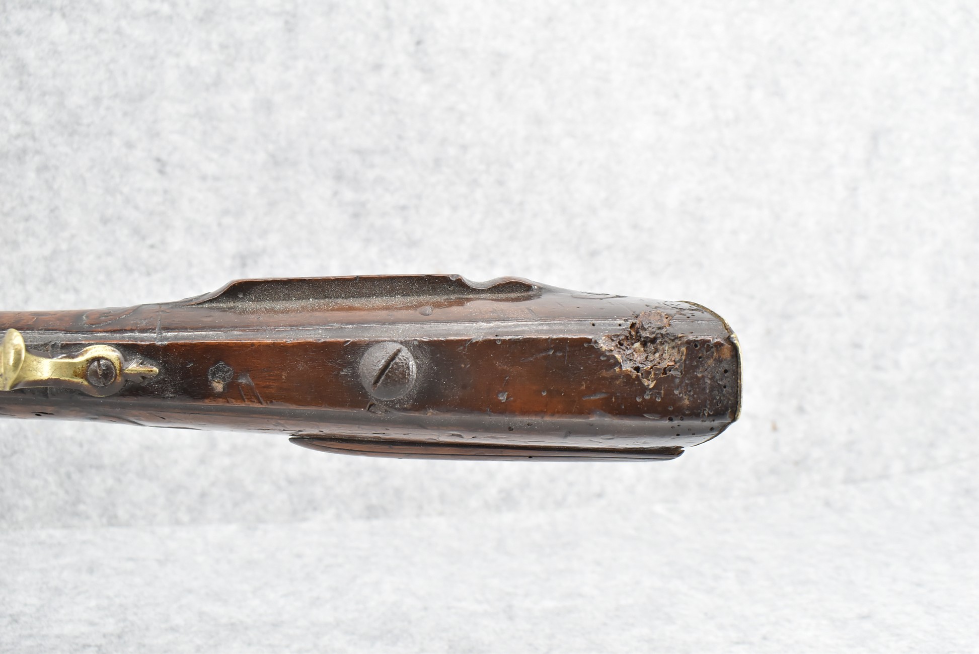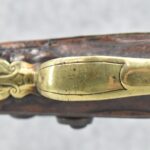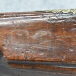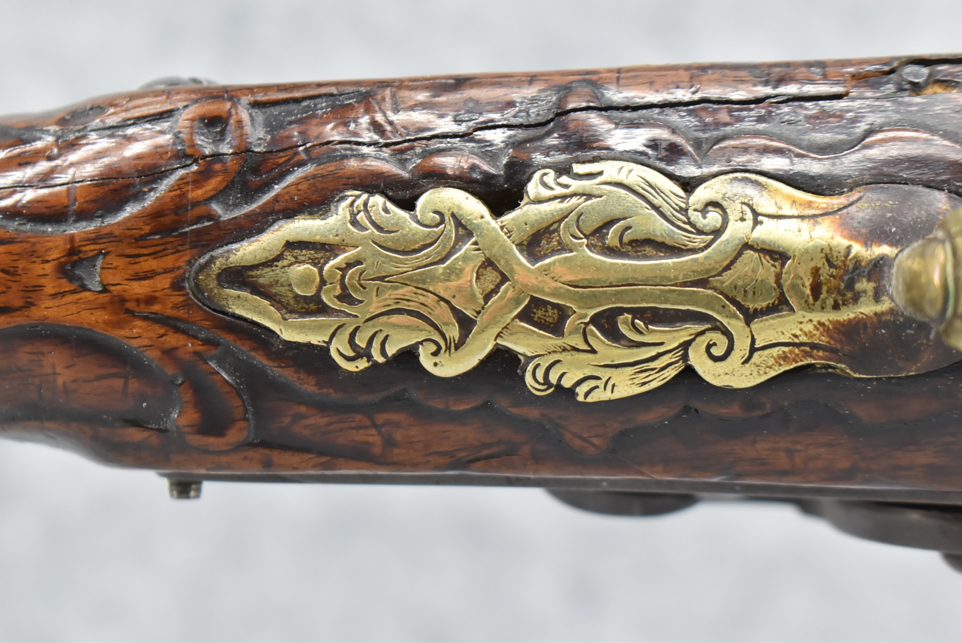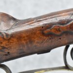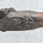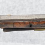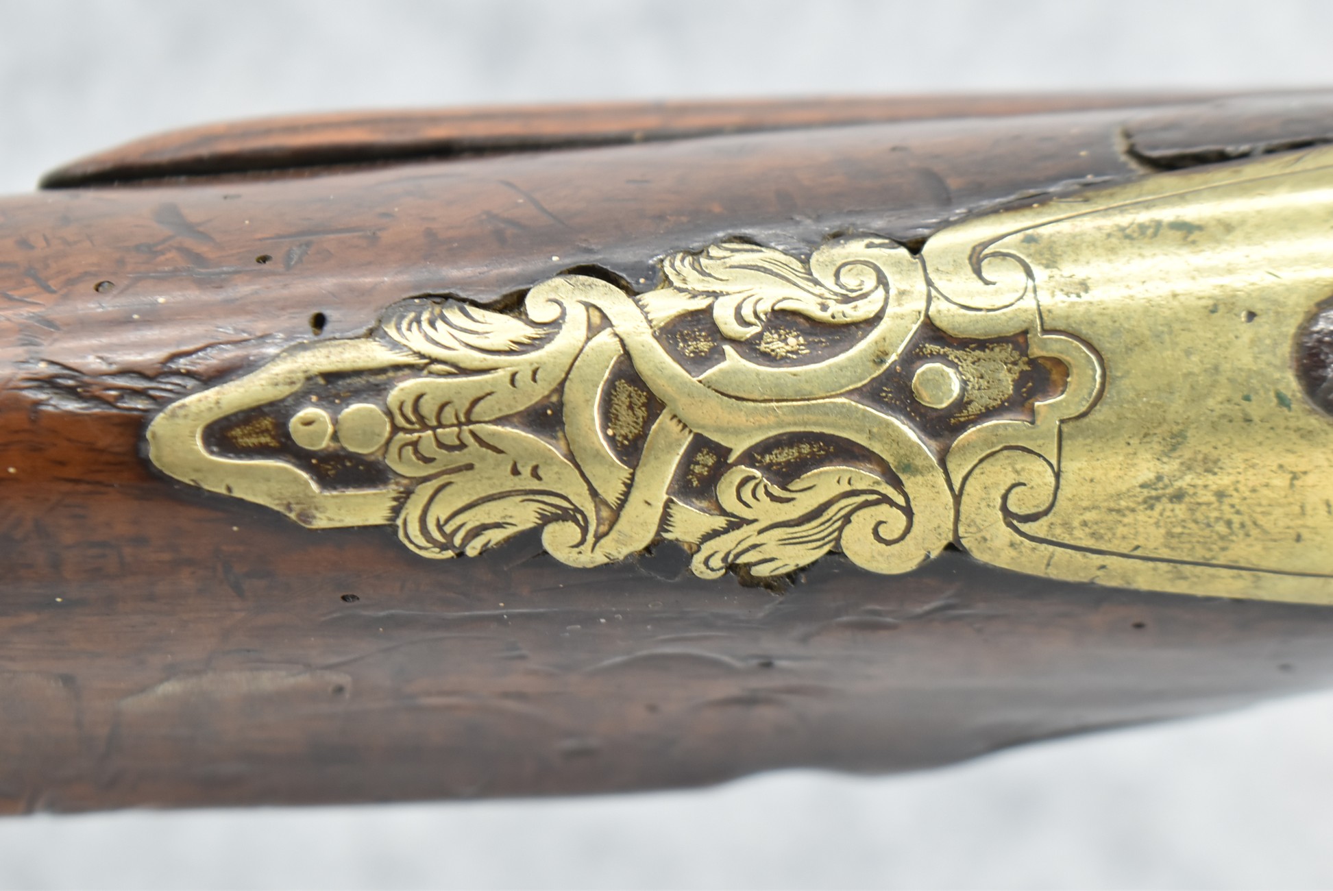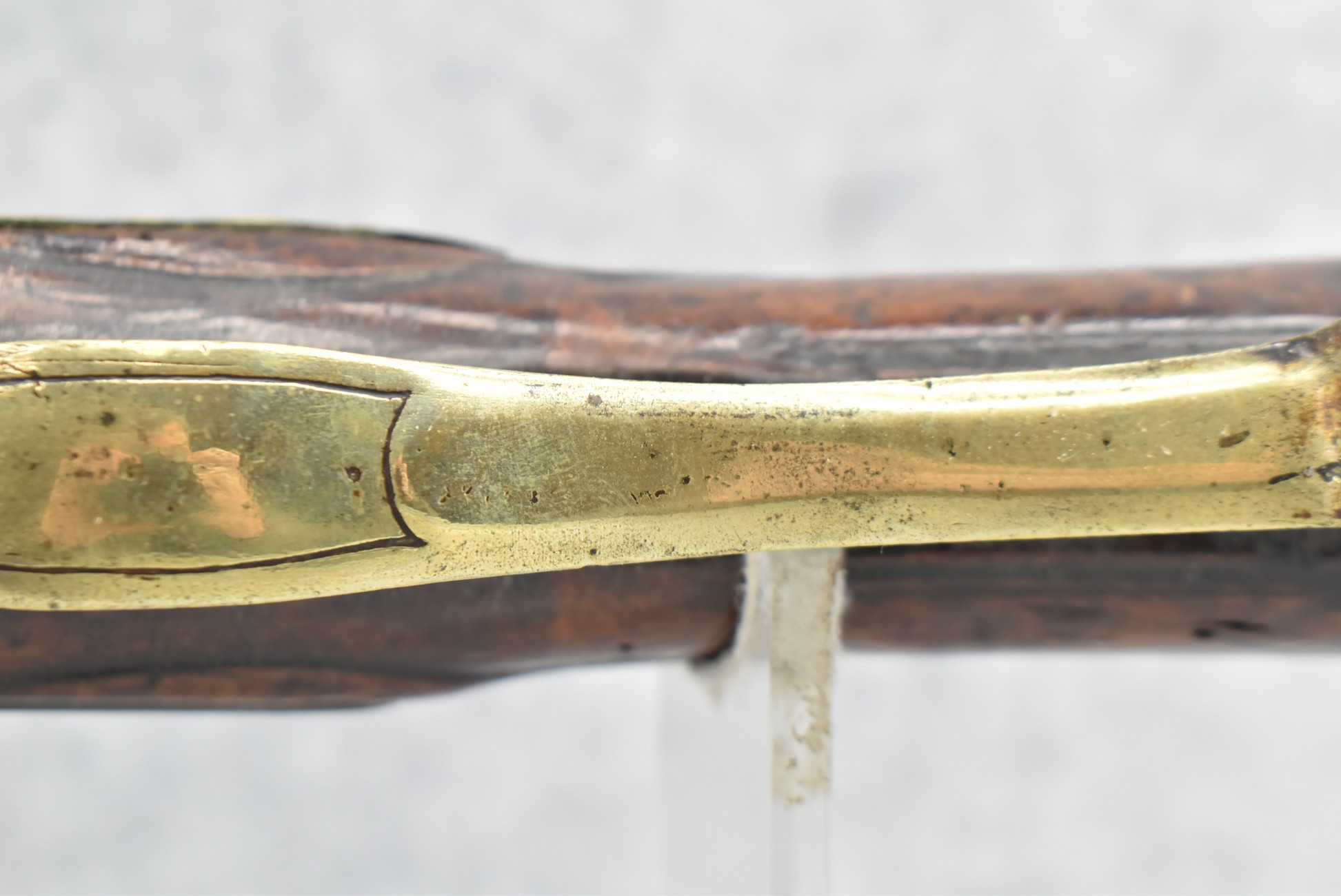 139. Early Antique 65 Cal. Very Ornate Percussion Black Powder Rifle – w/28” Octagon Barrel w/Front & Ornate Rear Barrel Sights – w/Relief Carved Full Wood Stock w/Sliding Wood Door Patch Box w/Brass Furniture – w/Double Set Triggers – w/Ram Rod – No Mfg. Marking