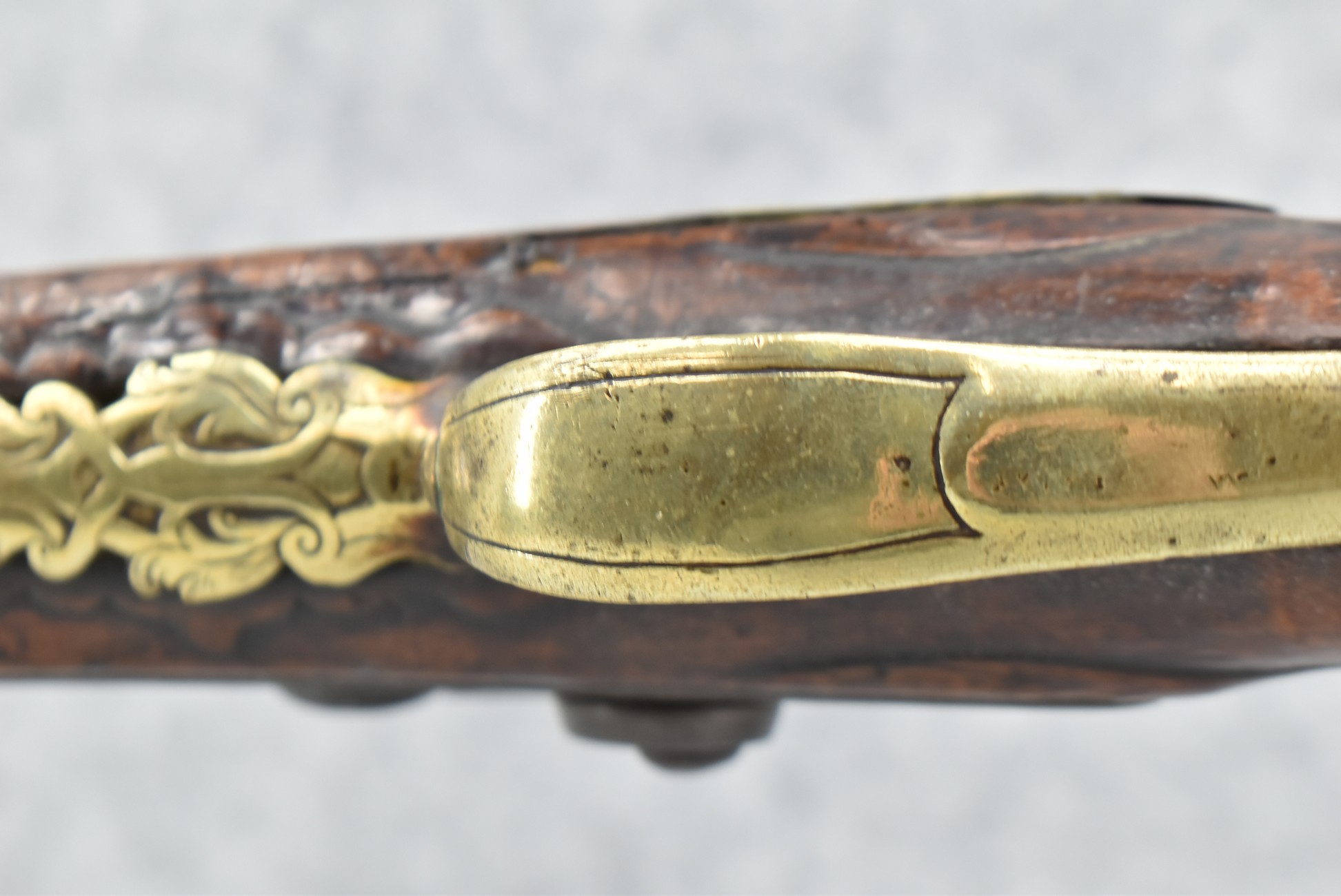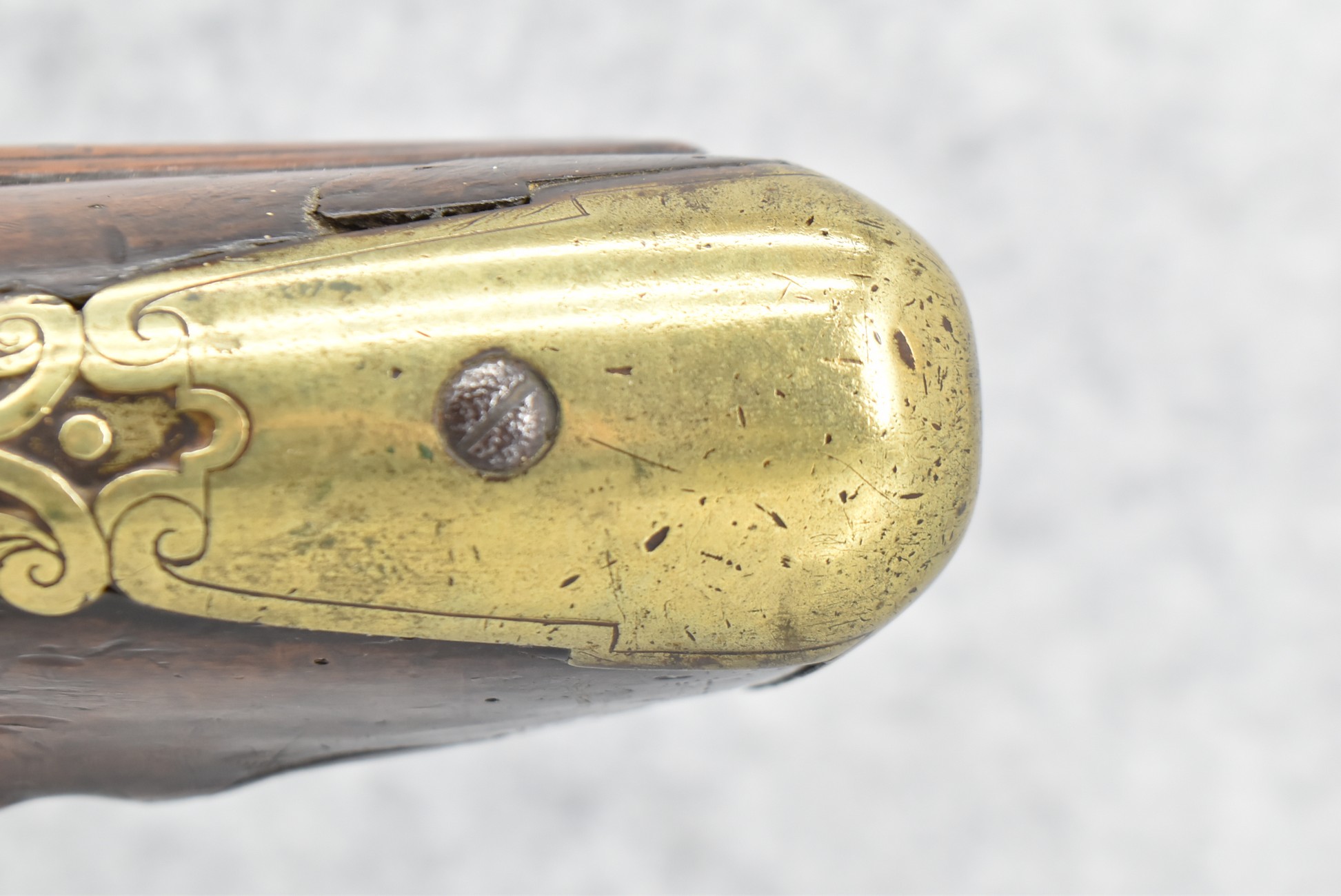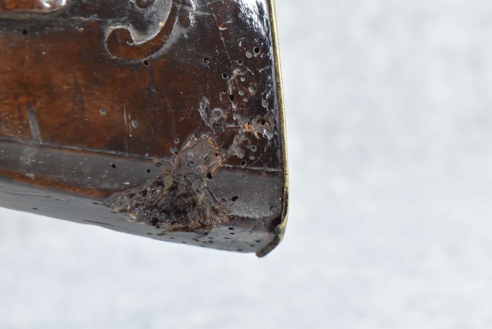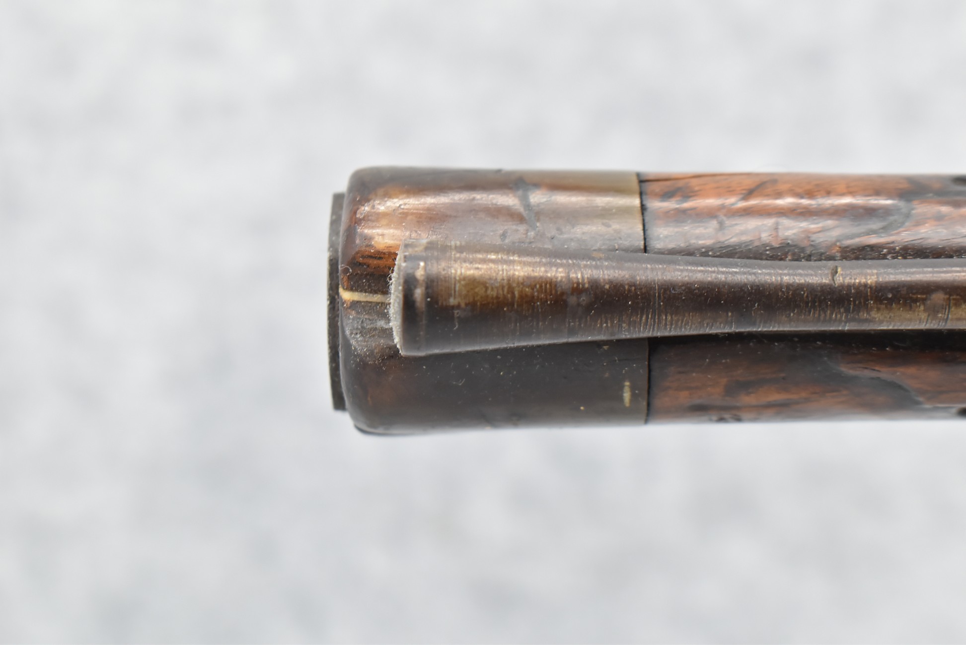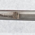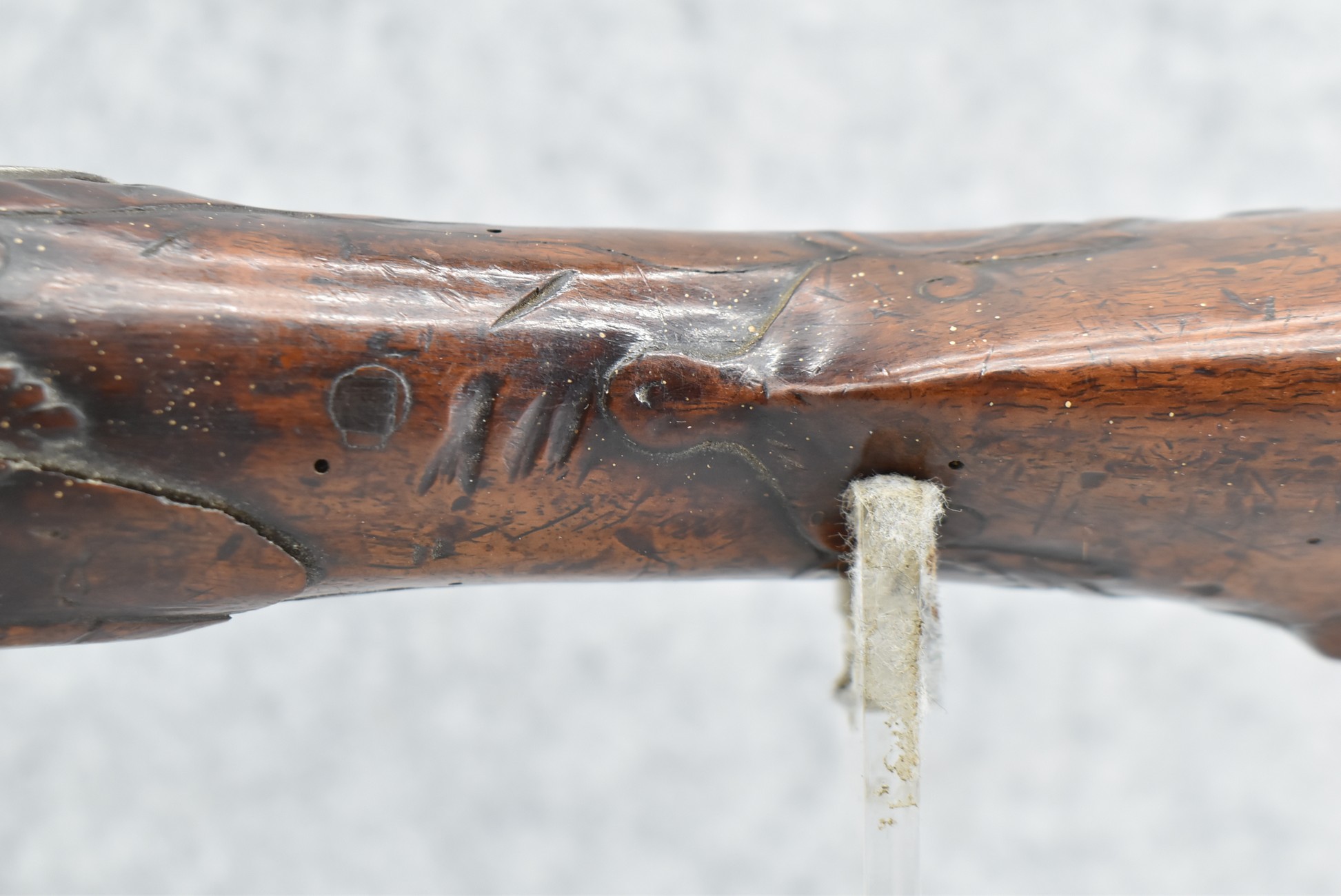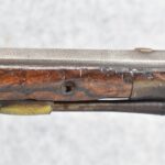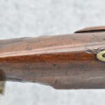 139. Early Antique 65 Cal. Very Ornate Percussion Black Powder Rifle – w/28” Octagon Barrel w/Front & Ornate Rear Barrel Sights – w/Relief Carved Full Wood Stock w/Sliding Wood Door Patch Box w/Brass Furniture – w/Double Set Triggers – w/Ram Rod – No Mfg. Marking