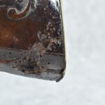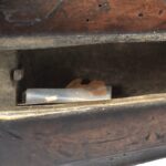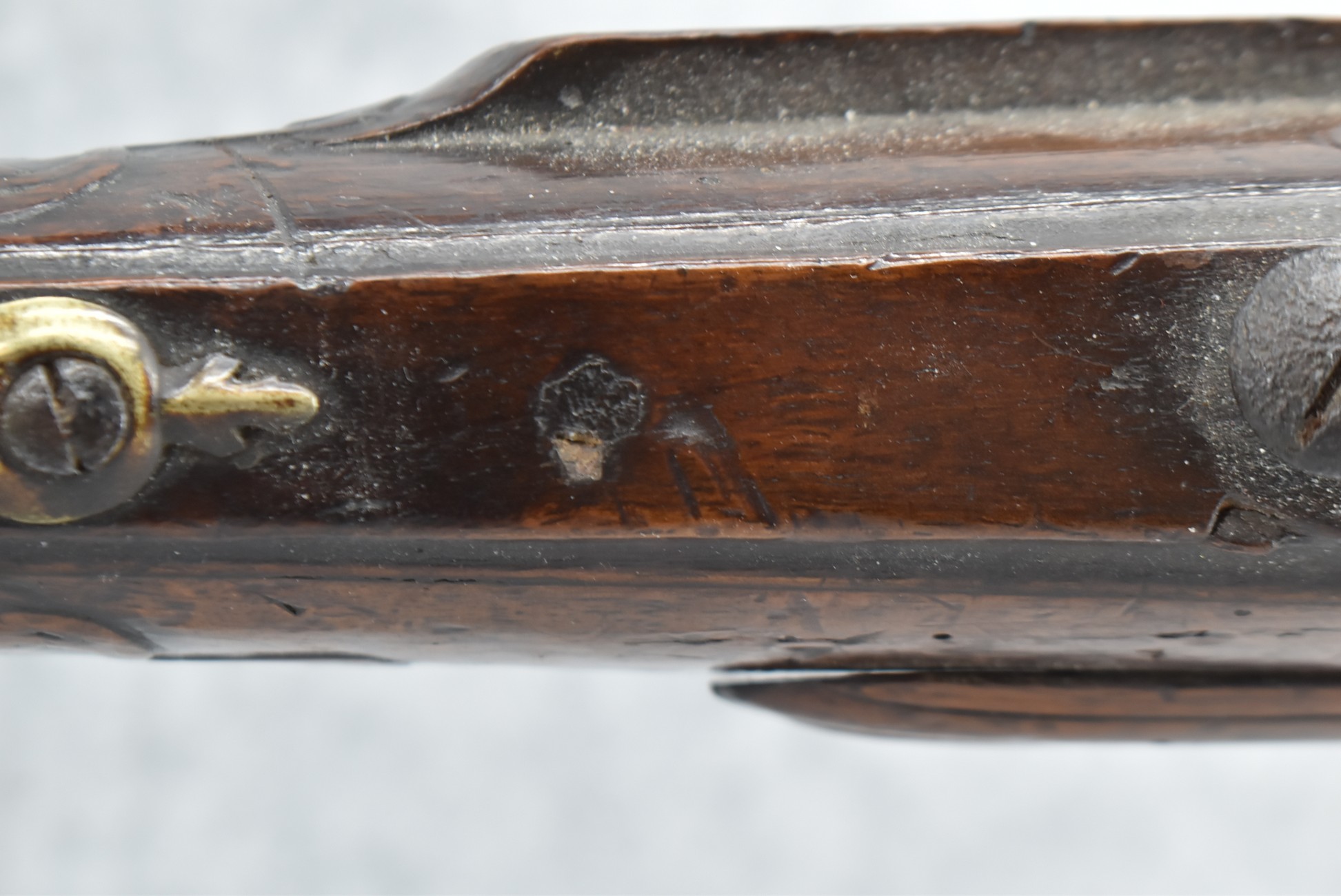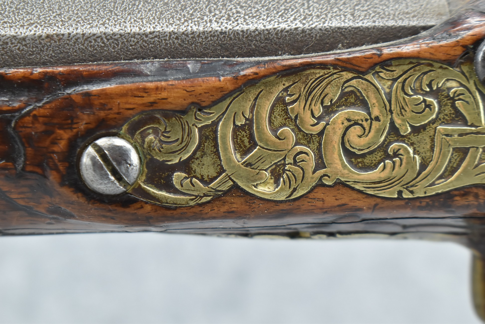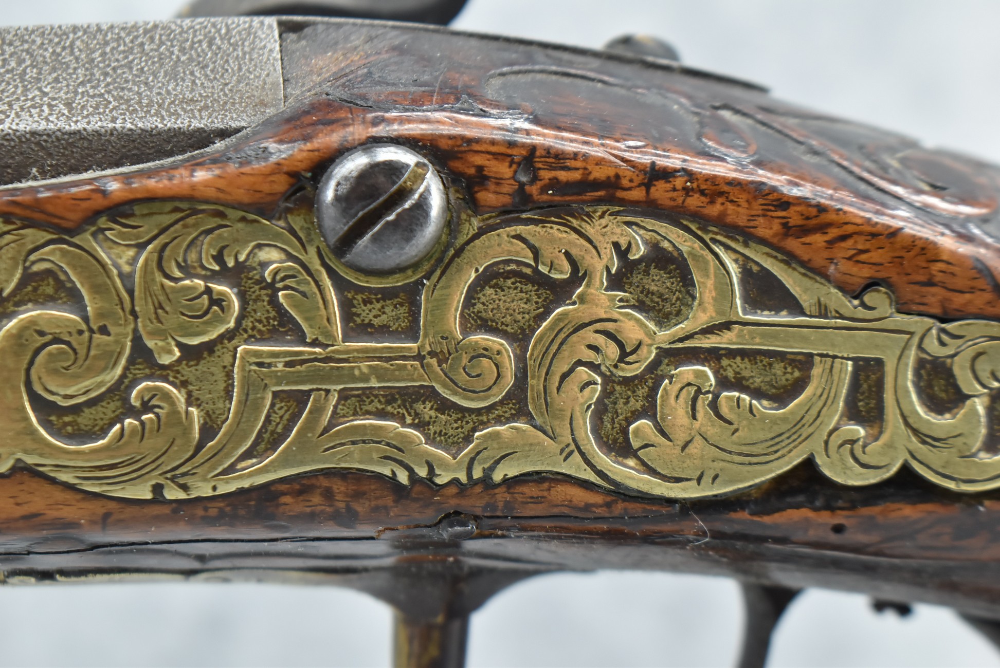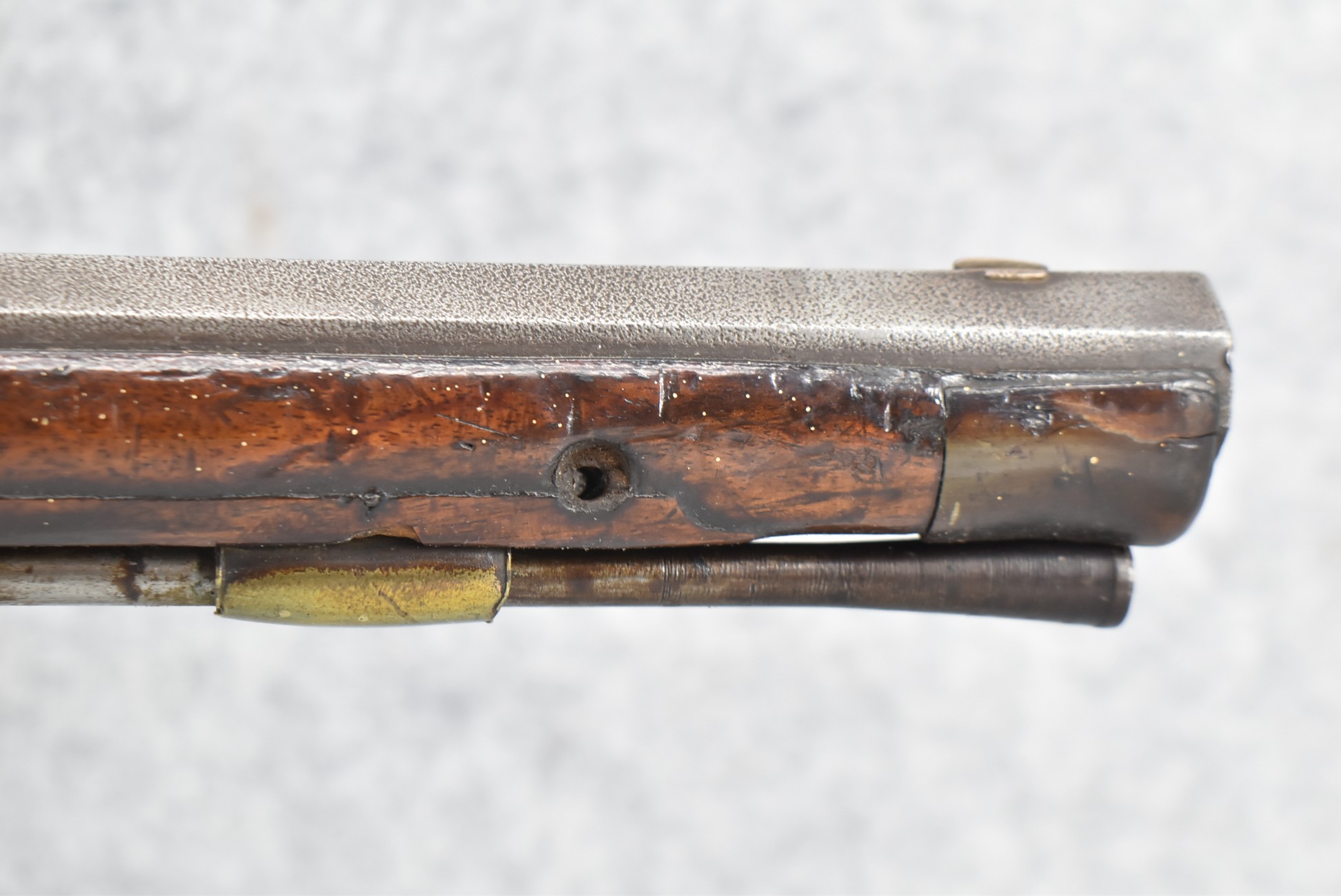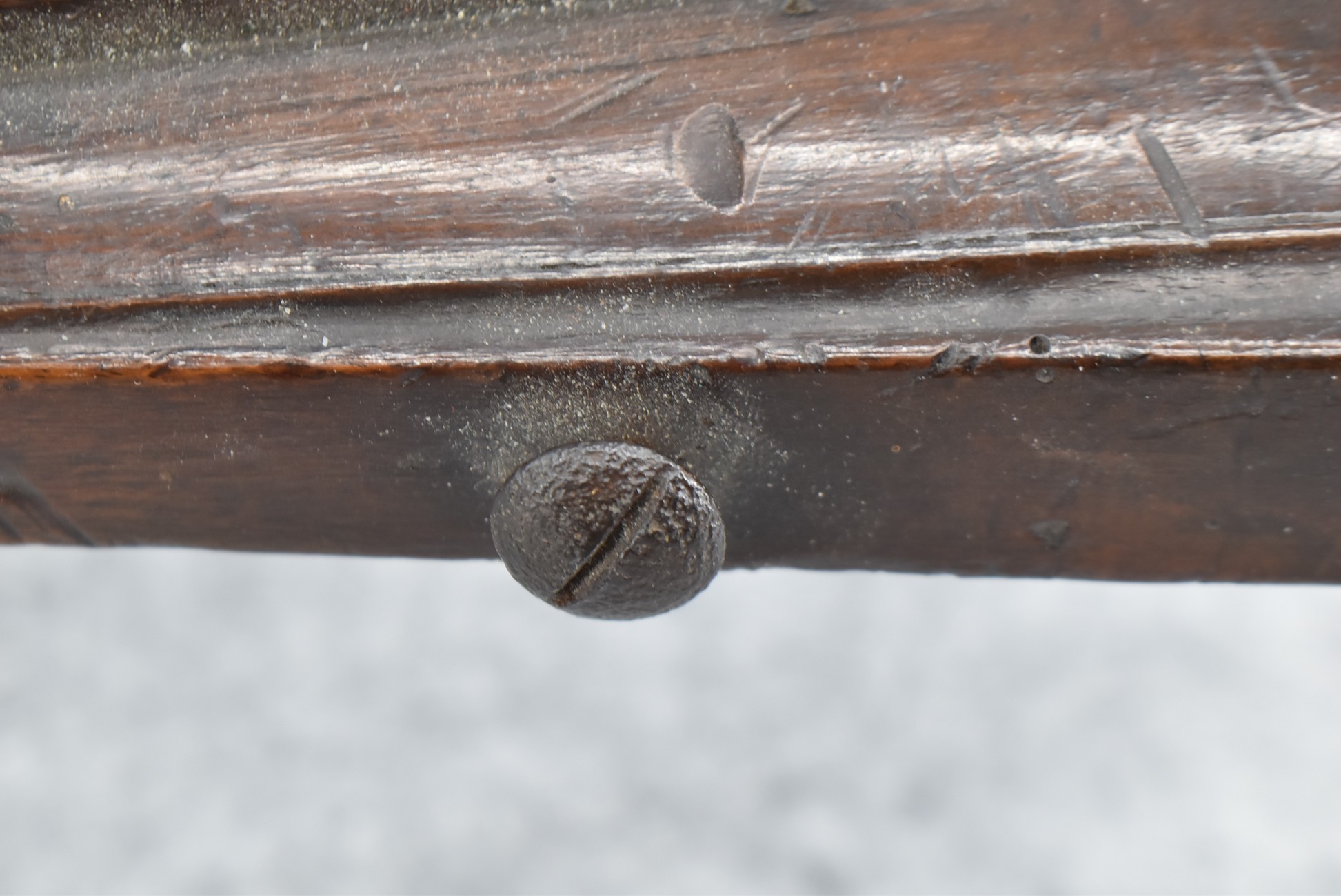139. Early Antique 65 Cal. Very Ornate Percussion Black Powder Rifle – w/28” Octagon Barrel w/Front & Ornate Rear Barrel Sights – w/Relief Carved Full Wood Stock w/Sliding Wood Door Patch Box w/Brass Furniture – w/Double Set Triggers – w/Ram Rod – No Mfg. Marking