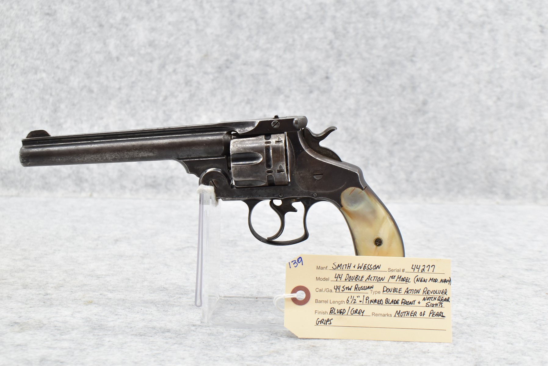 139. Smith & Wesson – Mod. 44 Double Action 1st Model (New Model Navy) – 44 S&W Russian Cal. Double Action Revolver – w/6 ½” Barrel w/Pinned Blade Front & Notch Rear Sights – Blued/Gray Finish – w/Mother of Pear Grips