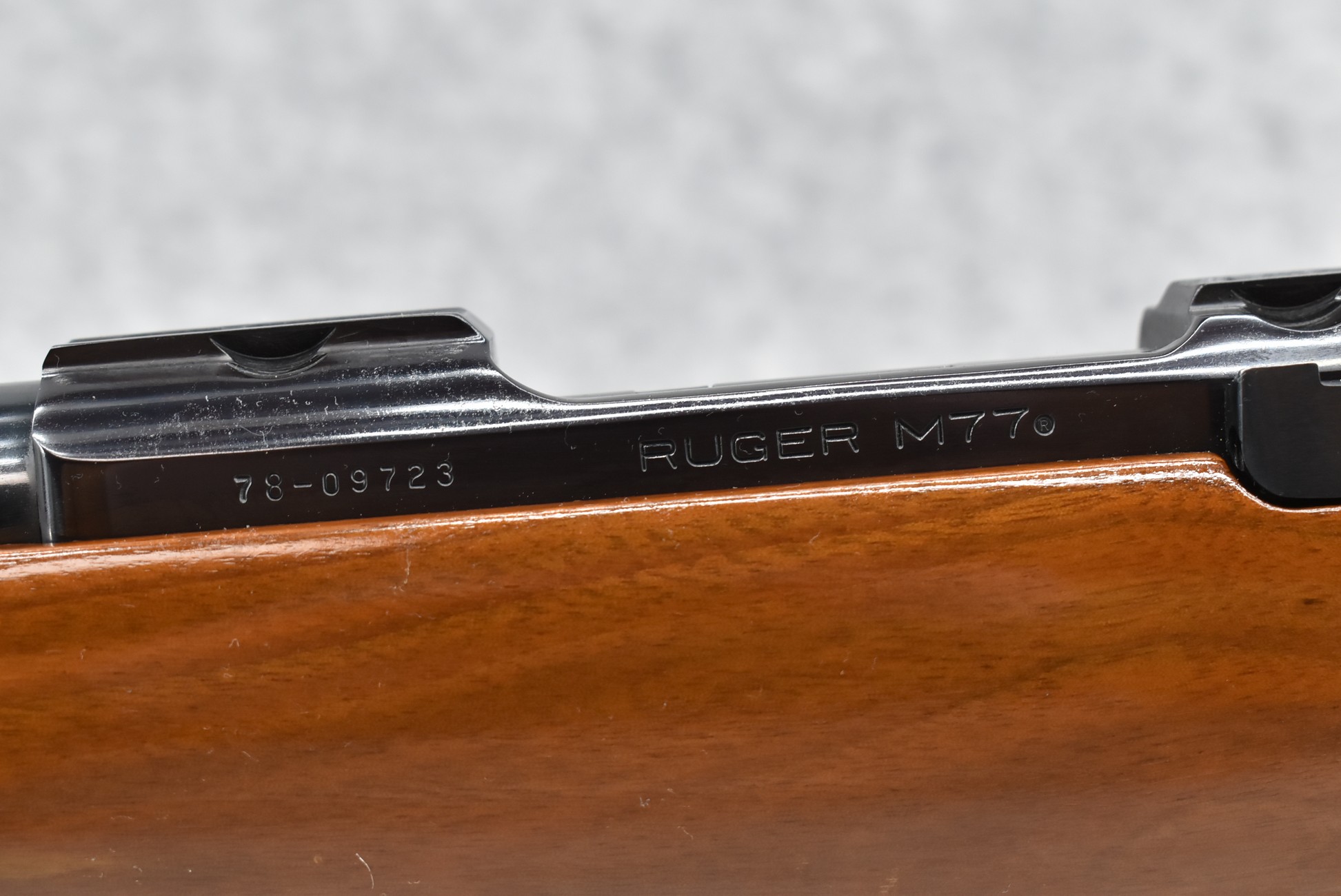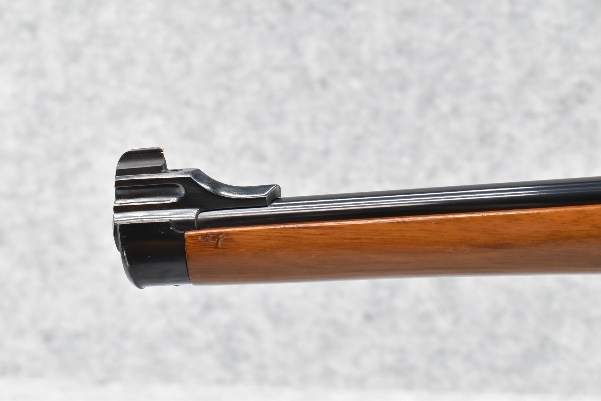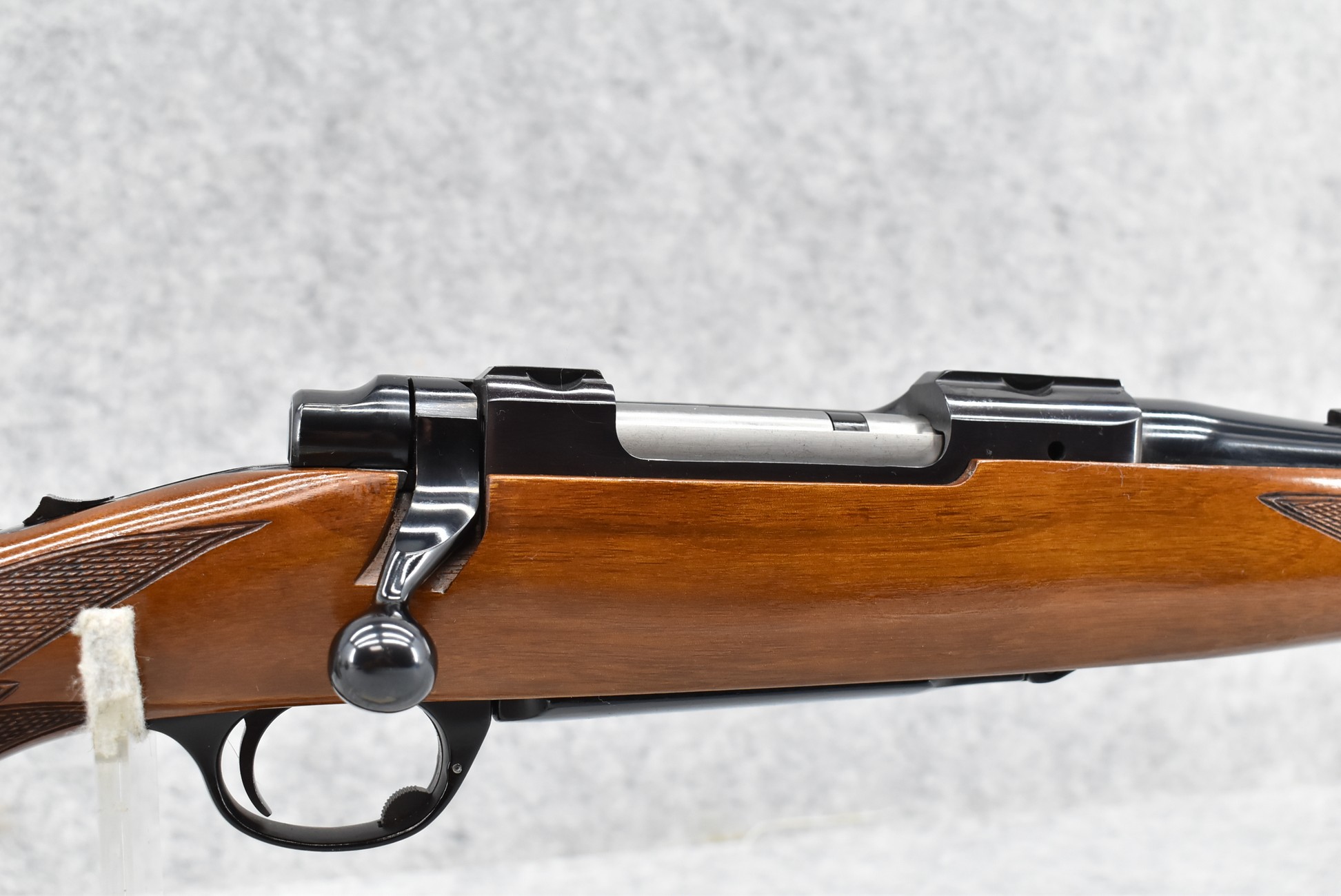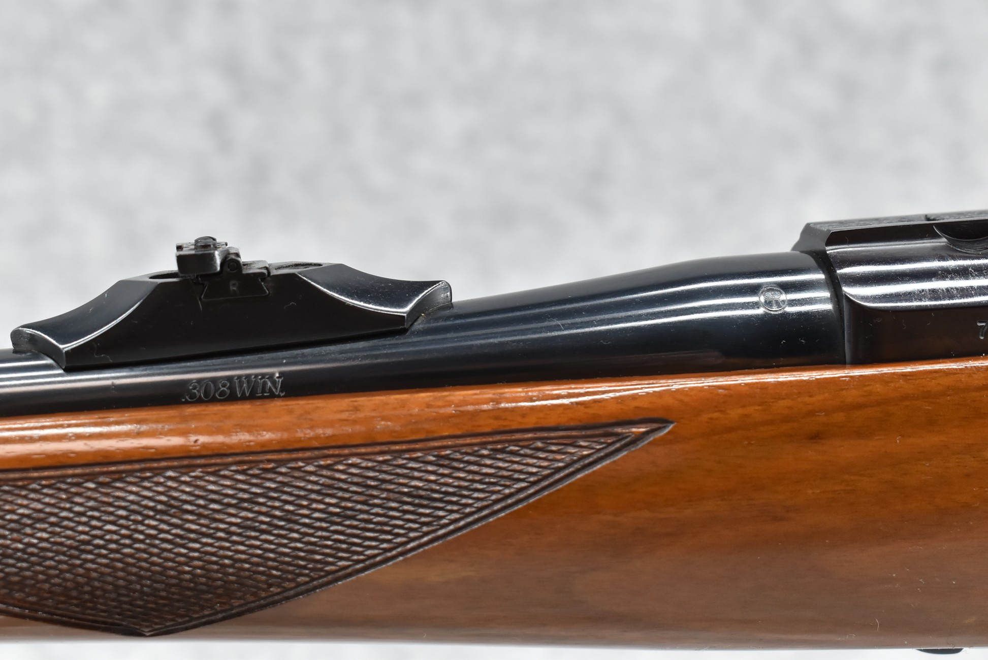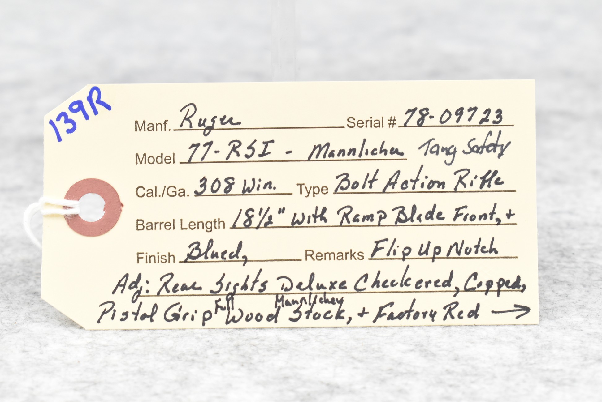 139R. Ruger – Mod. 77-RSI Mannlicher Tang Safety – 308 Win. Cal. Bolt Action Rifle – w/18 ½” Barrel w/Ramp Blade Front & Flip Up Notch Adj. Rear Sights – Blued Finish – w/Deluxe Checkered capped Pistol Grip Full Wood Mannlicher Stock w/Factory Butt Pad