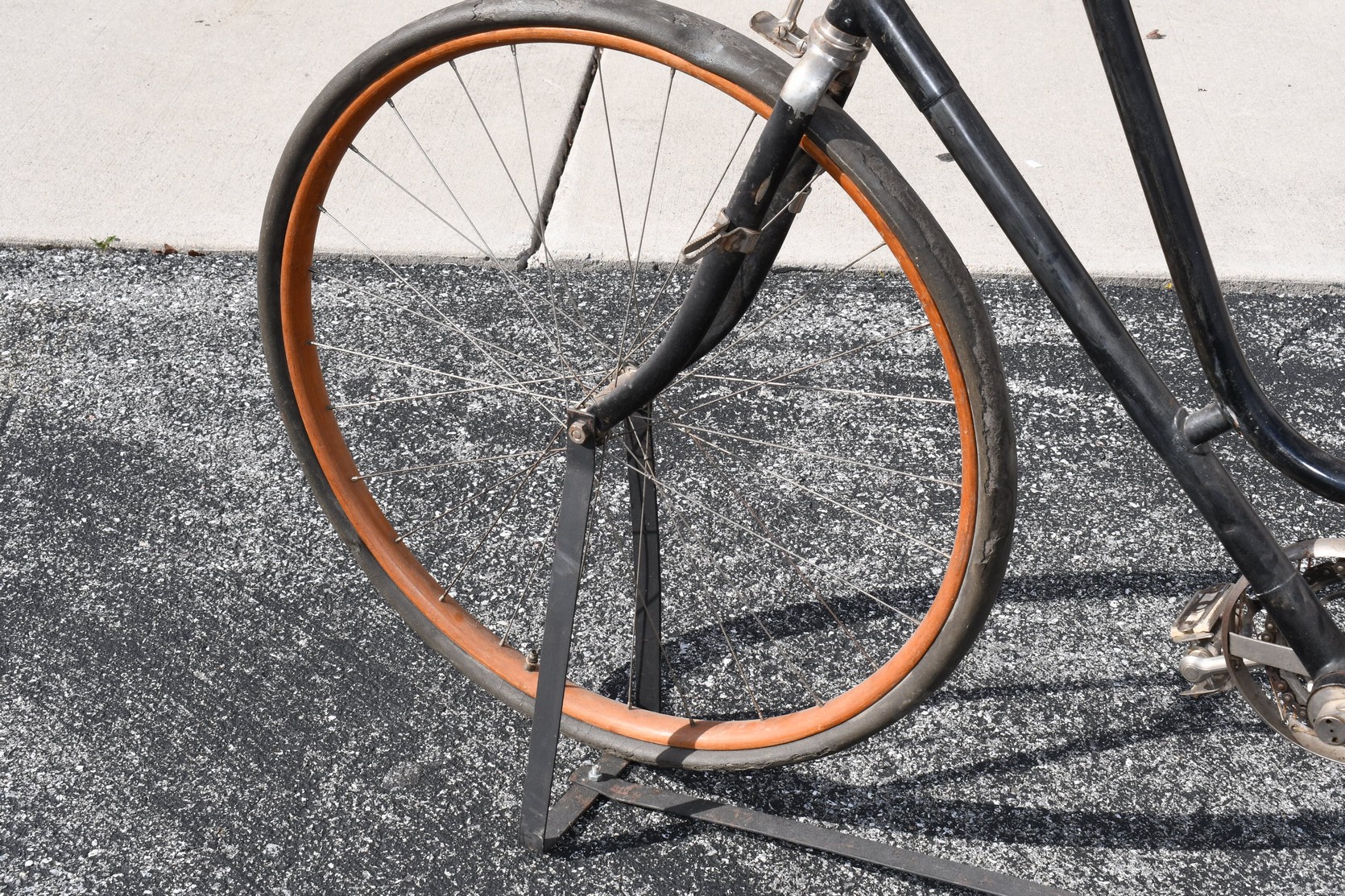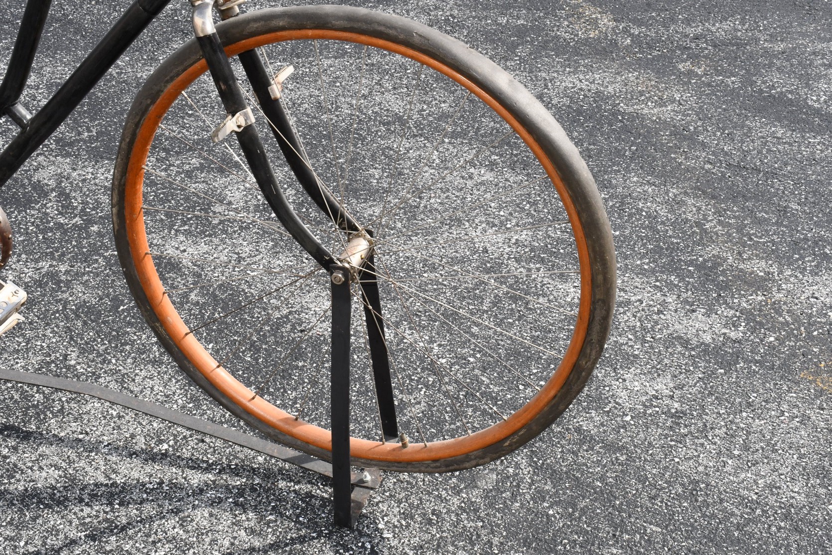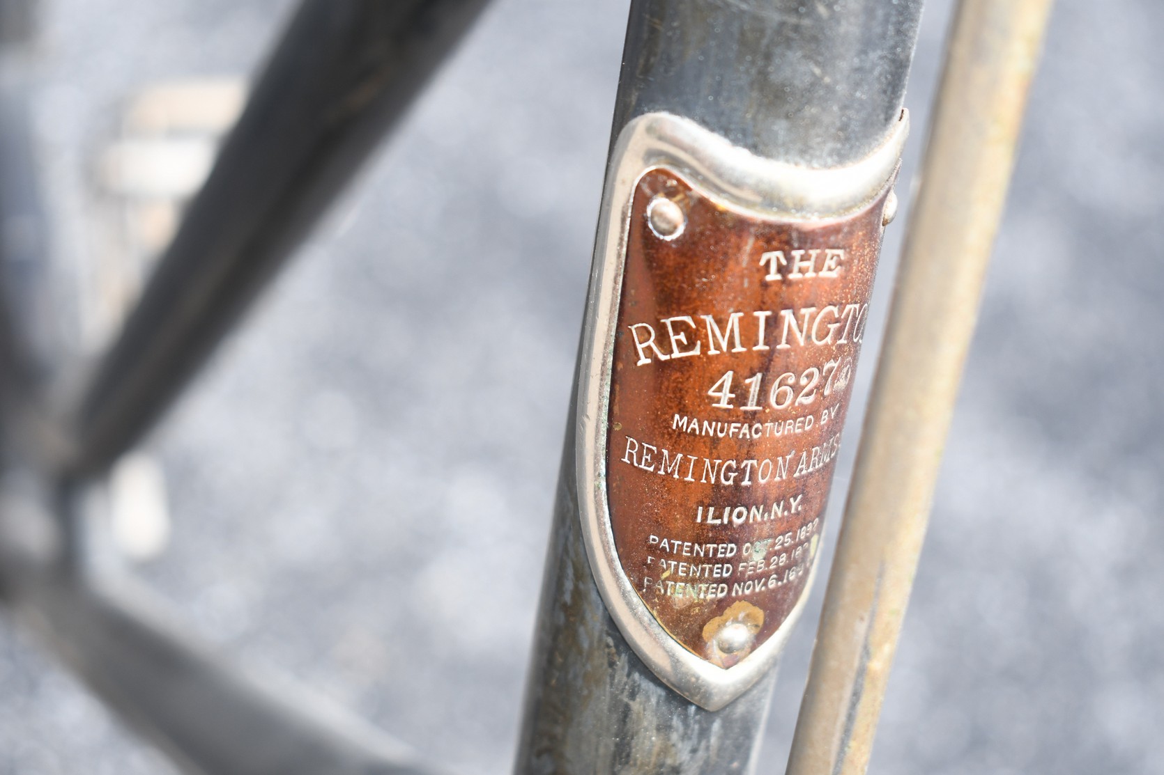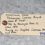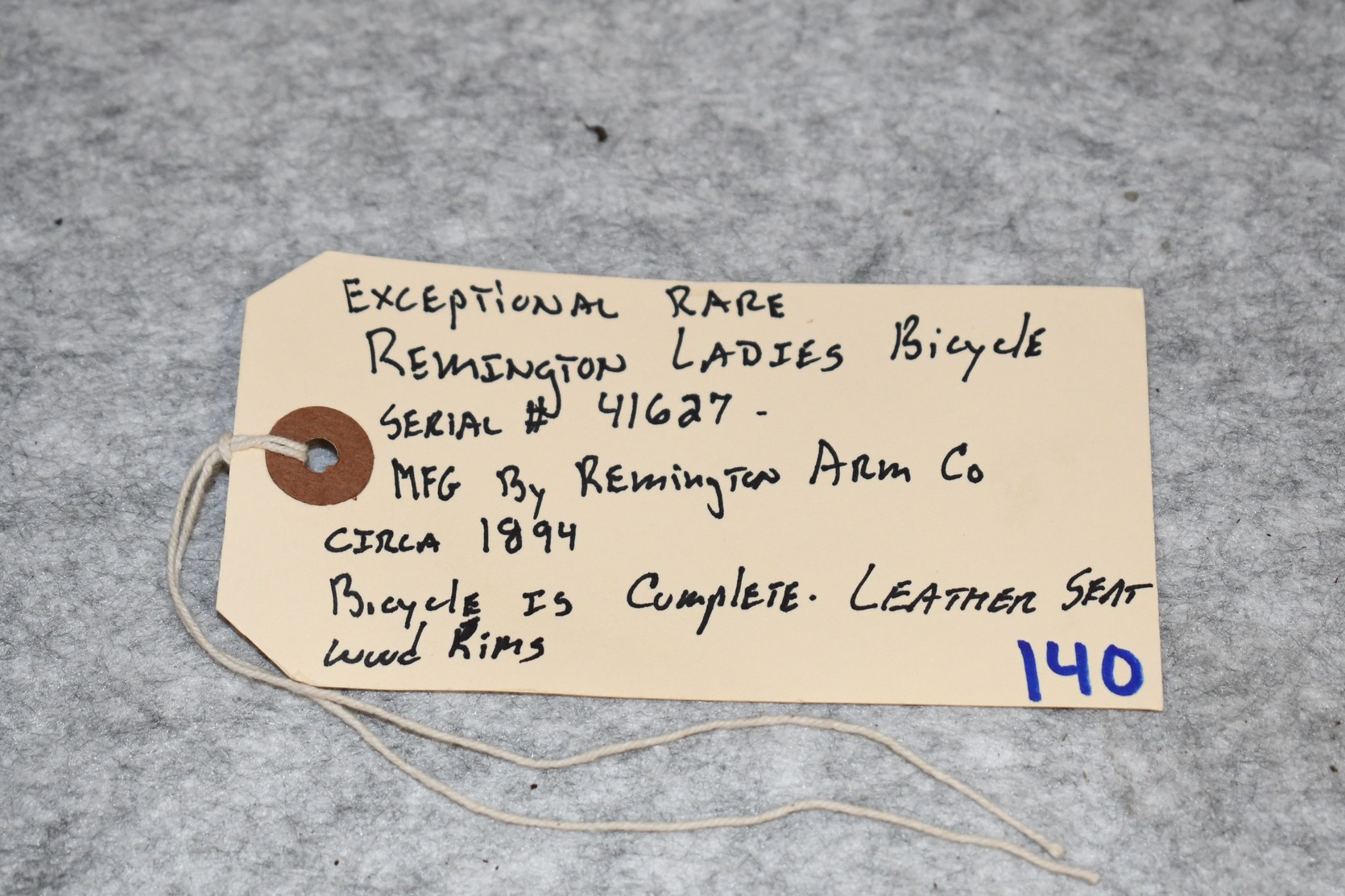 140. Exceptionally Rare Remington Ladies Bicycle – Serial No. 41627 – Manufactured by the Remington Arms Co. Llion NY – The Bicycle is Complete on a Metal Display Stand – w/Leather Seat and Wood Rimmed Tires – Label is Exceptional – Will Not Ship, Pickup Only or You Must Arrange Your Own Shipping!