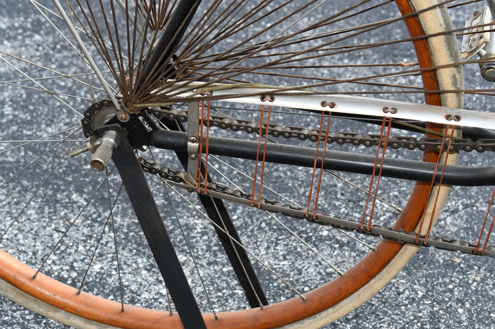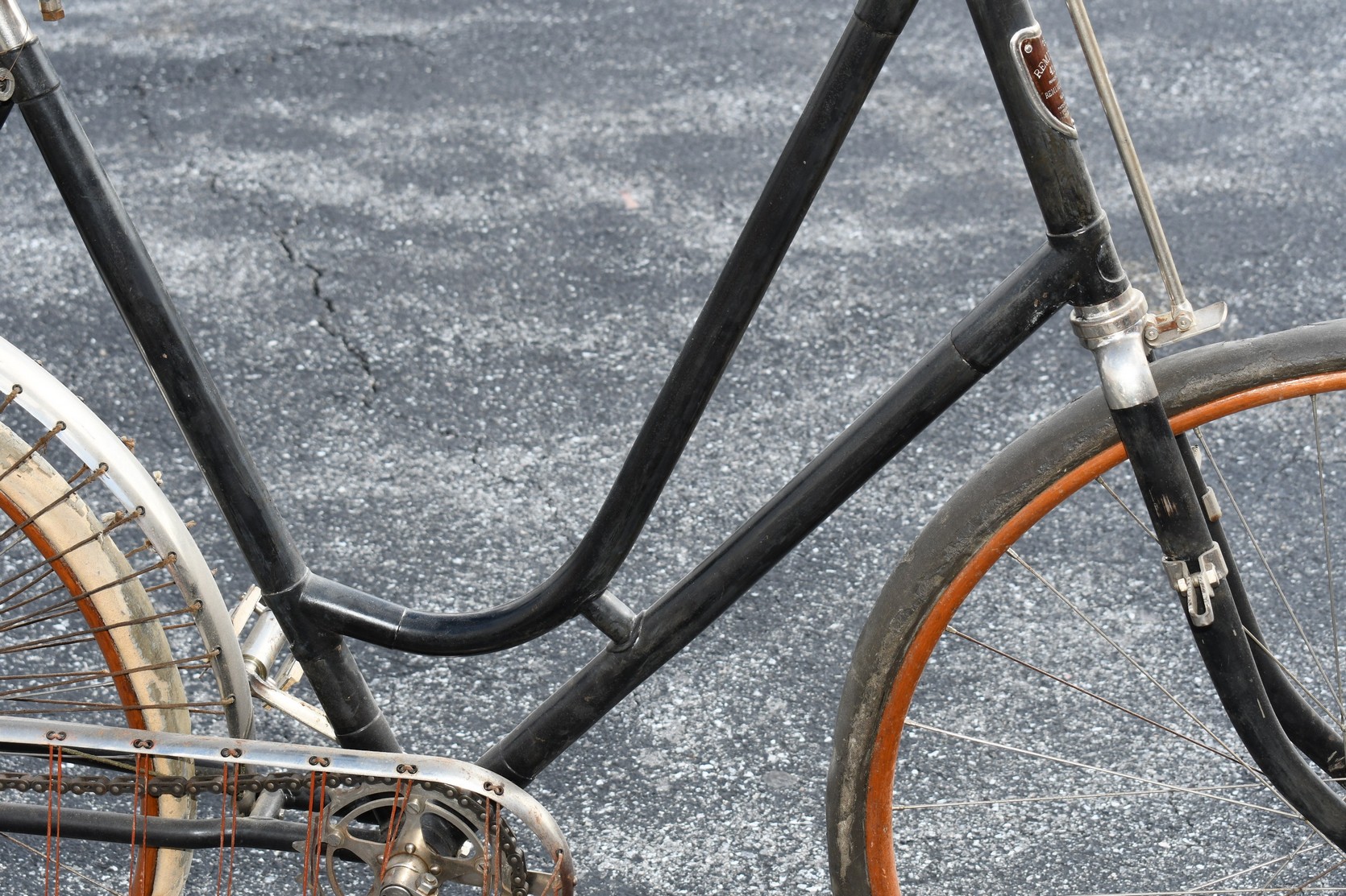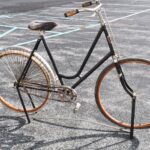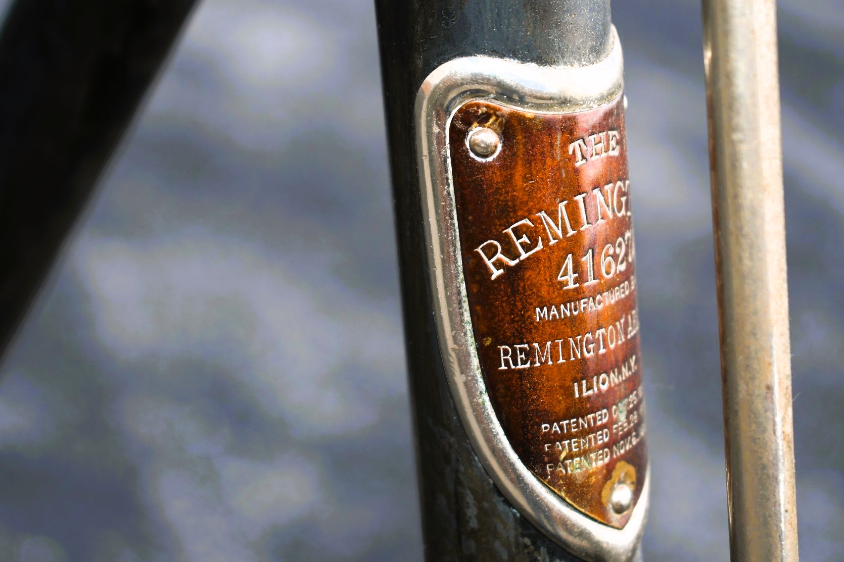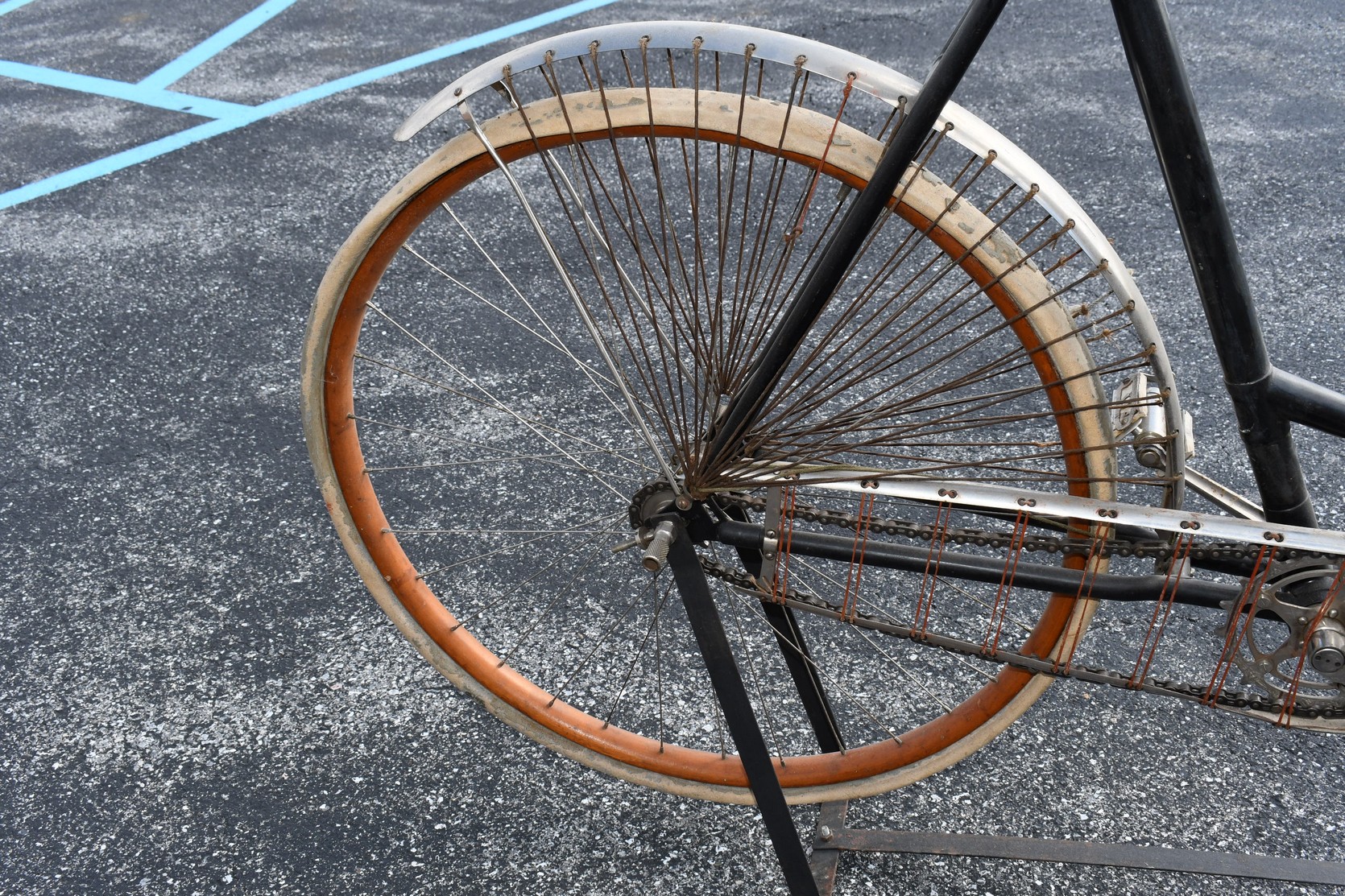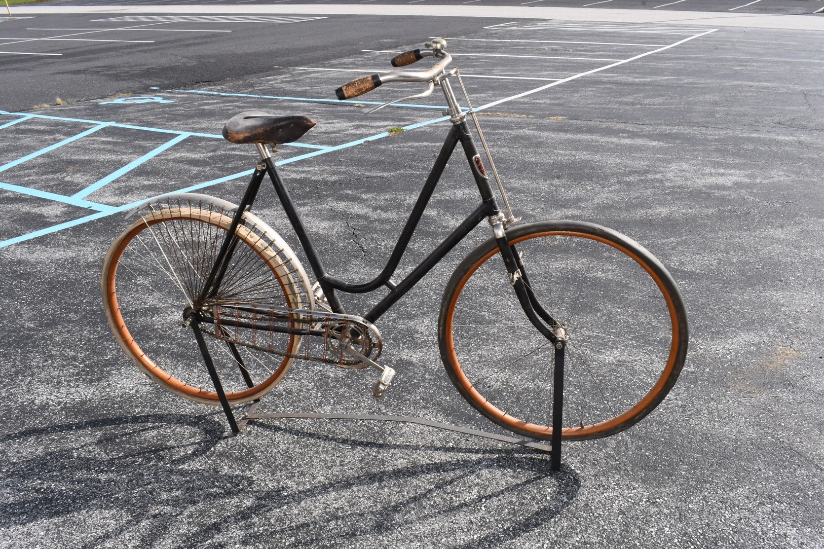 140. Exceptionally Rare Remington Ladies Bicycle – Serial No. 41627 – Manufactured by the Remington Arms Co. Llion NY – The Bicycle is Complete on a Metal Display Stand – w/Leather Seat and Wood Rimmed Tires – Label is Exceptional – Will Not Ship, Pickup Only or You Must Arrange Your Own Shipping!