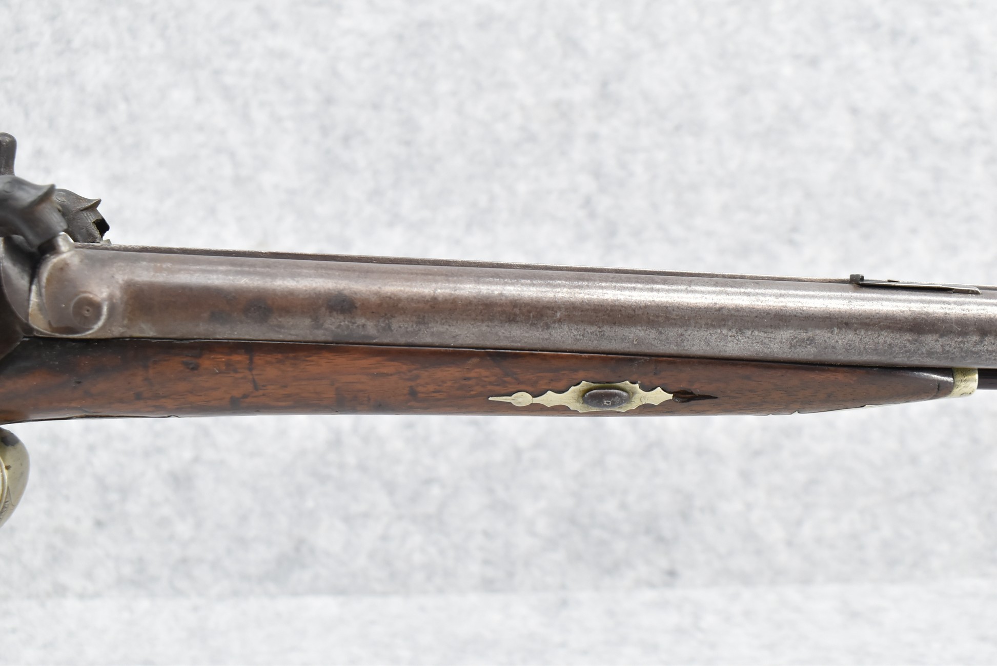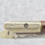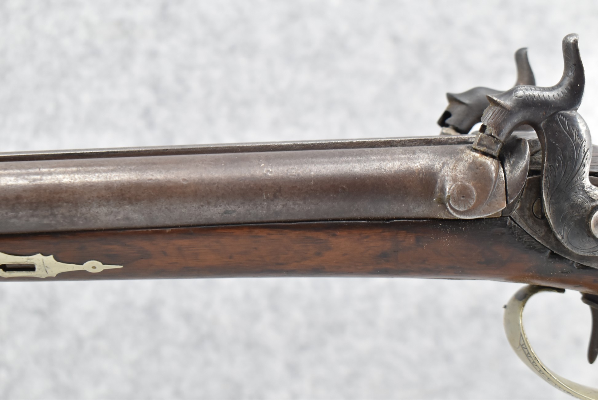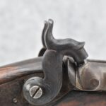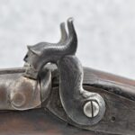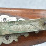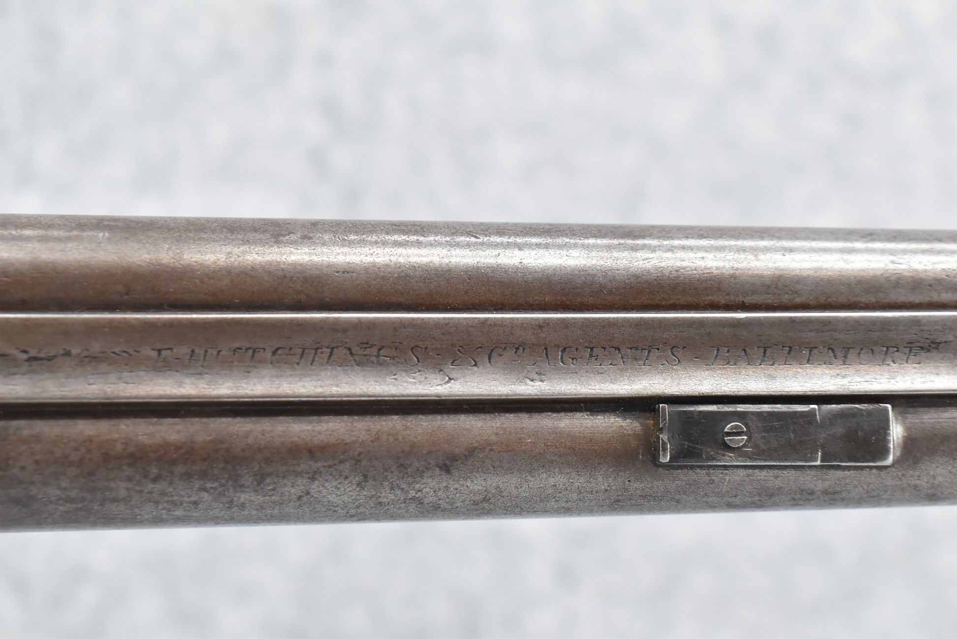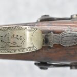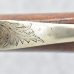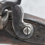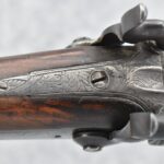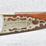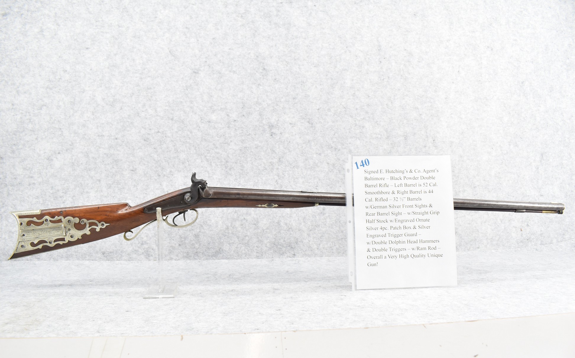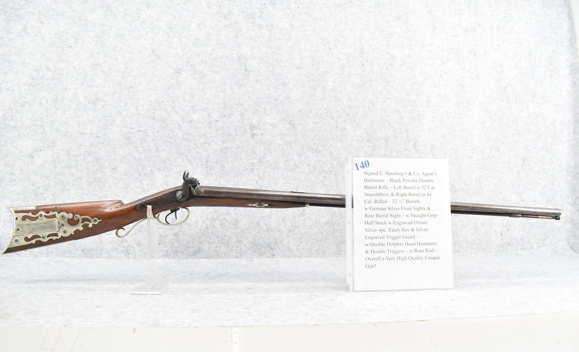 140. Signed E. Hutching’s & Co. Agent’s Baltimore – Black Powder Double Barrel Rifle – Left Barrel is 52 Cal. Smoothbore & Right Barrel is 44 Cal. Rifled – 32 ½” Barrels w/German Silver Front Sights & Rear Barrel Sight – w/Straight Grip Half Stock w/Engraved Ornate Silver 4pc. Patch Box & Silver Engraved Trigger Guard – w/Double Dolphin Head Hammers & Double Triggers – w/Ram Rod – Overall a Very High Quality Unique Gun!