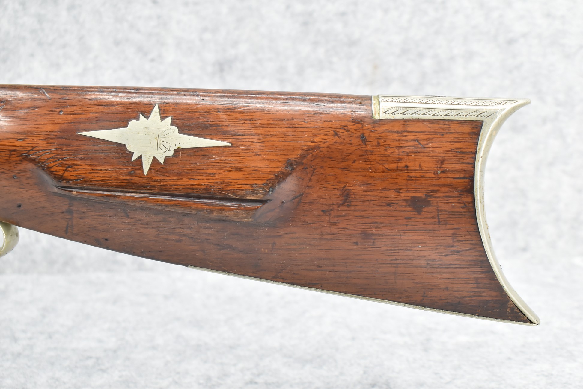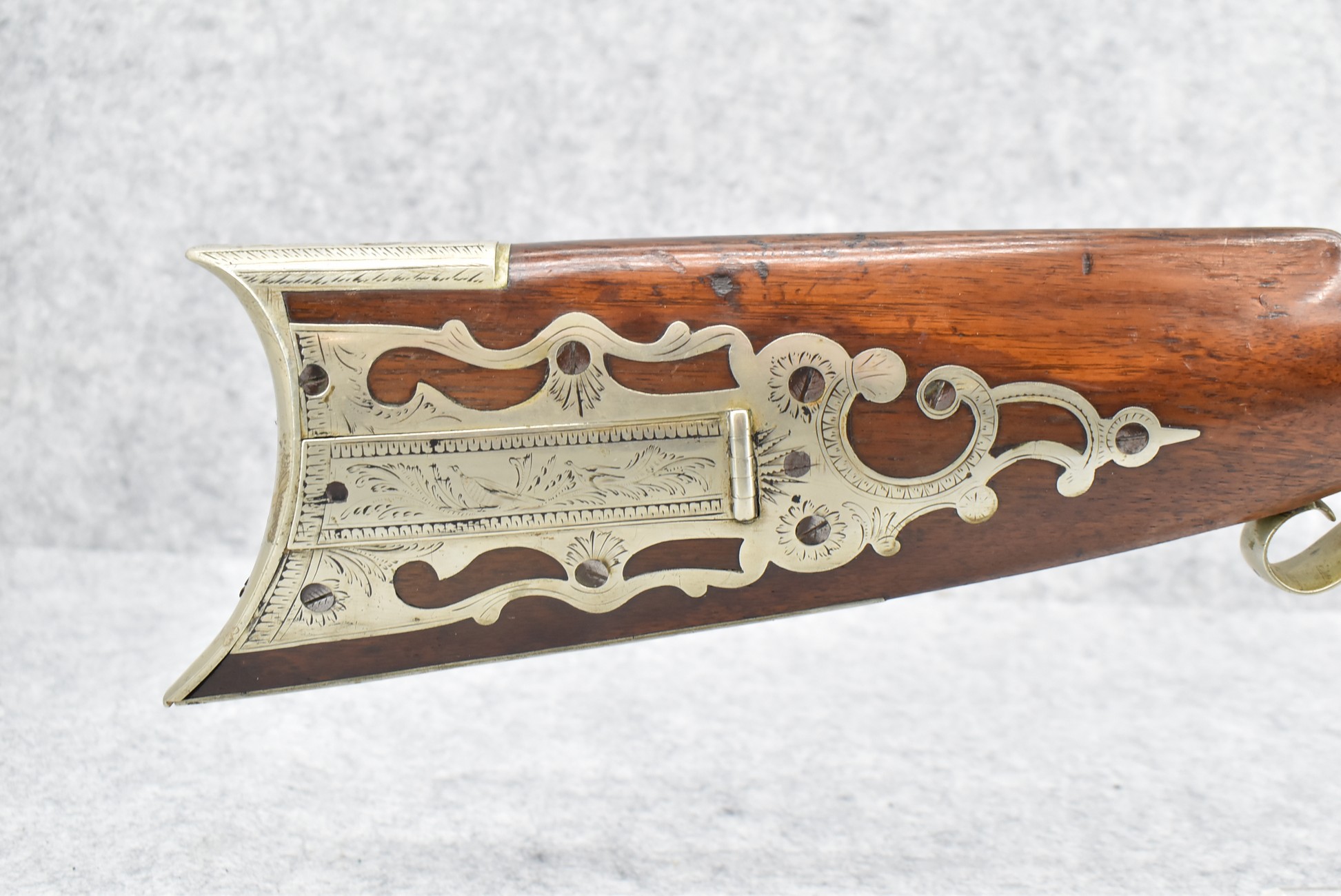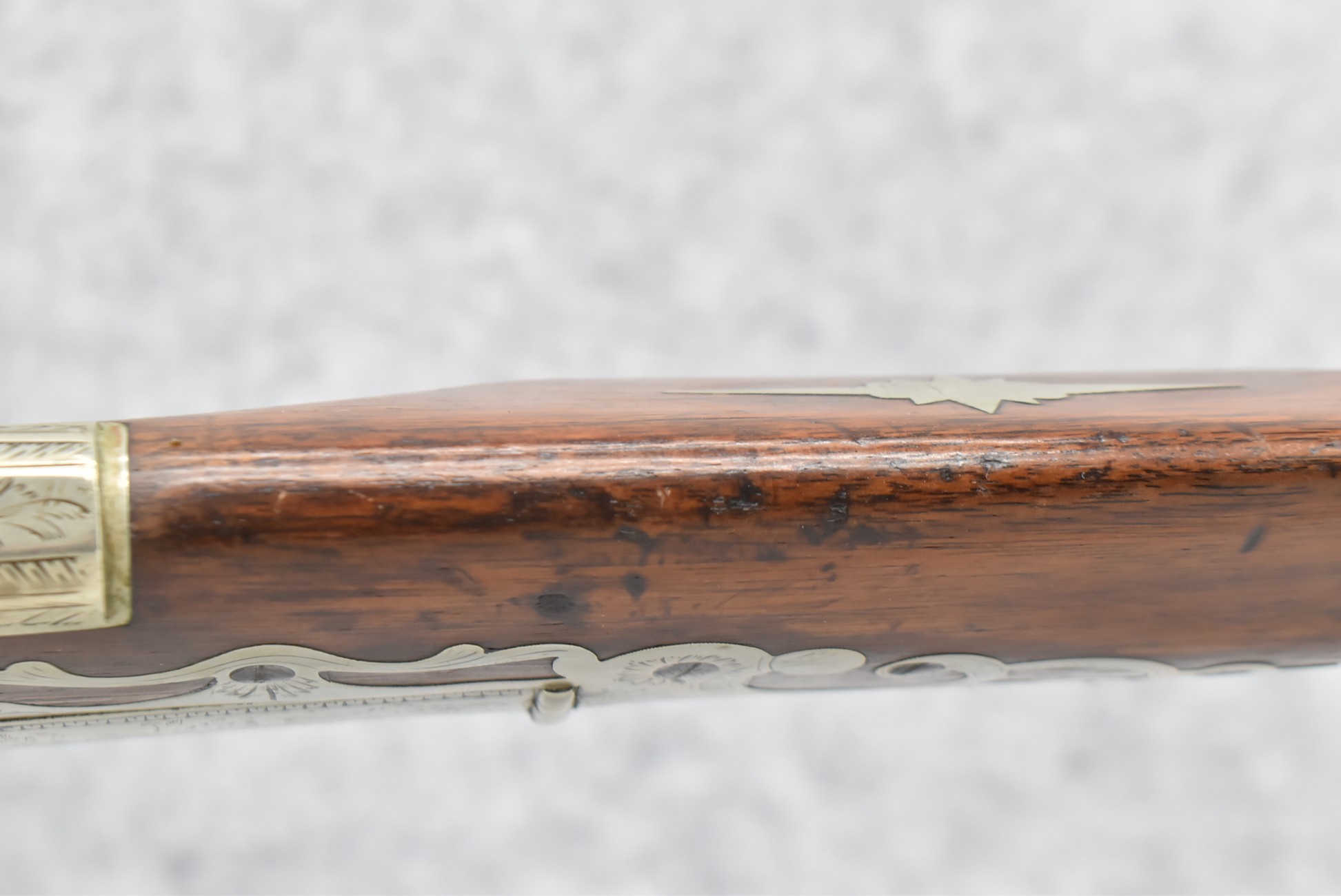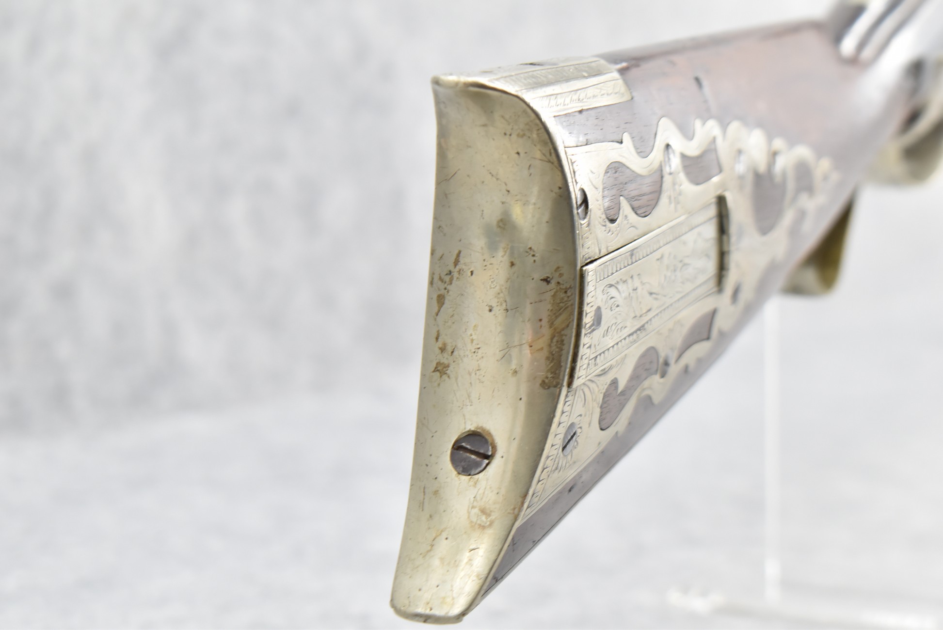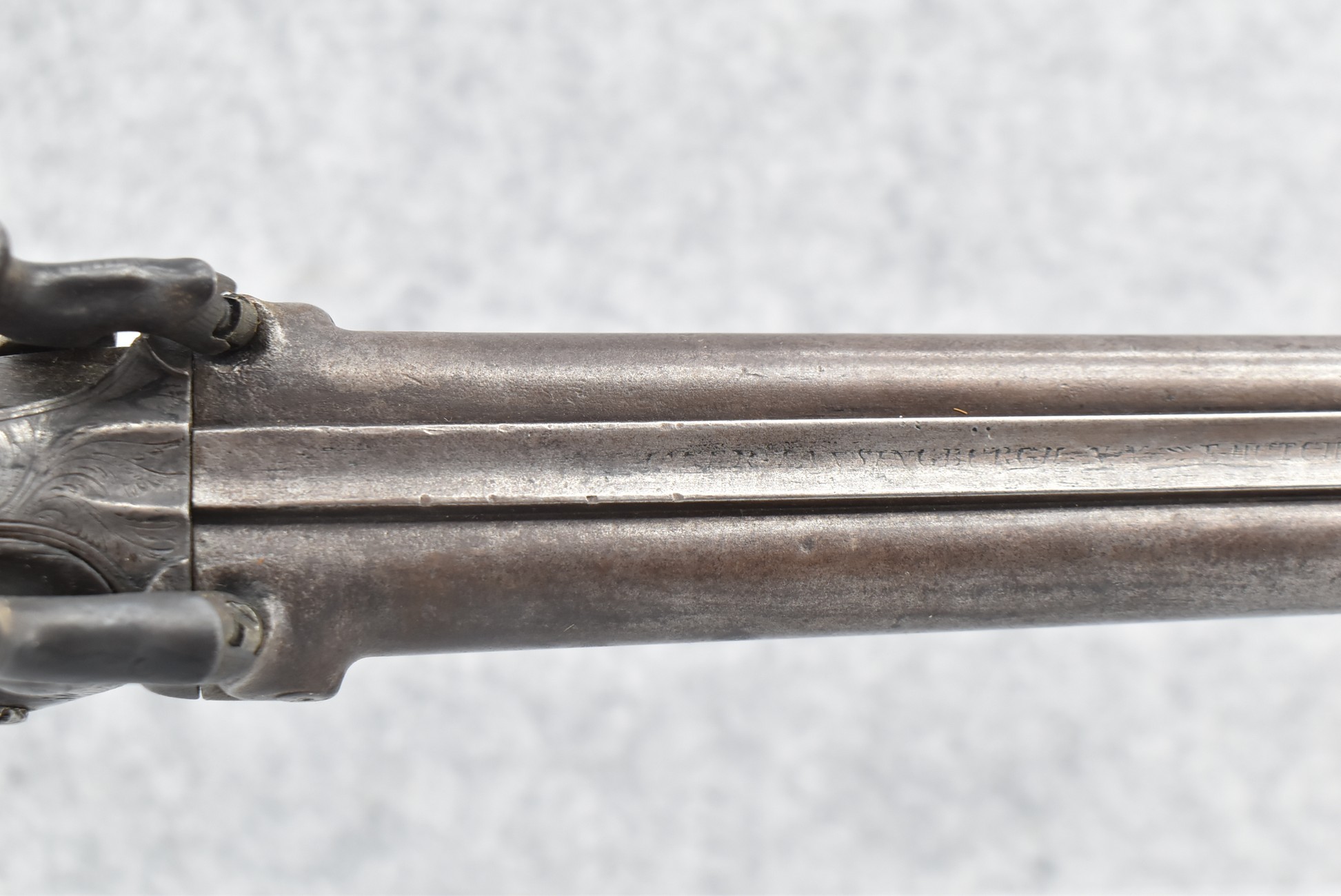 140. Signed E. Hutching’s & Co. Agent’s Baltimore – Black Powder Double Barrel Rifle – Left Barrel is 52 Cal. Smoothbore & Right Barrel is 44 Cal. Rifled – 32 ½” Barrels w/German Silver Front Sights & Rear Barrel Sight – w/Straight Grip Half Stock w/Engraved Ornate Silver 4pc. Patch Box & Silver Engraved Trigger Guard – w/Double Dolphin Head Hammers & Double Triggers – w/Ram Rod – Overall a Very High Quality Unique Gun!
