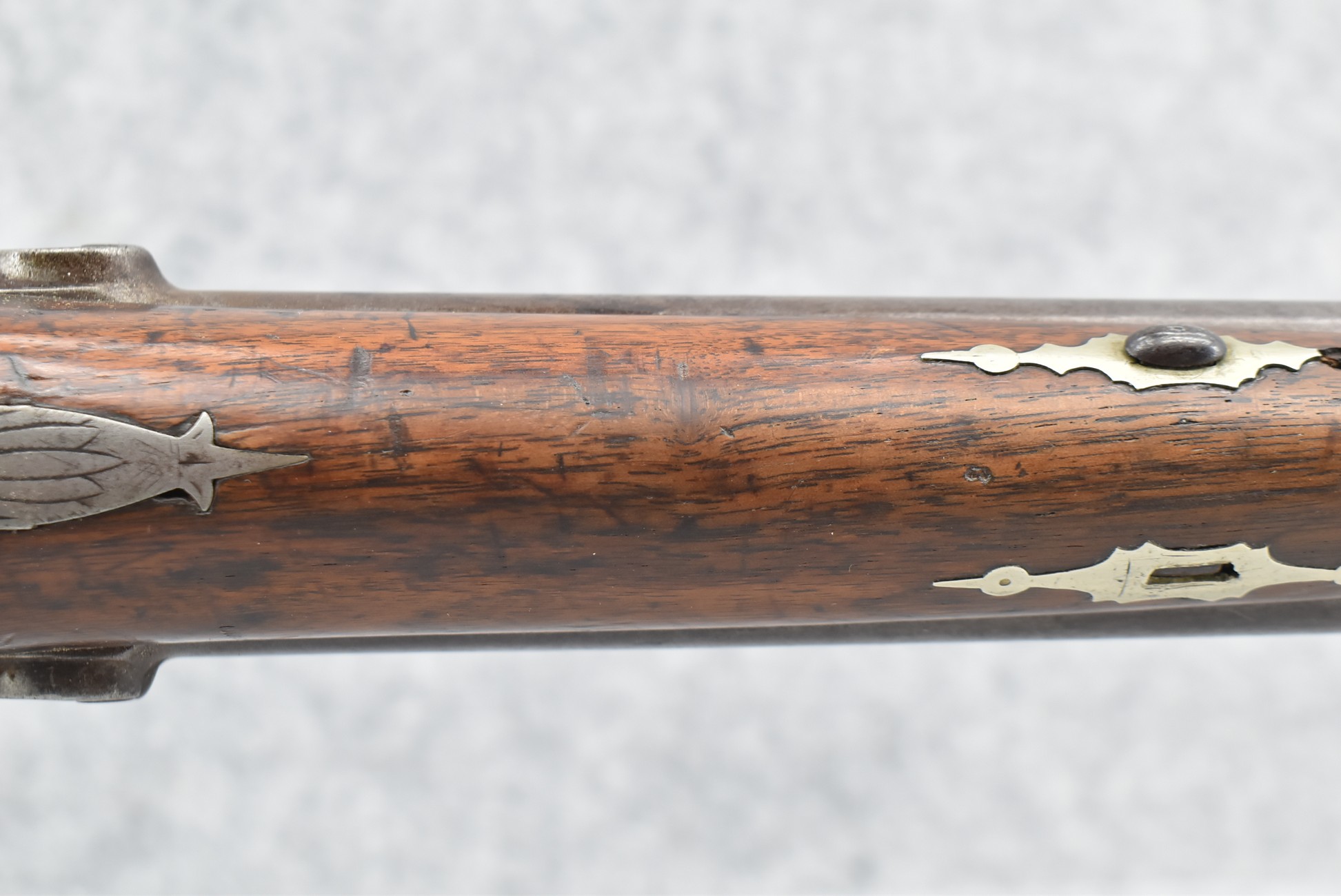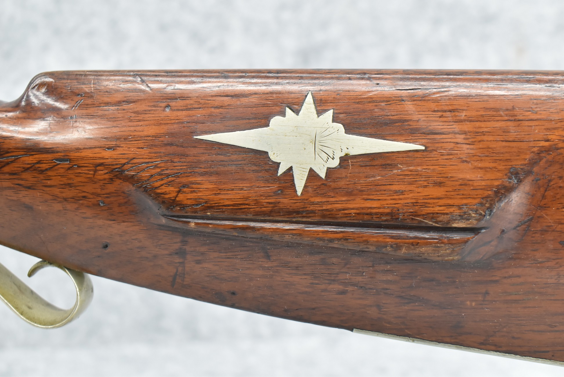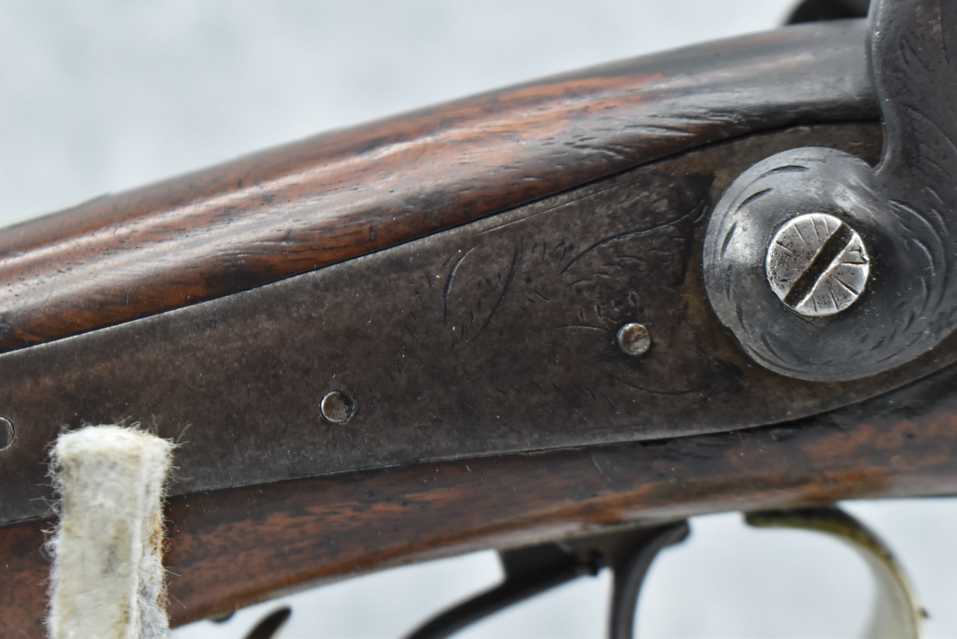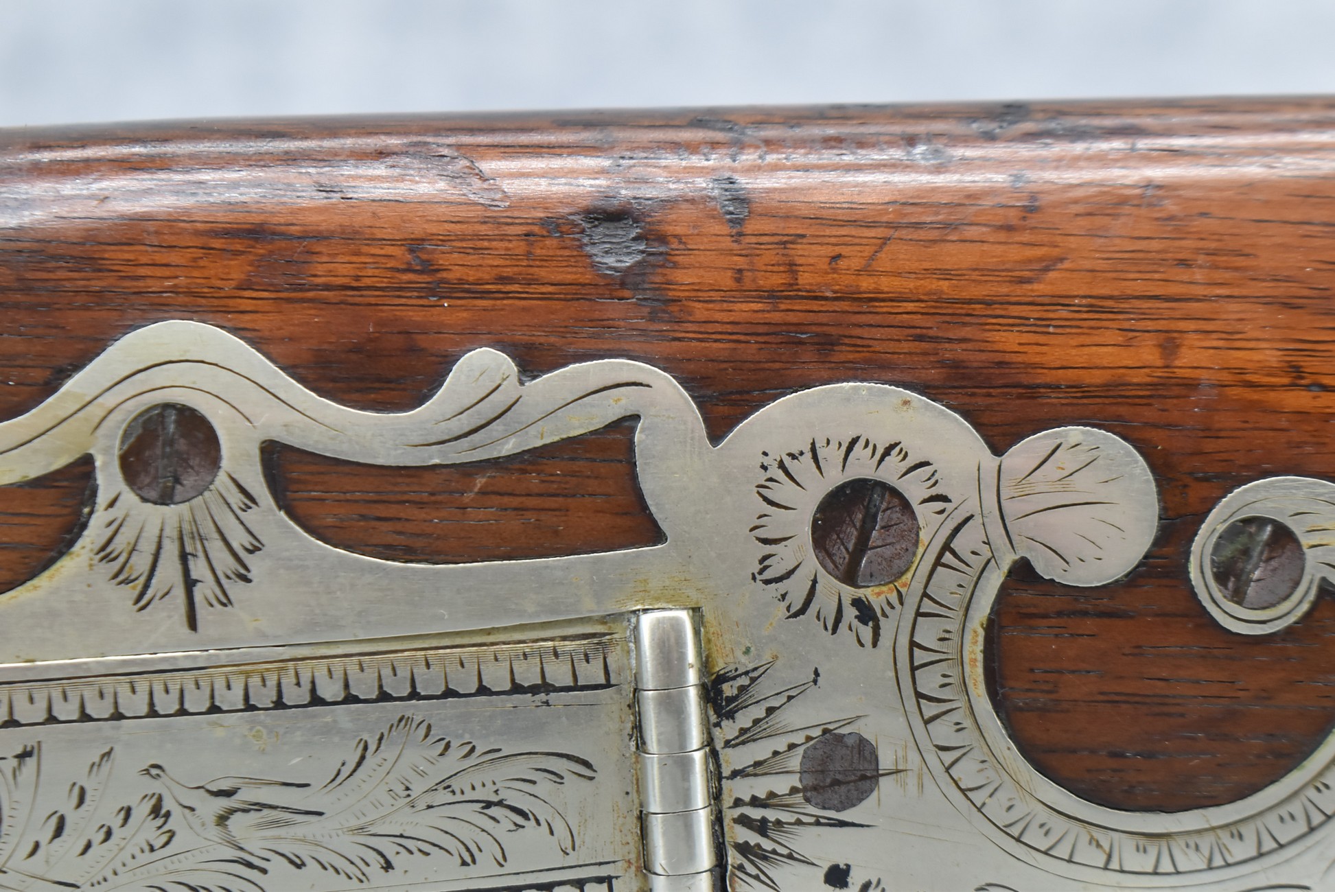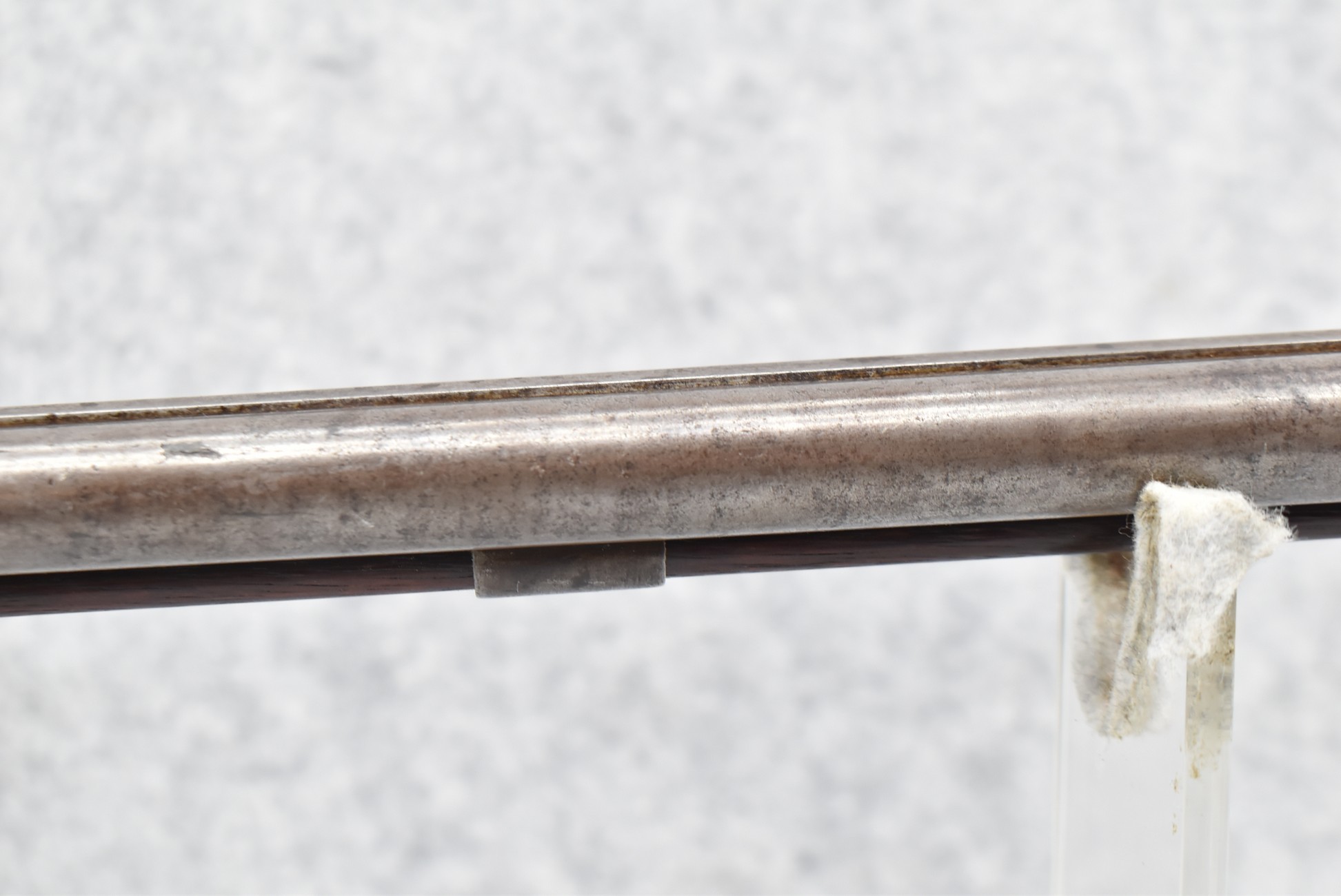 140. Signed E. Hutching’s & Co. Agent’s Baltimore – Black Powder Double Barrel Rifle – Left Barrel is 52 Cal. Smoothbore & Right Barrel is 44 Cal. Rifled – 32 ½” Barrels w/German Silver Front Sights & Rear Barrel Sight – w/Straight Grip Half Stock w/Engraved Ornate Silver 4pc. Patch Box & Silver Engraved Trigger Guard – w/Double Dolphin Head Hammers & Double Triggers – w/Ram Rod – Overall a Very High Quality Unique Gun!