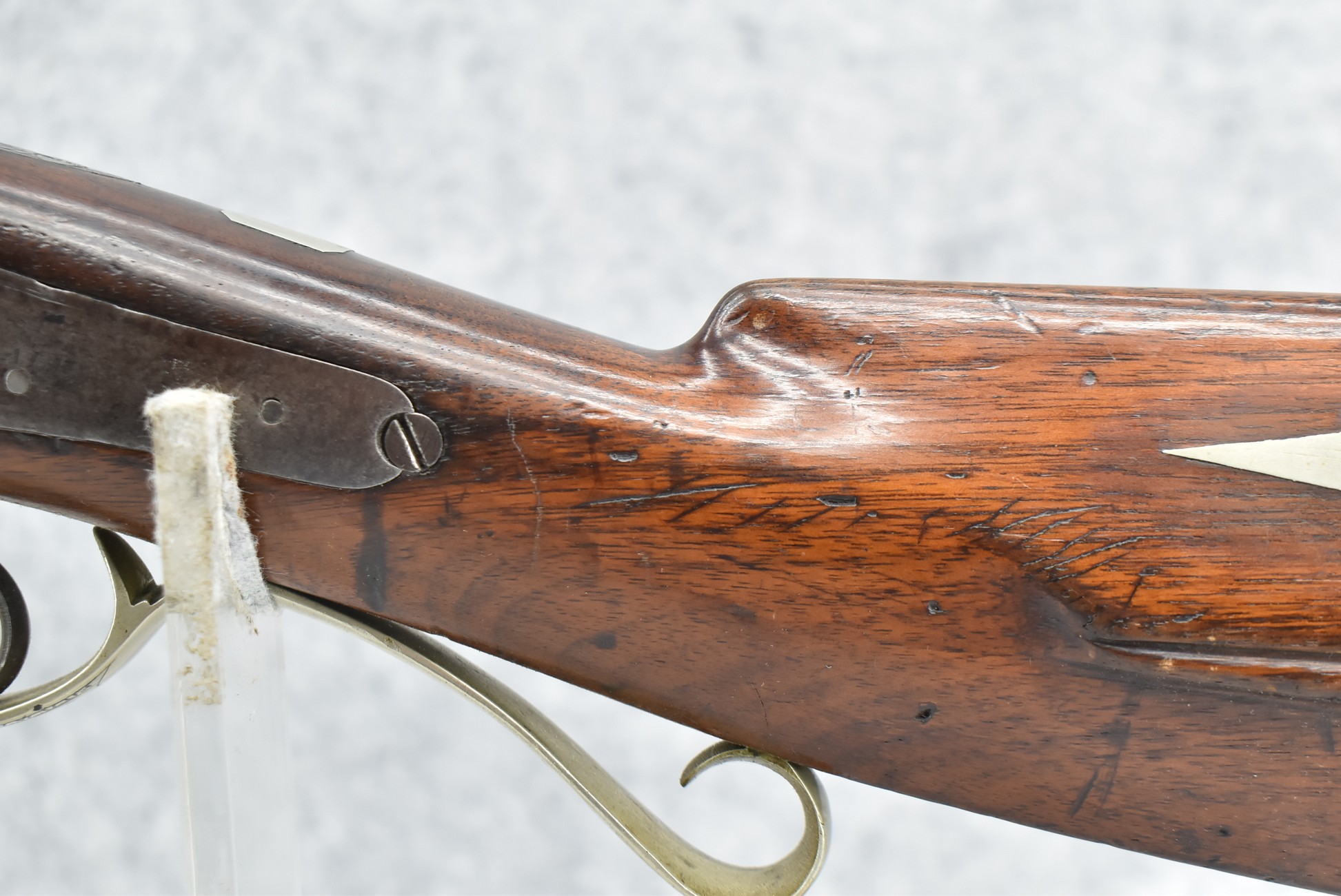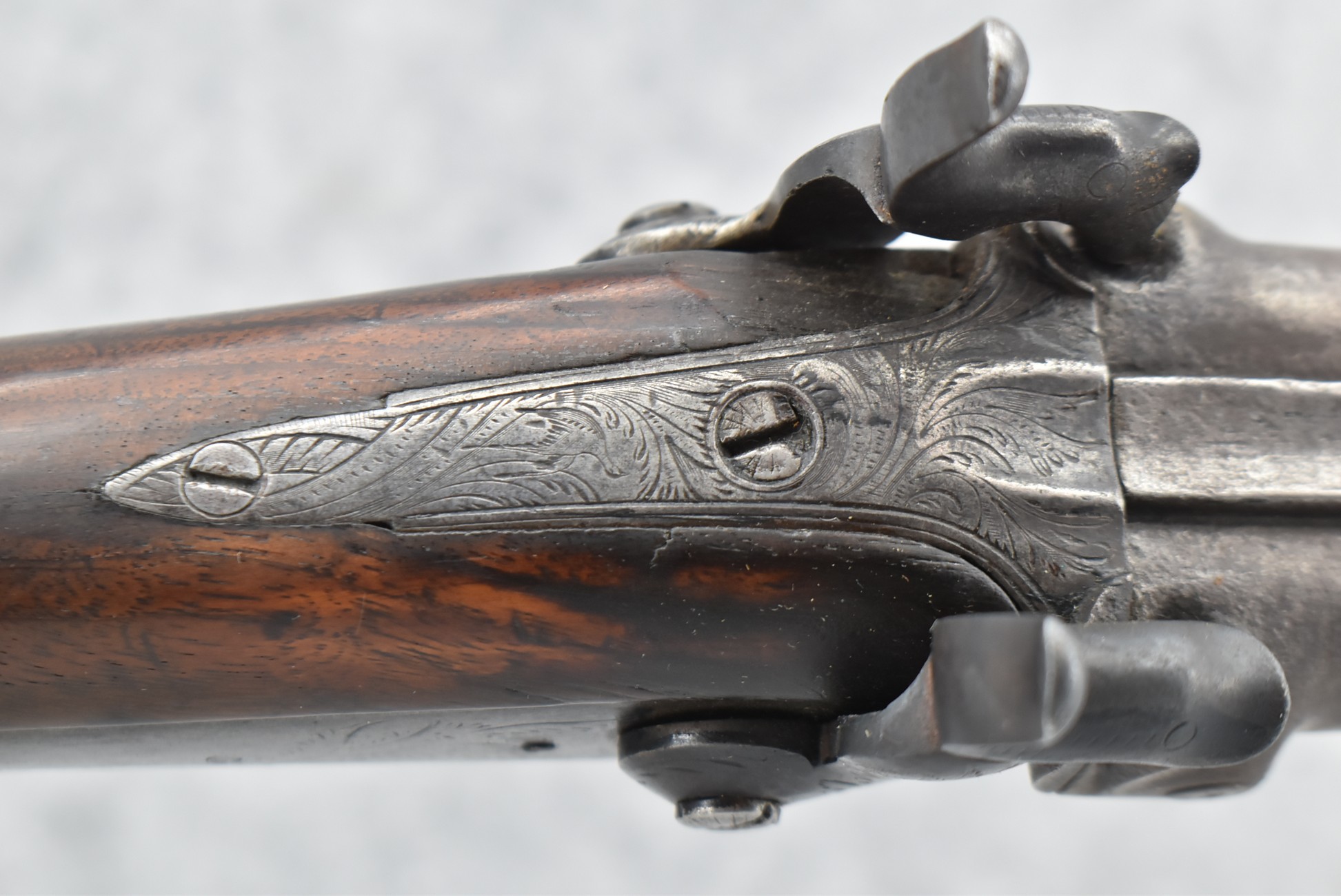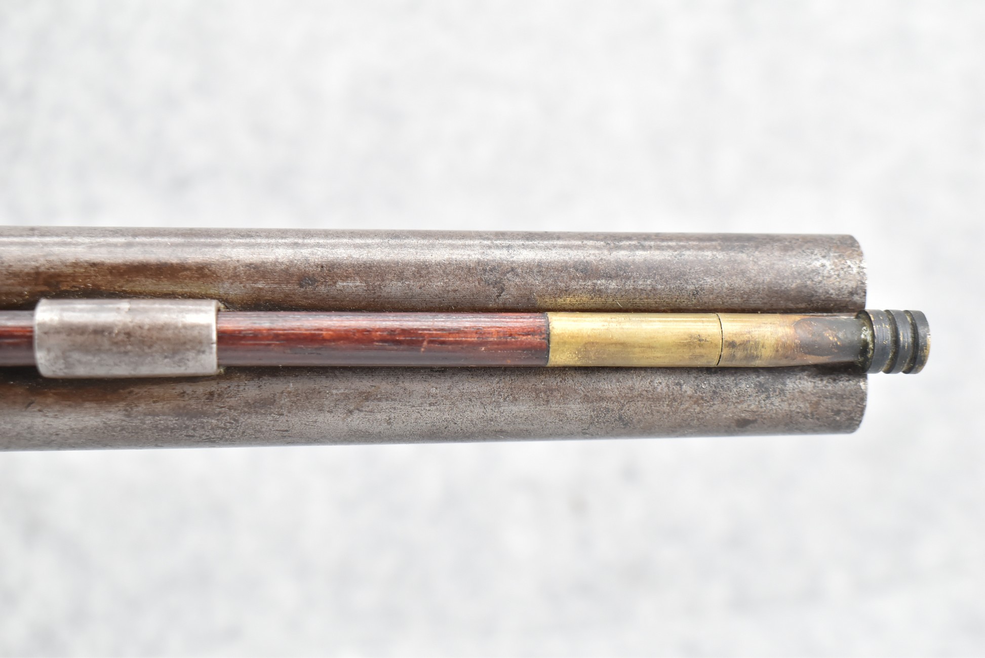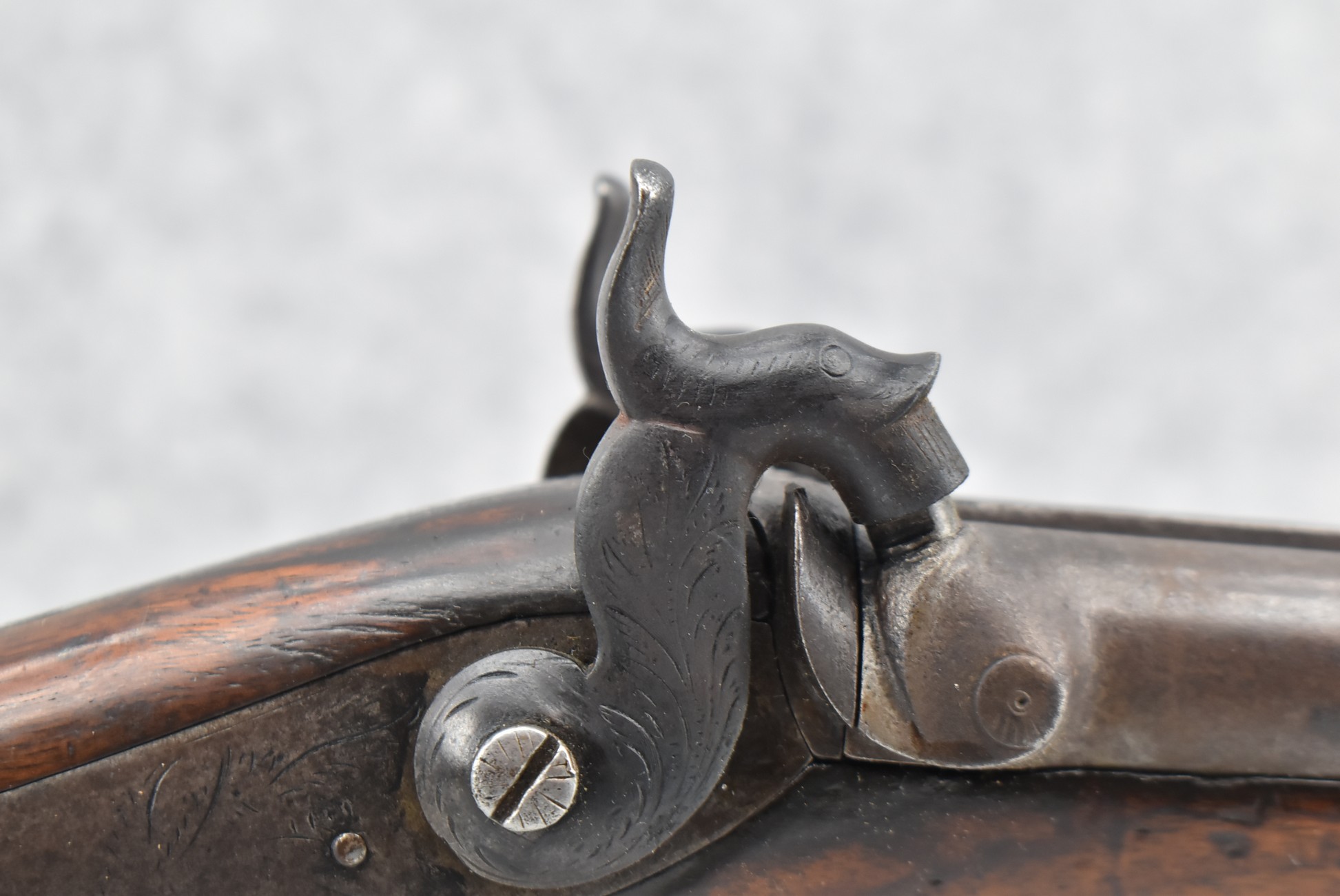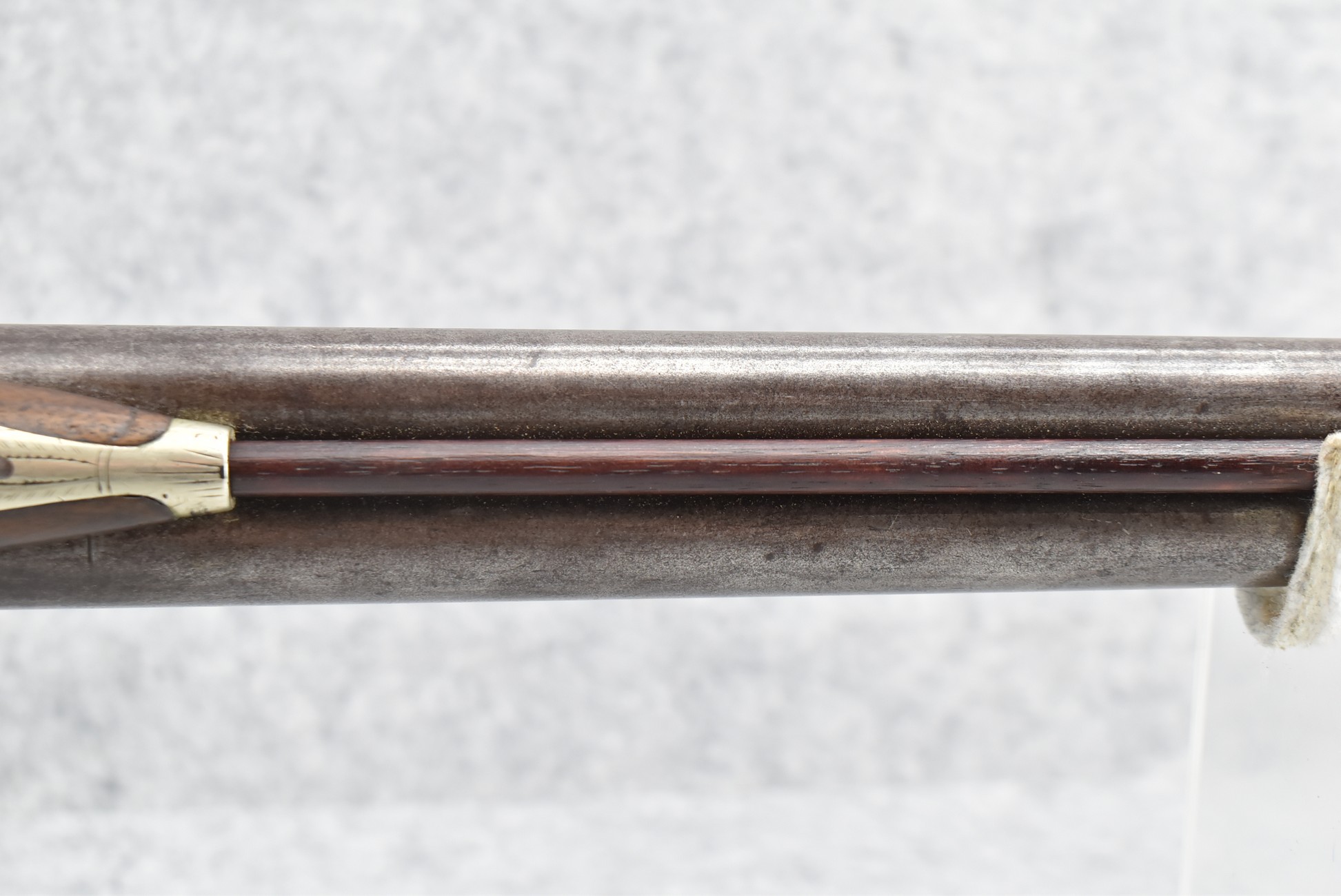 140. Signed E. Hutching’s & Co. Agent’s Baltimore – Black Powder Double Barrel Rifle – Left Barrel is 52 Cal. Smoothbore & Right Barrel is 44 Cal. Rifled – 32 ½” Barrels w/German Silver Front Sights & Rear Barrel Sight – w/Straight Grip Half Stock w/Engraved Ornate Silver 4pc. Patch Box & Silver Engraved Trigger Guard – w/Double Dolphin Head Hammers & Double Triggers – w/Ram Rod – Overall a Very High Quality Unique Gun!