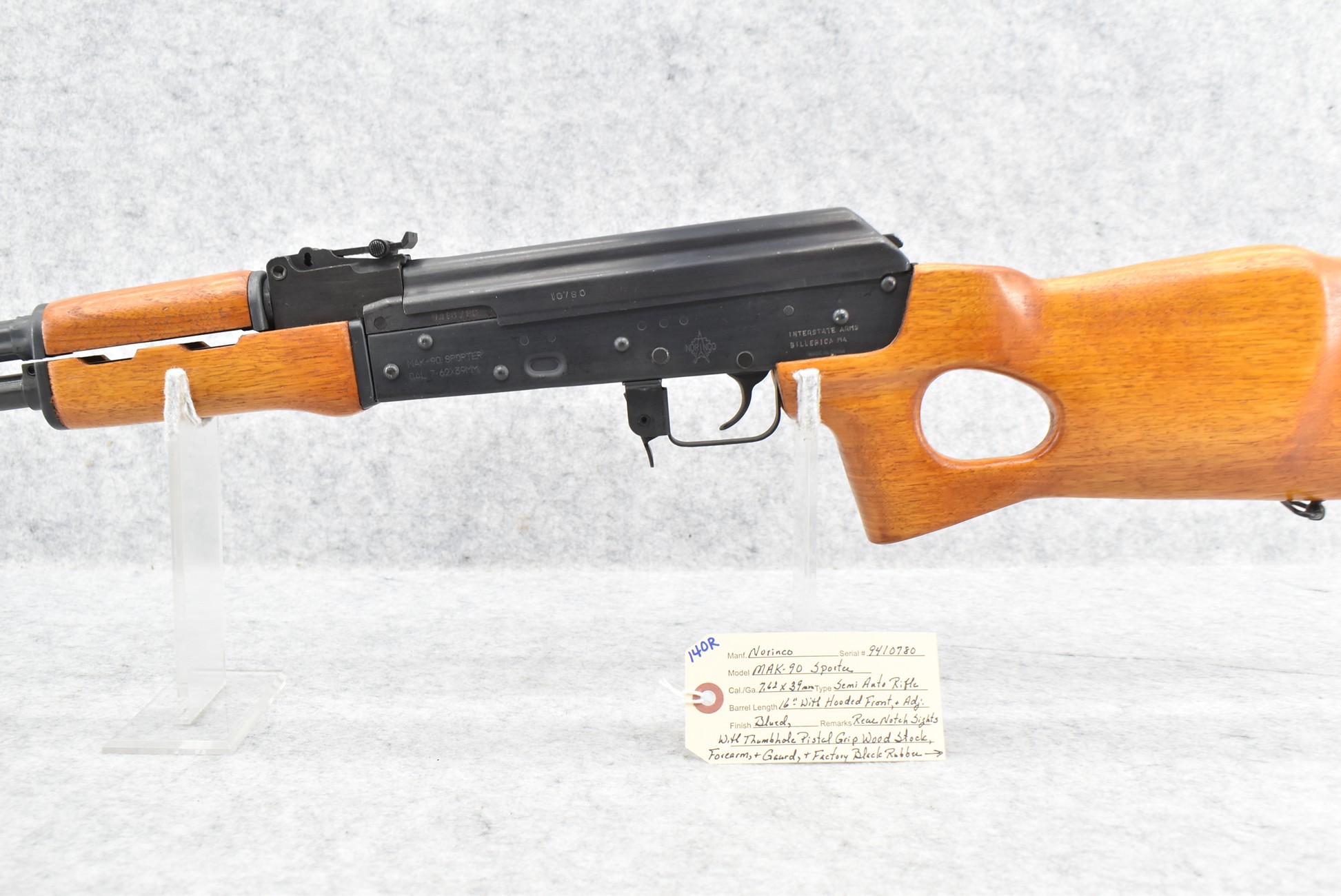140R.     Norinco – Mod. MAK-90 Sporter – 7.62x39mm Cal. Semi-Auto Rifle – w/16” Barrel w/Hooded Front and Adjustable Rear Notch Sights – Blued Finish – w/Thumbhole Pistol Grip Wood Stock and Forearm w/Factory Black Rubber Butt Pad – w/2 Detachable Magazines – w/Foam Box, Manual, and Accessories (CANNOT GO TO MARYLAND!)