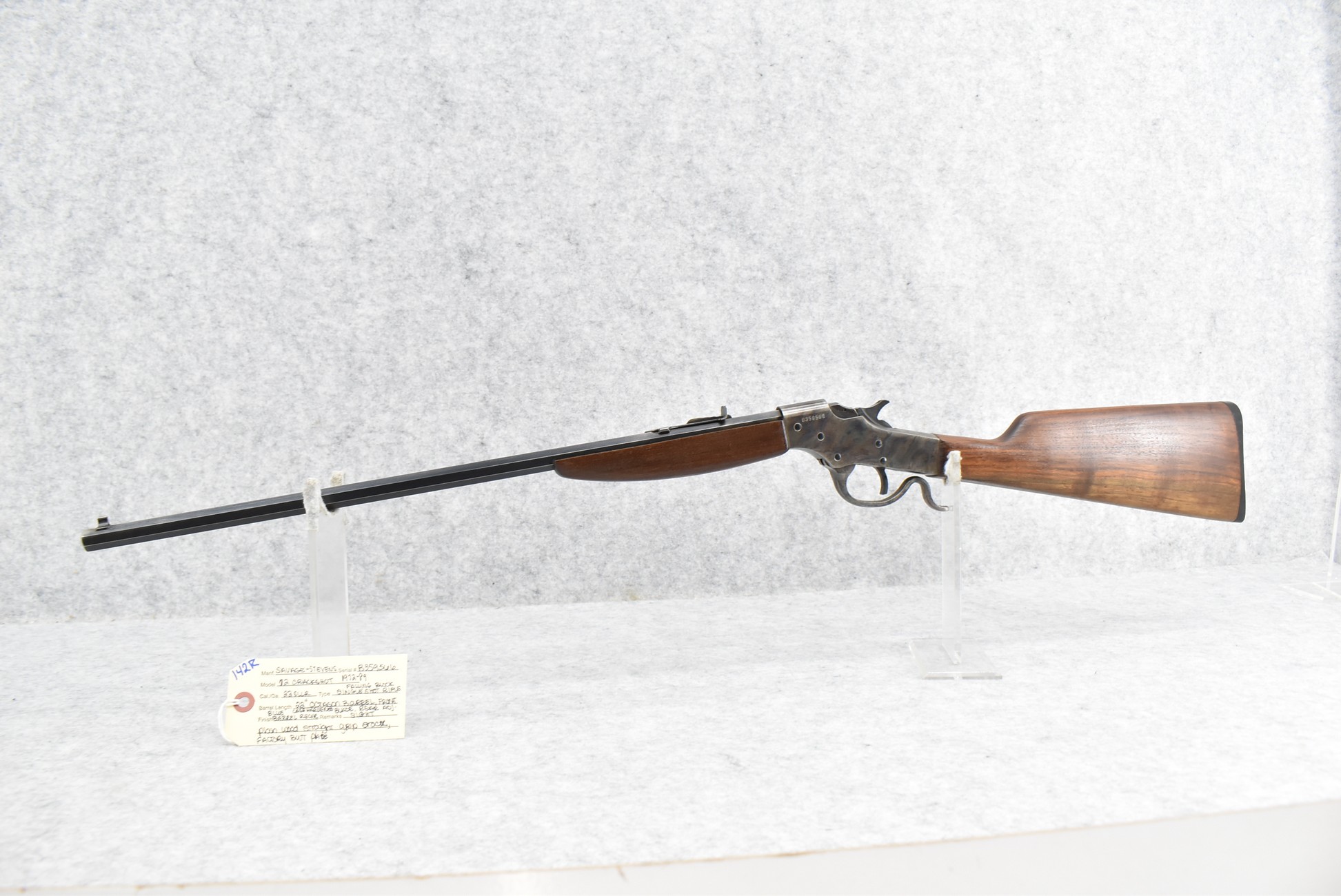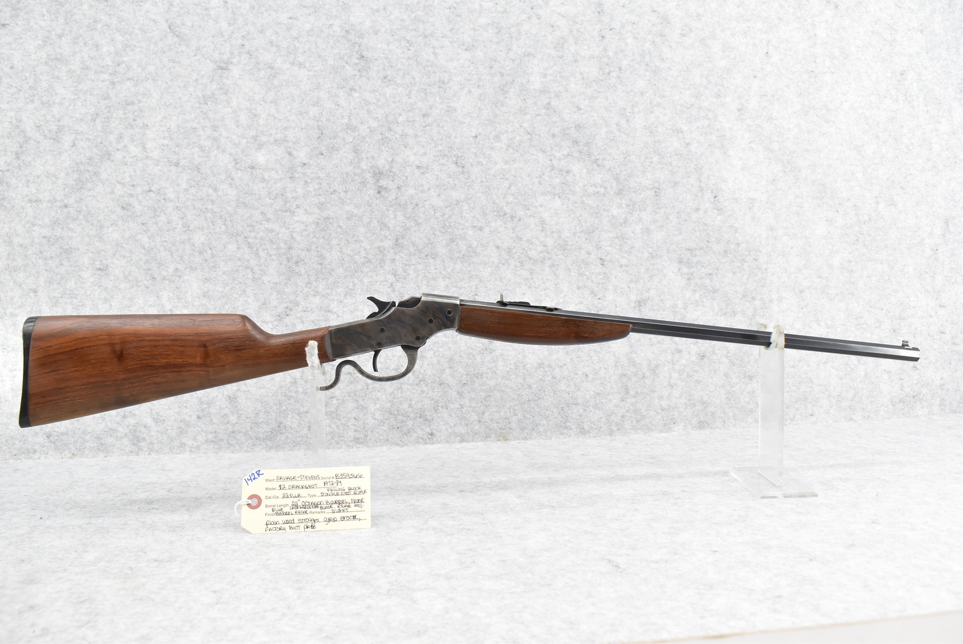 142R. Savage-Stevens – Mod. 72 Crackshot – 22 Cal. Falling Block Single Shot Rifle – w/22” Octagon Blued Finish Barrel w/Front Blade & Rear Adj. Sights – Case Hardened Finish Receiver – w/Plain Wood Straight Grip Stock w/Factory Butt Plate – Mfg. Between 1972-89
