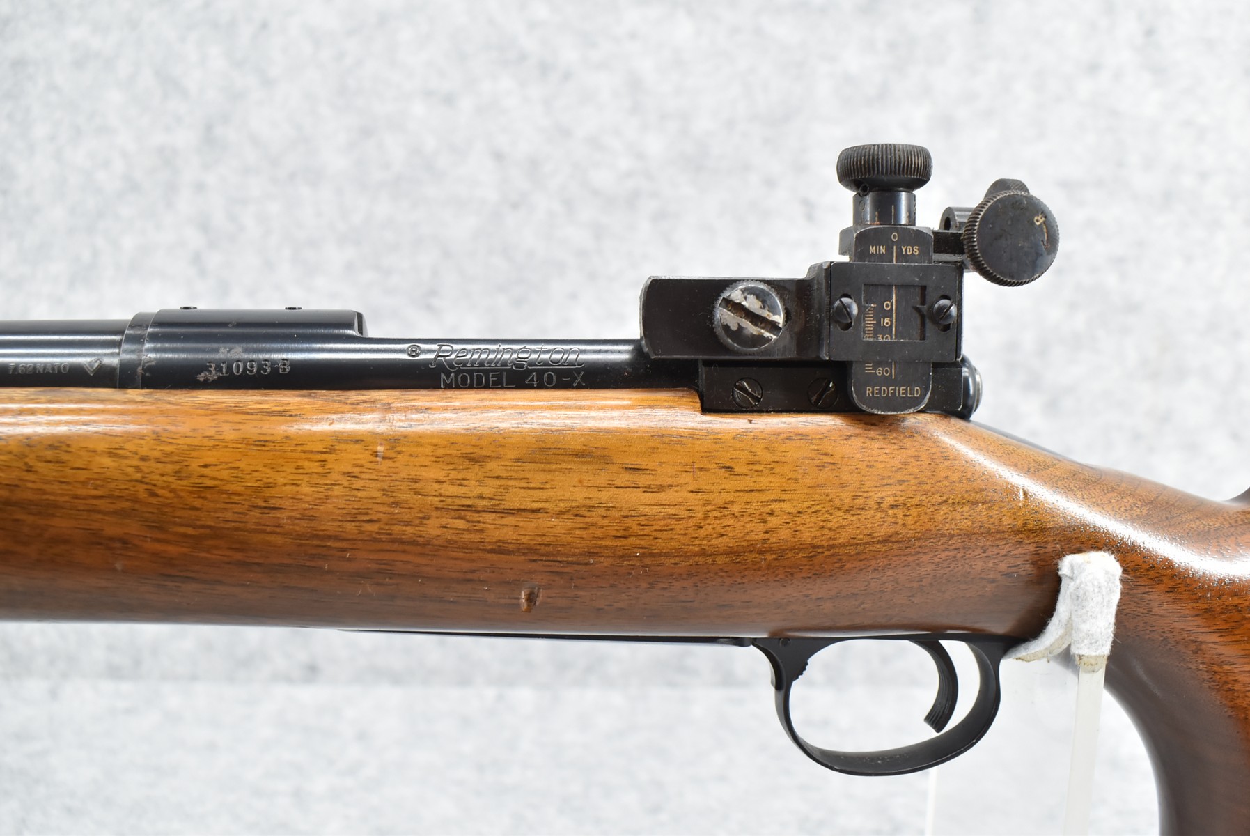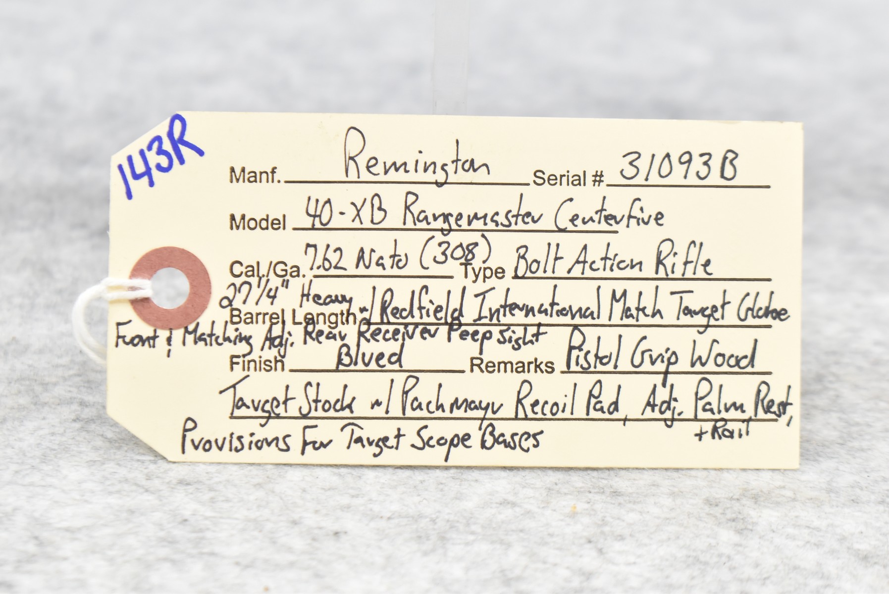 143R. Remington – Mod. 40-XB Rangemaster Centerfire – 7.62 NATO (308) Cal. Bolt Action Repeater Rifle – w/27 ¼” Heavy Barrel w/Redfield International Match Target Globe Front & Redfield International Match Adj. Rear Receiver Peep Sights – Blued Finish – w/Pistol Grip Wood Target Stock w/Pachmayr Recoil Pad w/Palm Stop Rest & Palm Stop – w/Target Scope Bases Block