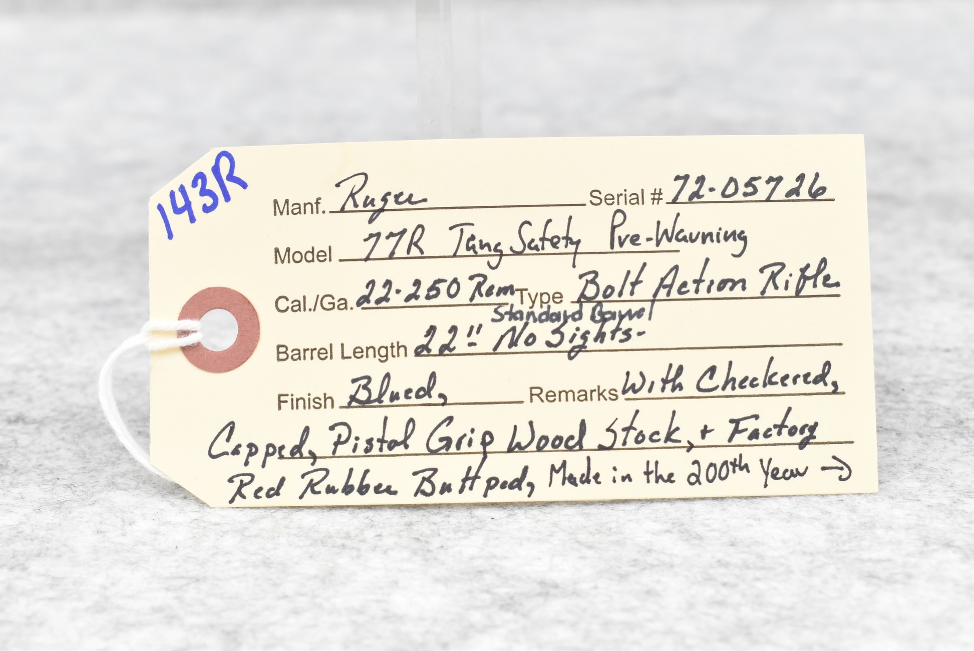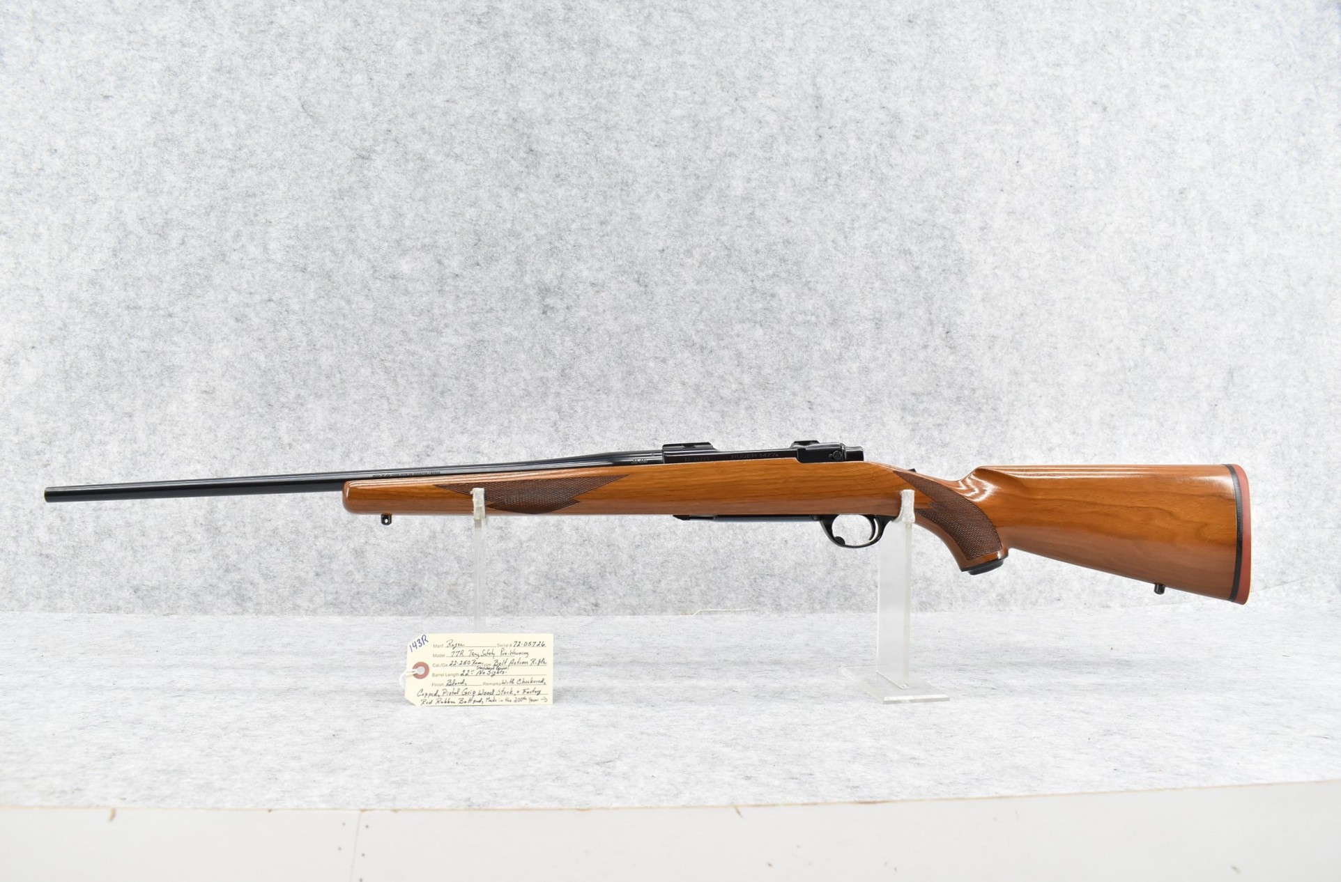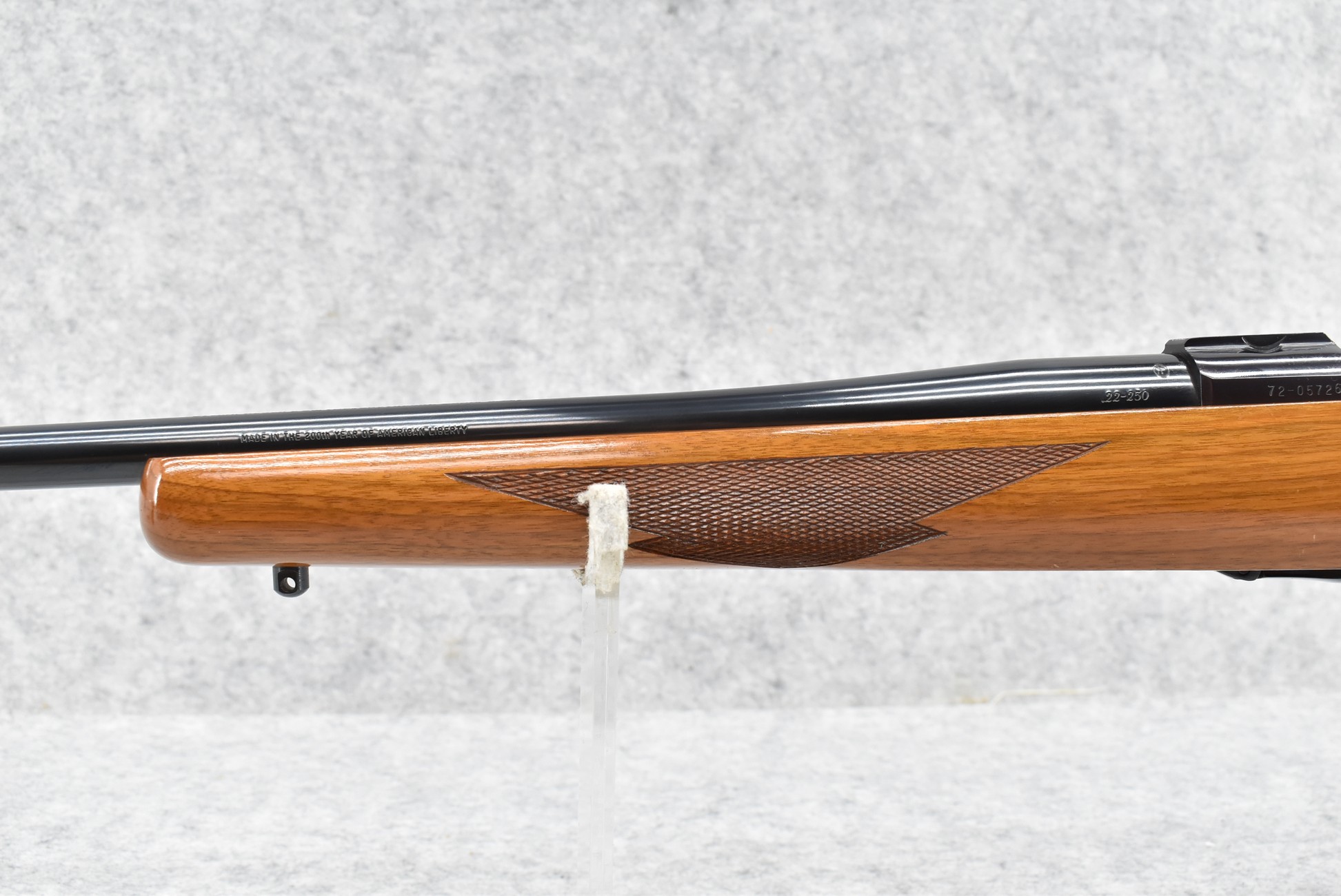 143R. Ruger – Mod. 77R Tang Safety (Pre-Warning) – 22-250 Rem. Cal. Bolt Action Rifle – w/22” Standard Barrel – Blued Finish – w/Checkered Capped Pistol Grip Wood Stock w/Factory Butt Pad – “Made in the 200th Year of American Liberty”