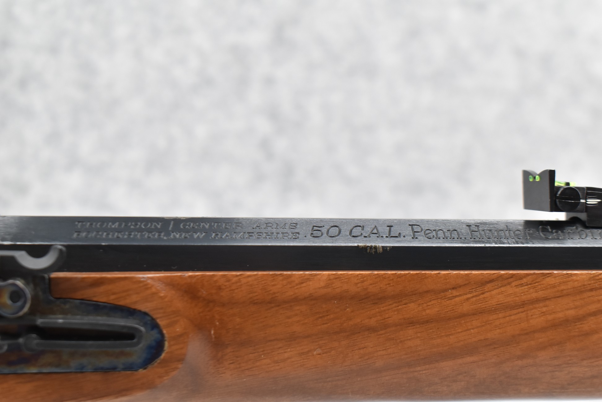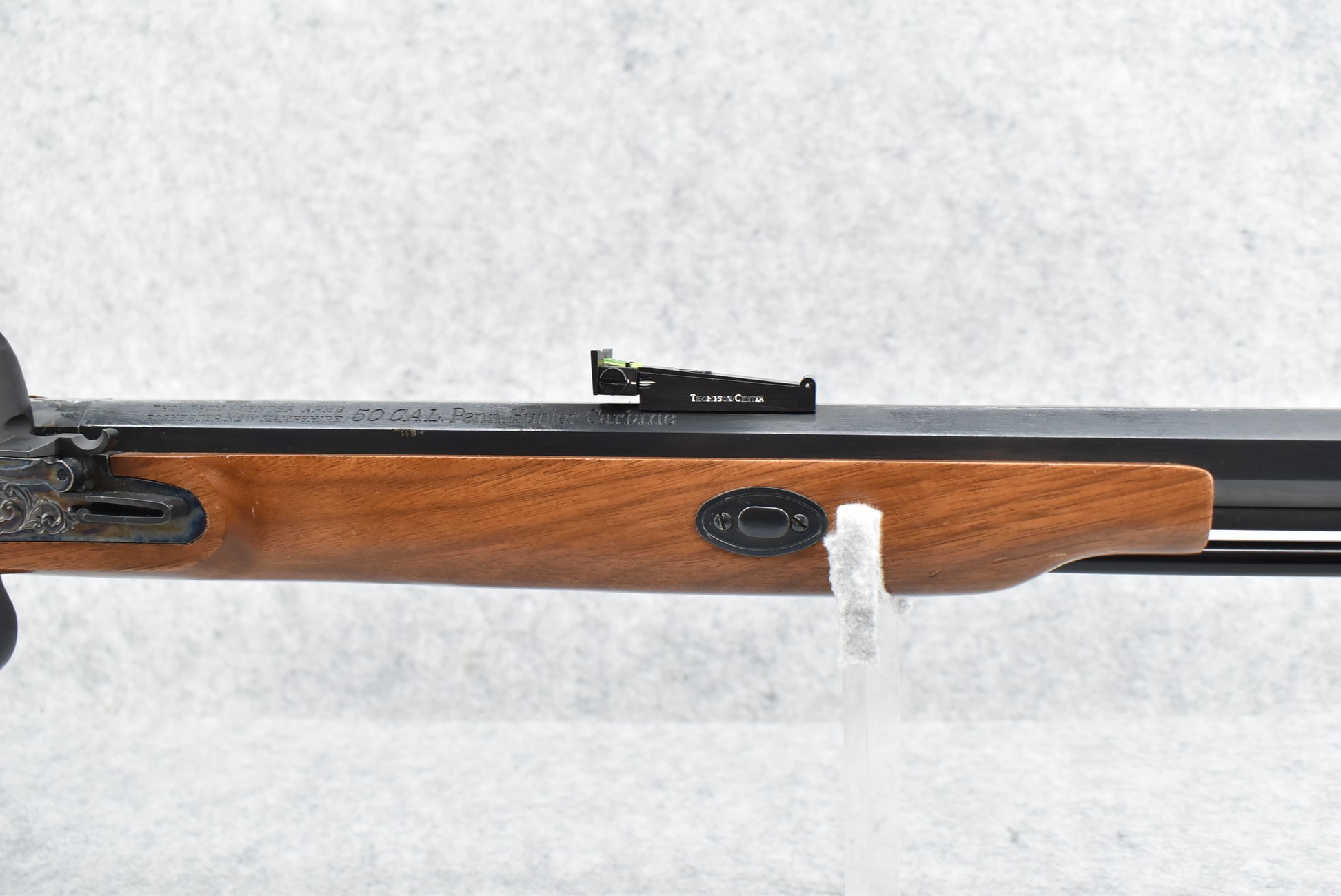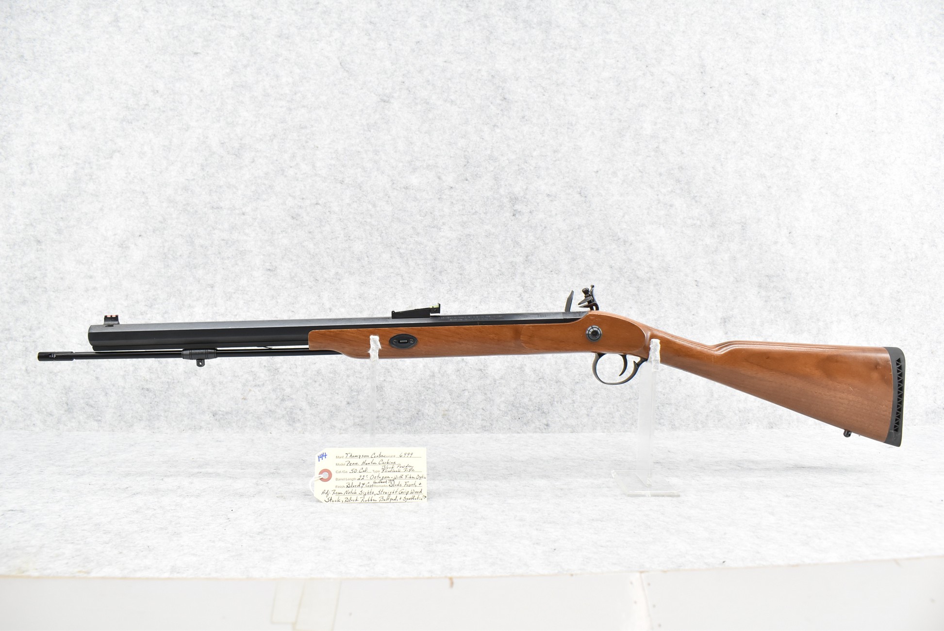 144. Thompson Center – Mod. Penn. Hunter Carbine – 50 Cal. Black Powder Flintlock Rifle – w/22” Octagon Barrel w/Fiber Optic Blade Front & Adj. Rear Notch Sights – Blued Finish w/Case Hardened Lock – w/Straight Grip Wood Stock w/Factory Butt Pad
