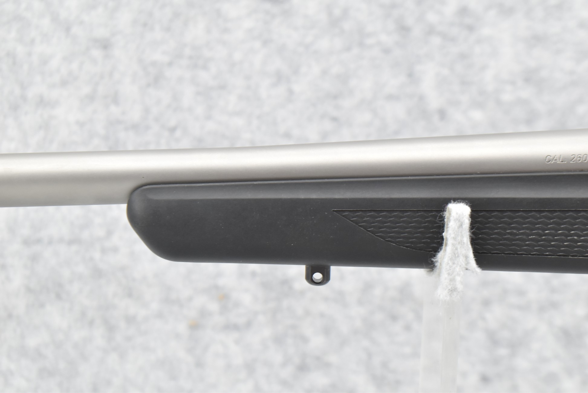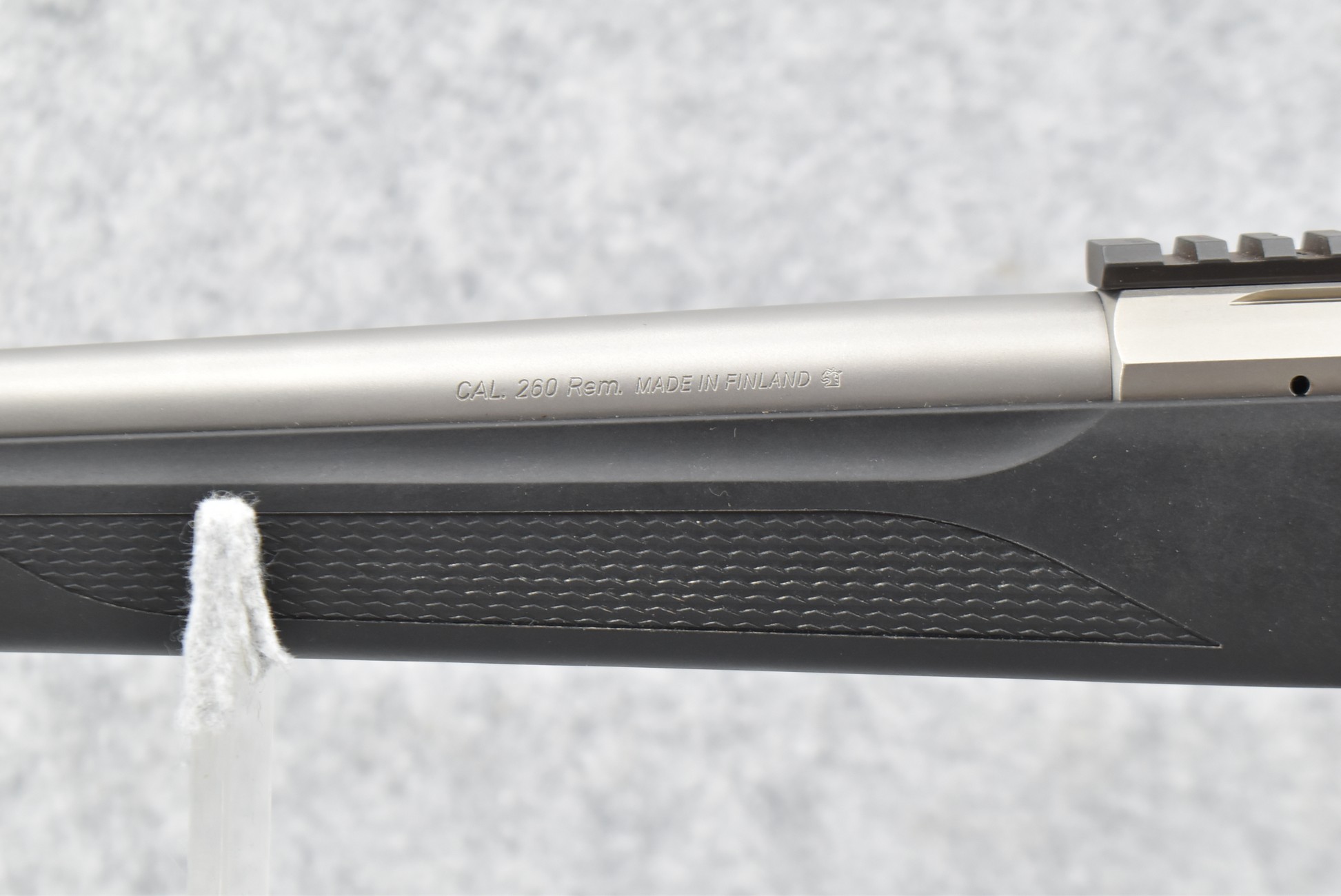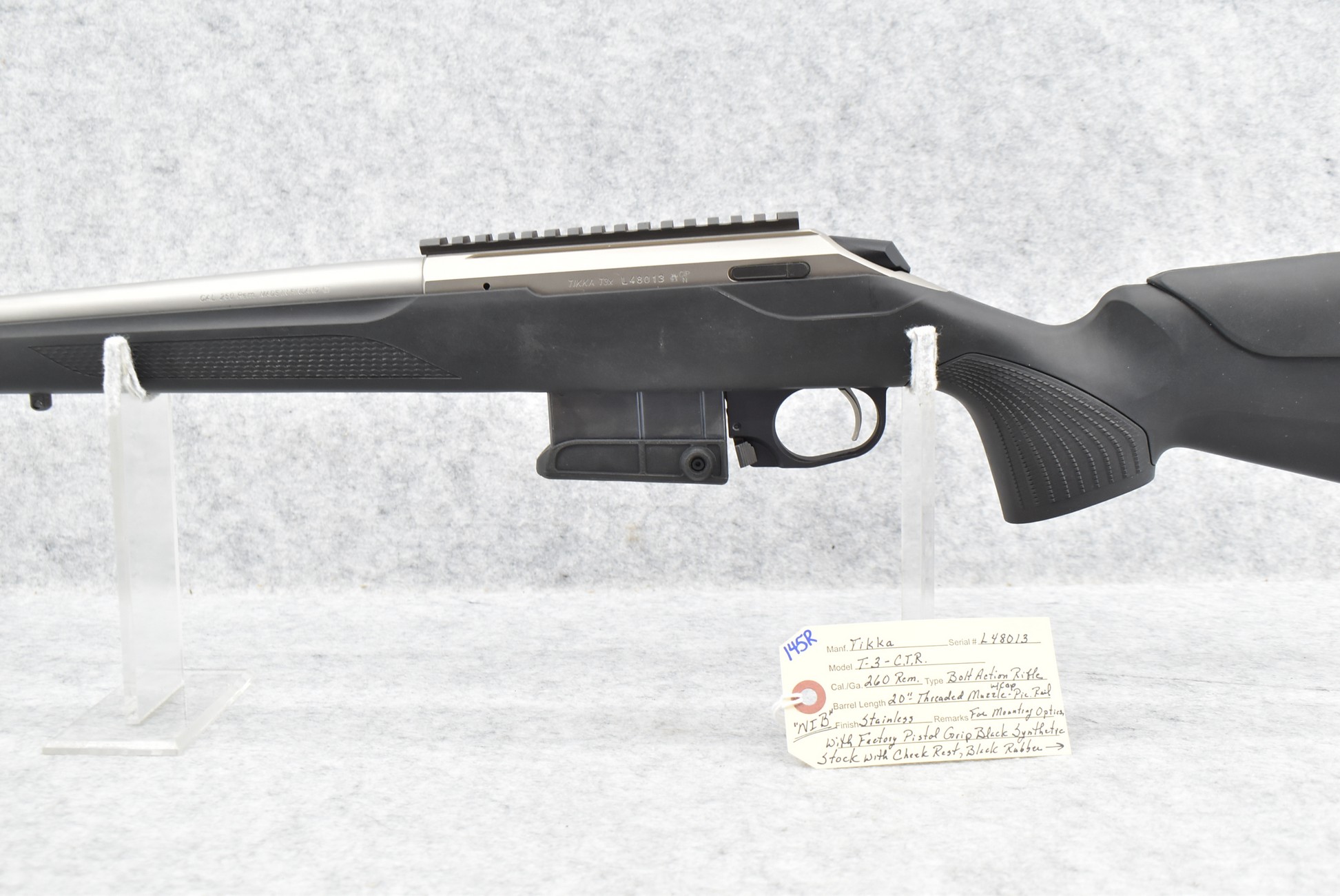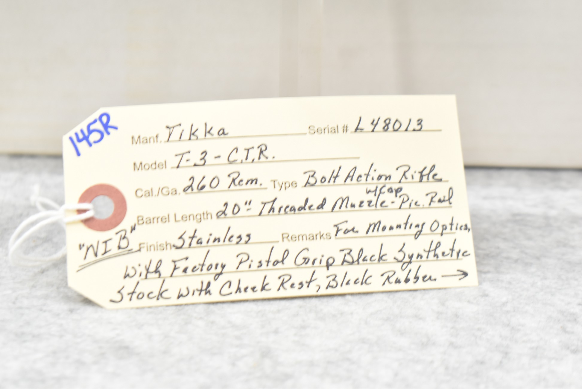 145R. Tikka – Mod. T-3 C.T.R. – 260 Rem. Cal. Bolt Action Rifle – w/20” Barrel w/Threaded Muzzle w/Cap – Matte Stainless Finish – w/Factory Pistol Grip Black Synthetic Stock w/Cheek Rest and Black Rubber Butt Pad – w/Detachable Magazine – w/Picatinny Rail for Mounting Optics – New in Factory Box