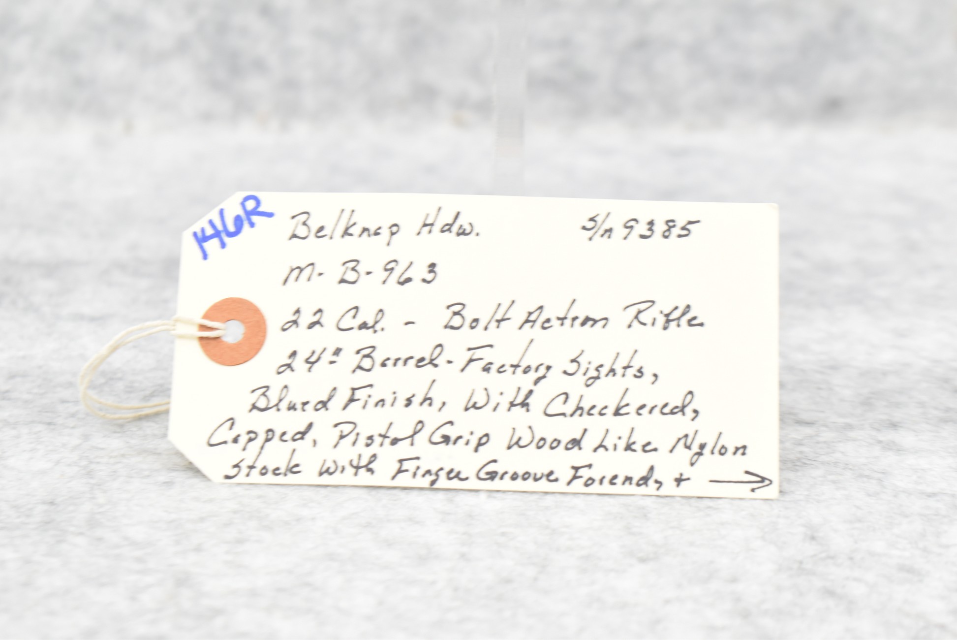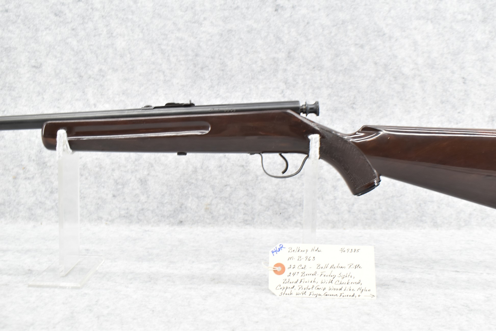 146R. Belknap Hdw. – Mod. B-963 – 22 Cal. Bolt Action Rifle – w/24” Barrel w/Factory Sights – Blued Finish – w/Checkered Capped Pistol Grip Wood-Like Tenite Stock and Finger Groove Forend w/Factory Black Butt Plate