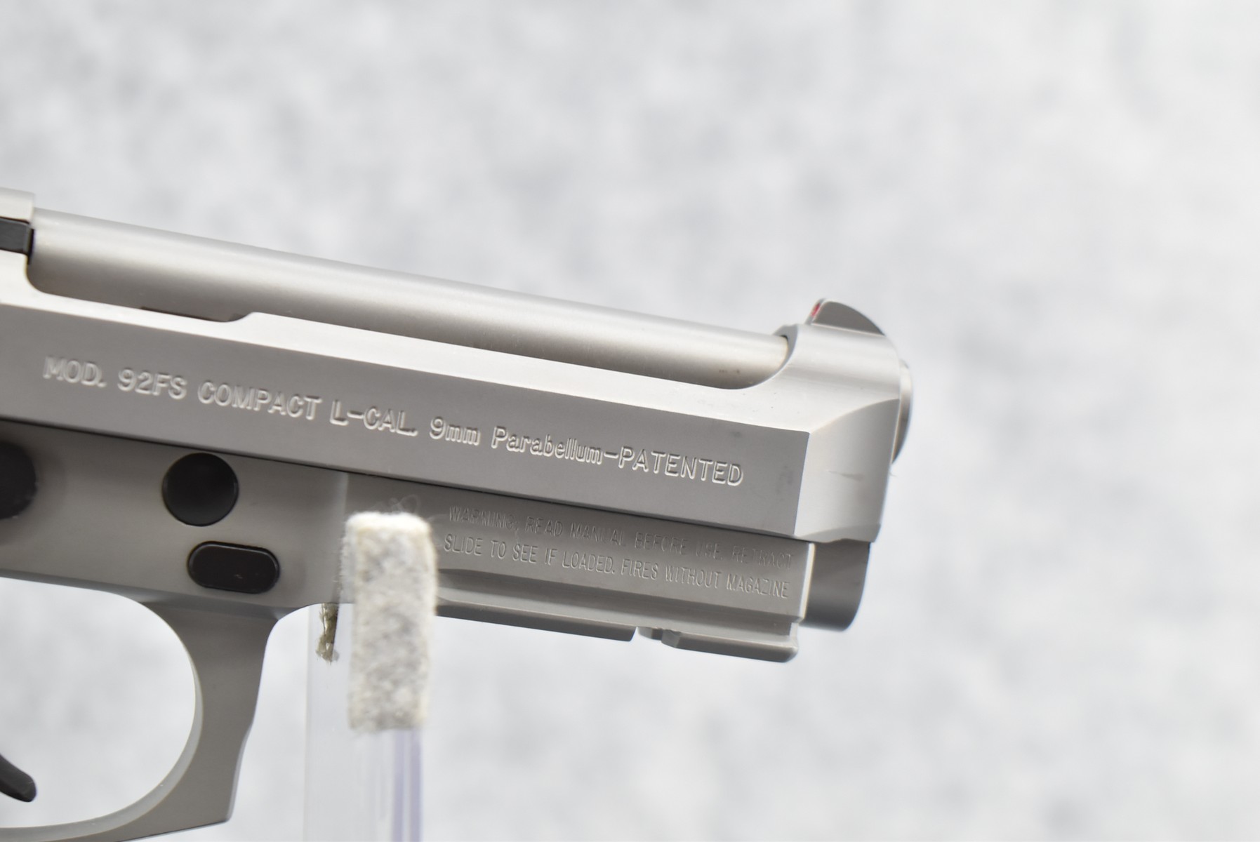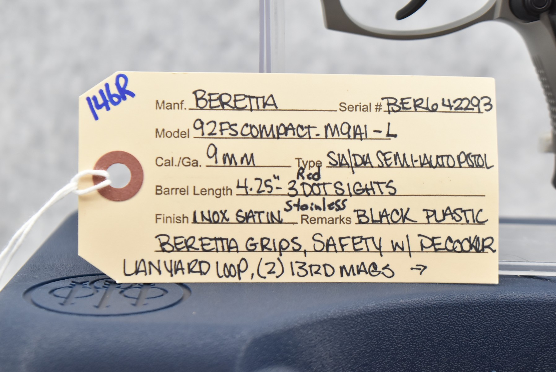 146R. Beretta – Mod. 92FS Compact-M9A1-L – 9mm Cal. Semi-Auto Pistol – w/4.25” w/3 Red Dot Sights – INOX Satin Stainless Finish – w/Black Plastic Beretta Grips – Safety w/Decocker – w/Two 13Rd Mags – w/Lanyard Loop – Appears Unfired w/Factory Box, Manual & Lock