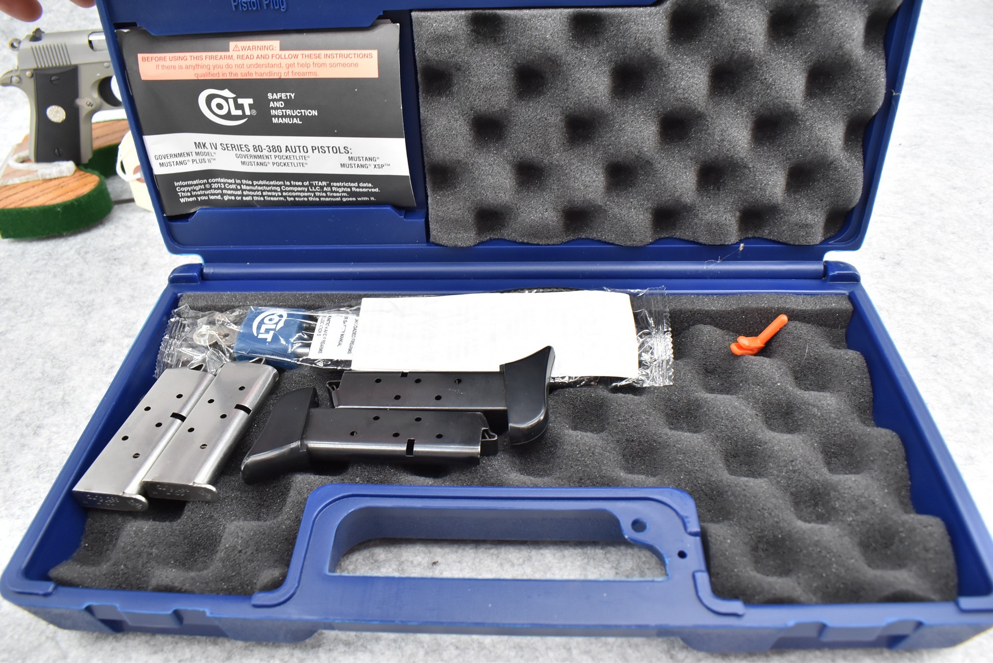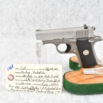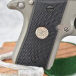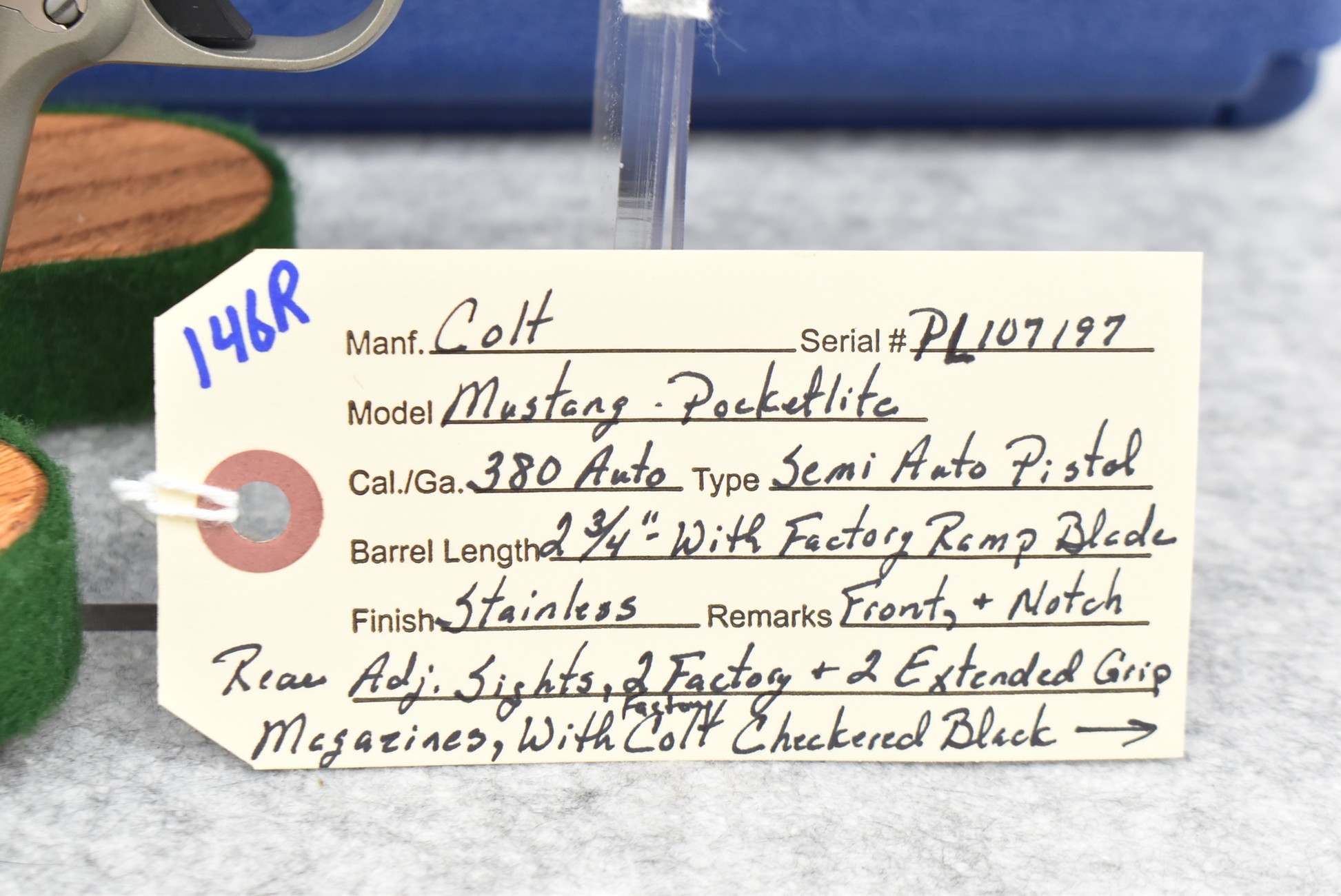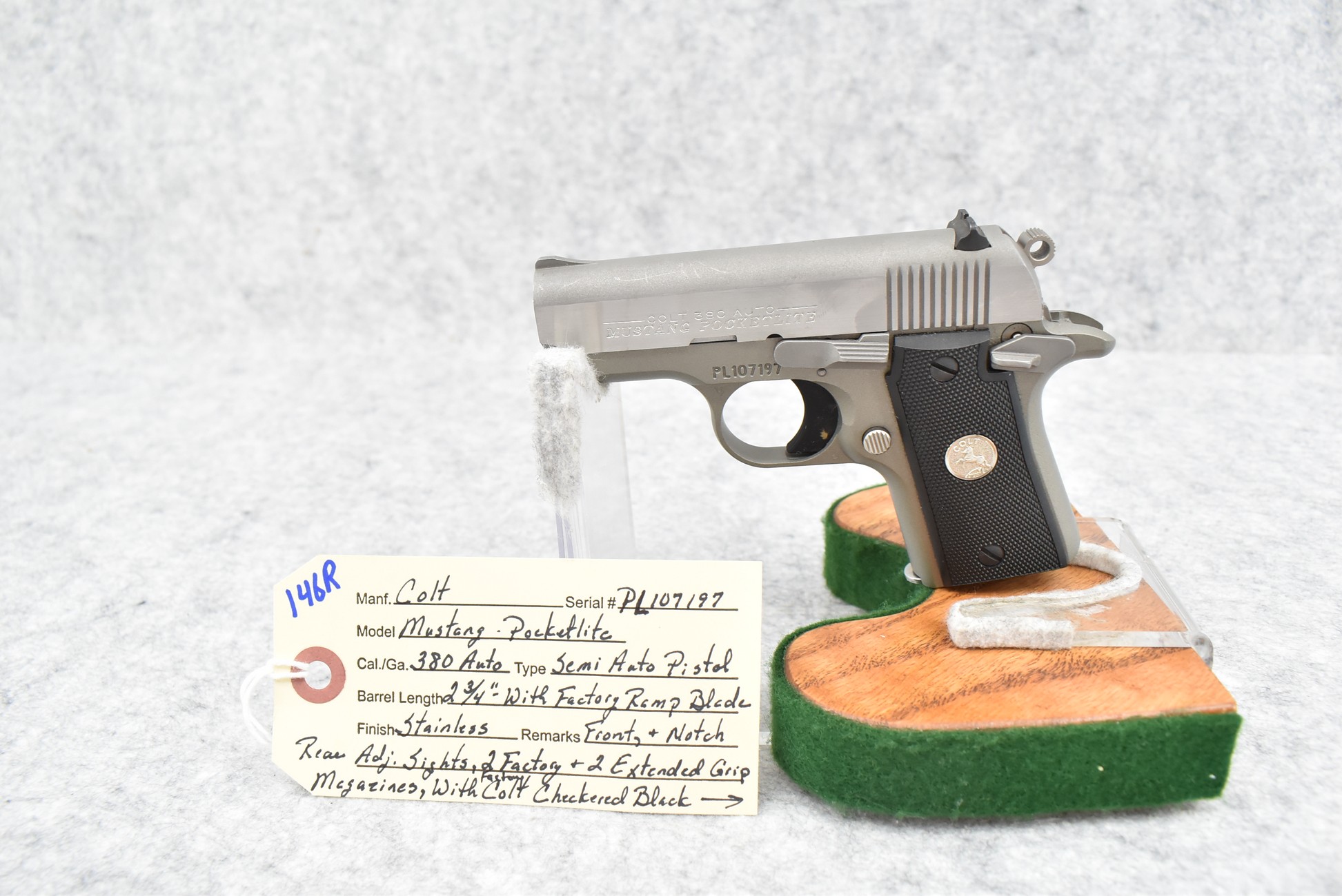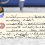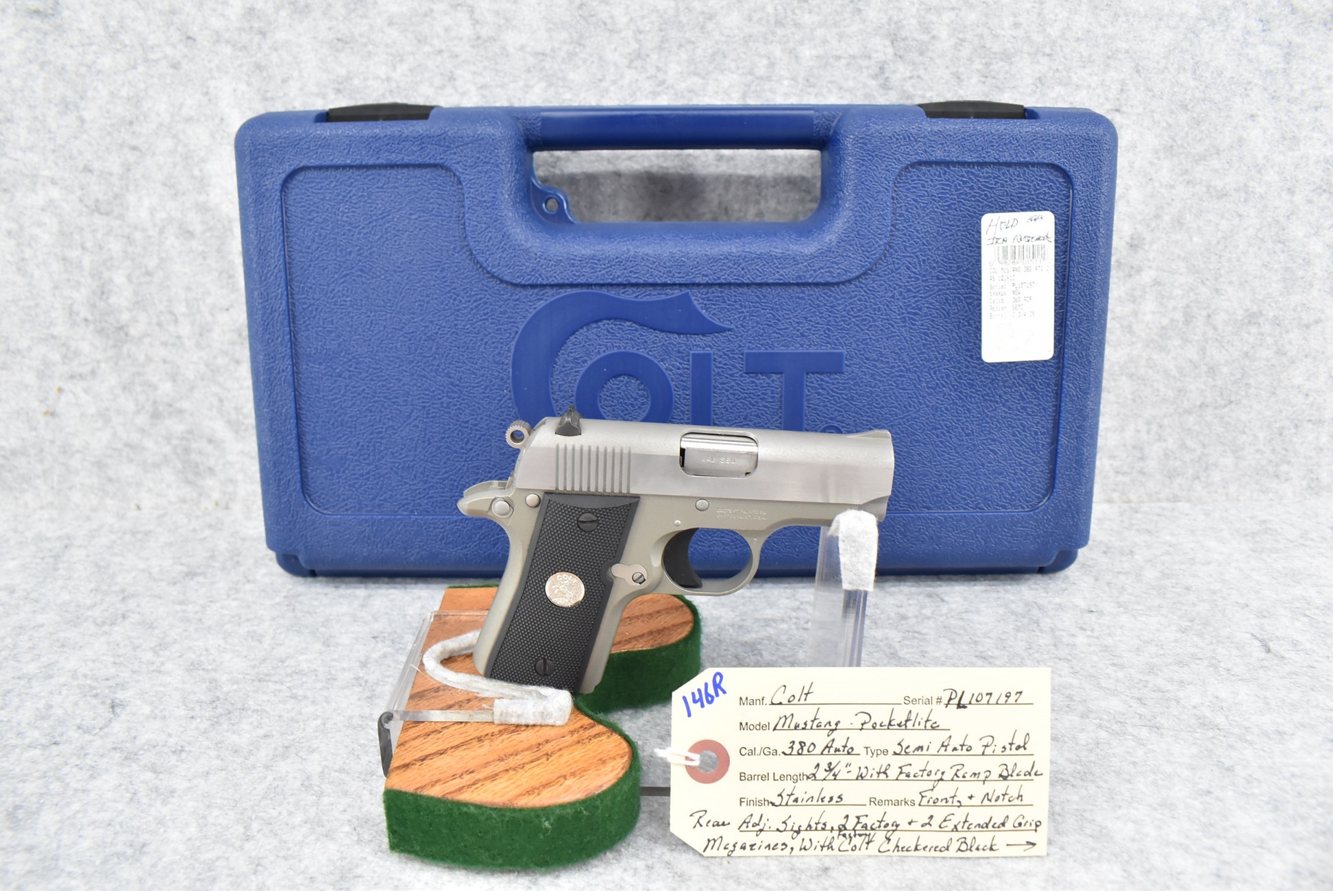 146R. Colt – Mod. Mustang Pocketlite – 380 Auto Cal. Semi-Auto Pistol – w/2 ¾” Barrel w/Factory Ramp Blade Front & Notch Rear Adj. Sights – Stainless Finish – w/Factory Colt Checkered Black Plastic Grips w/Colt Medallion – w/2 Factory & 2 Custom Extended Grip Magazines – w/Factory Hard Case, Manual & Accessories
