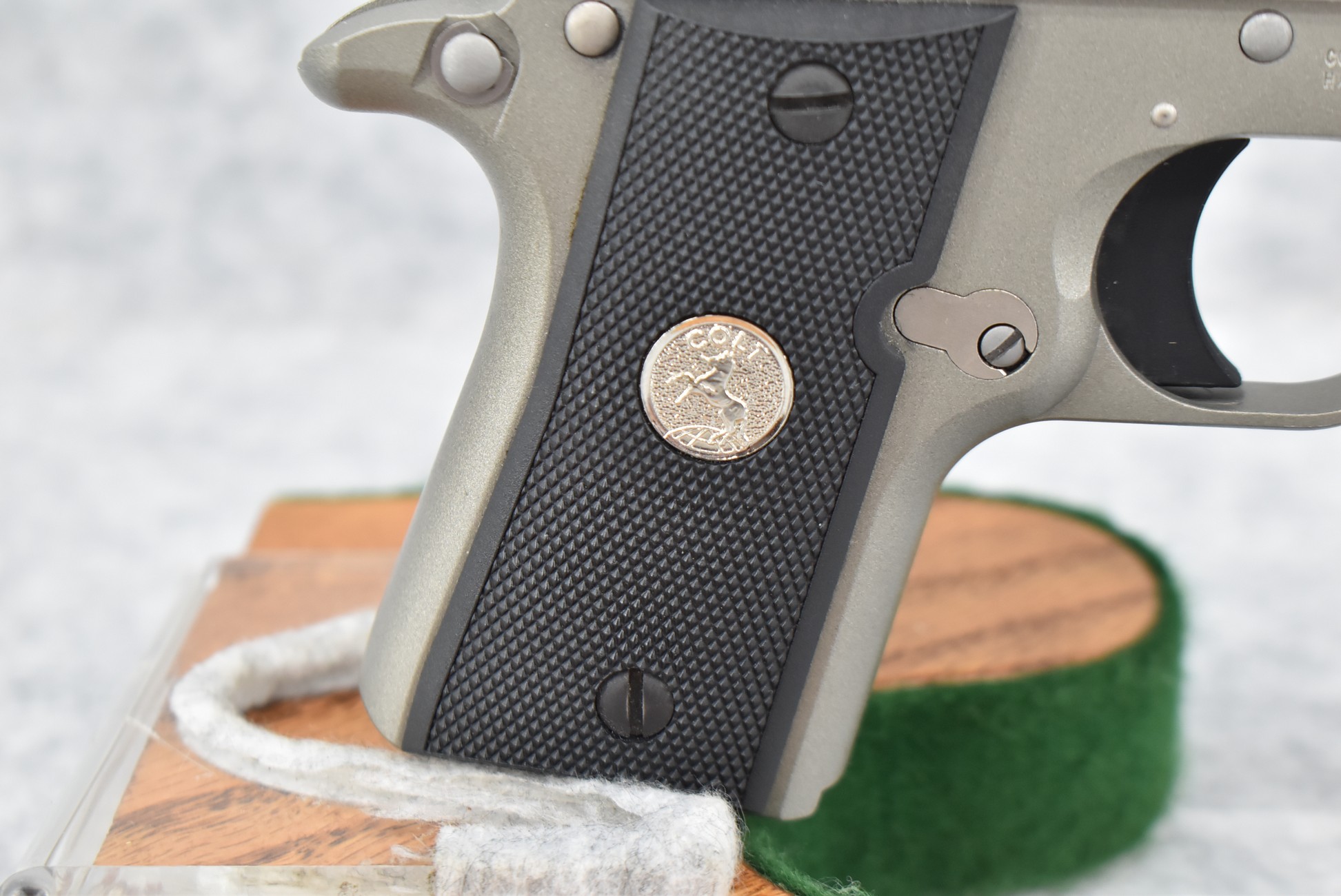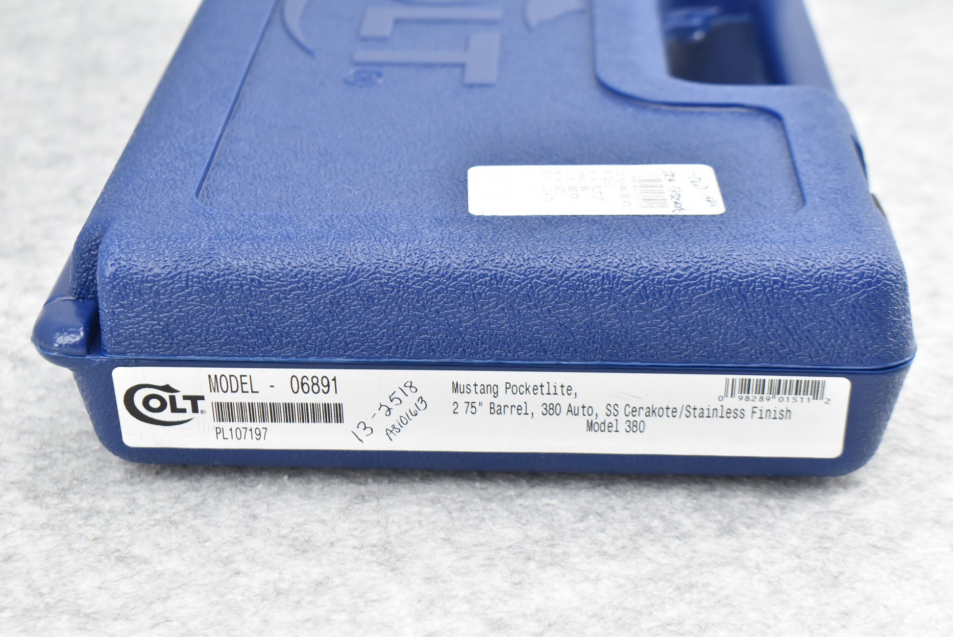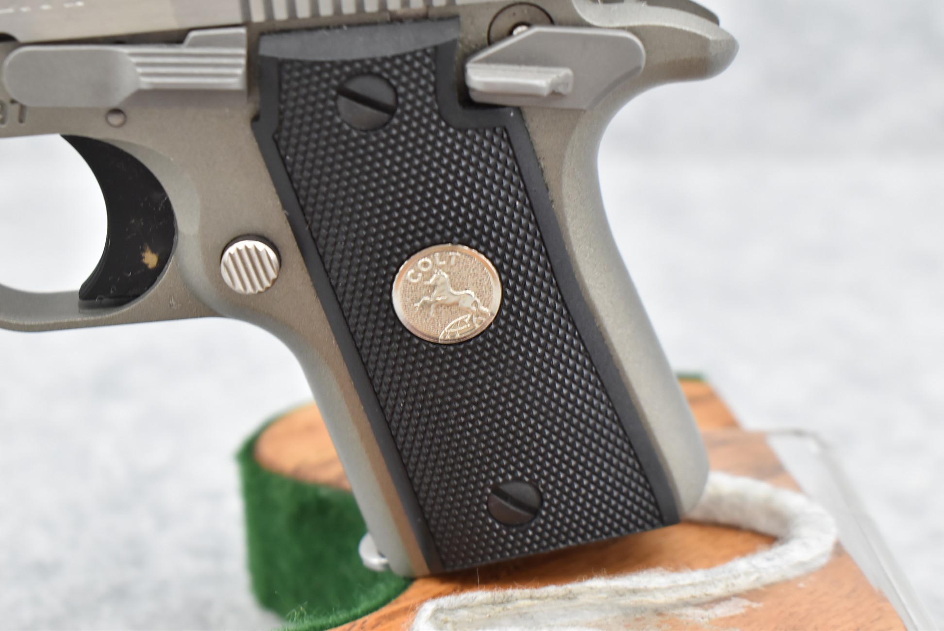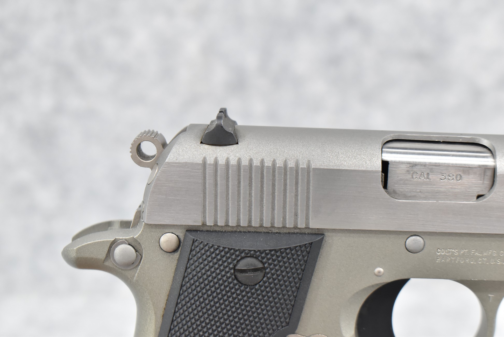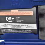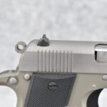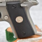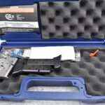 146R. Colt – Mod. Mustang Pocketlite – 380 Auto Cal. Semi-Auto Pistol – w/2 ¾” Barrel w/Factory Ramp Blade Front & Notch Rear Adj. Sights – Stainless Finish – w/Factory Colt Checkered Black Plastic Grips w/Colt Medallion – w/2 Factory & 2 Custom Extended Grip Magazines – w/Factory Hard Case, Manual & Accessories