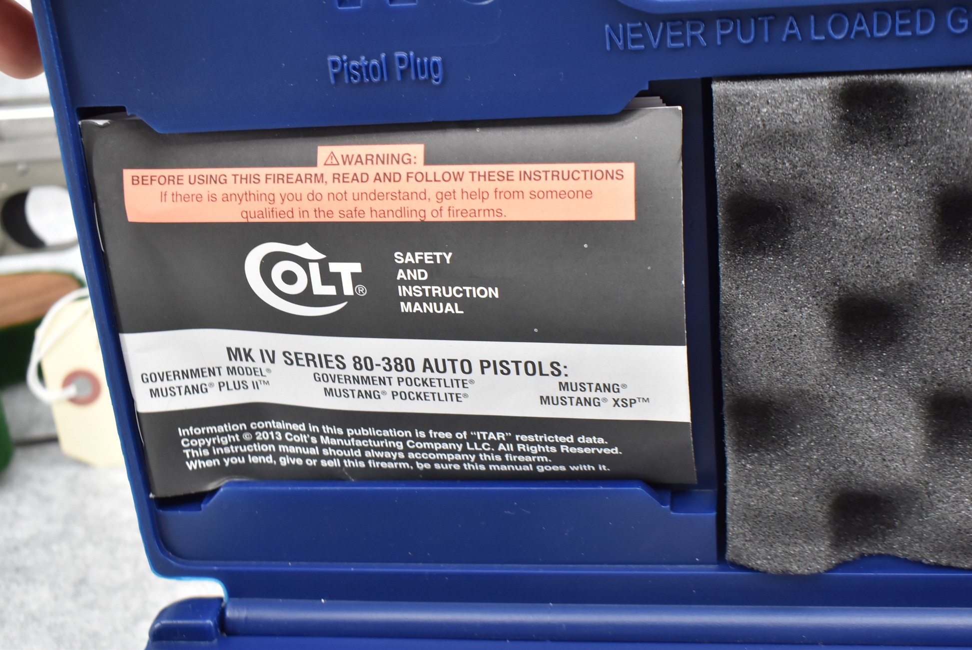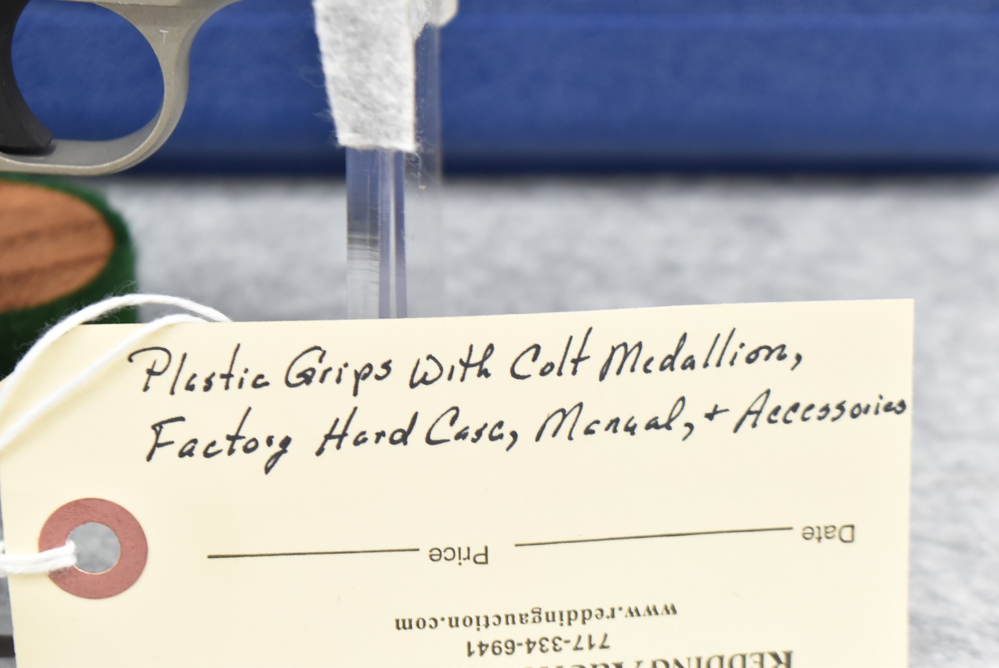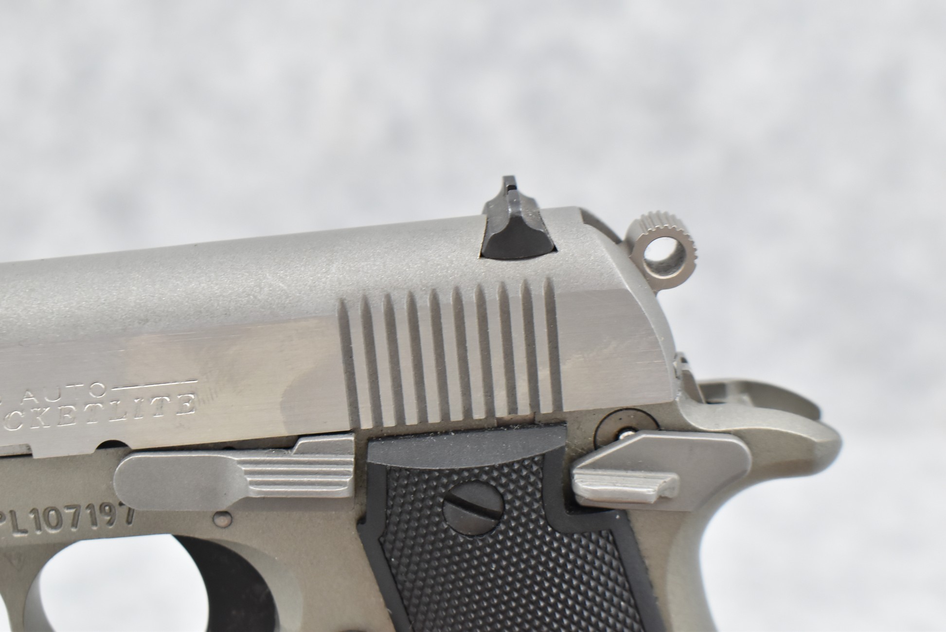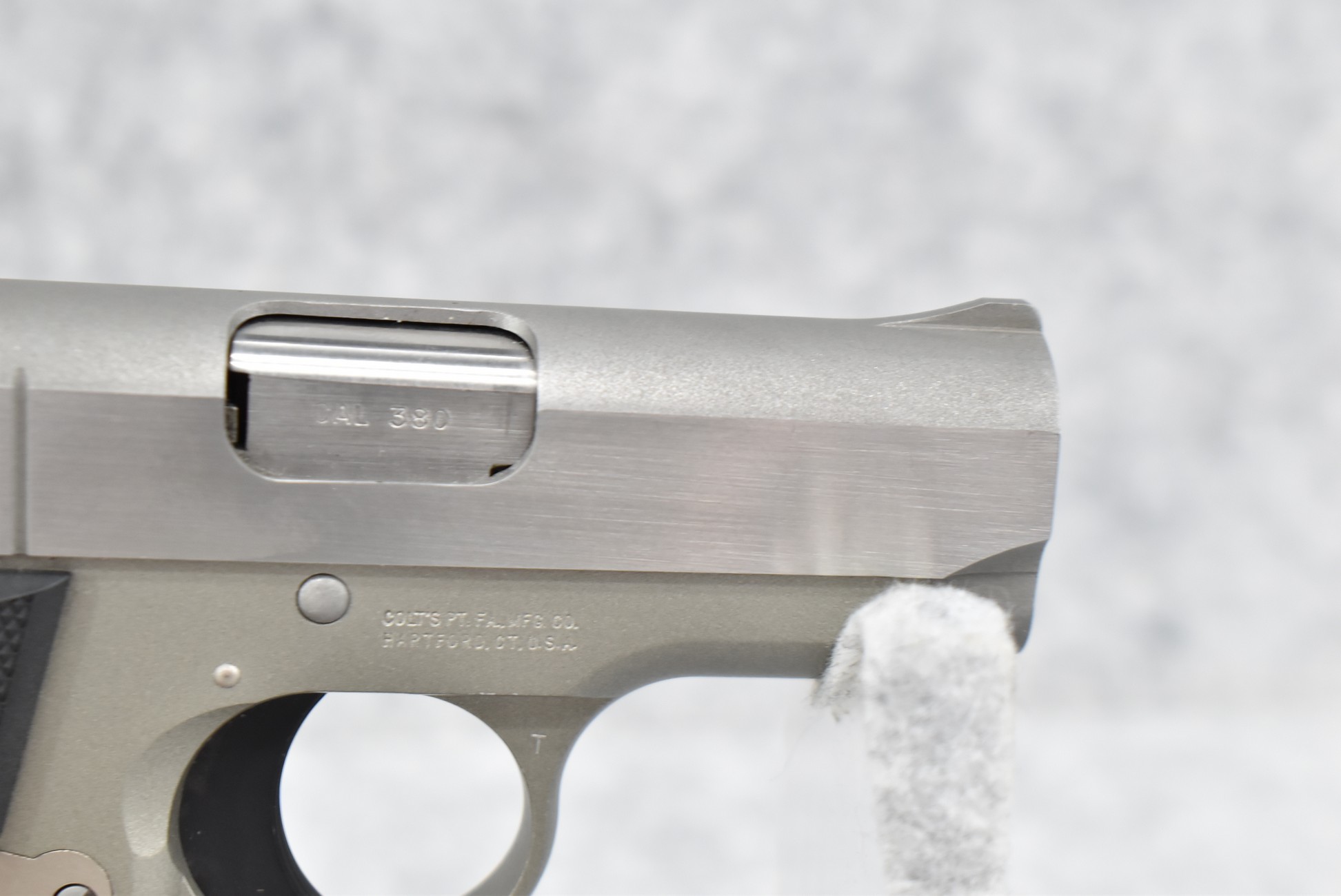 146R. Colt – Mod. Mustang Pocketlite – 380 Auto Cal. Semi-Auto Pistol – w/2 ¾” Barrel w/Factory Ramp Blade Front & Notch Rear Adj. Sights – Stainless Finish – w/Factory Colt Checkered Black Plastic Grips w/Colt Medallion – w/2 Factory & 2 Custom Extended Grip Magazines – w/Factory Hard Case, Manual & Accessories