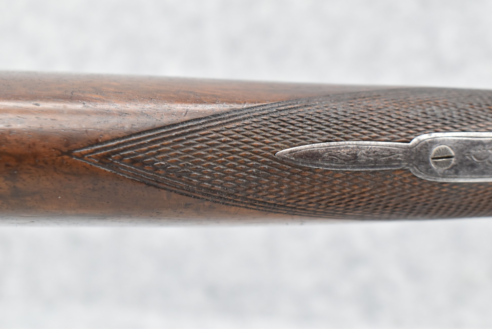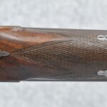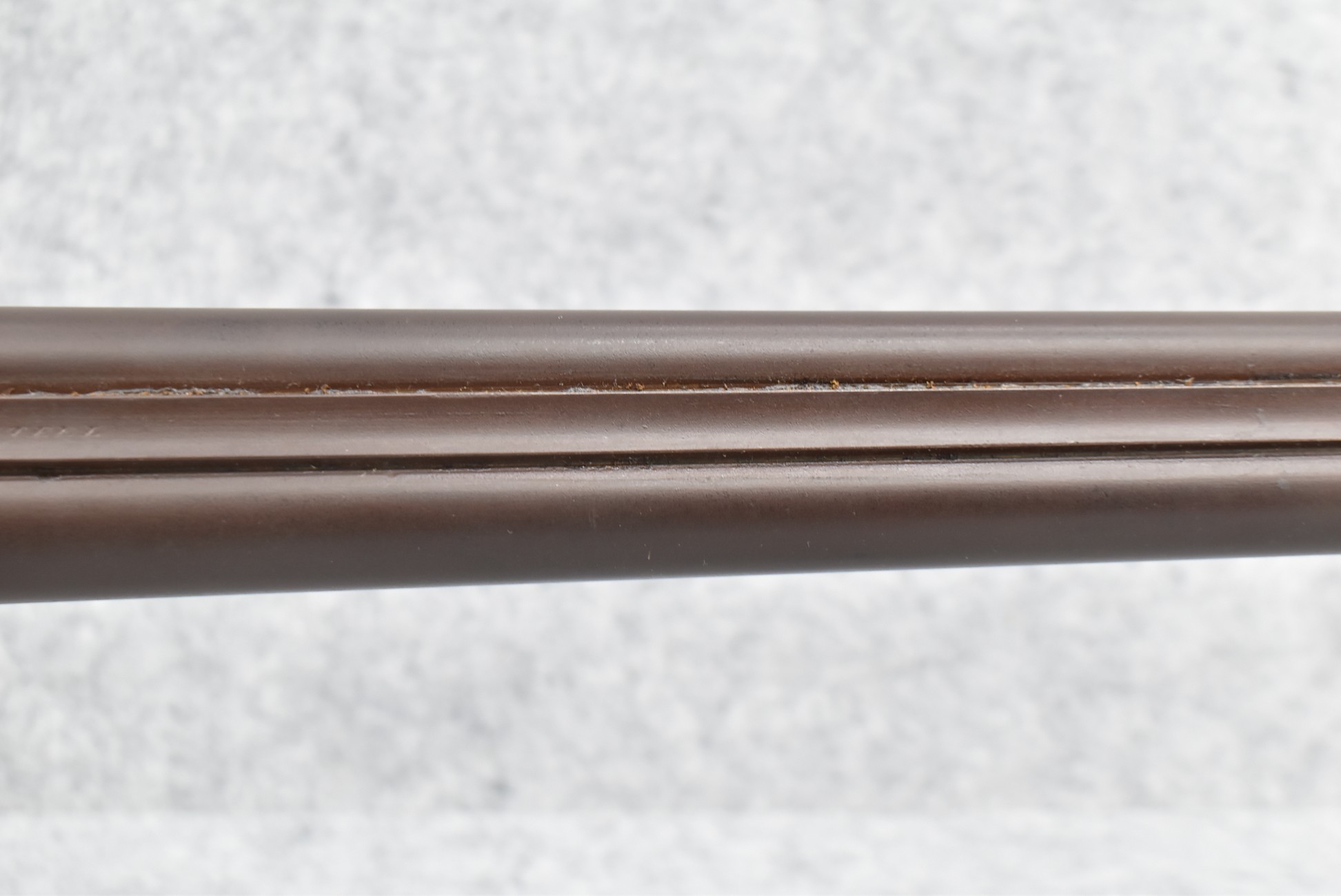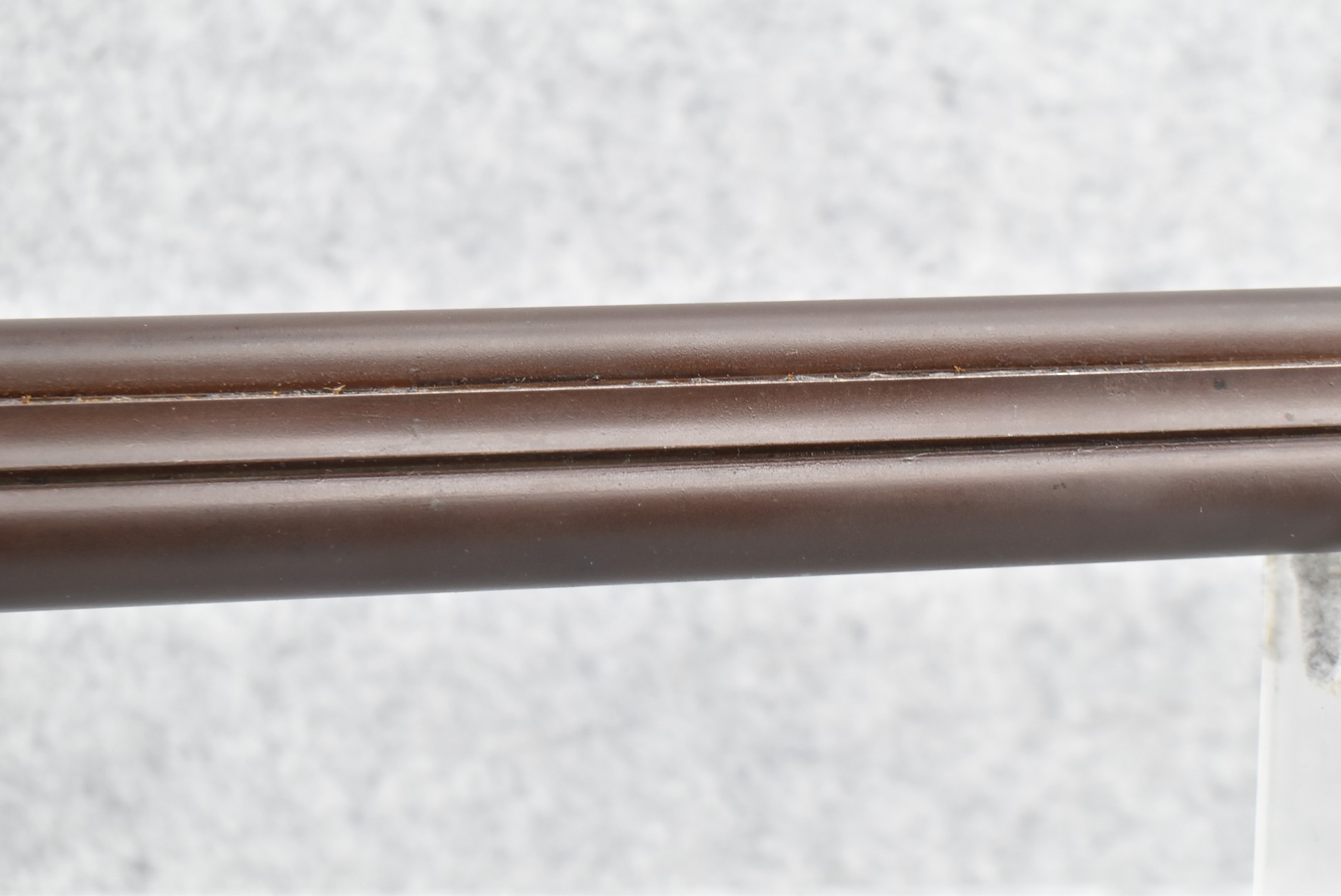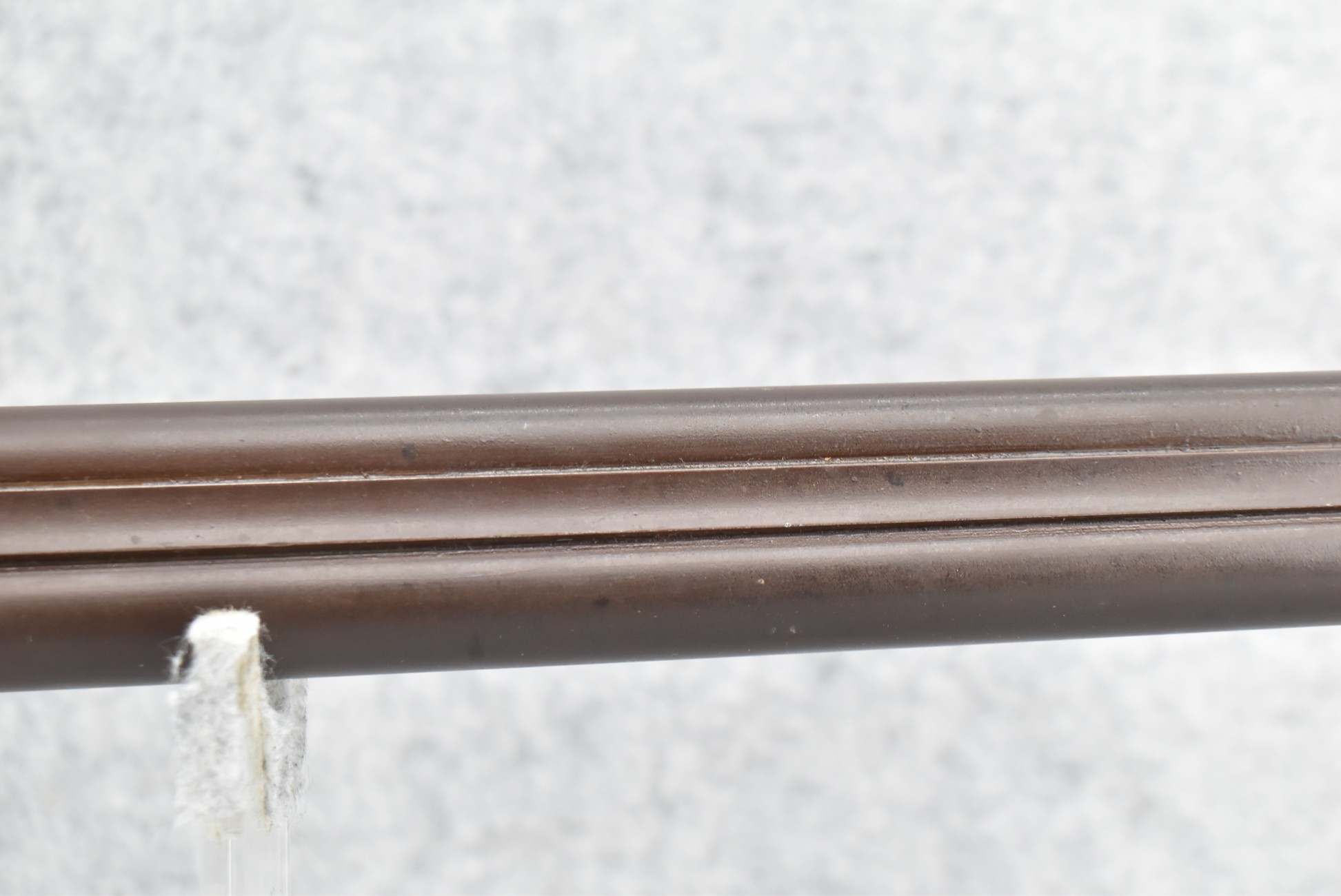 147. 12ga. Black Powder Double Barrel Shotgun – w/30” Laminated Steel Barrels – w/Checkered Straight Grip Wood Stock w/Metal Shotgun Butt Plate – Metal is Lightly Engraved as Well as the Hammers – w/Double Hammers & Triggers
