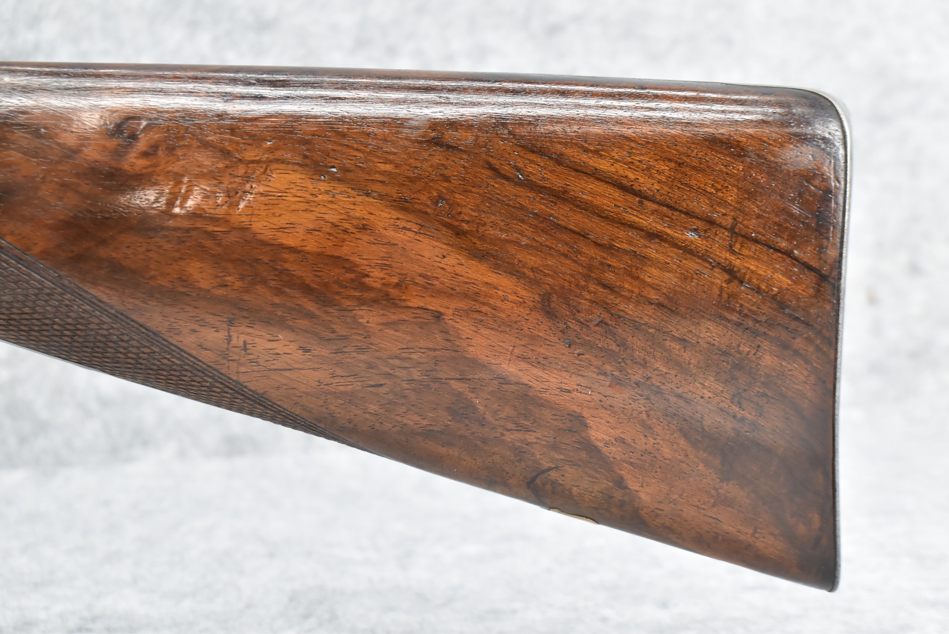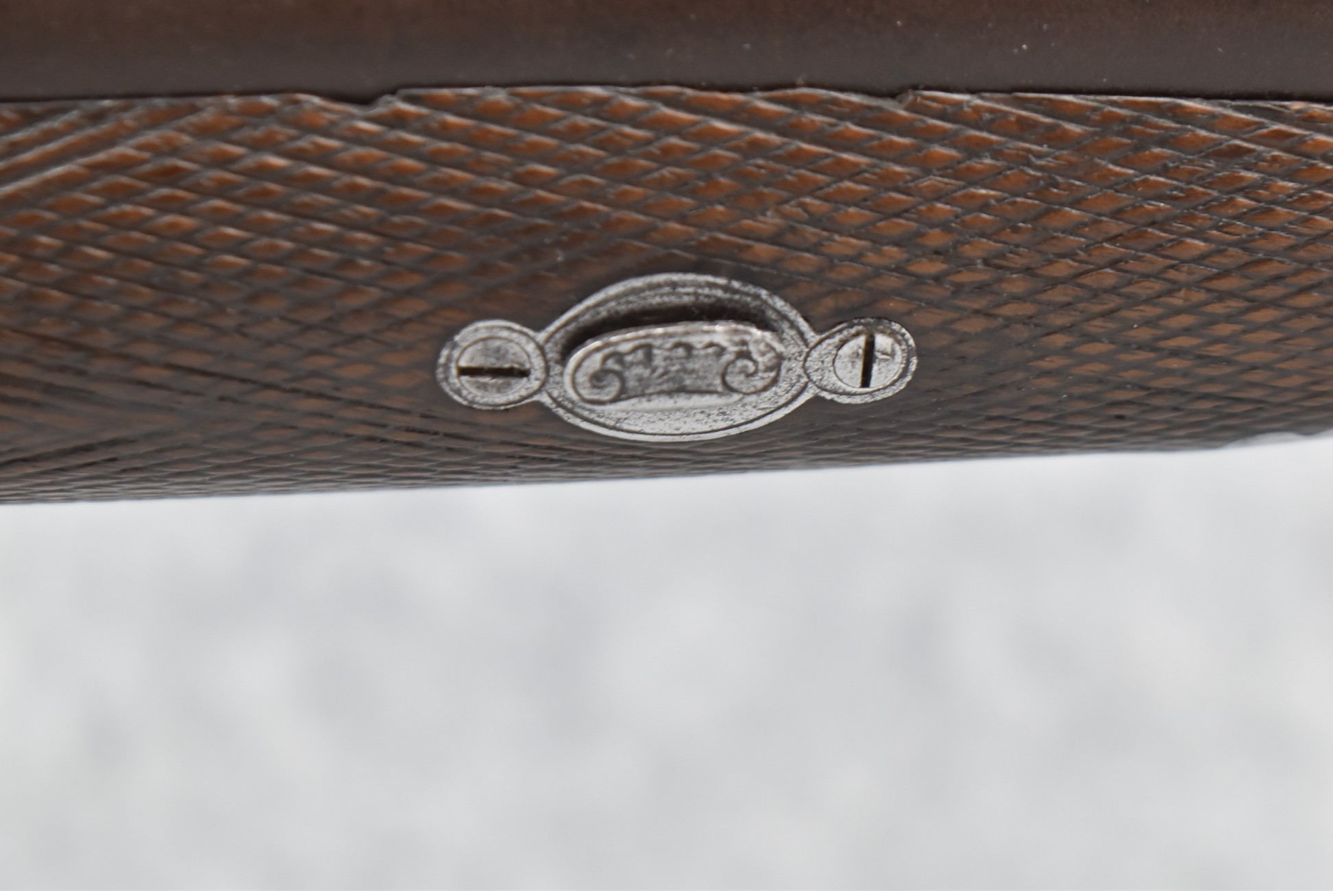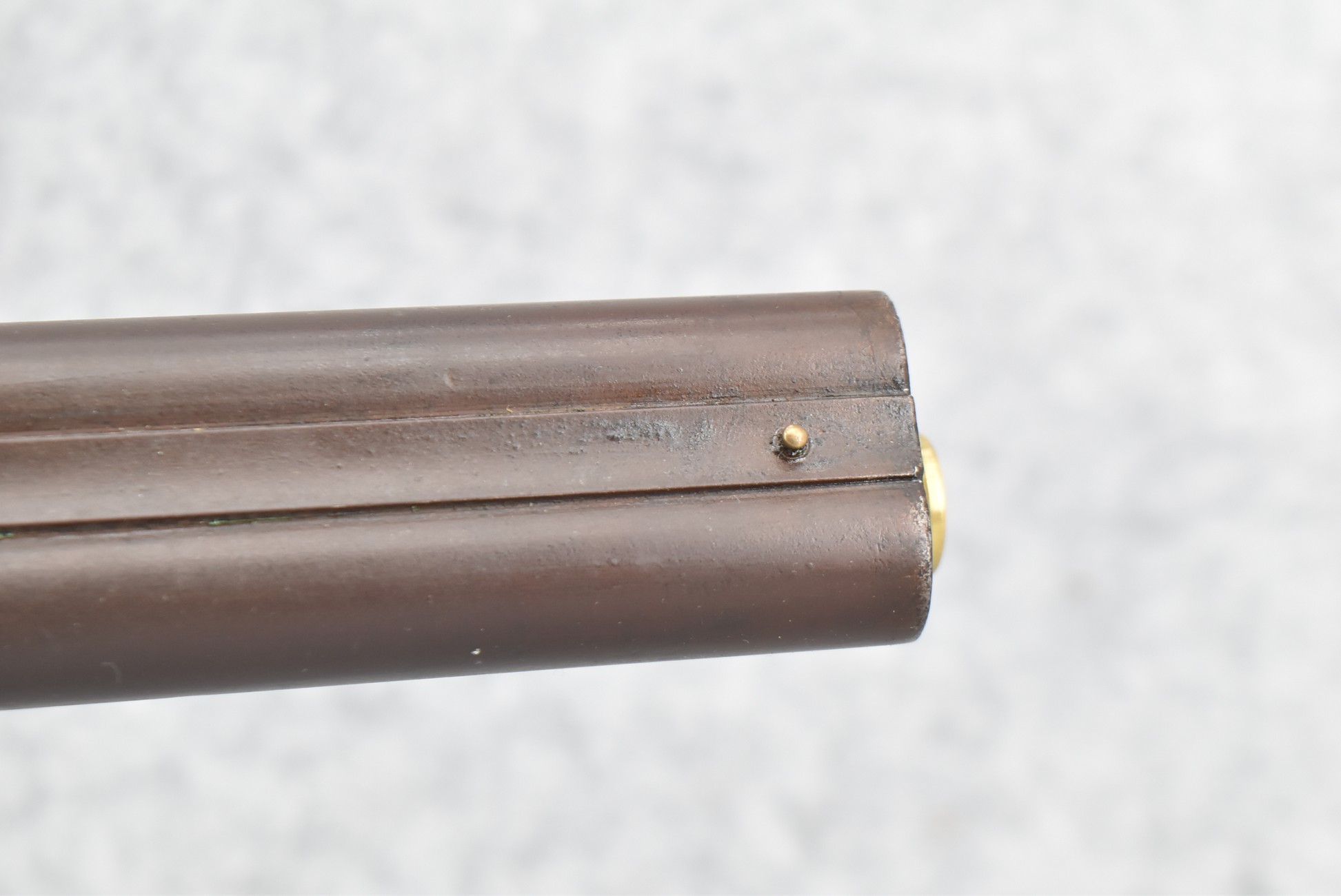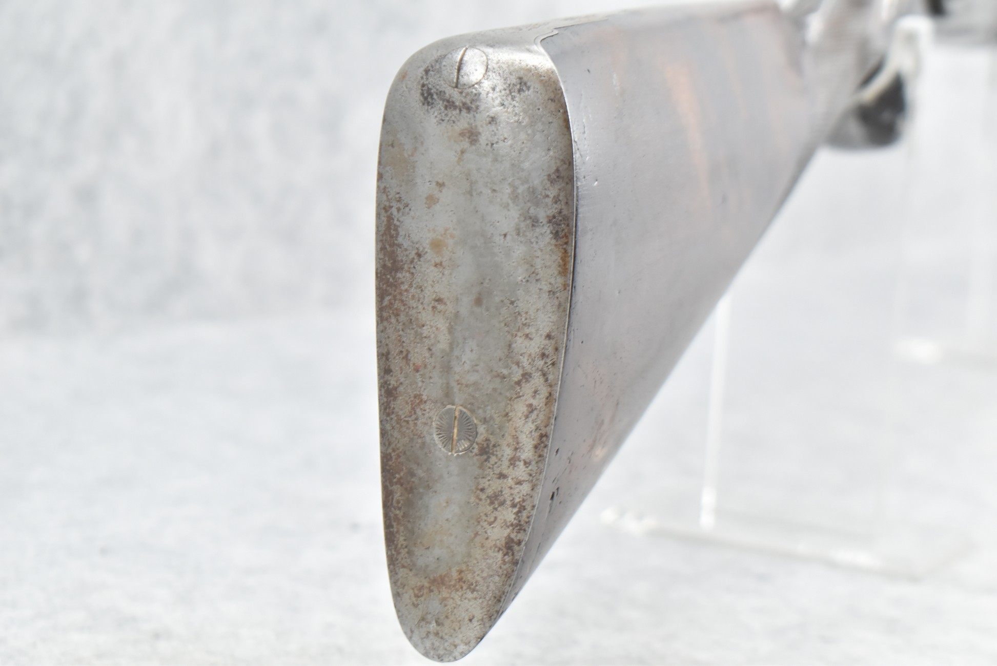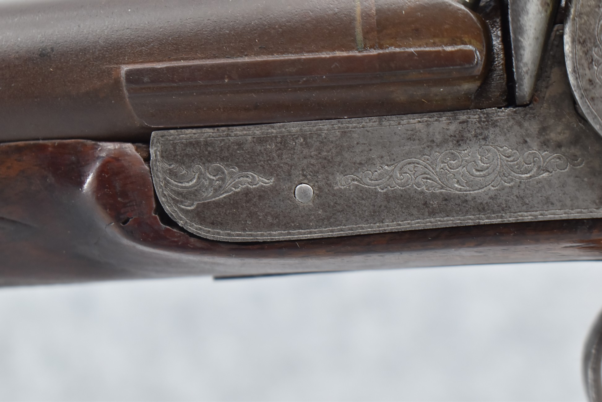 147. 12ga. Black Powder Double Barrel Shotgun – w/30” Laminated Steel Barrels – w/Checkered Straight Grip Wood Stock w/Metal Shotgun Butt Plate – Metal is Lightly Engraved as Well as the Hammers – w/Double Hammers & Triggers