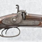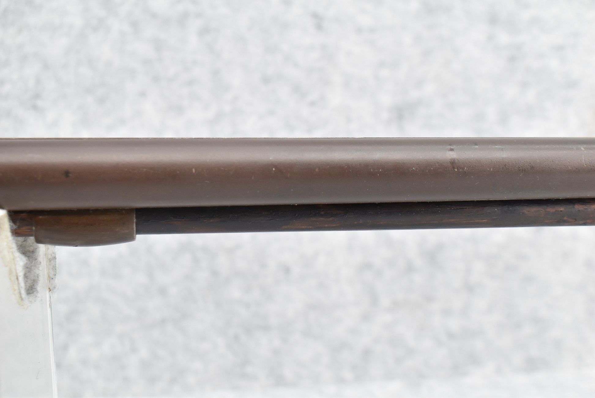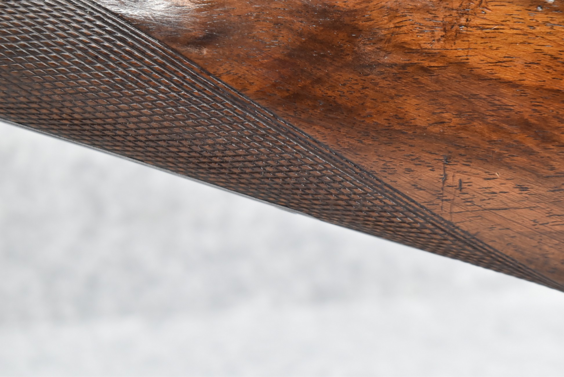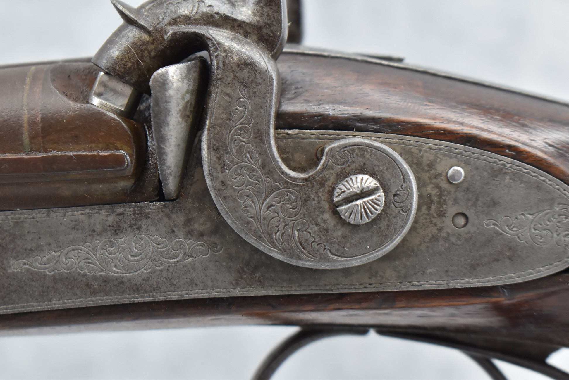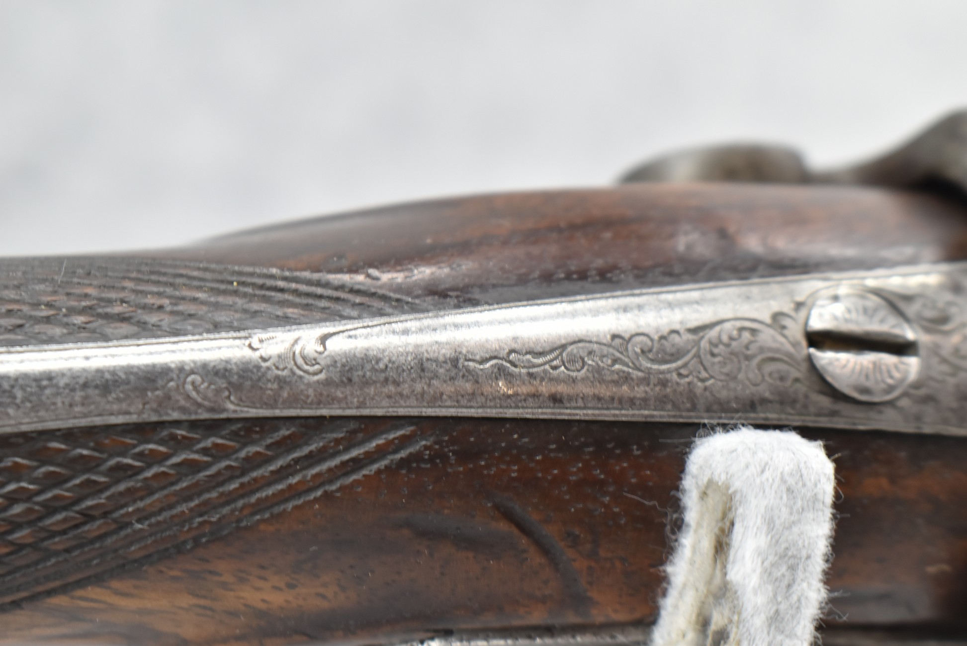 147. 12ga. Black Powder Double Barrel Shotgun – w/30” Laminated Steel Barrels – w/Checkered Straight Grip Wood Stock w/Metal Shotgun Butt Plate – Metal is Lightly Engraved as Well as the Hammers – w/Double Hammers & Triggers