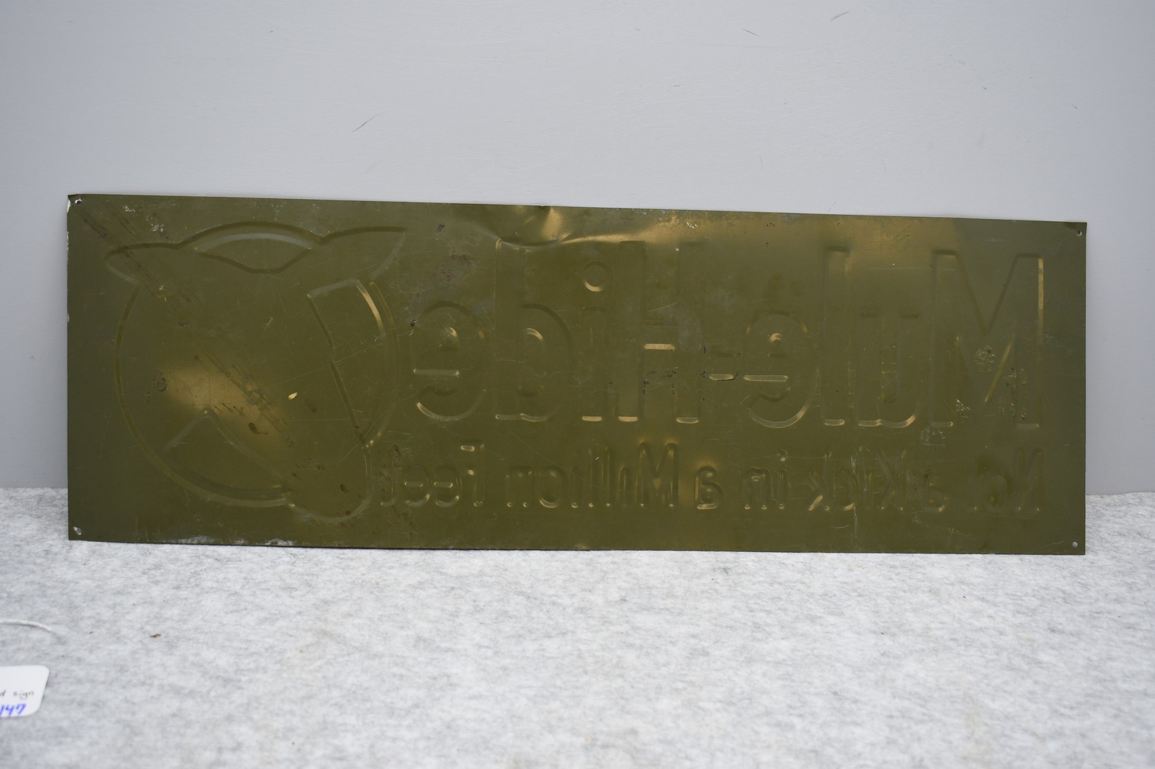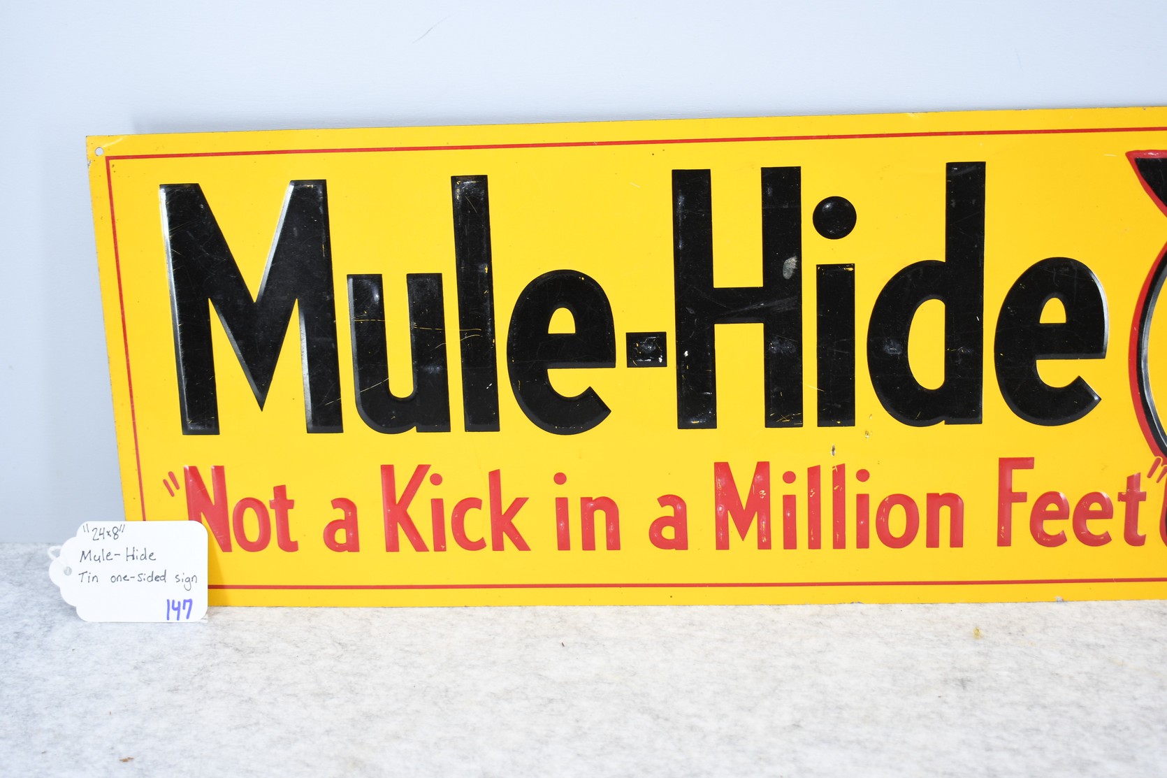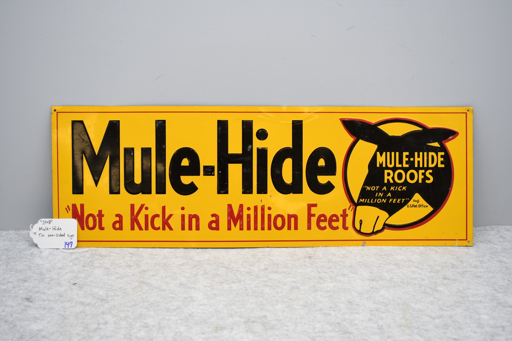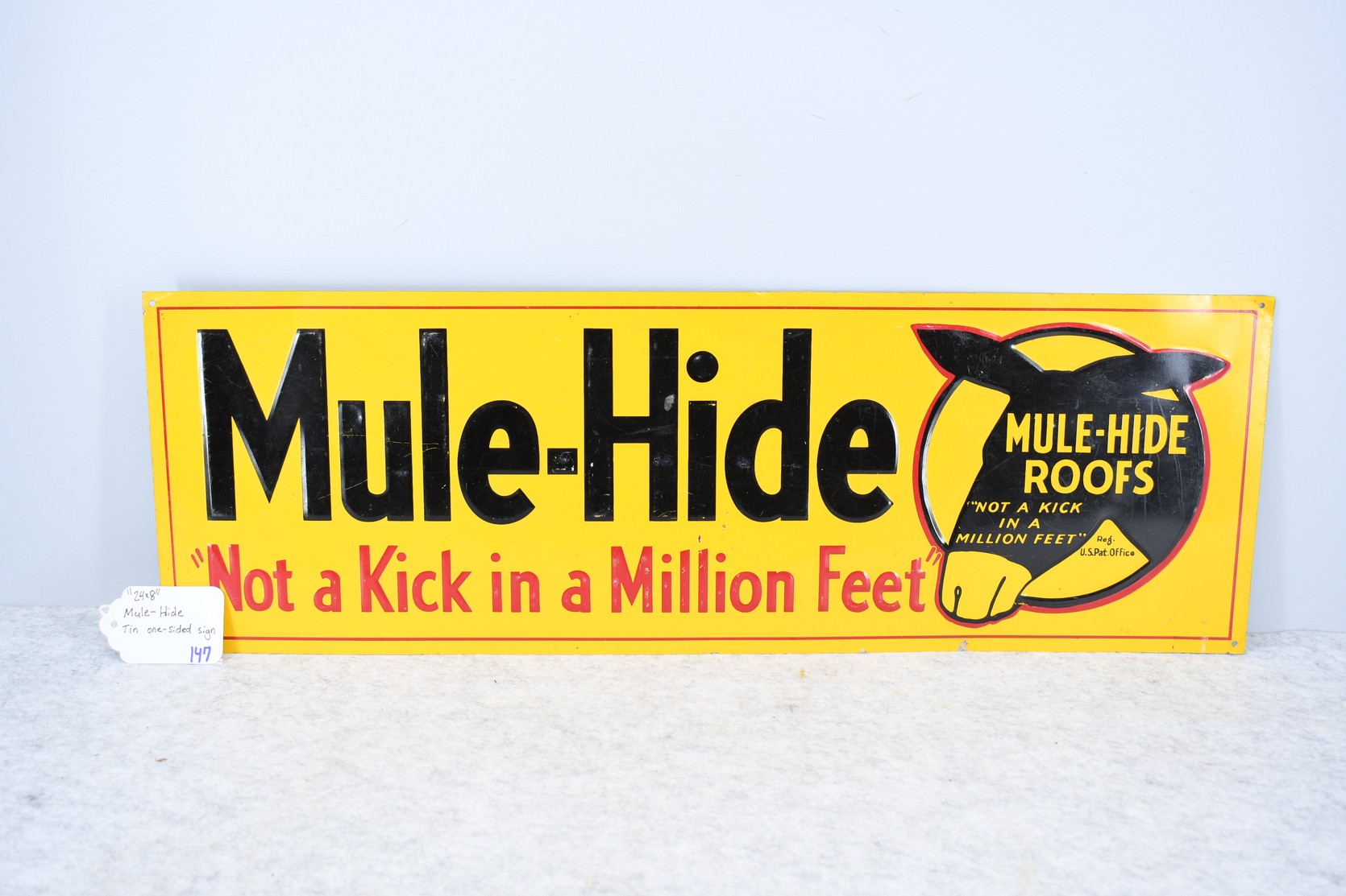 147. Mule-Hide “Not a Kick in a Million Feet” Mule Hide Roofs Reproduction Metal Sign – Sign Measures 8” x 12”
