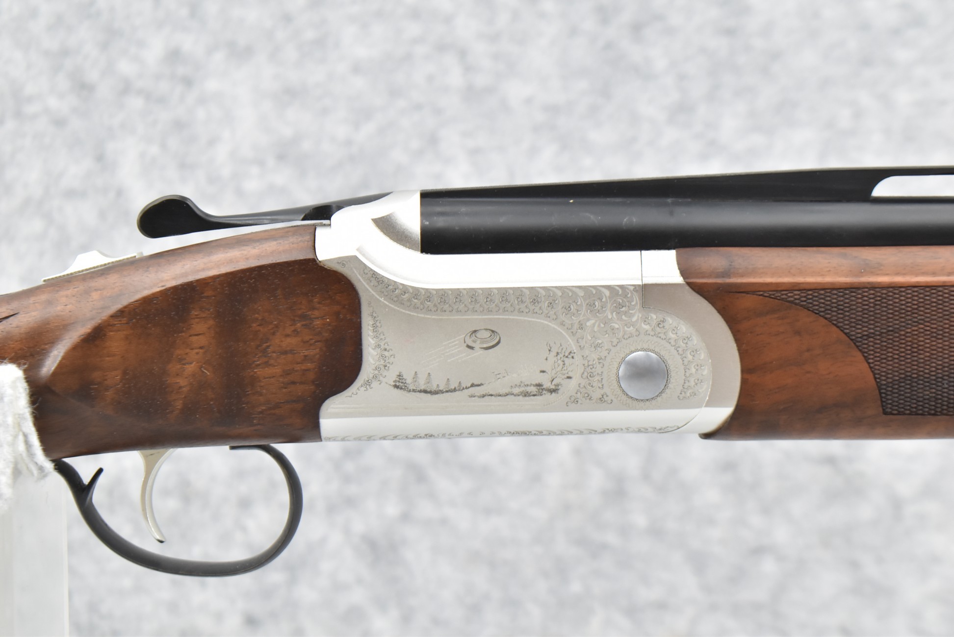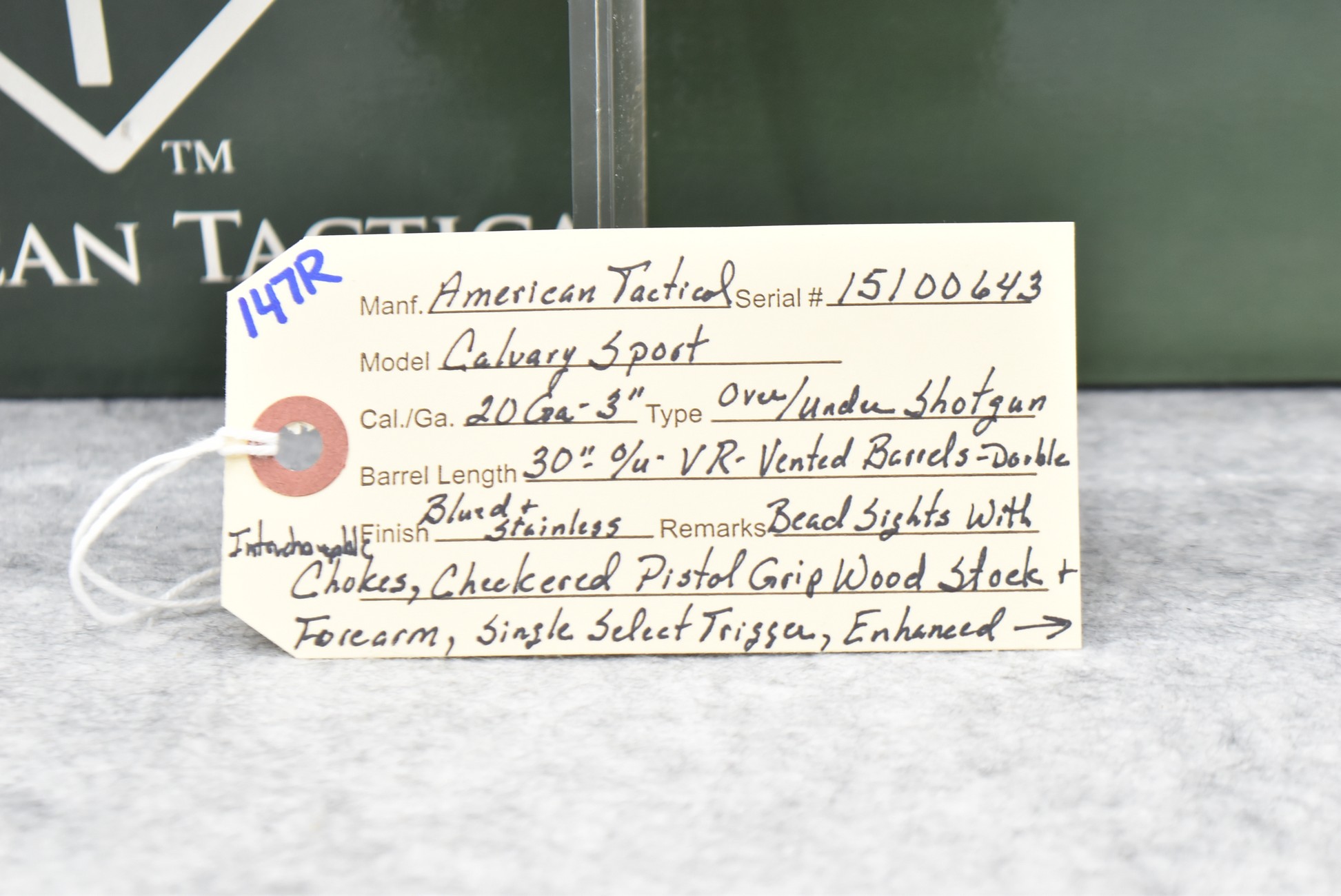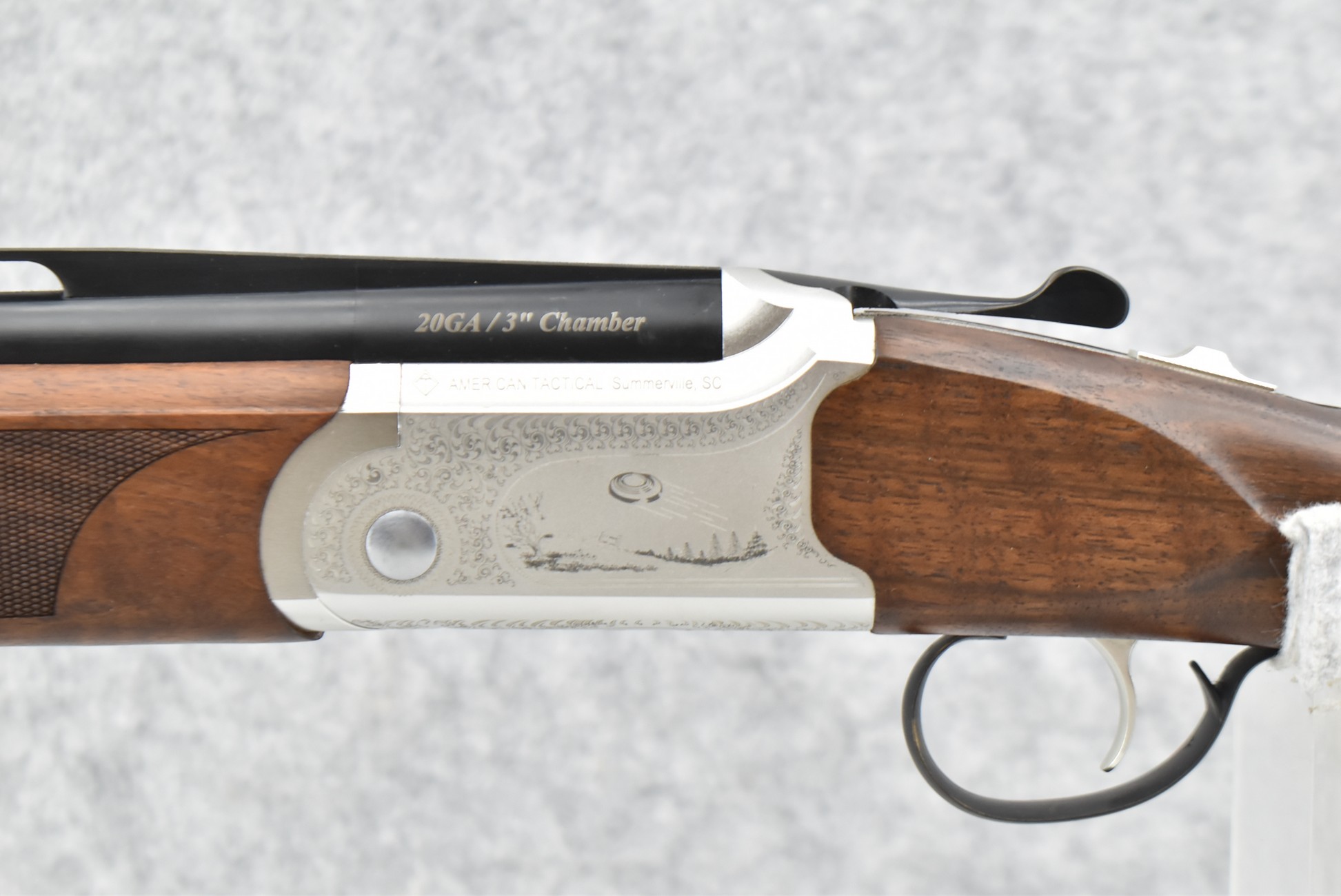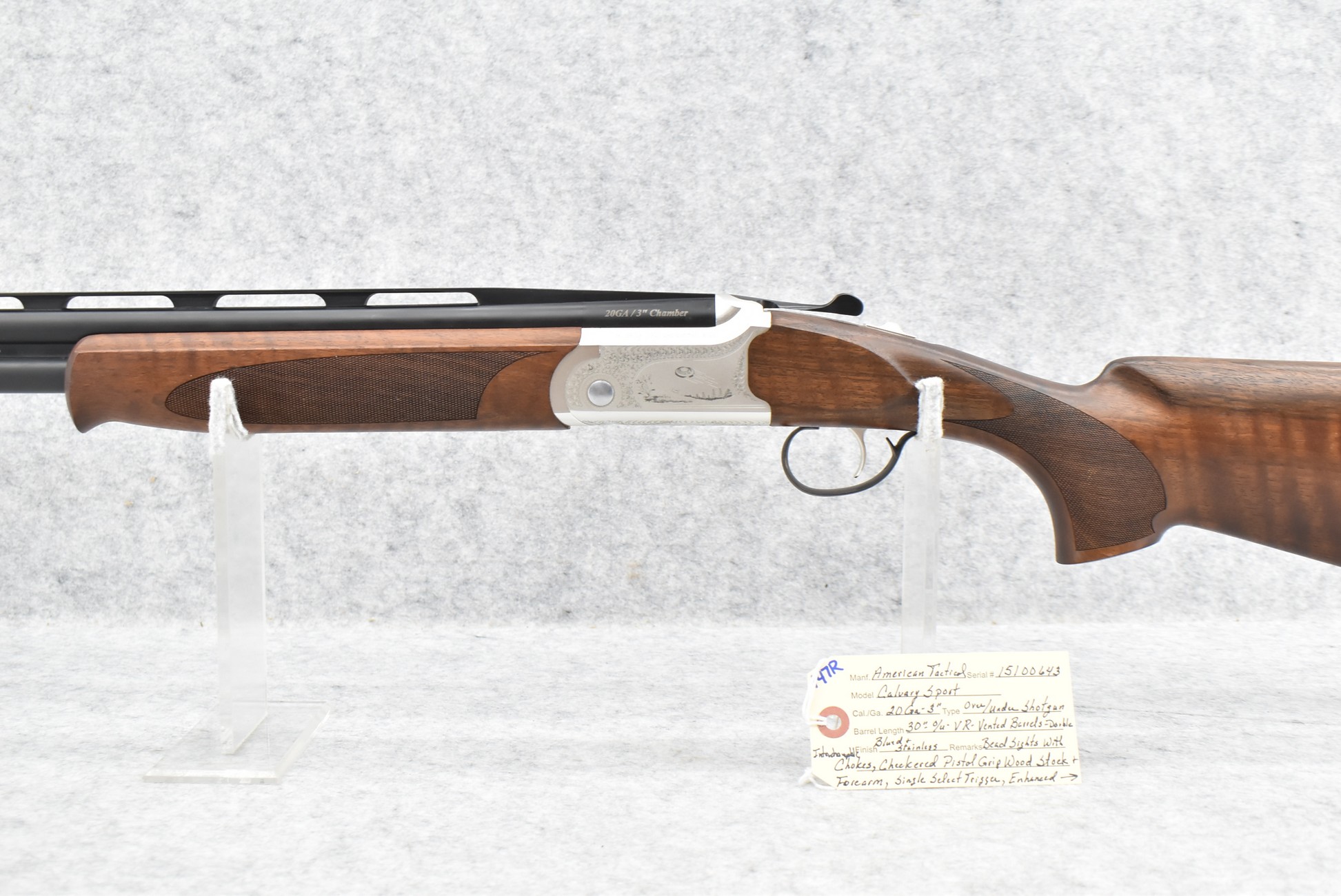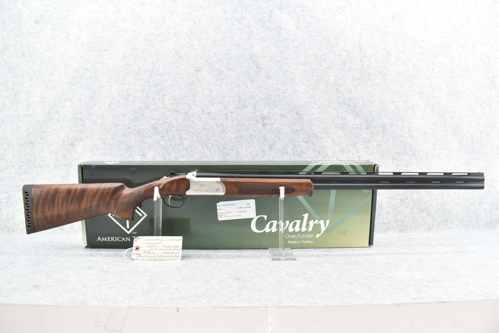 147R. American Tactical – Mod. Calvary Sport – 20ga. 3” Over/Under Shotgun – w/30” Vent Rib Interchangeable Choke Barrels w/Double Bead Sights – Blued and Silver Finish – w/Checkered Pistol Grip Wood Stock and Forearm w/Factory Butt Pad – w/Single Select Trigger – w/Engraved Frame on 3 Sides – w/Box and Accessories