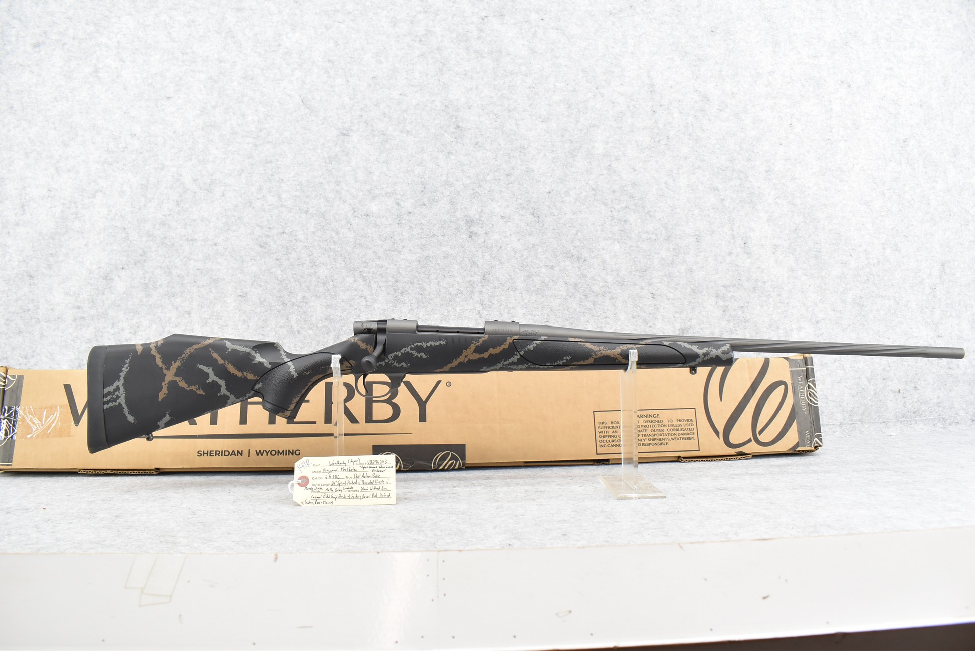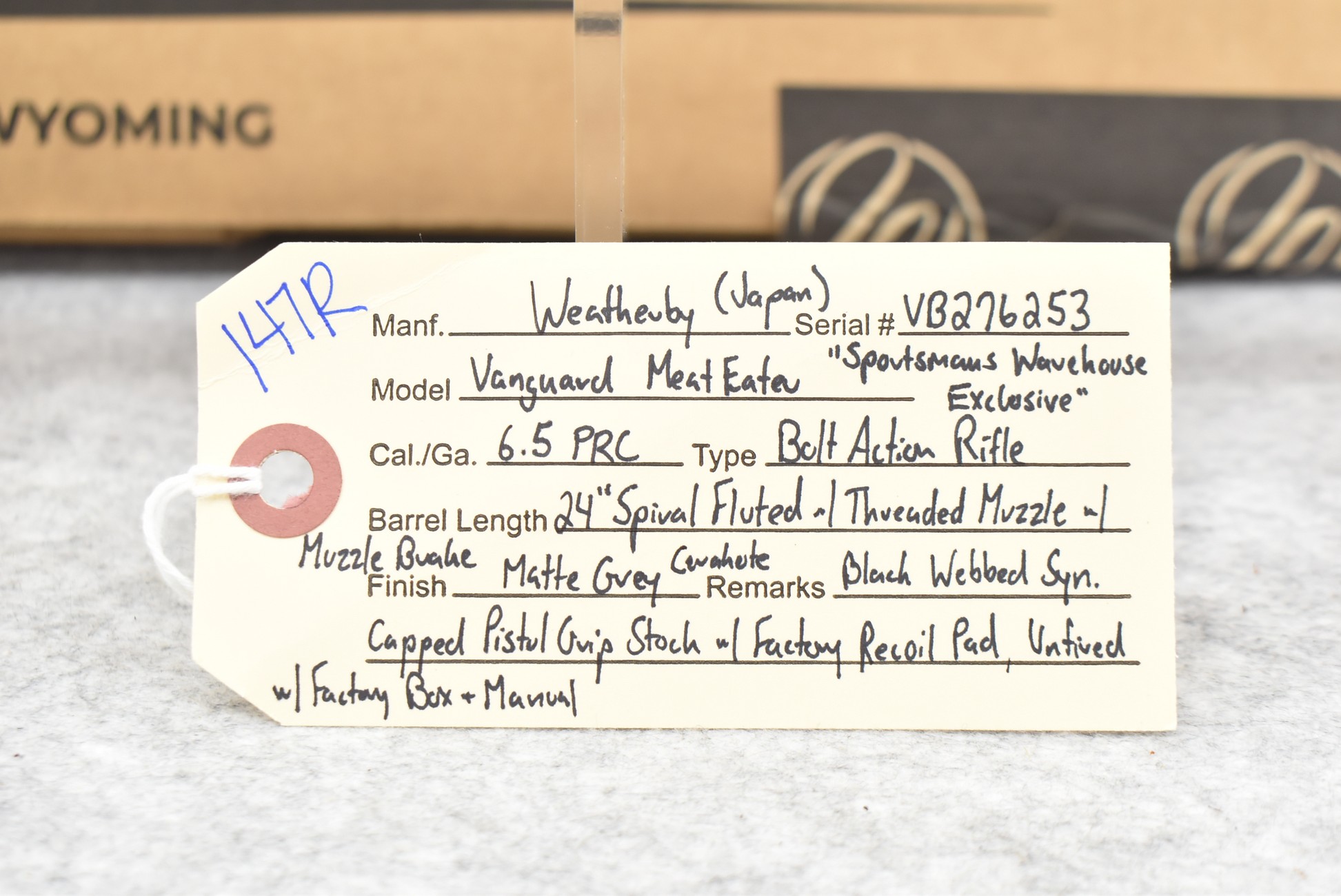 147R. Weatherby (Japan) – Mod. Vanguard Meat Eater – Sportsmans Warehouse Exclusive – 6.5 PRC Cal. Bolt Action Rifle – w/24” Spiral Fluted Barrel w/Threaded Muzzle w/Muzzle Brake – Matte Gray Cerakote Finish – w/Black Webbed Synthetic Capped Pistol Grip Stock w/Factory Recoil Pad – Unfired w/Factory Box & Manual