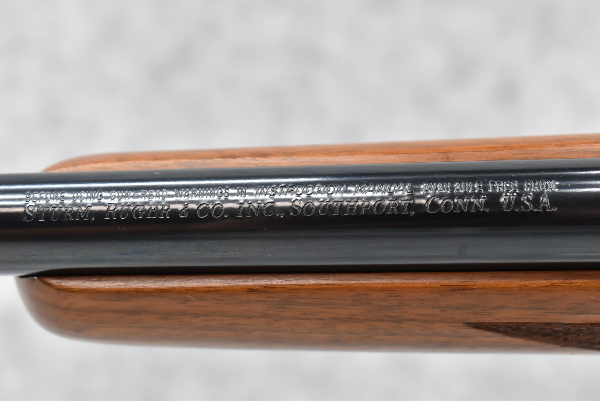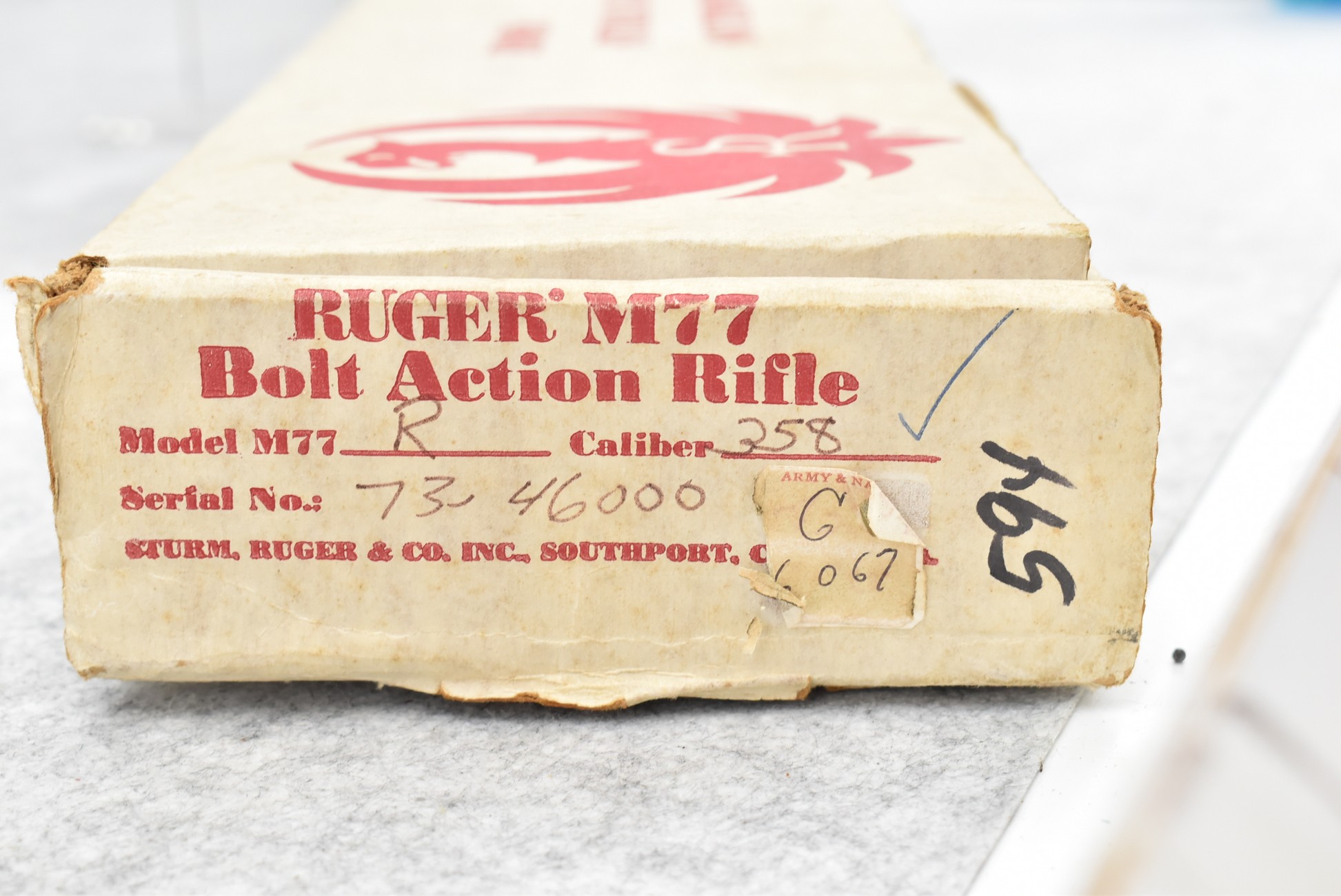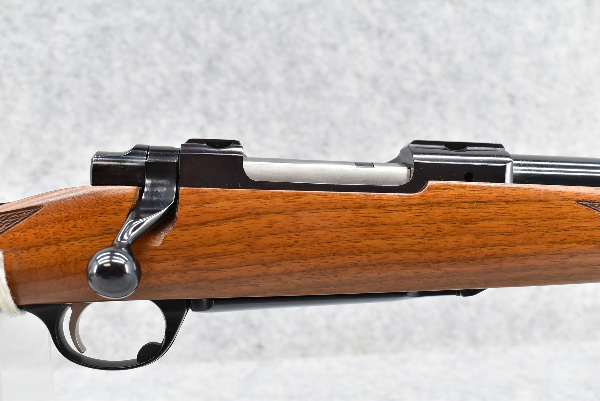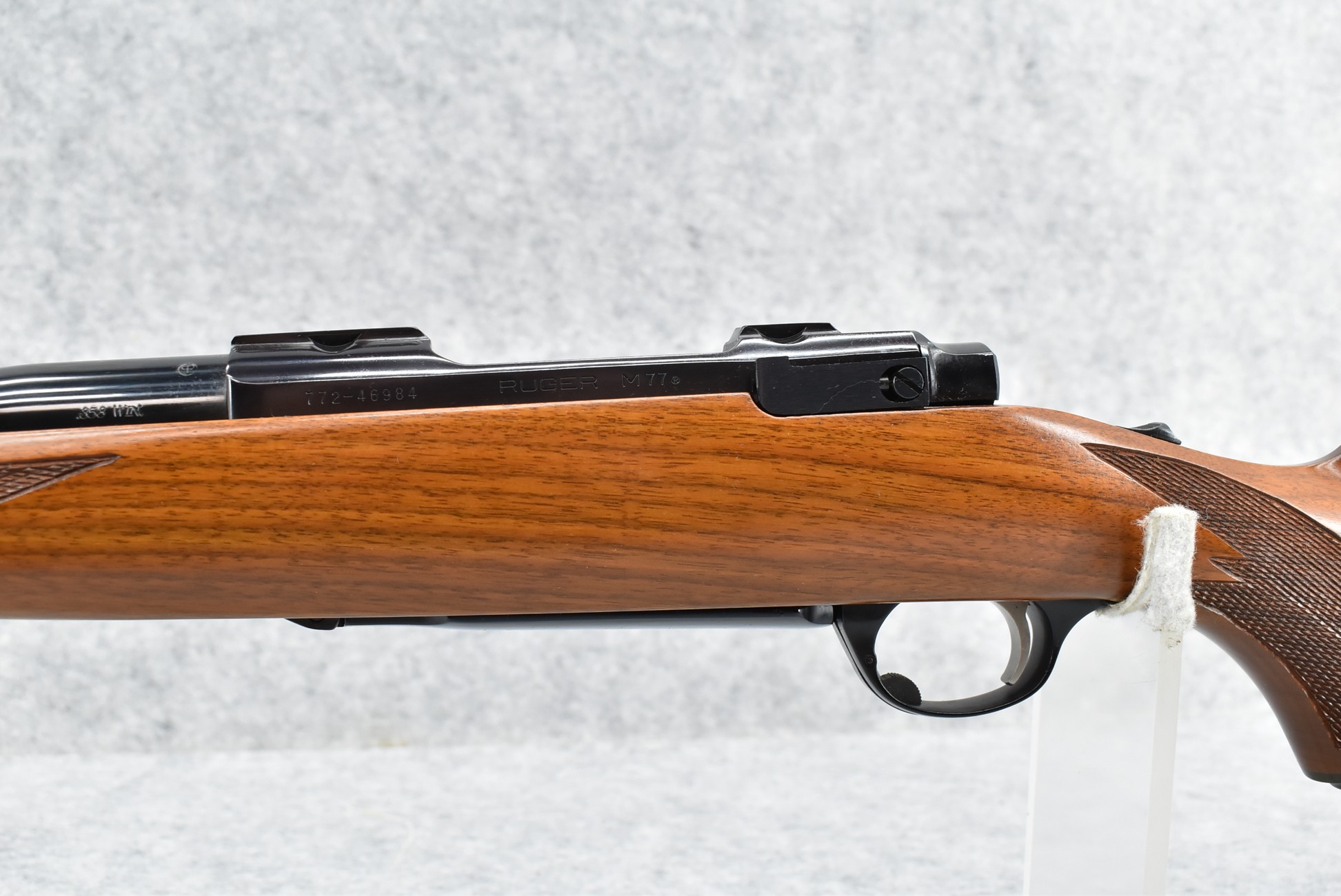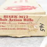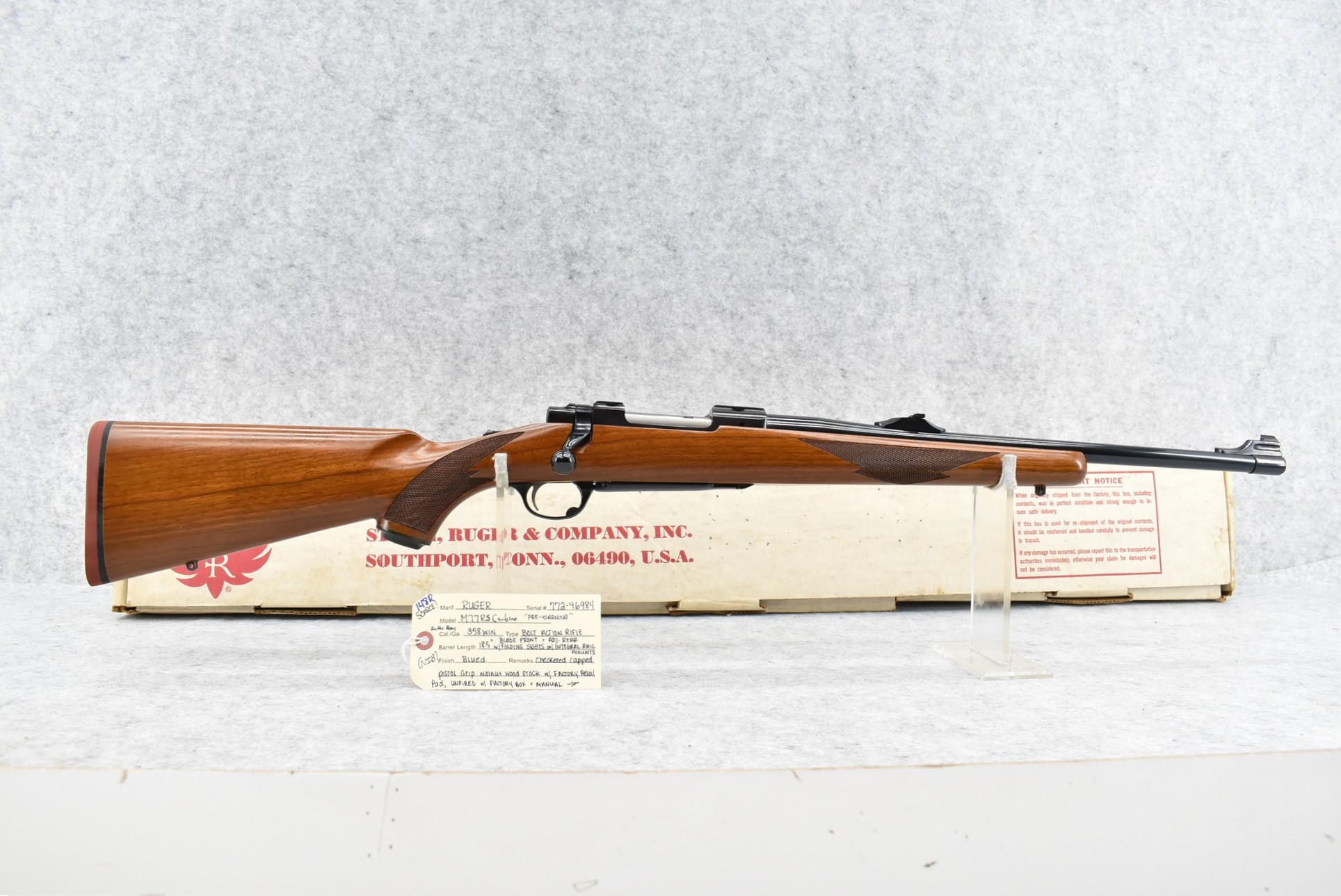 148R. Scarce! Ruger – Mod. 77RS Carbine (Pre-Warning) – In the Rare 358 Win. Cal. Bolt Action Rifle – w/18.5” Barrel w/Blade Front & Adj. Rear Folding Sights w/Integral Mounts – Blued Finish – w/Checkered Capped Pistol Grip Walnut Wood Stock w/Factory Recoil Pad – Unfired w/Factory Box & Manual – Only 758 18.5” M77R’s Mfg. For Jerrys Sports Center in 1989! Excellent! Great Find