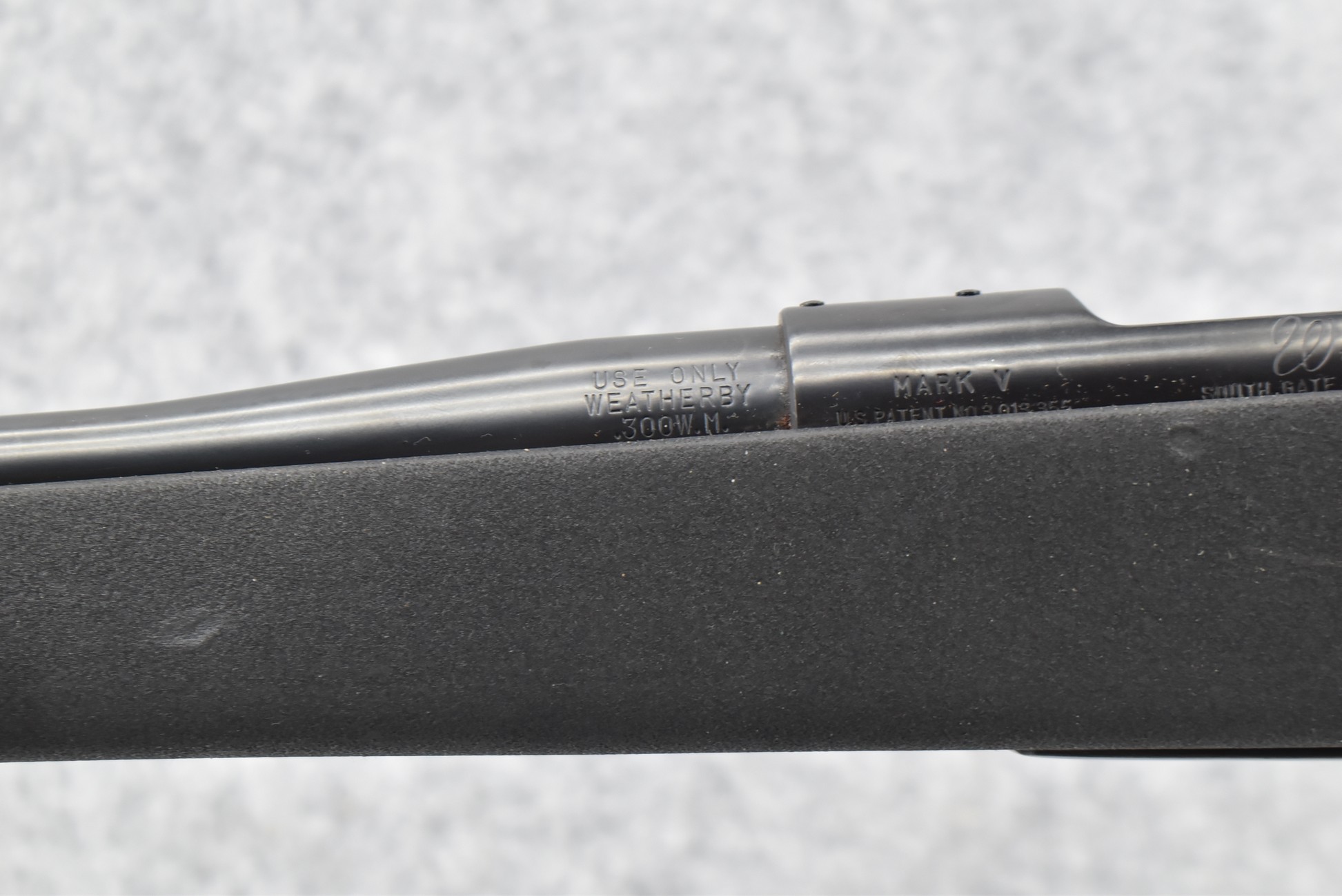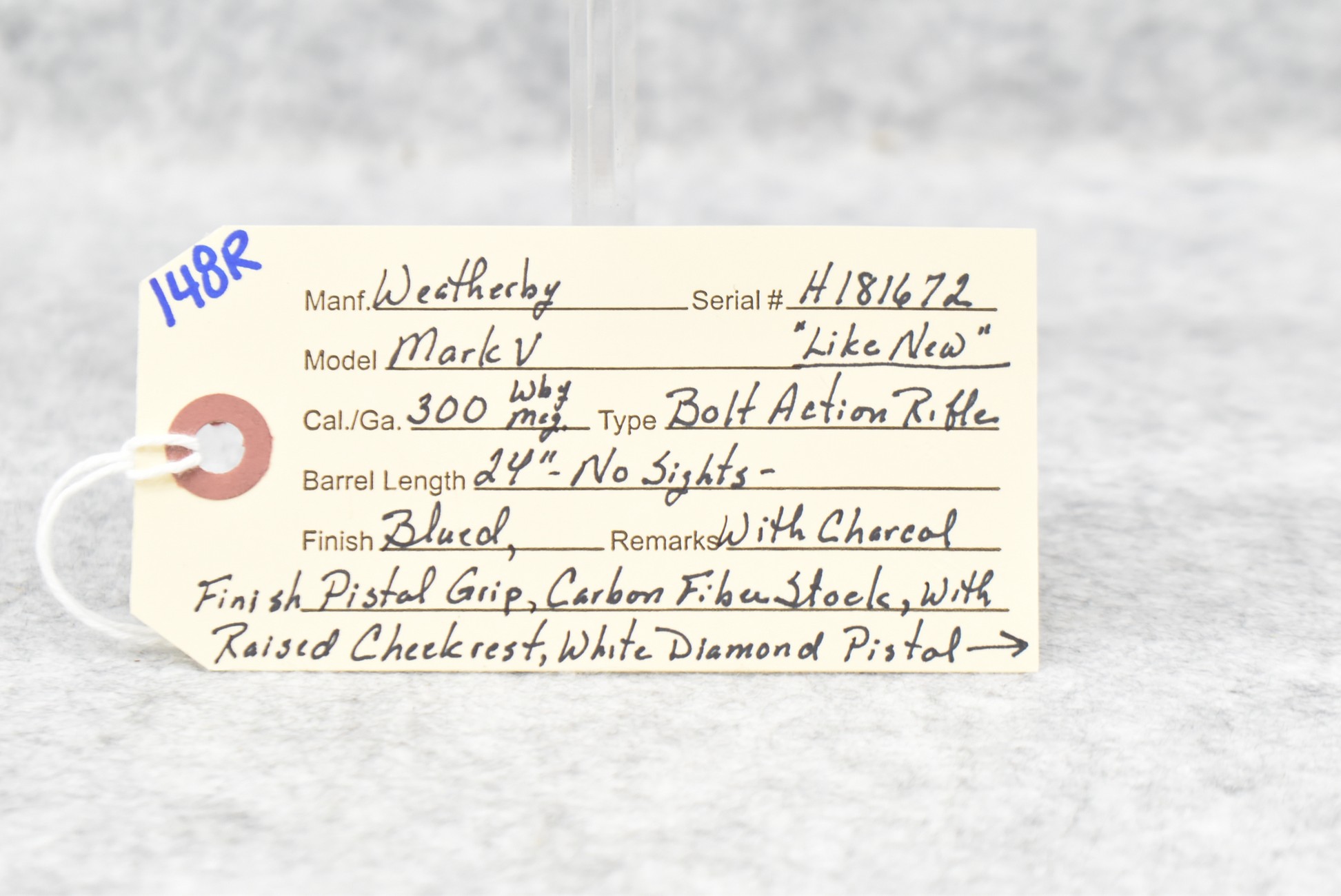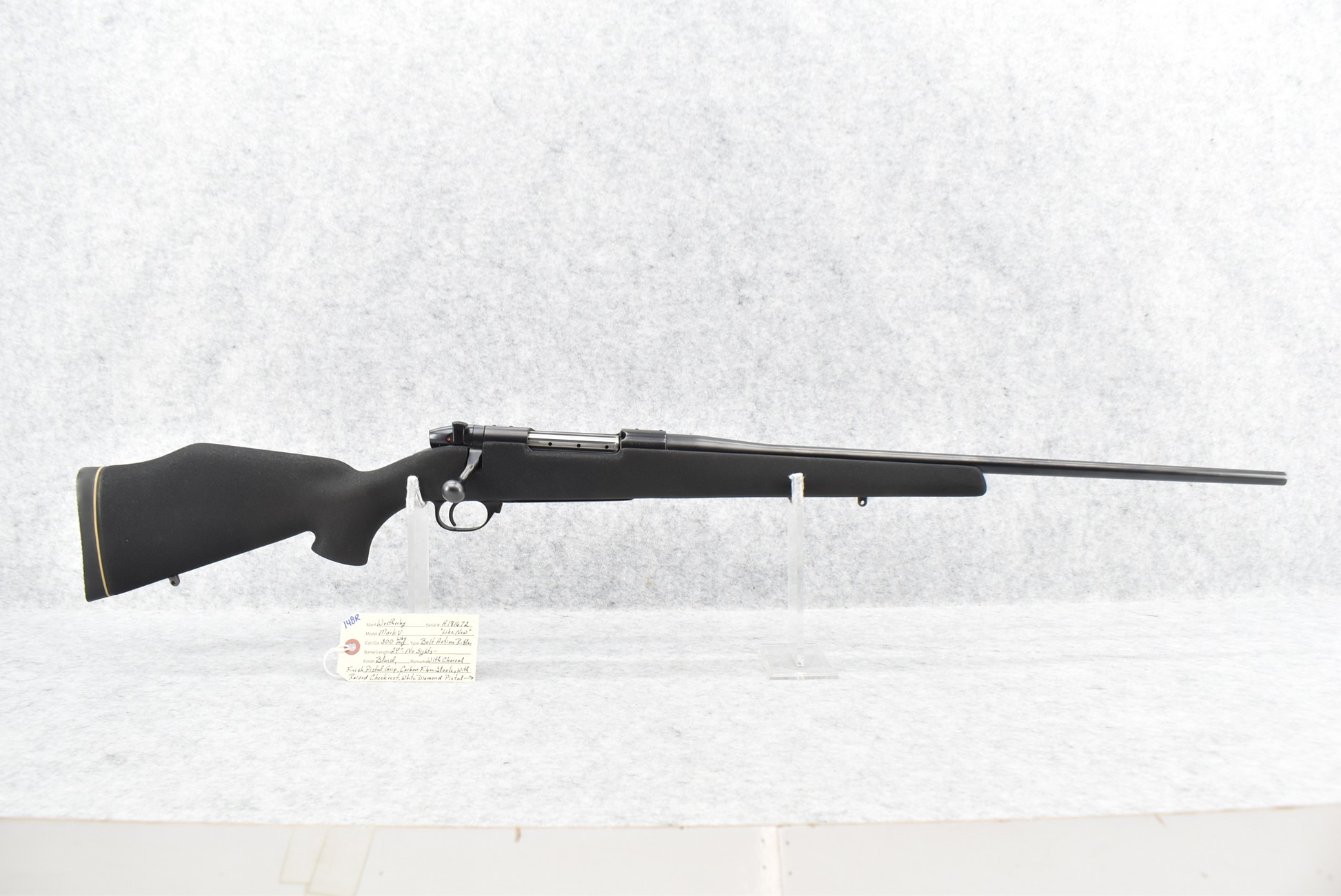 148R. Weatherby – Mod. Mark V – 300 Wby Mag. Cal. Bolt Action Rifle – w/24” Barrel w/No Sights – Blued Finish – w/Black Finish Pistol Grip Kevlar Stock w/Raised Cheek Rest, White Diamond Pistol Grip Cap, and Factory Butt Pad – Like New
