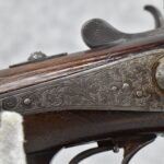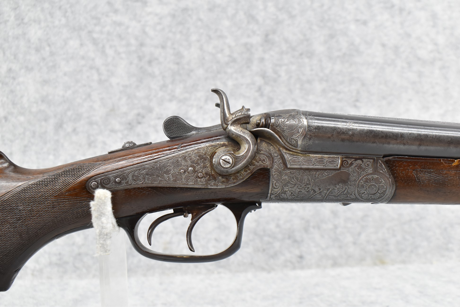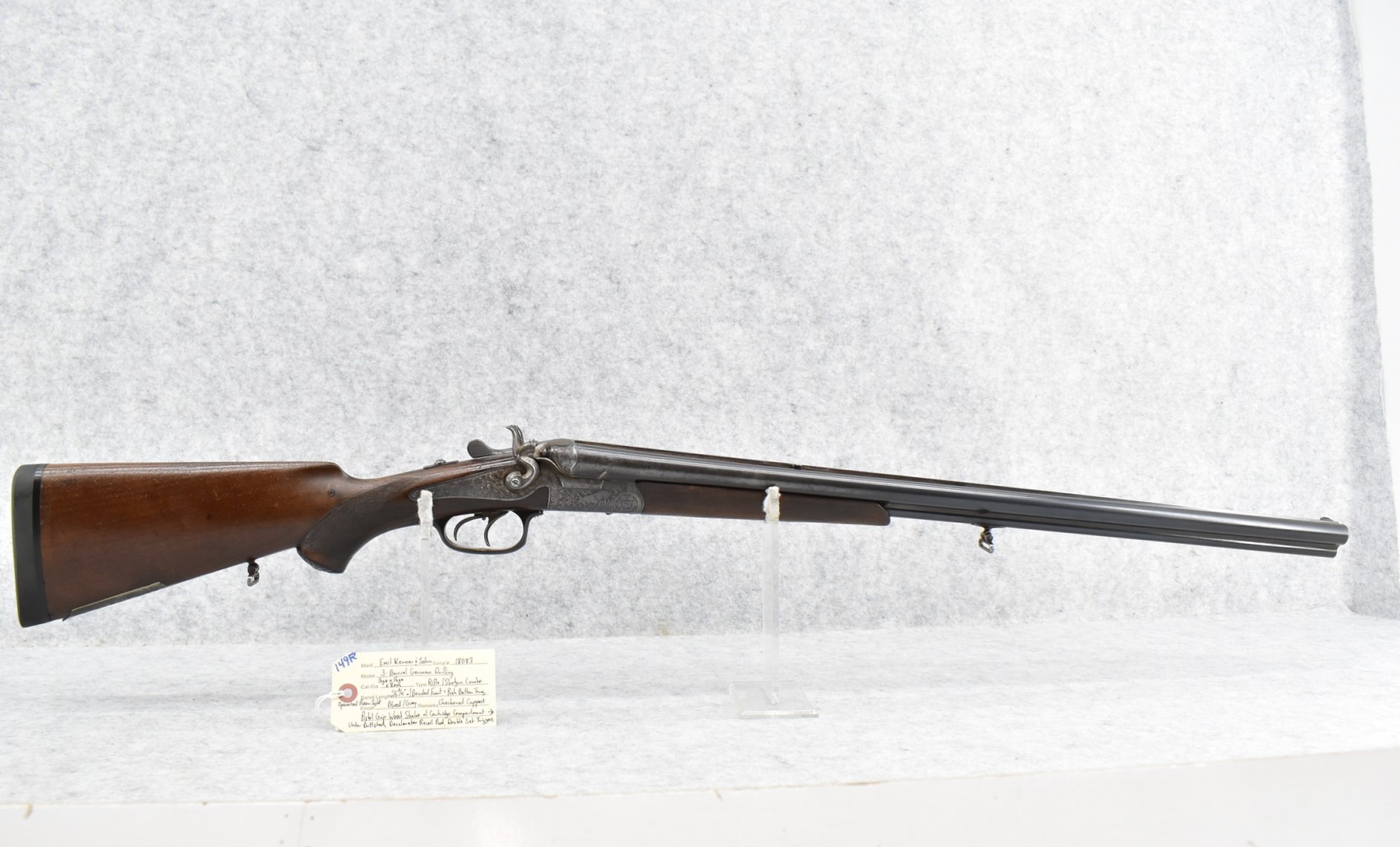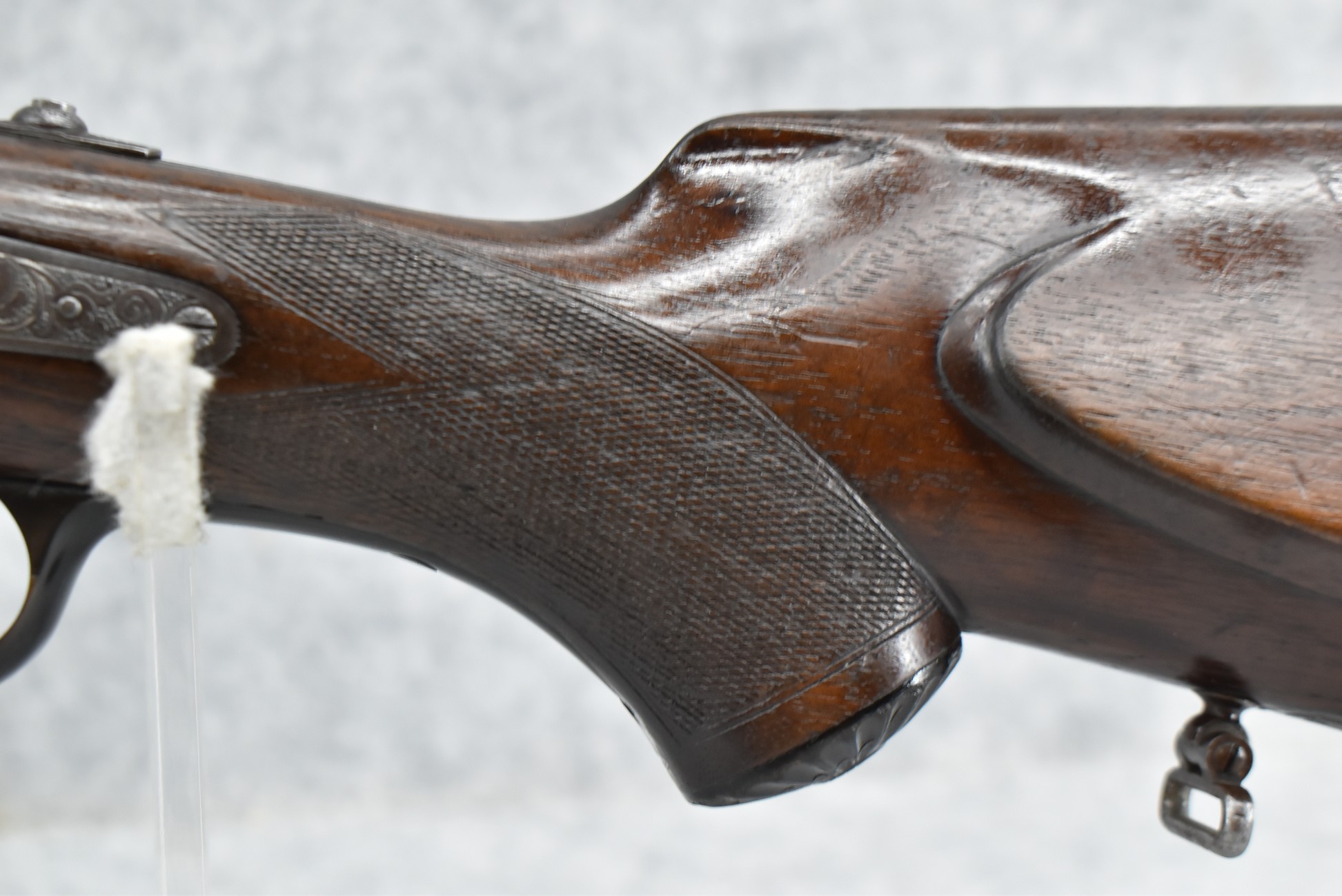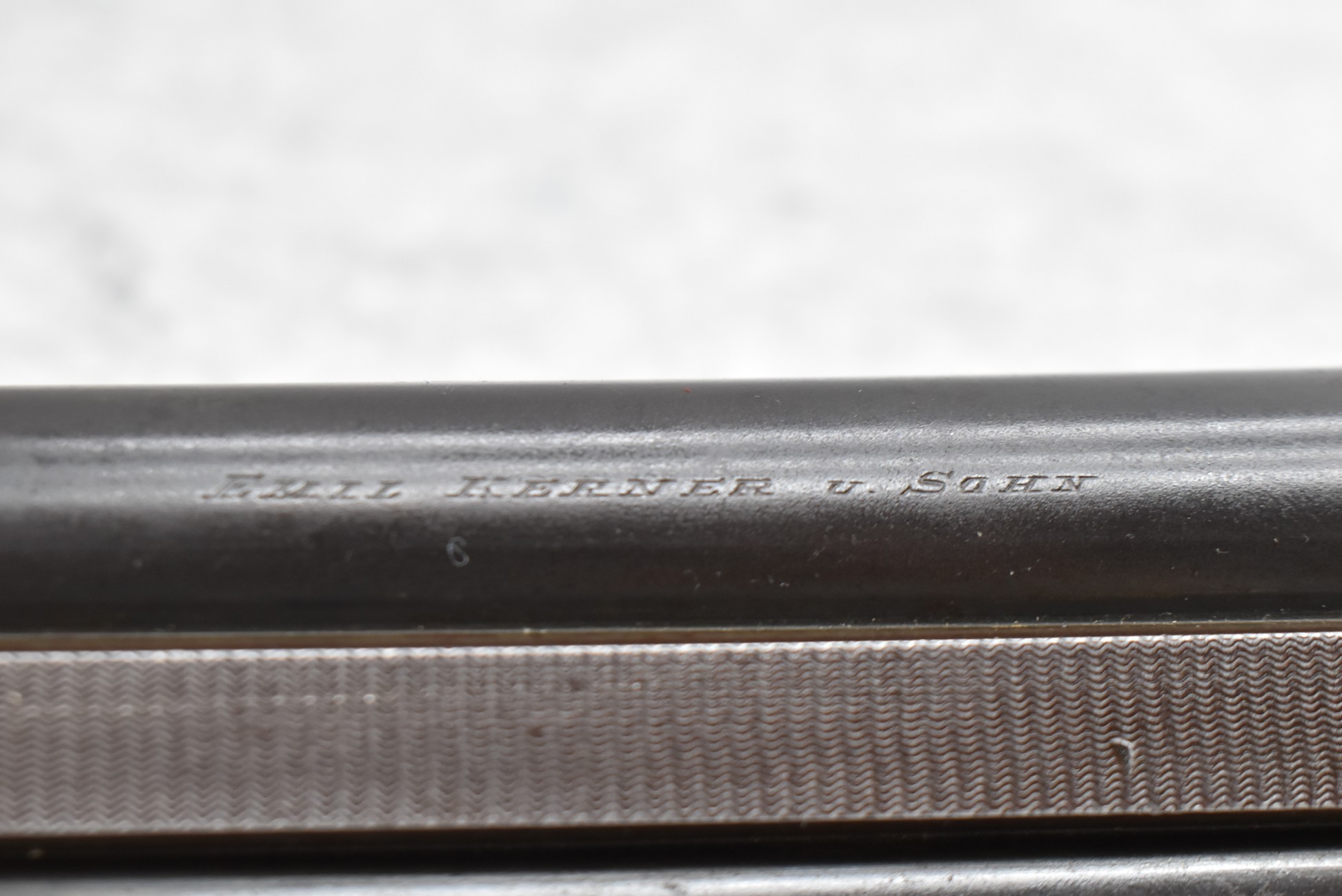 149R. Emil Kerner & Sohn – Mod. 3-Barrel German Drilling – 16ga. X 16ga. X 8mm Cal. Rifle/Shotgun Combo – w/26 ¾” Barrels w/Beaded Front & Push Button Tang Operated Rear Sight – Blued/Gray Finish – Receiver is Floral & Stag Scene Engraved – w/Checkered Capped Pistol Grip Wood Stocks w/Cheek Piece w/Cartridge Compartment Under Butt Stock w/Engraved Lid & Decelerator Recoil Pad – w/Double Set Triggers – w/Horn Trigger Guard