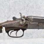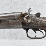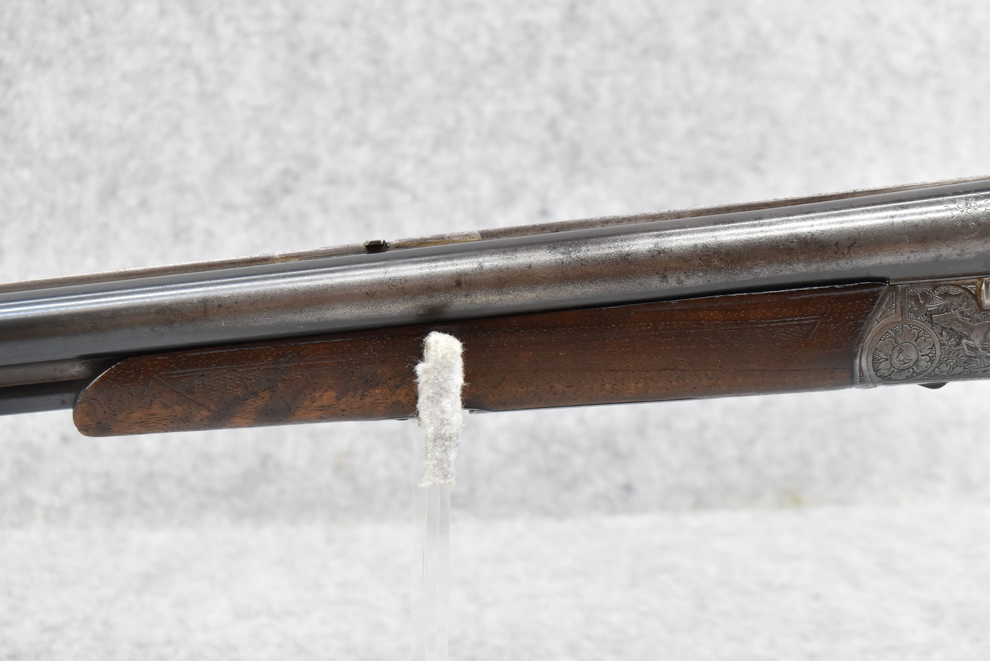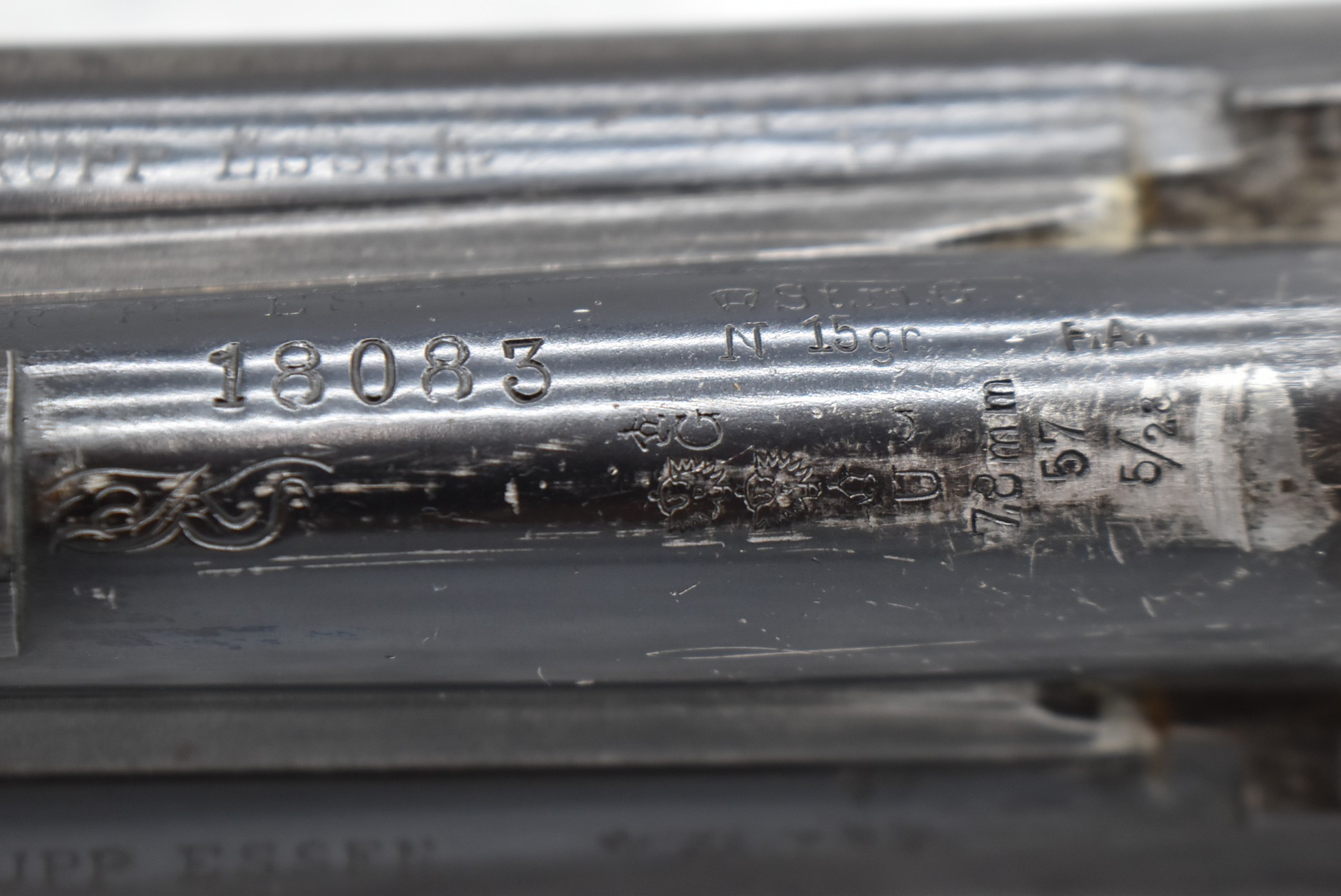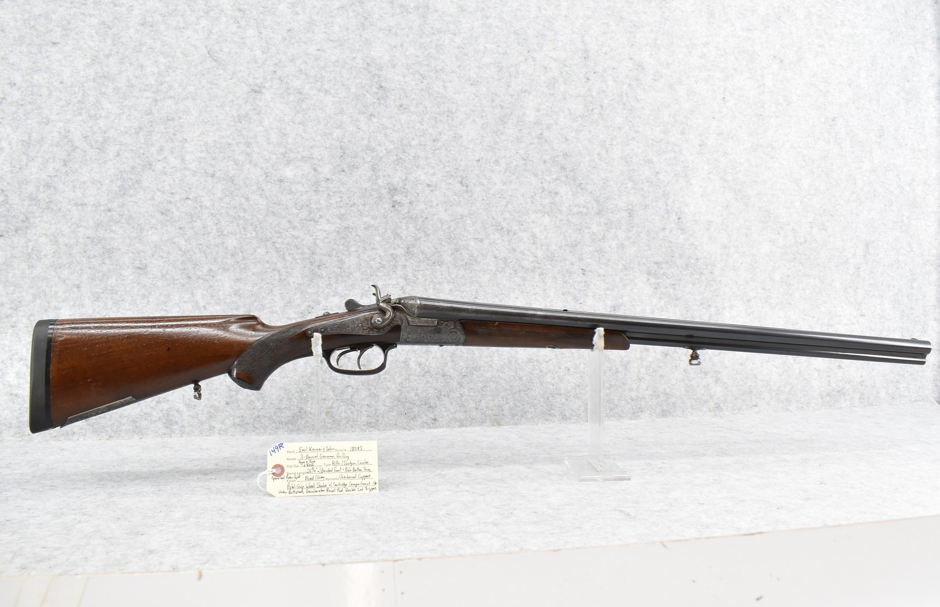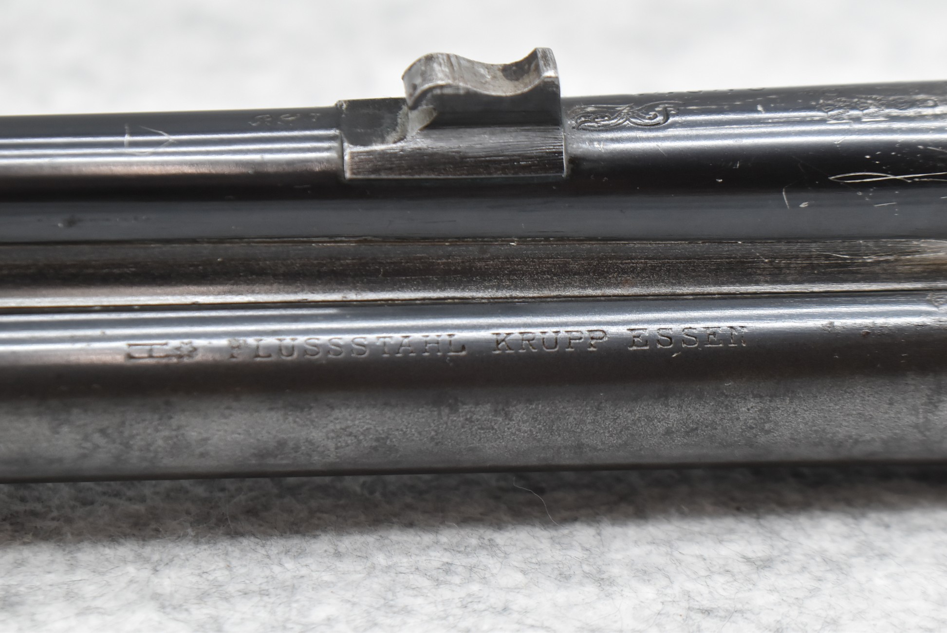 149R. Emil Kerner & Sohn – Mod. 3-Barrel German Drilling – 16ga. X 16ga. X 8mm Cal. Rifle/Shotgun Combo – w/26 ¾” Barrels w/Beaded Front & Push Button Tang Operated Rear Sight – Blued/Gray Finish – Receiver is Floral & Stag Scene Engraved – w/Checkered Capped Pistol Grip Wood Stocks w/Cheek Piece w/Cartridge Compartment Under Butt Stock w/Engraved Lid & Decelerator Recoil Pad – w/Double Set Triggers – w/Horn Trigger Guard
