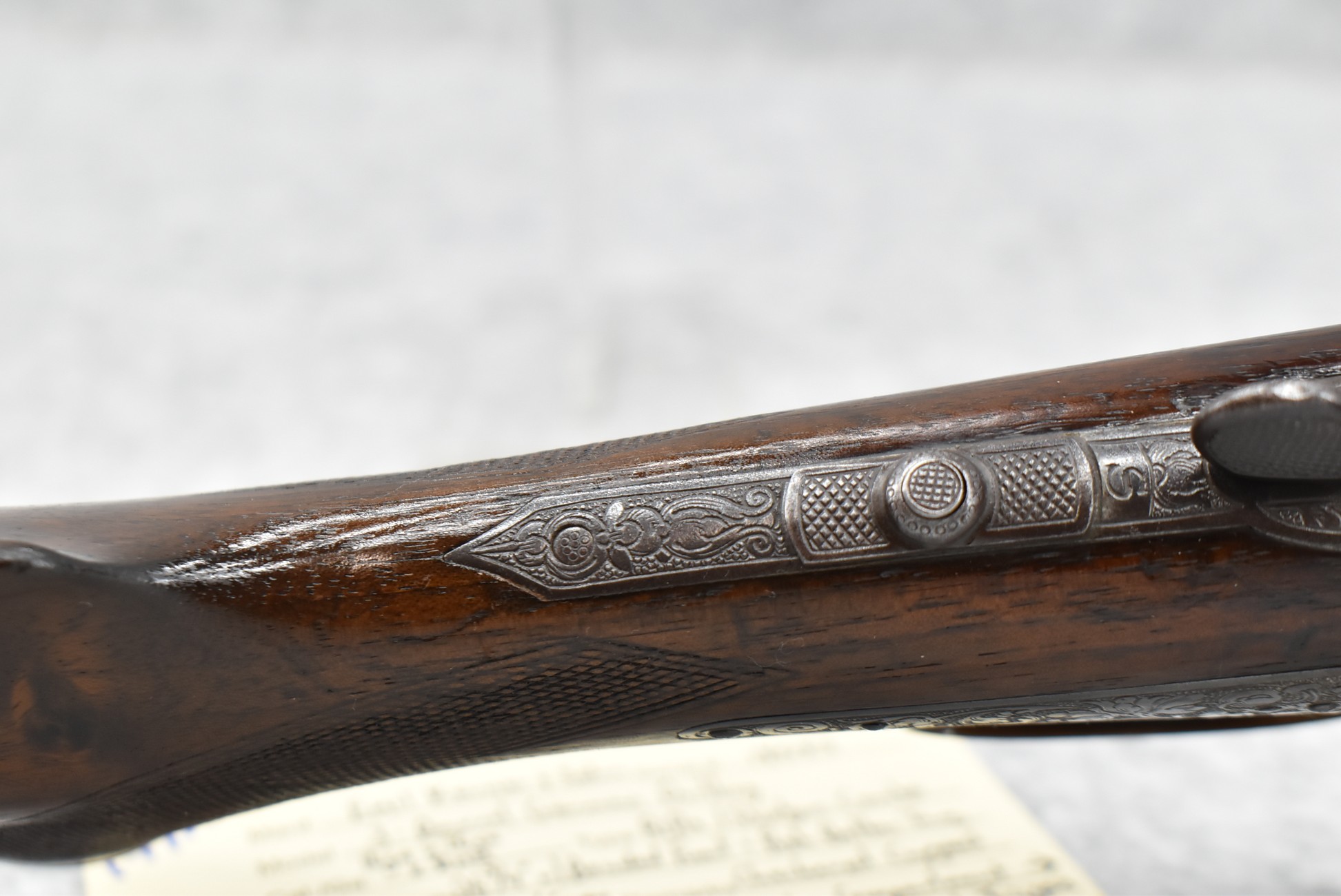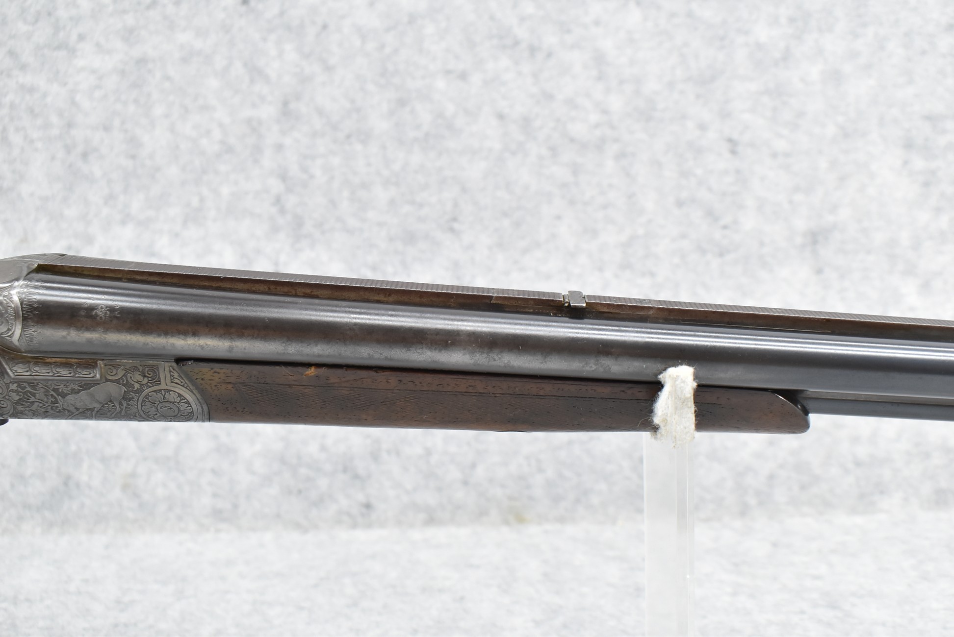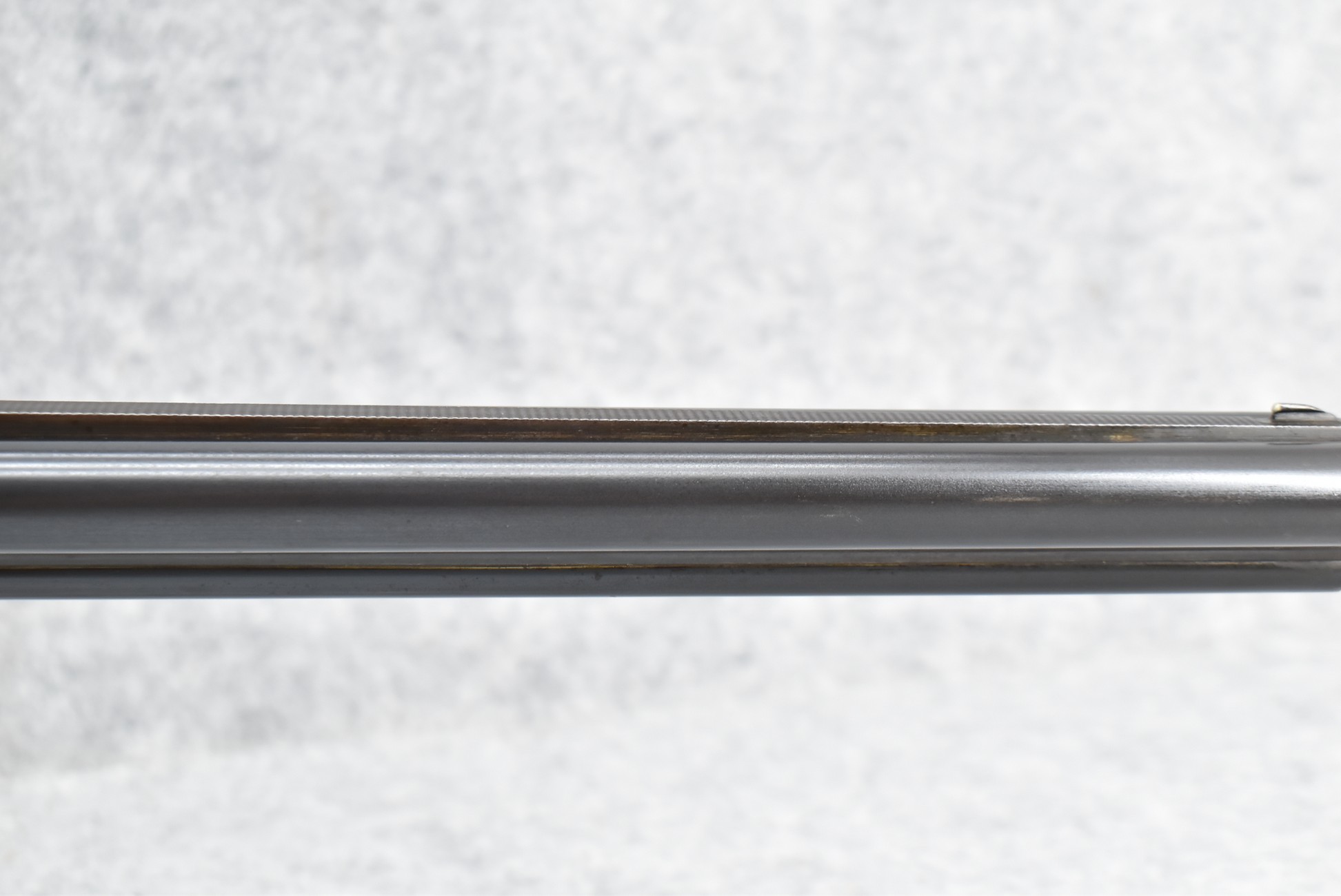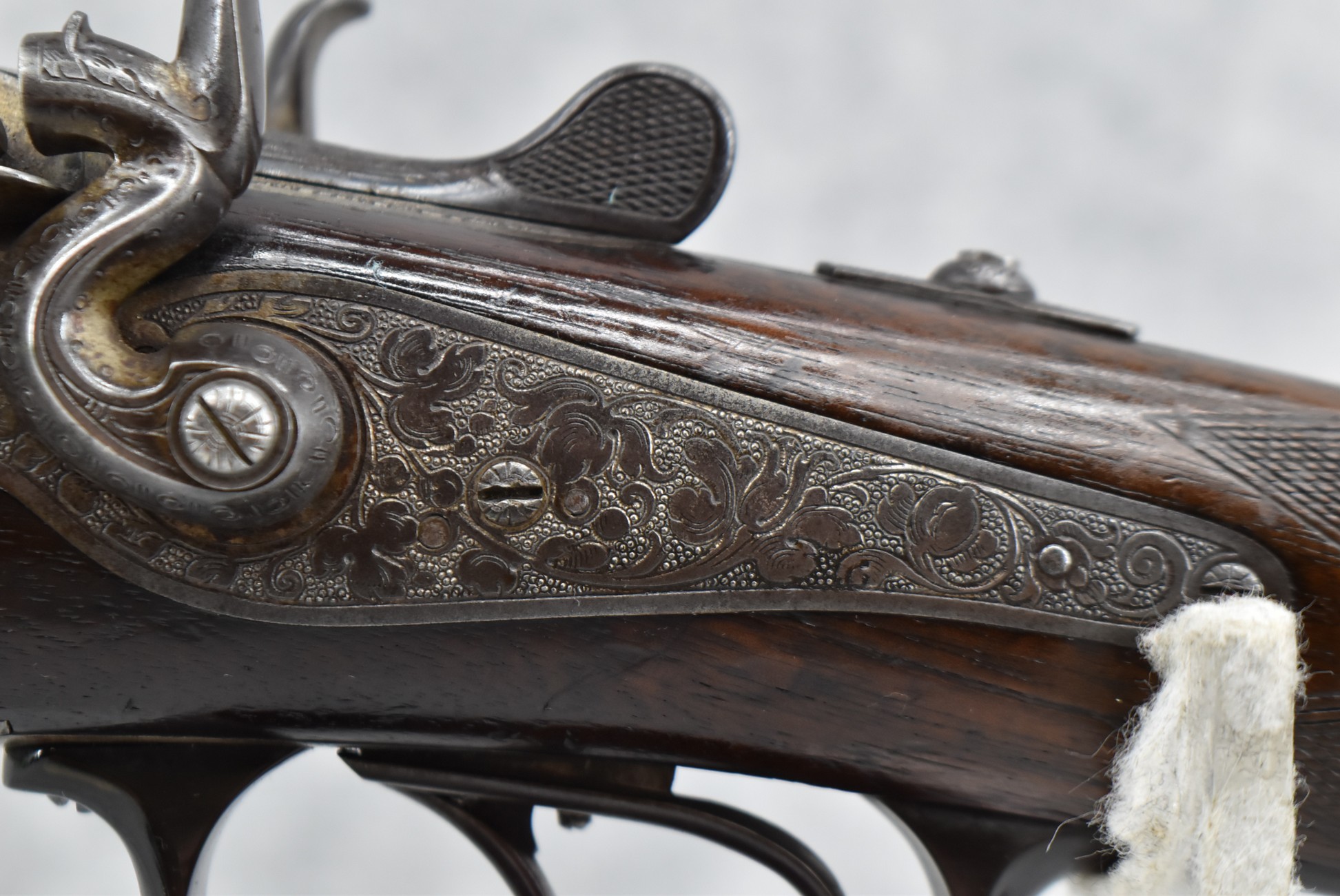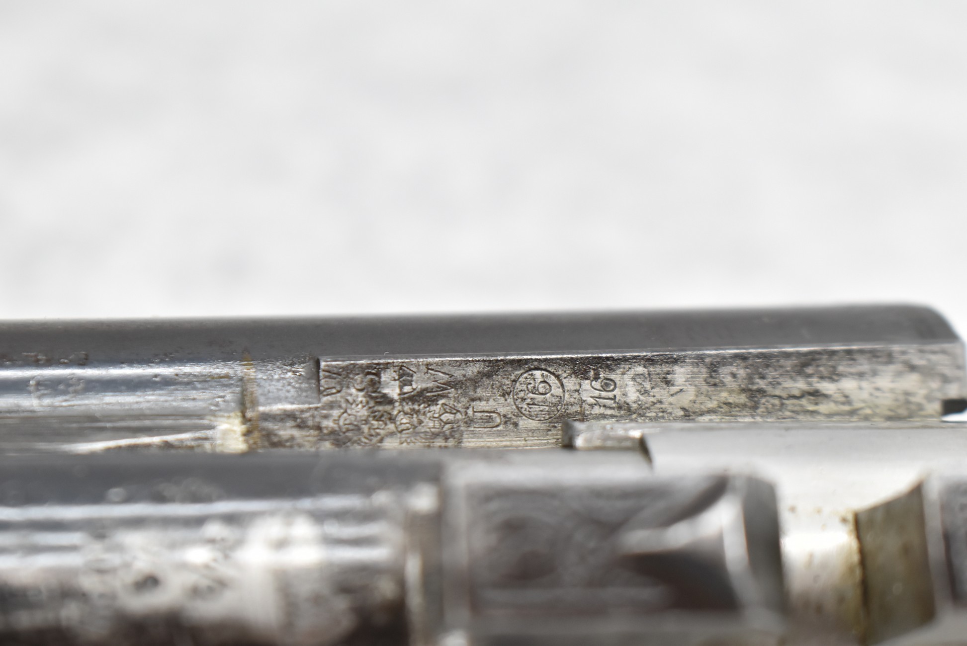149R. Emil Kerner & Sohn – Mod. 3-Barrel German Drilling – 16ga. X 16ga. X 8mm Cal. Rifle/Shotgun Combo – w/26 ¾” Barrels w/Beaded Front & Push Button Tang Operated Rear Sight – Blued/Gray Finish – Receiver is Floral & Stag Scene Engraved – w/Checkered Capped Pistol Grip Wood Stocks w/Cheek Piece w/Cartridge Compartment Under Butt Stock w/Engraved Lid & Decelerator Recoil Pad – w/Double Set Triggers – w/Horn Trigger Guard