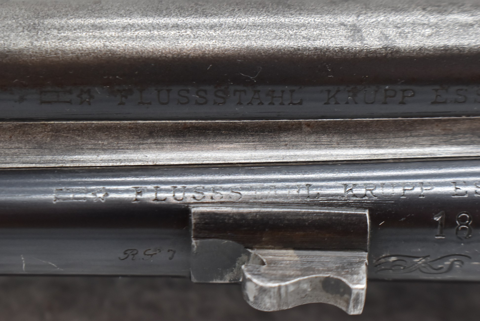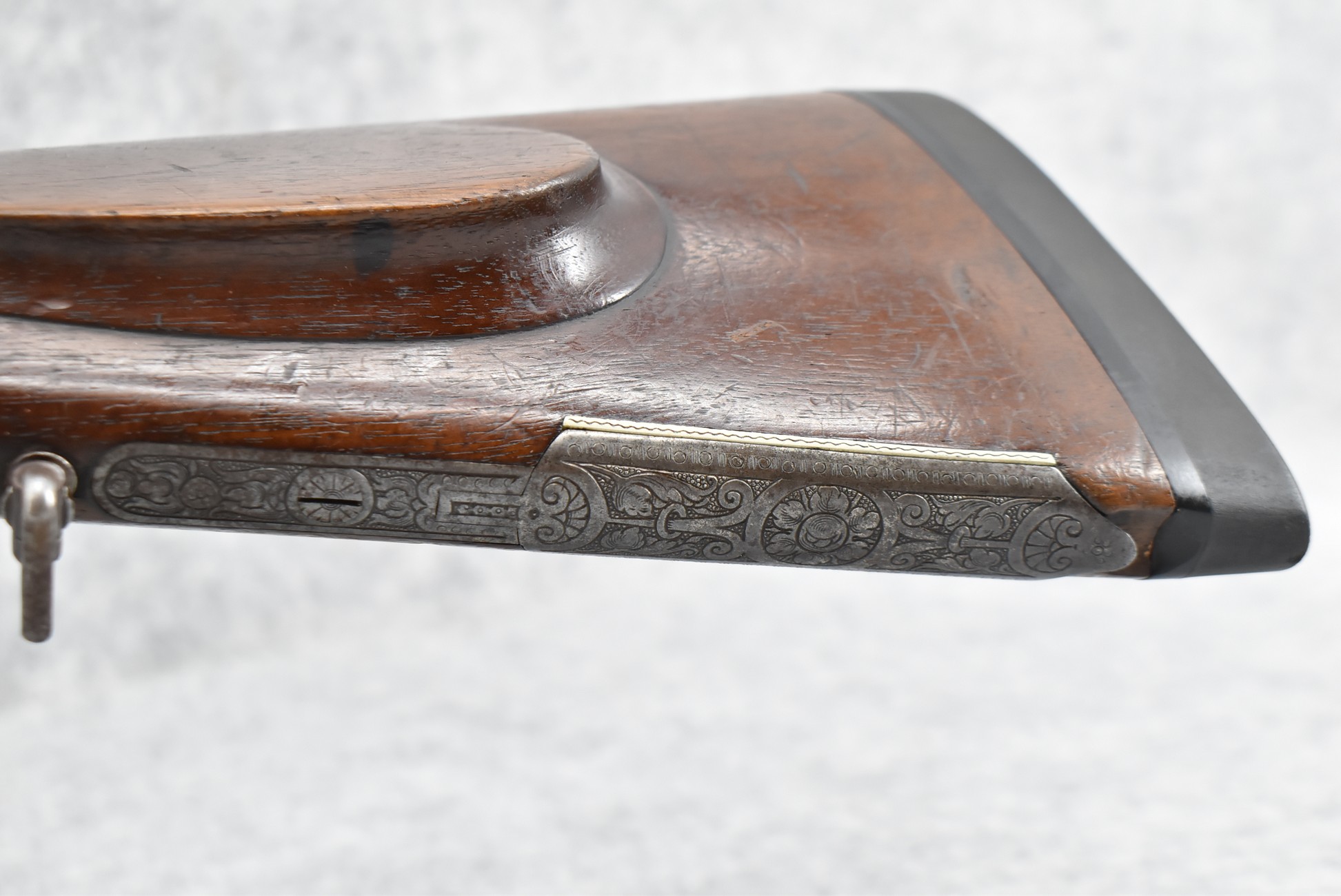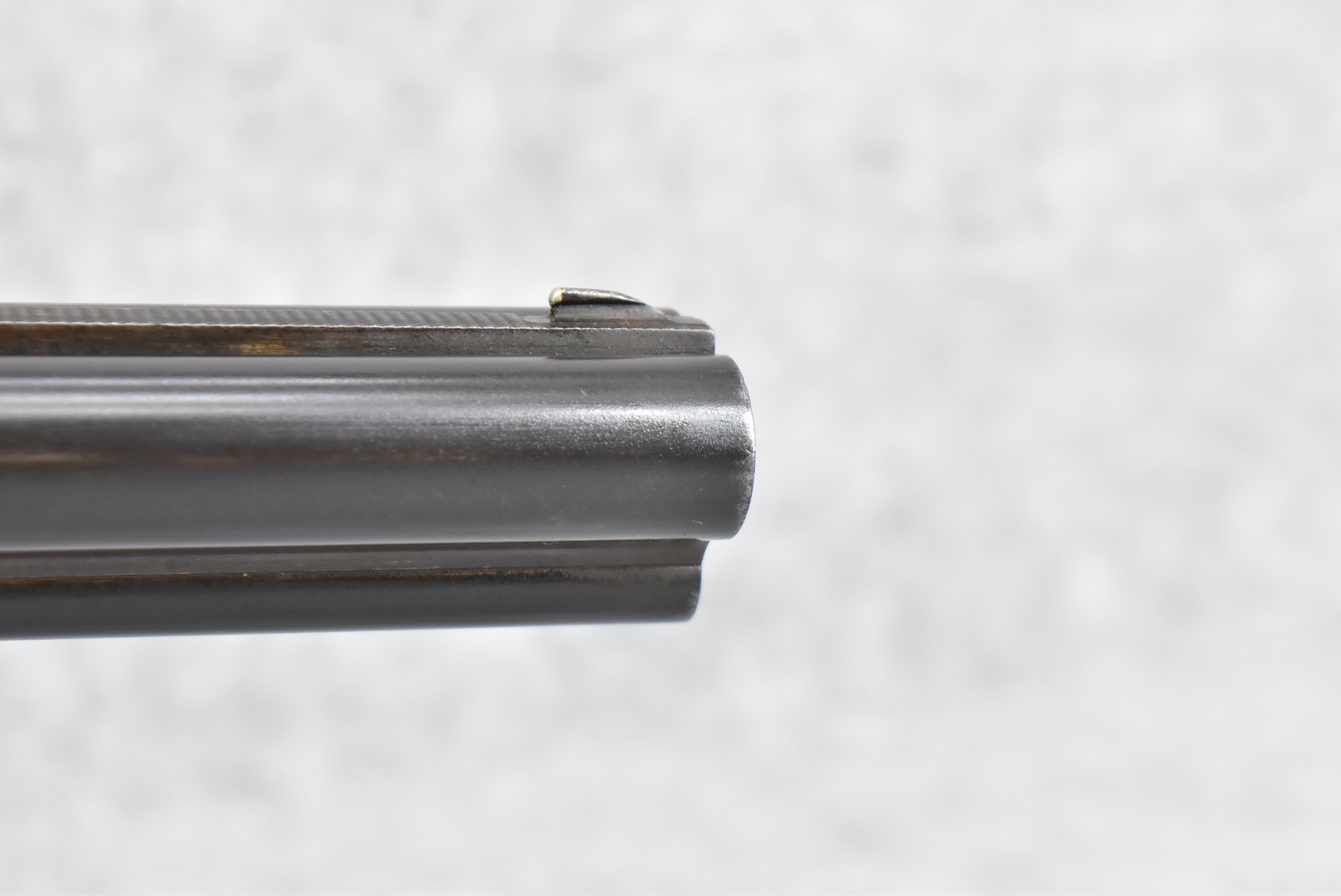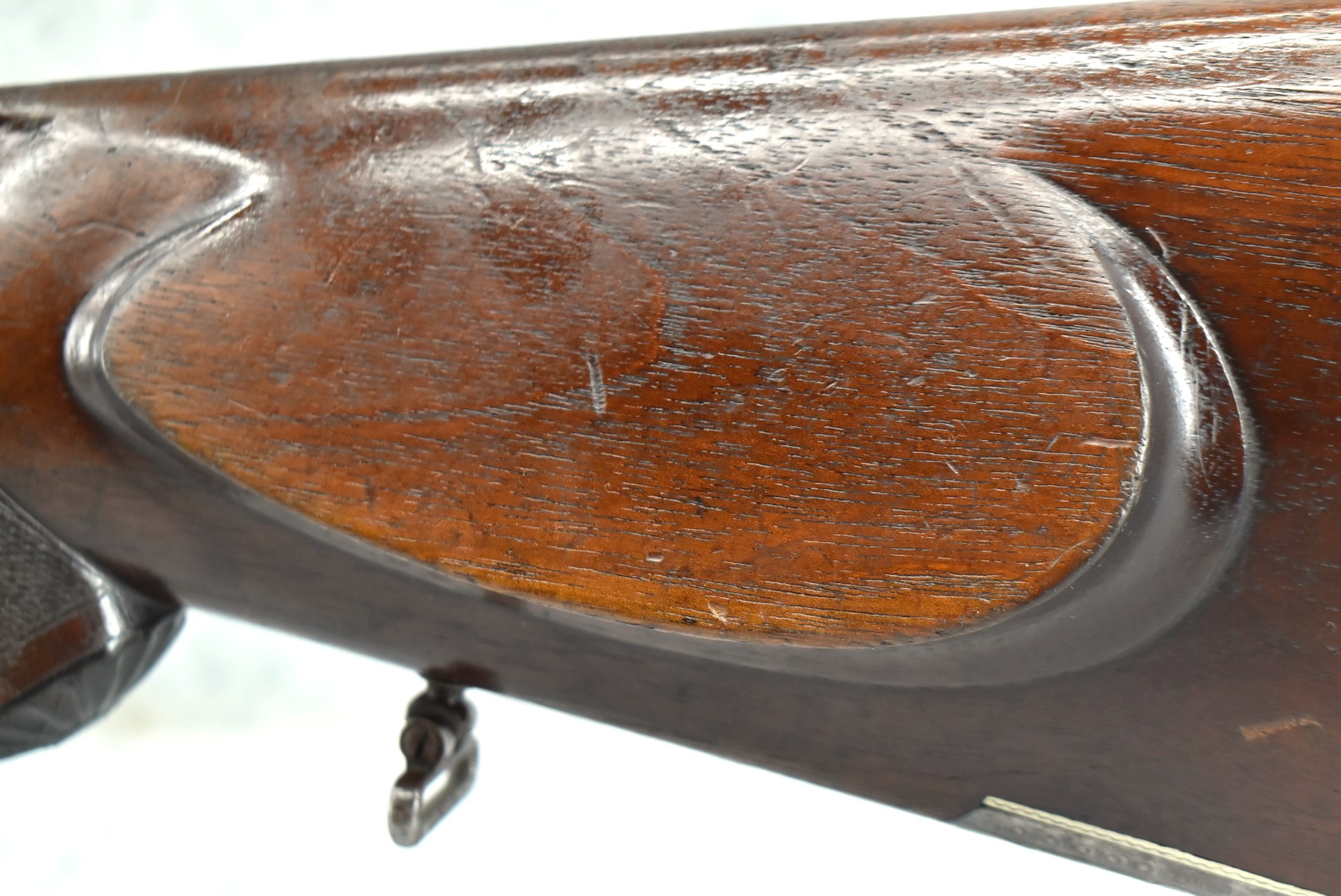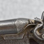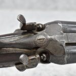 149R. Emil Kerner & Sohn – Mod. 3-Barrel German Drilling – 16ga. X 16ga. X 8mm Cal. Rifle/Shotgun Combo – w/26 ¾” Barrels w/Beaded Front & Push Button Tang Operated Rear Sight – Blued/Gray Finish – Receiver is Floral & Stag Scene Engraved – w/Checkered Capped Pistol Grip Wood Stocks w/Cheek Piece w/Cartridge Compartment Under Butt Stock w/Engraved Lid & Decelerator Recoil Pad – w/Double Set Triggers – w/Horn Trigger Guard