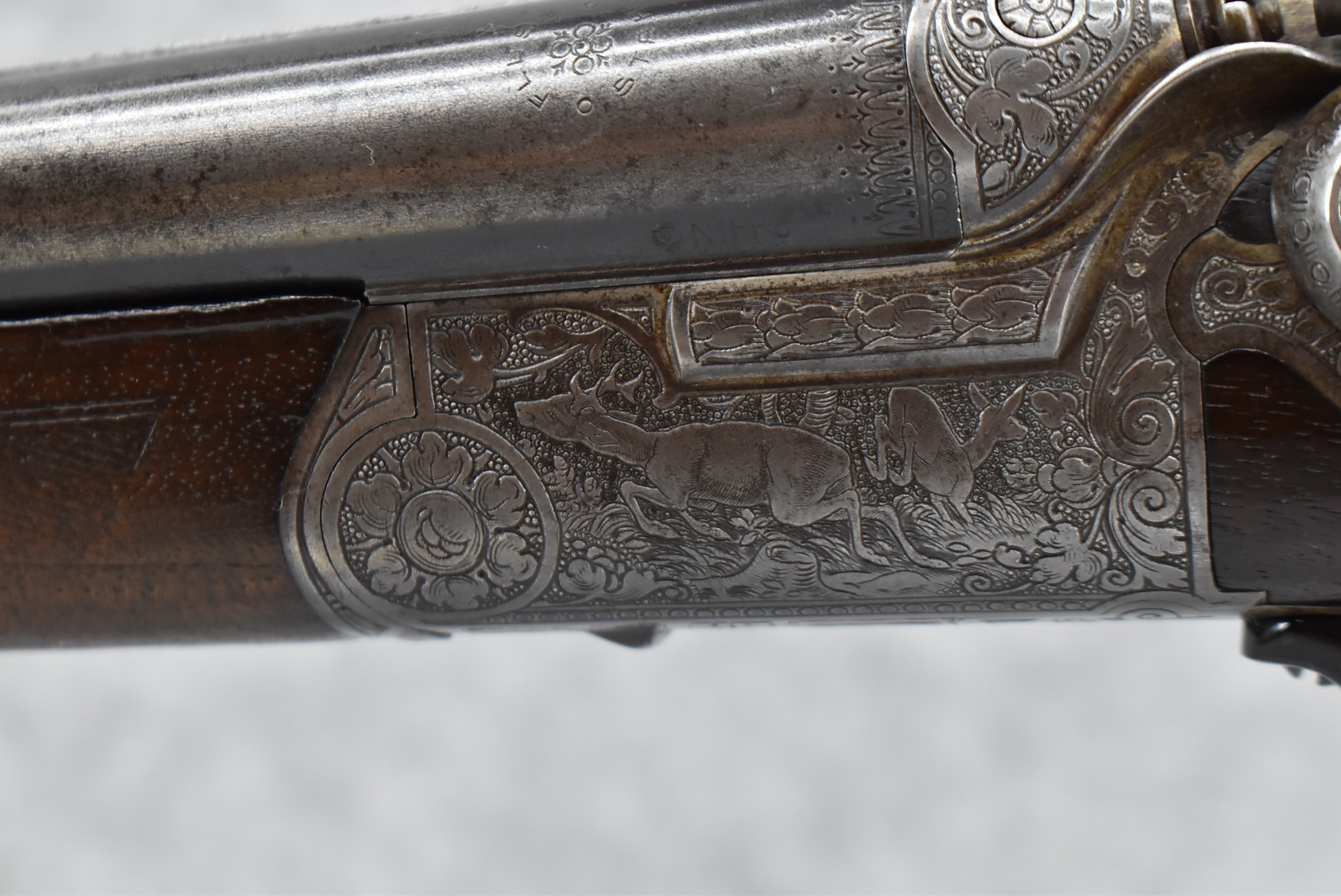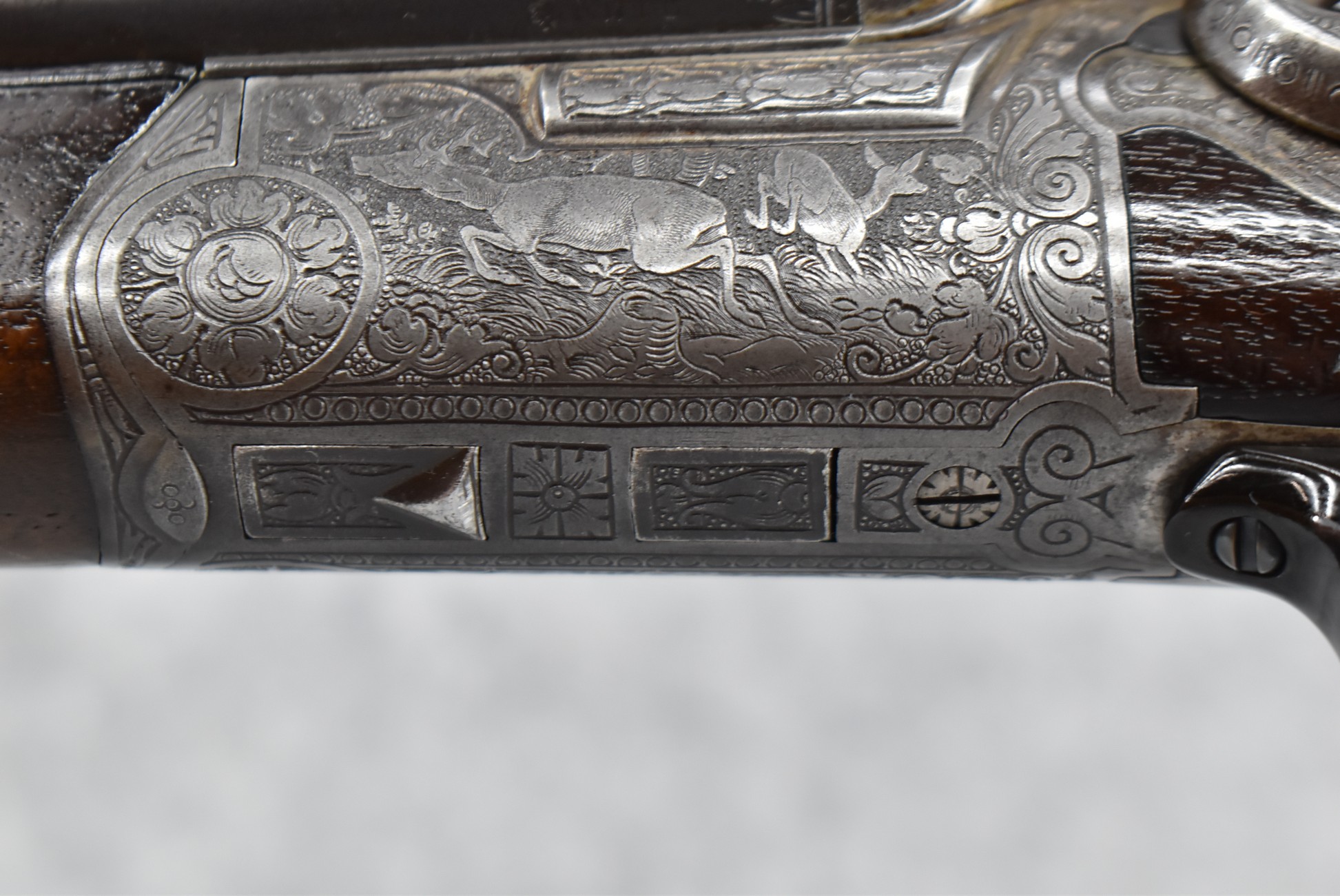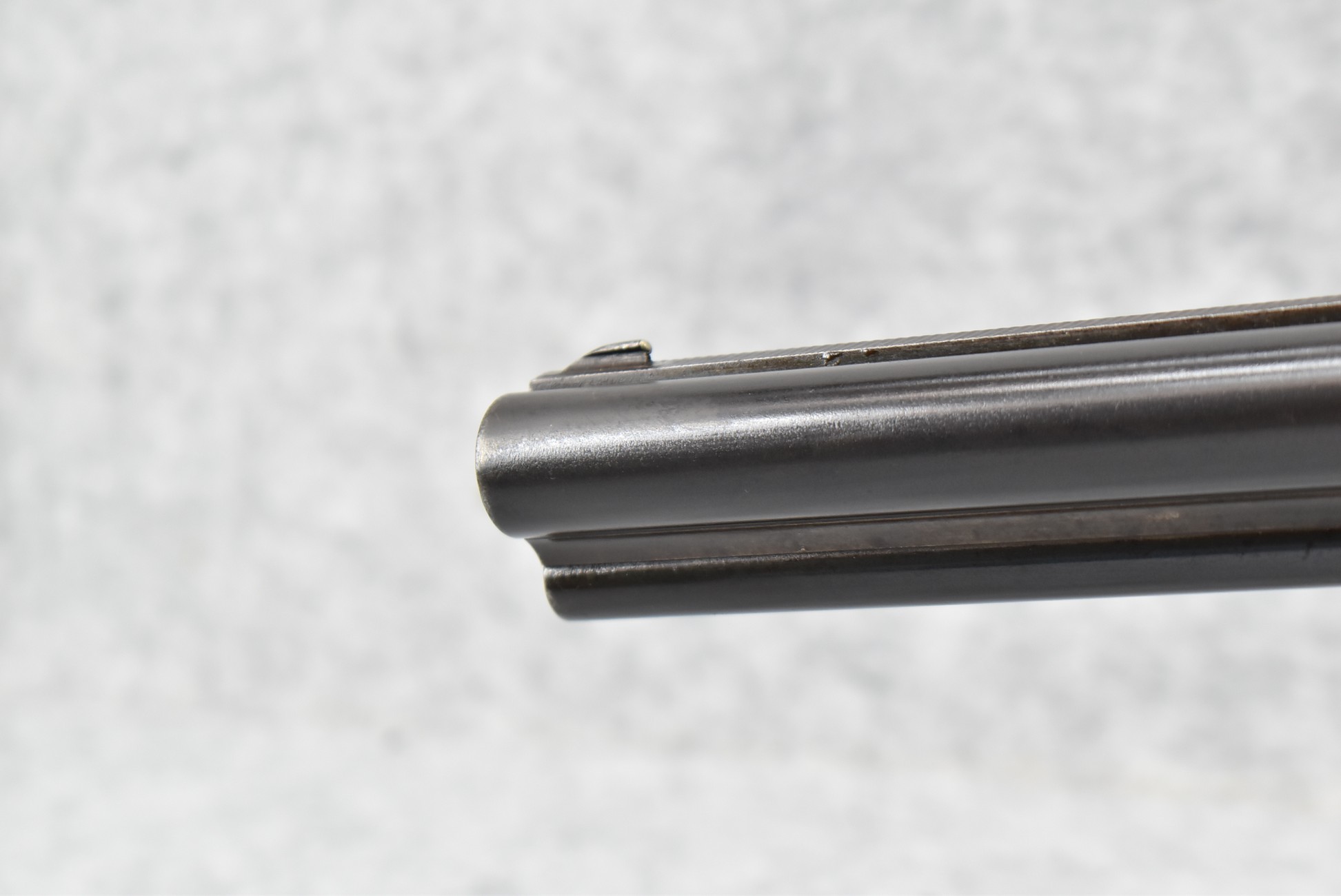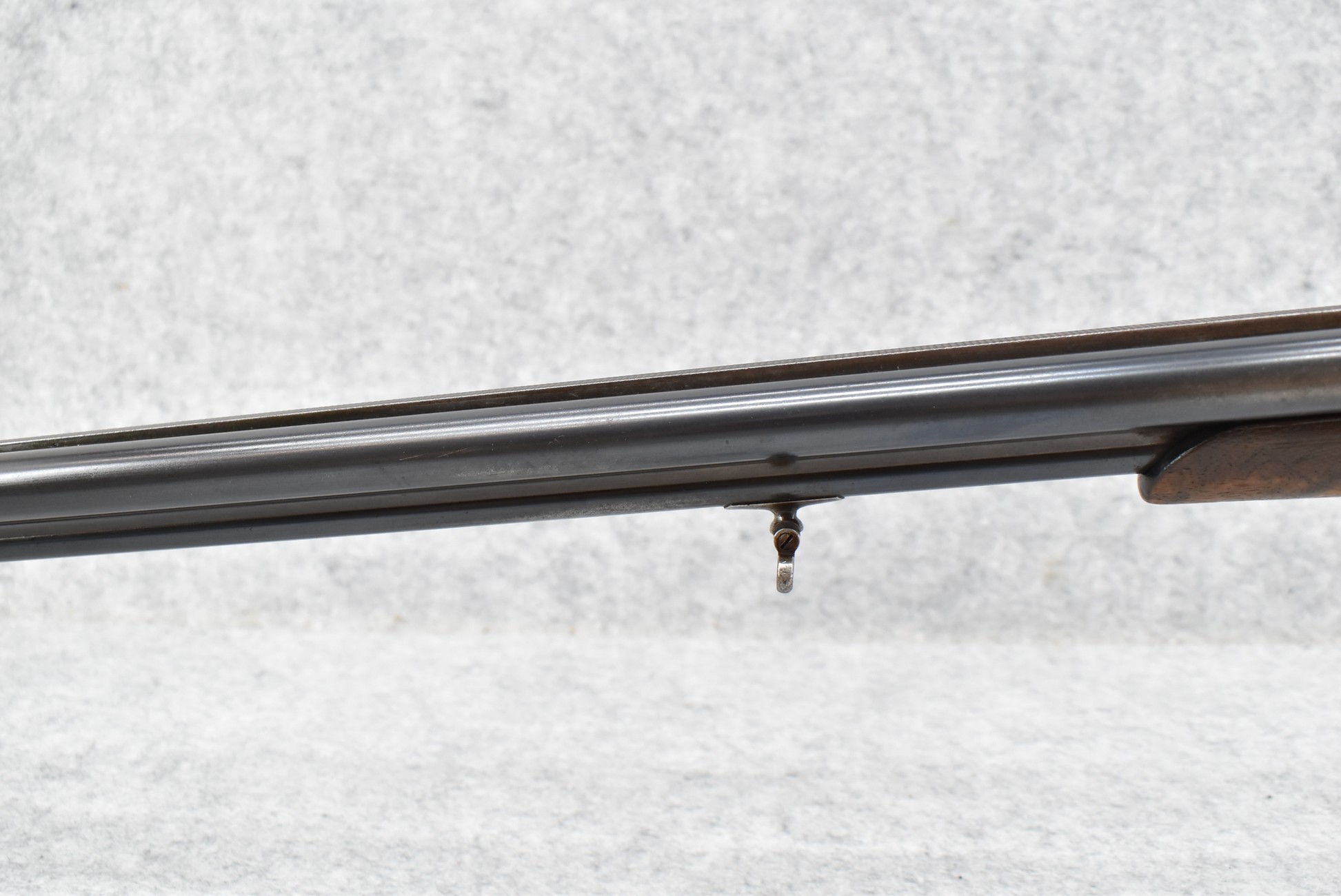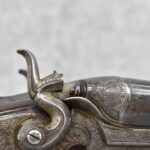 149R. Emil Kerner & Sohn – Mod. 3-Barrel German Drilling – 16ga. X 16ga. X 8mm Cal. Rifle/Shotgun Combo – w/26 ¾” Barrels w/Beaded Front & Push Button Tang Operated Rear Sight – Blued/Gray Finish – Receiver is Floral & Stag Scene Engraved – w/Checkered Capped Pistol Grip Wood Stocks w/Cheek Piece w/Cartridge Compartment Under Butt Stock w/Engraved Lid & Decelerator Recoil Pad – w/Double Set Triggers – w/Horn Trigger Guard