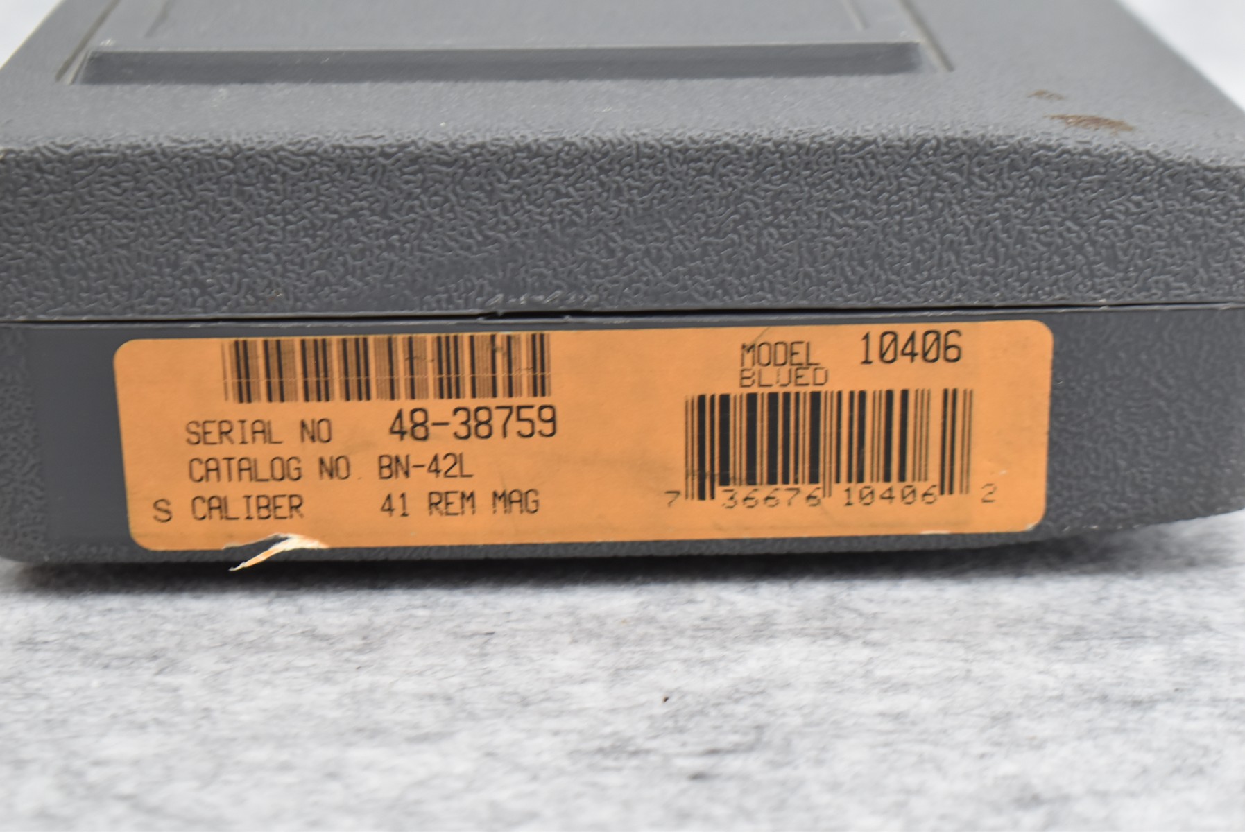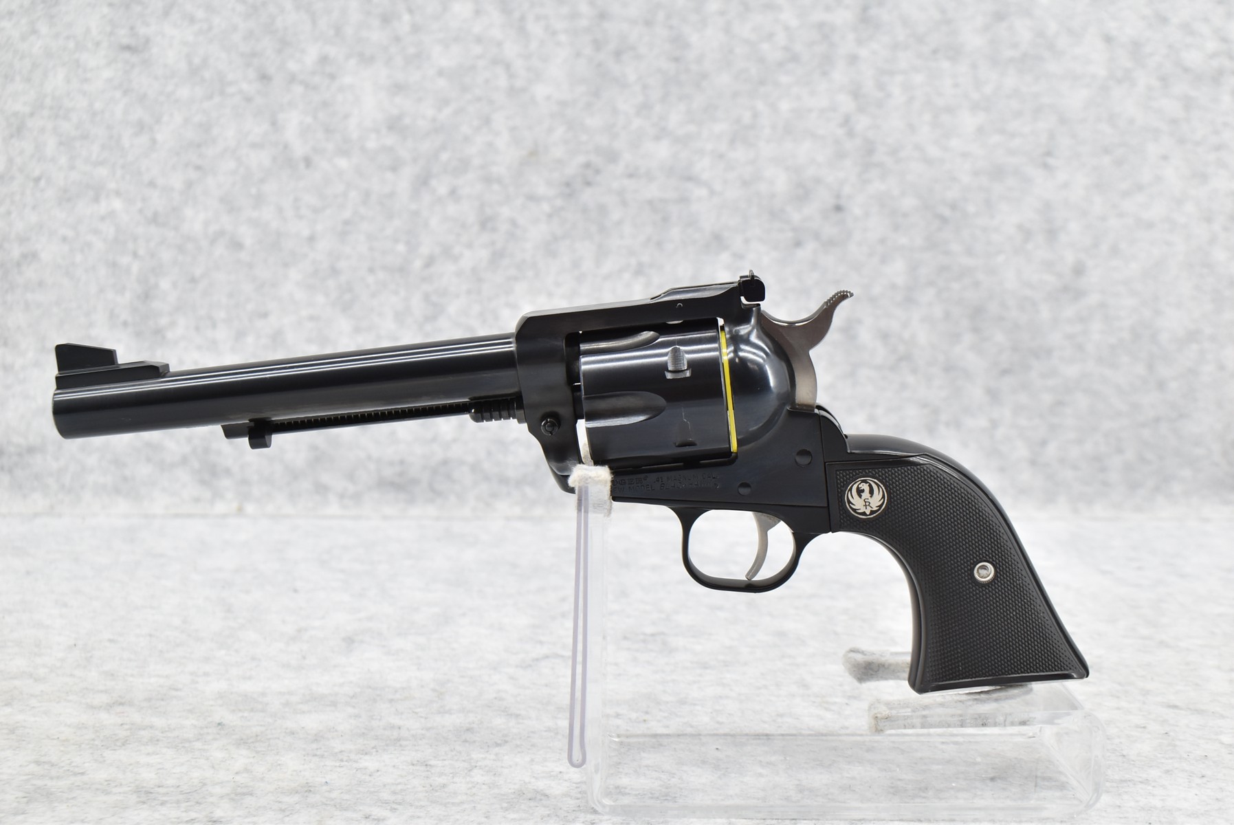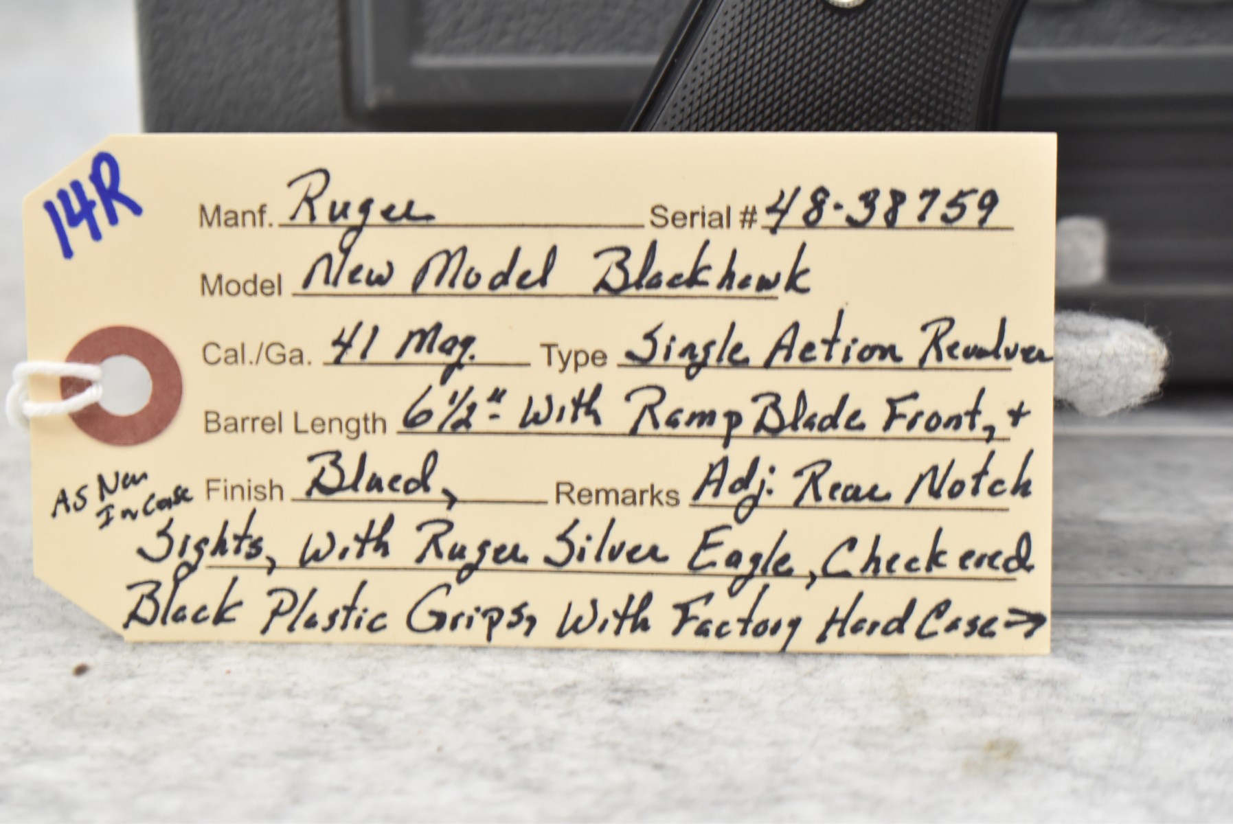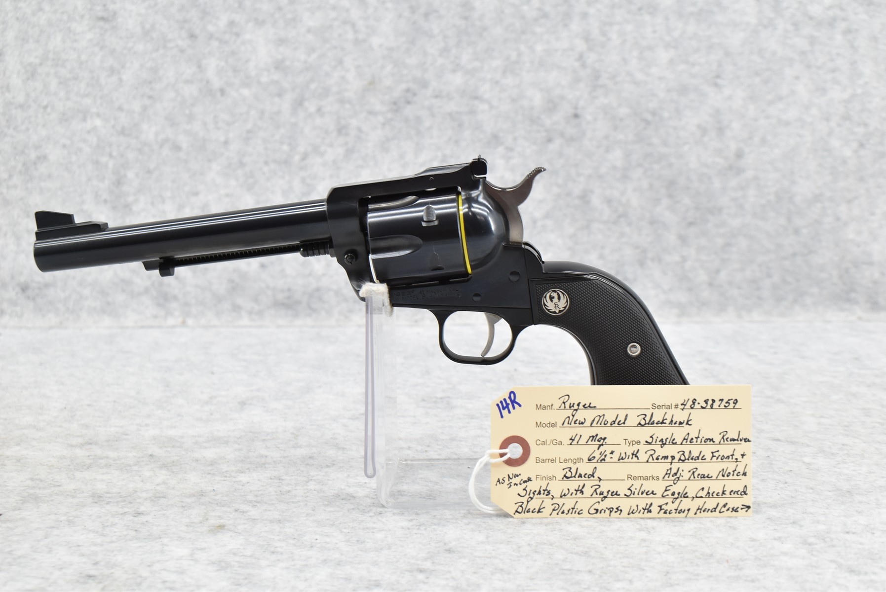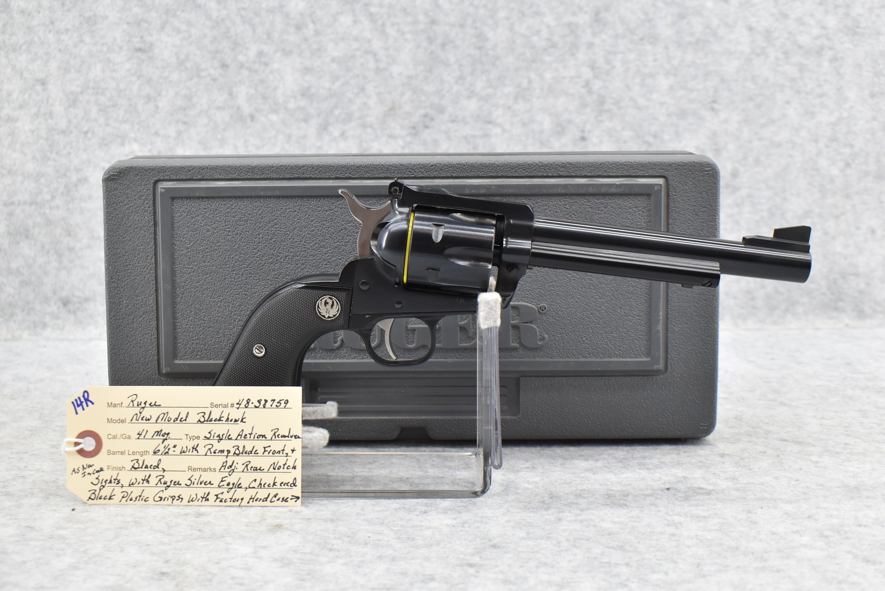 14R. Ruger – Mod. New Model Blackhawk – 41 Mag. Cal. Single Action Revolver – w/6½” Barrel w/Ramp Blade Front and Adjustable Rear Notch Sights – Blued Finish – w/Ruger Silver Eagle Checkered Black Plastic Grips – As New w/Factory Hard Case and Manual