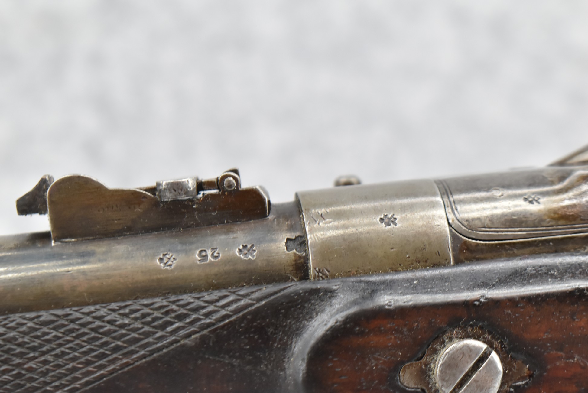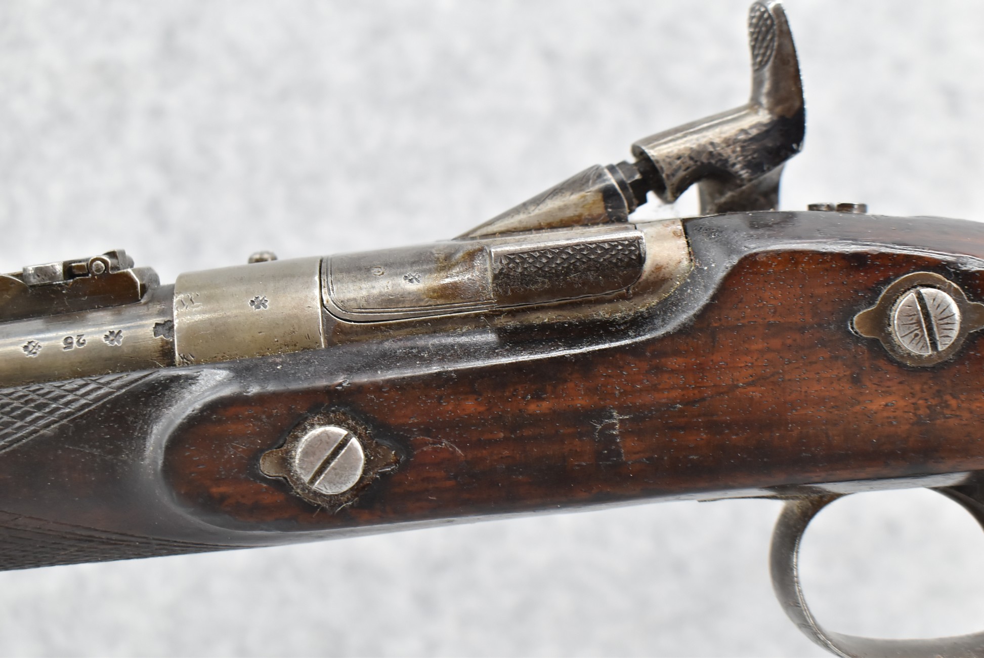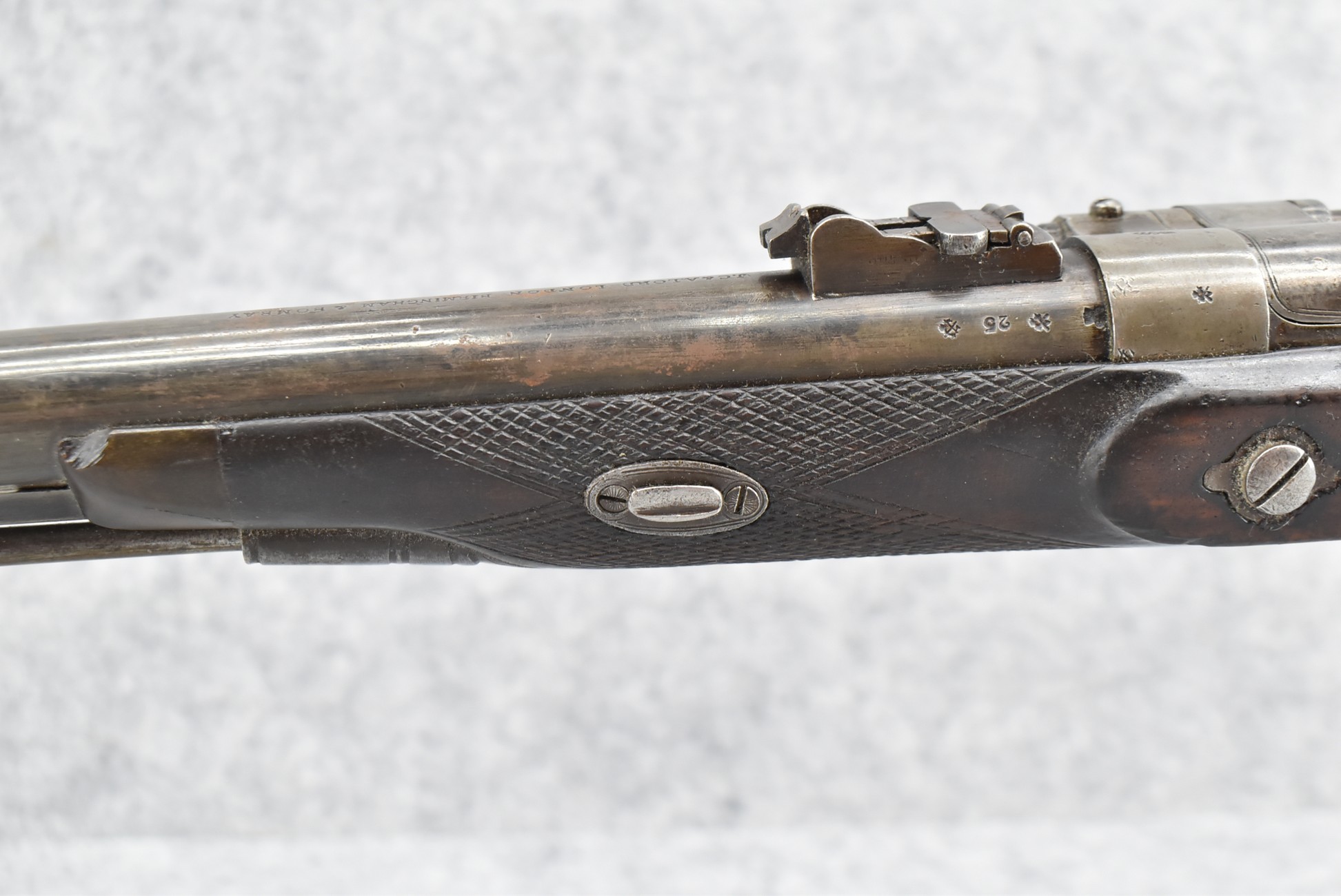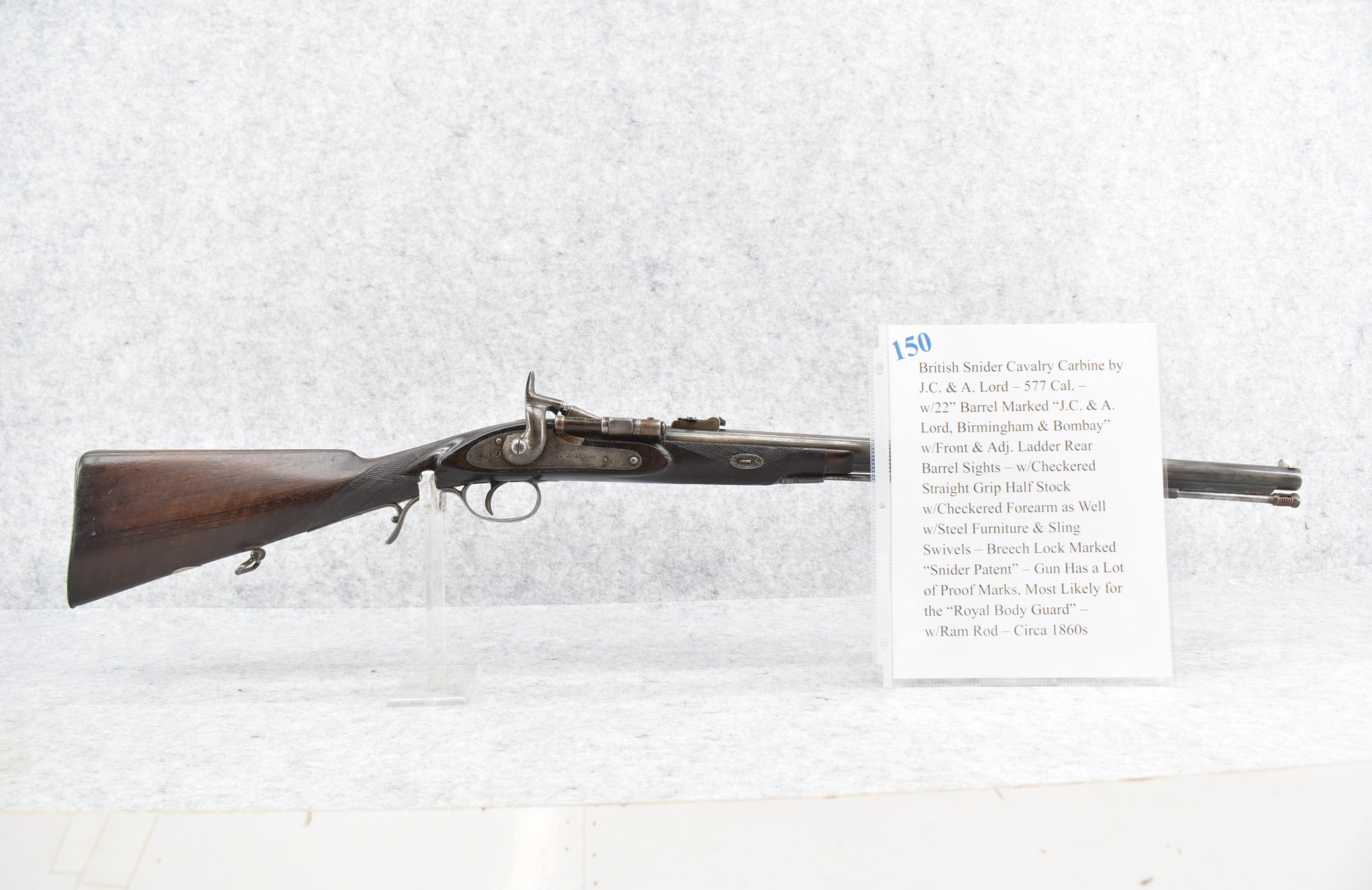150. British Snider Cavalry Carbine by J.C. & A. Lord – 577 Cal. – w/22” Barrel Marked “J.C. & A. Lord, Birmingham & Bombay” w/Front & Adj. Ladder Rear Barrel Sights – w/Checkered Straight Grip Half Stock w/Checkered Forearm as Well w/Steel Furniture & Sling Swivels – Breech Lock Marked “Snider Patent” – Gun Has a Lot of Proof Marks, Most Likely for the “Royal Body Guard” – w/Ram Rod – Circa 1860s
