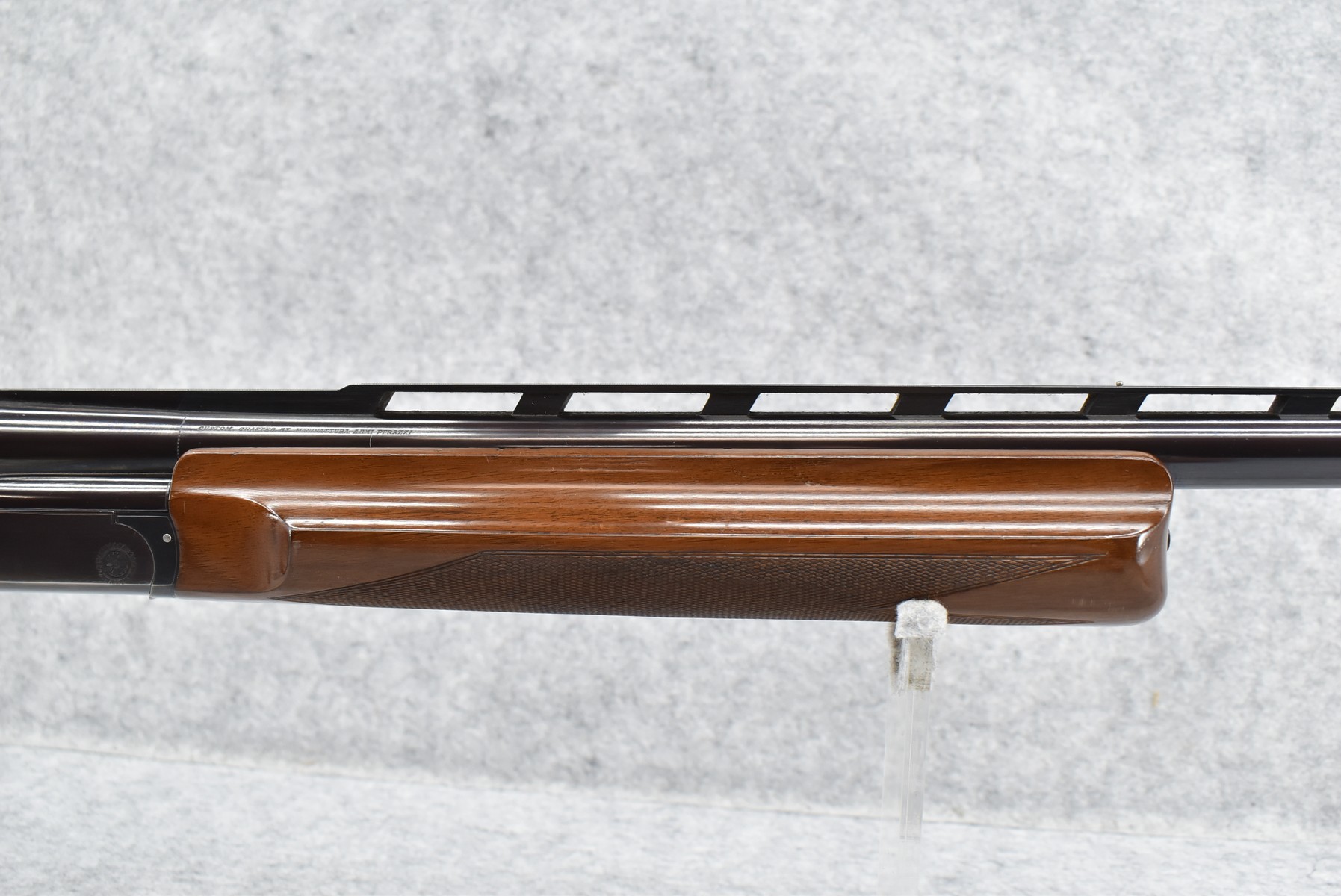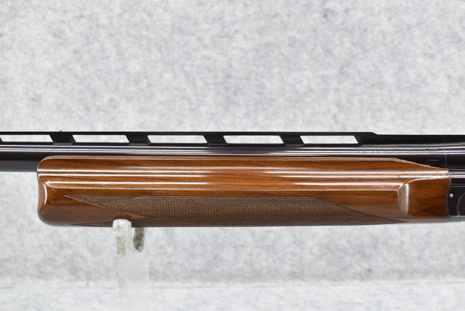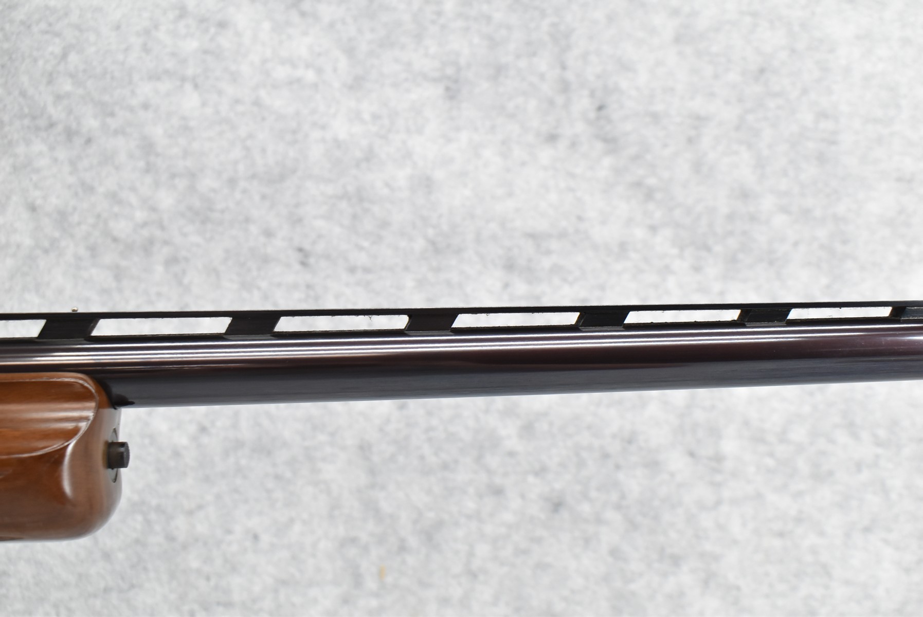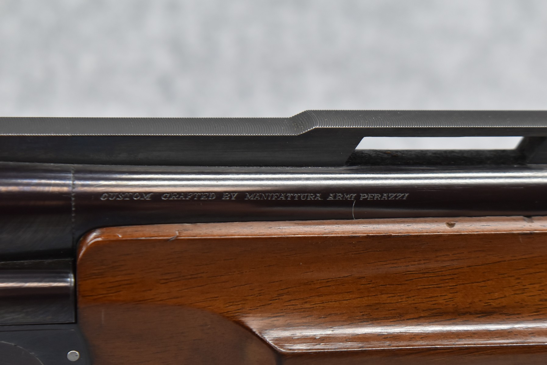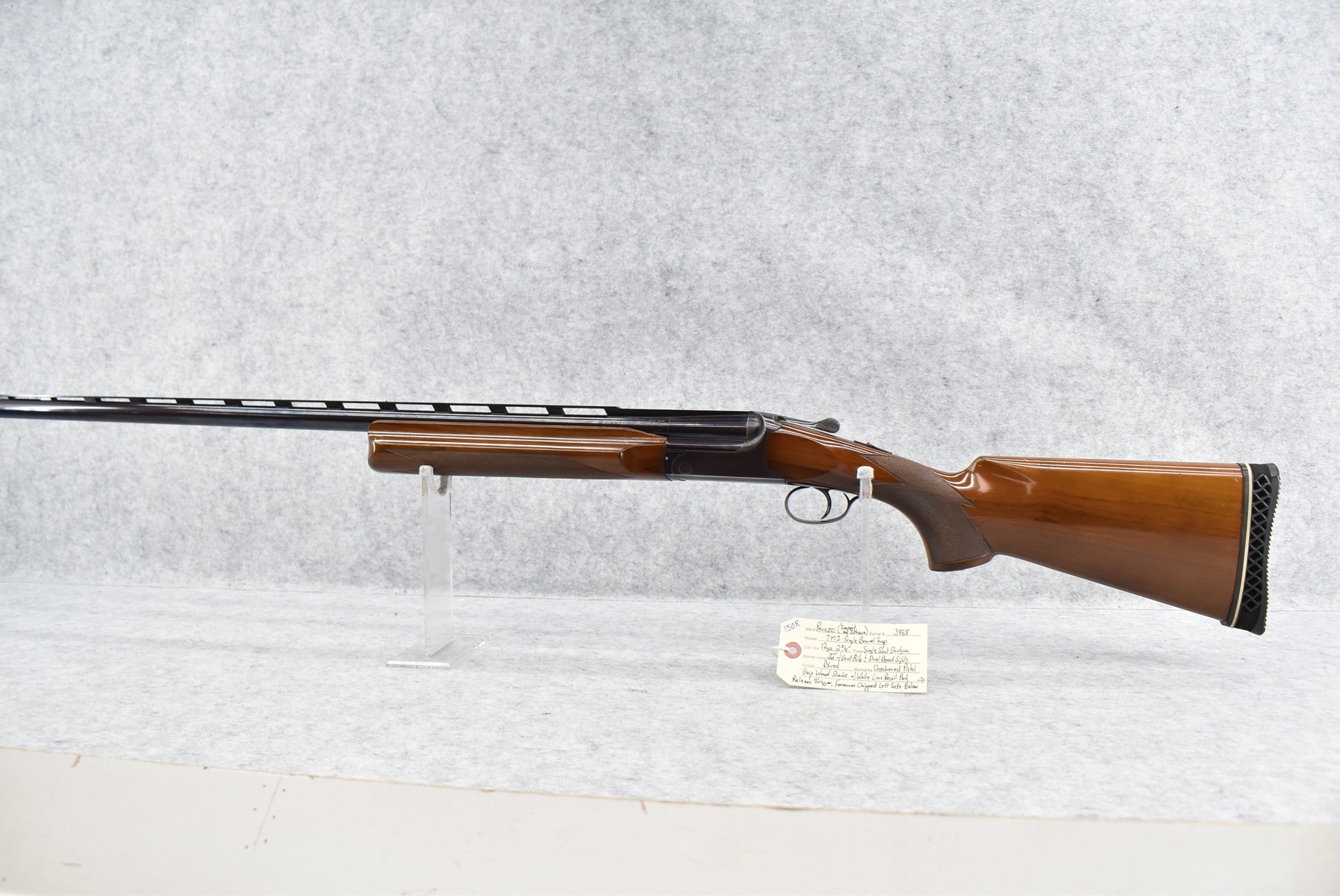 150R.     Perazzi (Import by Ithaca) – Mod. TM1 Single Barrel Trap – 12ga. 2 ¾” Single Shot Shotgun – w/32” Vent-Rib Barrel w/Dual Bead Sights – Blued Finish – w/Checkered Pistol Grip Wood Stocks w/White Line Recoil Pad – w/Release Trigger – w/Takedown Case – Note:  Forearm Chipped on Left Side Below Barrel Address