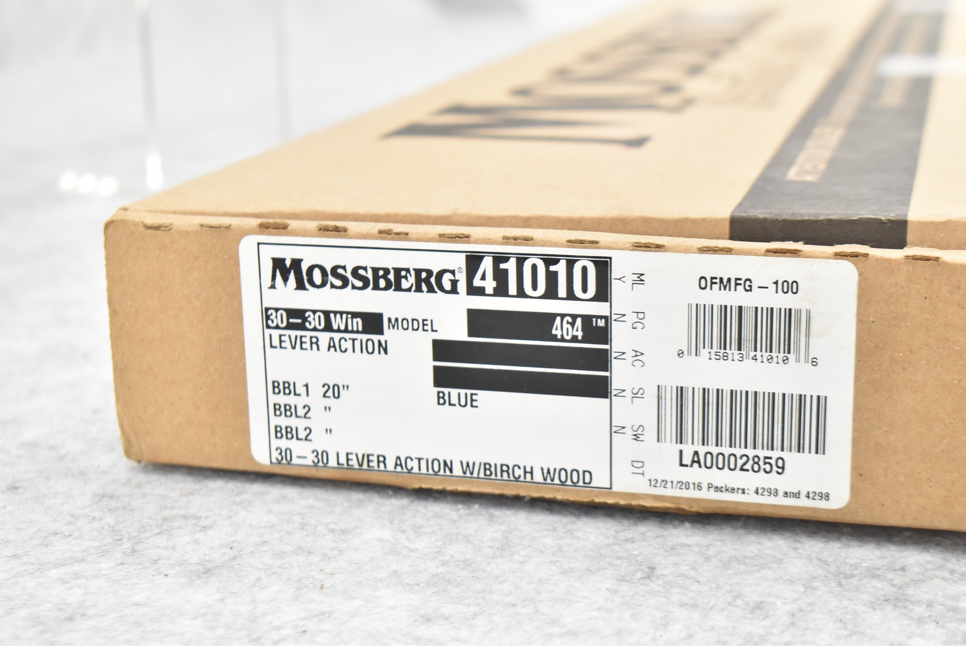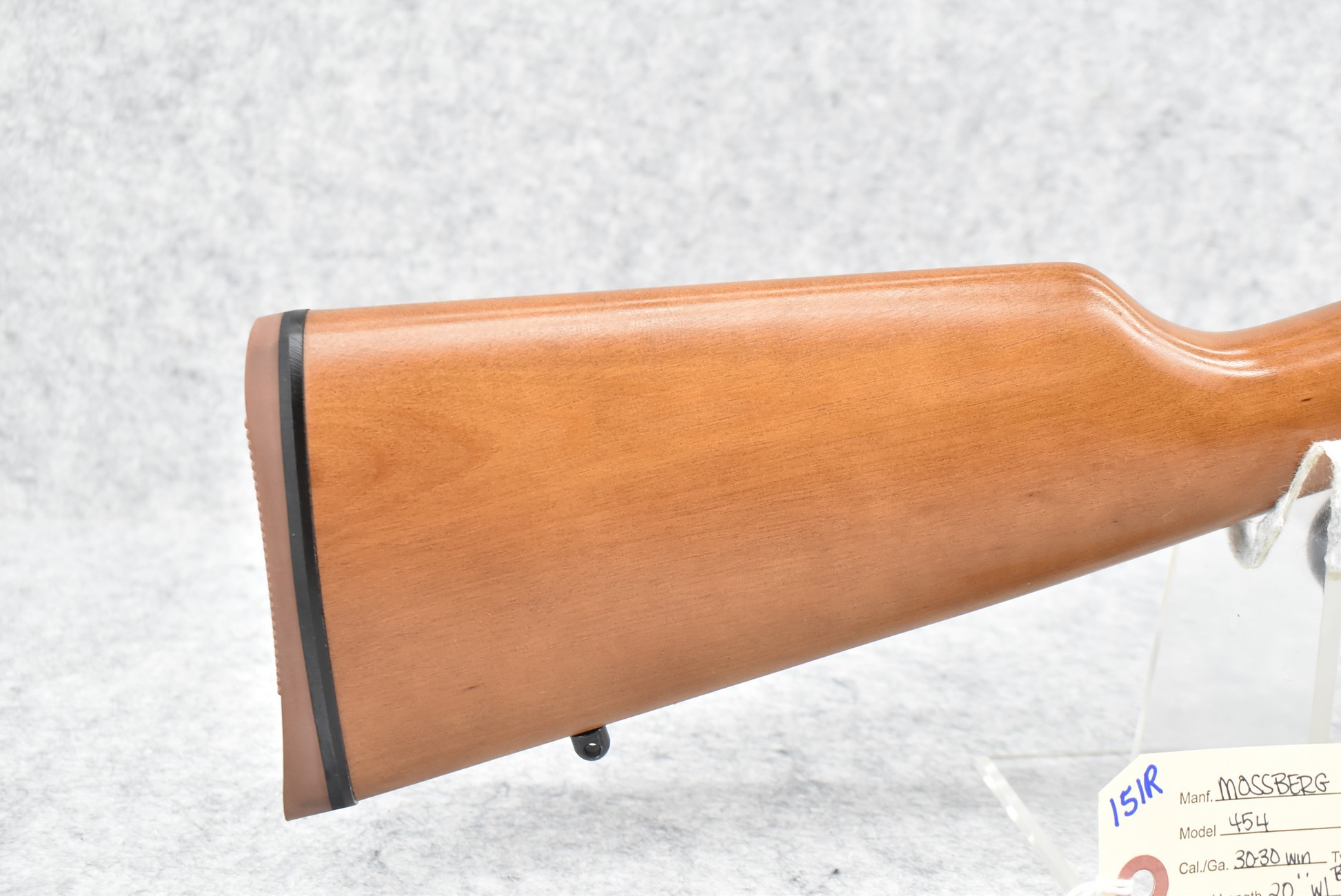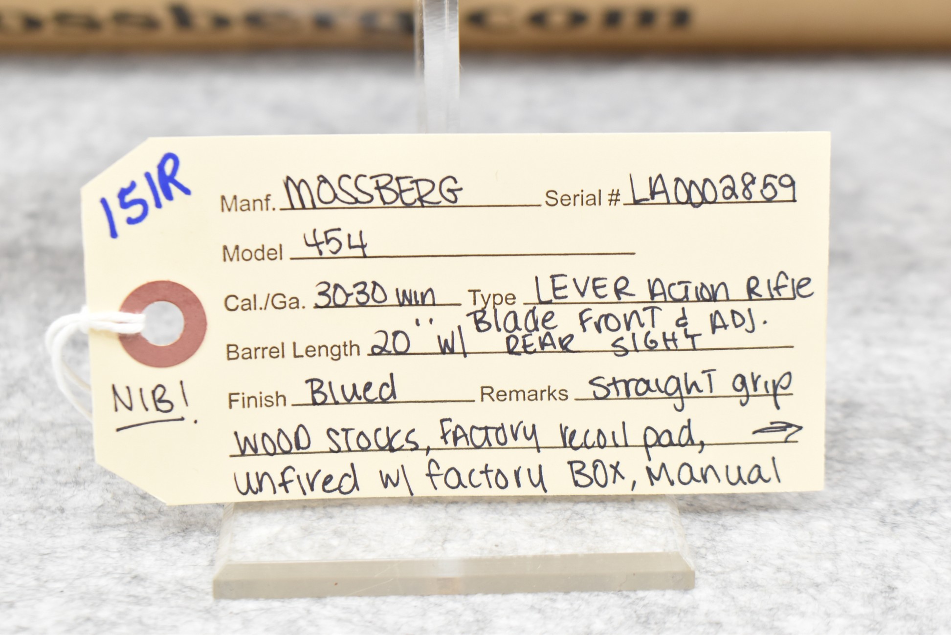 151R. Mossberg – Mod. 454 – 30-30 Win. Cal. Lever Action Rifle – w/20” Barrel w/Blade Front & Adj. Rear Sights – Blued Finish – w/Straight Grip Wood Stocks w/Factory Recoil Pad – New & Unfired w/Factory Box & Manual