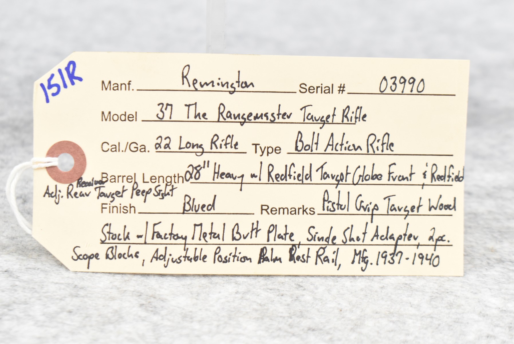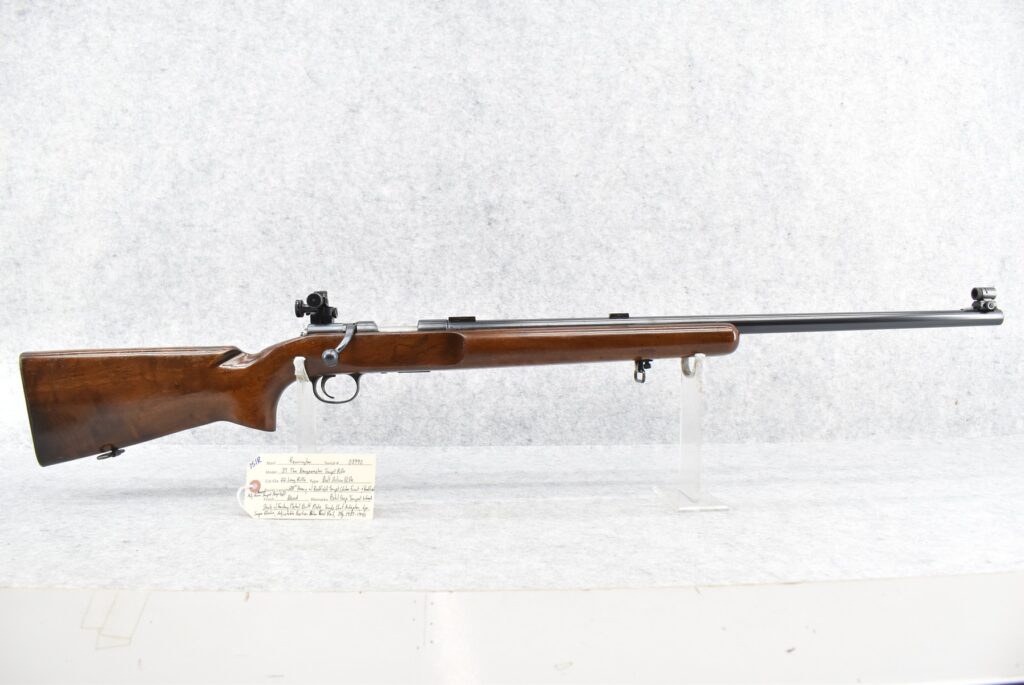 151R. Remington – Mod. 37 The Rangemaster Target Rifle – 22 Long Rifle Cal. Bolt Action Rifle – w/28” Heavy Barrel w/Redfield Target Globe Front & Redfield Adj. Rear Receiver Target Peep Sights – Blued Finish – w/Pistol Grip Target Wood Stock w/Factory Metal Butt Plate, Single Shot Magazine Adapter & Adj. Position Palm Rest Rail – w/2pc. Scope Blocks – Mfg. Between 1937-1940