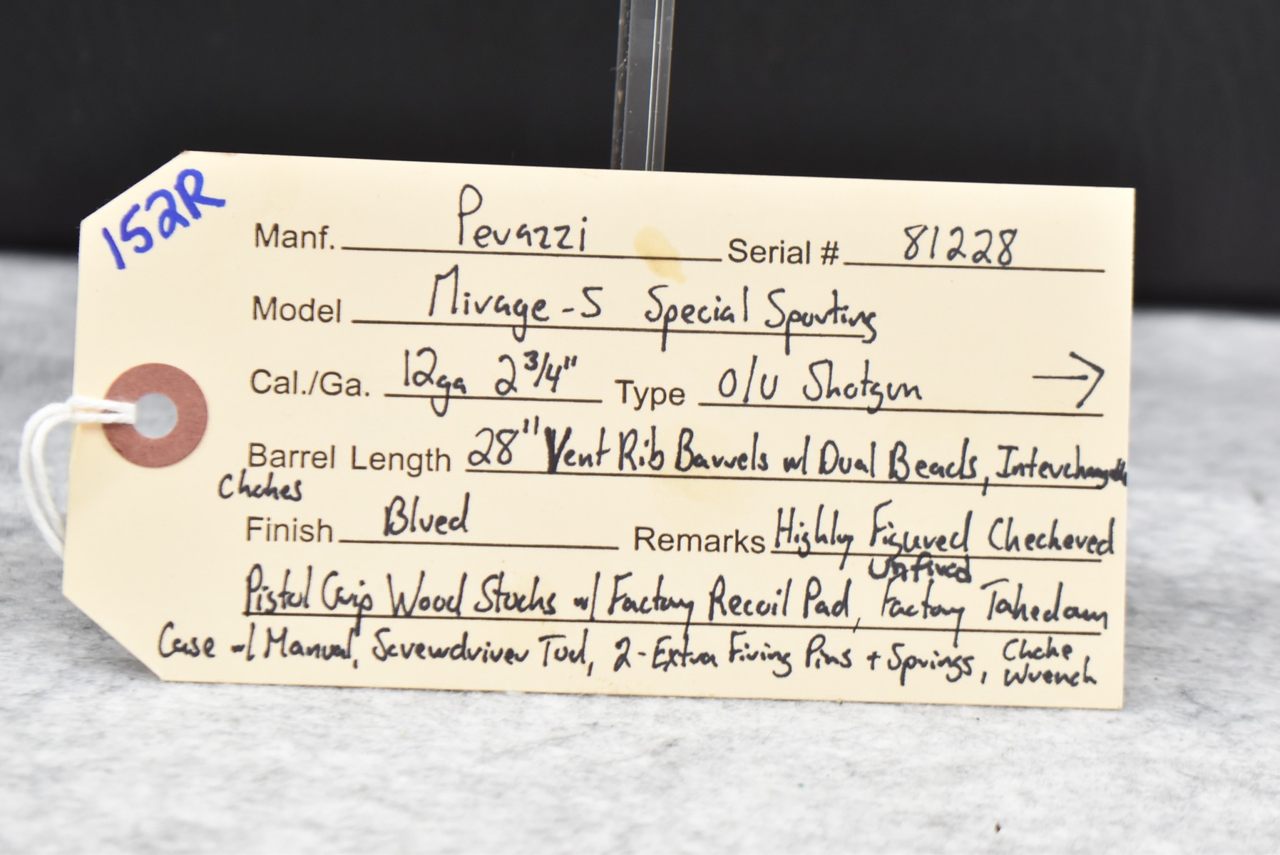 152R.     Perazzi – Mod. Mirage-S Special Sporting – 12ga. 2 ¾” Over-Under Shotgun – w/28” Interchangeable Chokes, Vent-Rib Barrels w/Dual Beads – Blued Finish – w/Highly Figured Checkered Pistol Grip Wood Stocks w/Factory Recoil Pad – Unfired w/Factory Takedown Case, Manual, Screwdriver Tool, 2 Extra Firing Pins & Springs & Choke Wrench – Note:  Receiver & Barrels Are Pitted Due to Conditions The Gun Was Stored in!