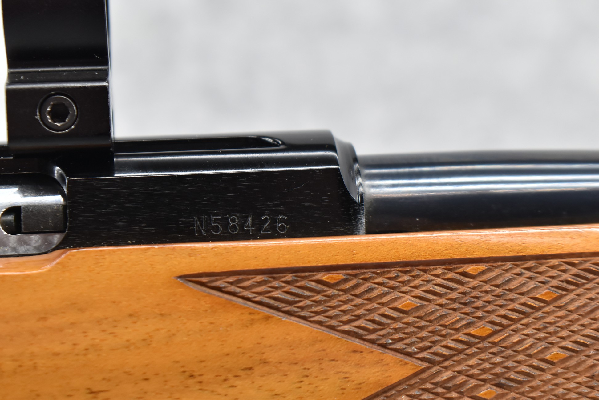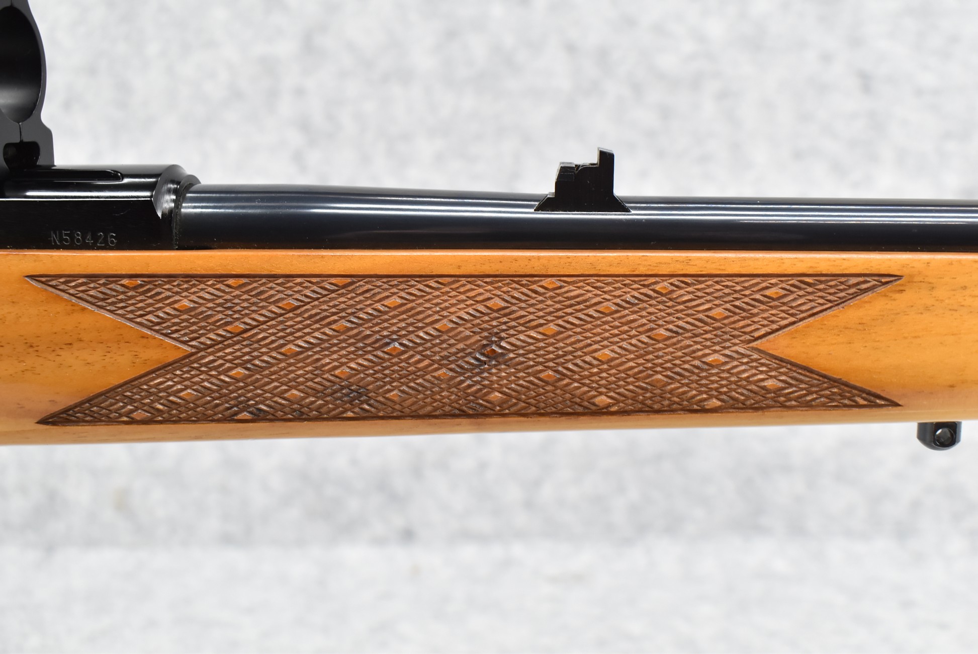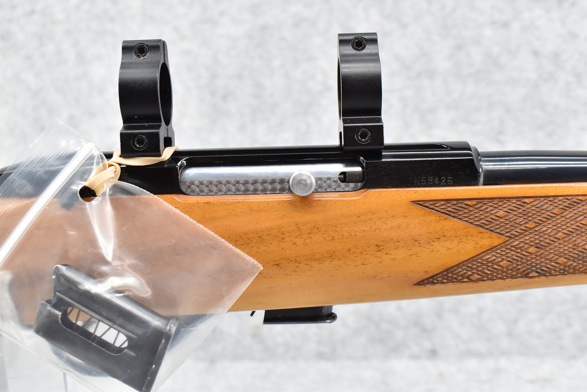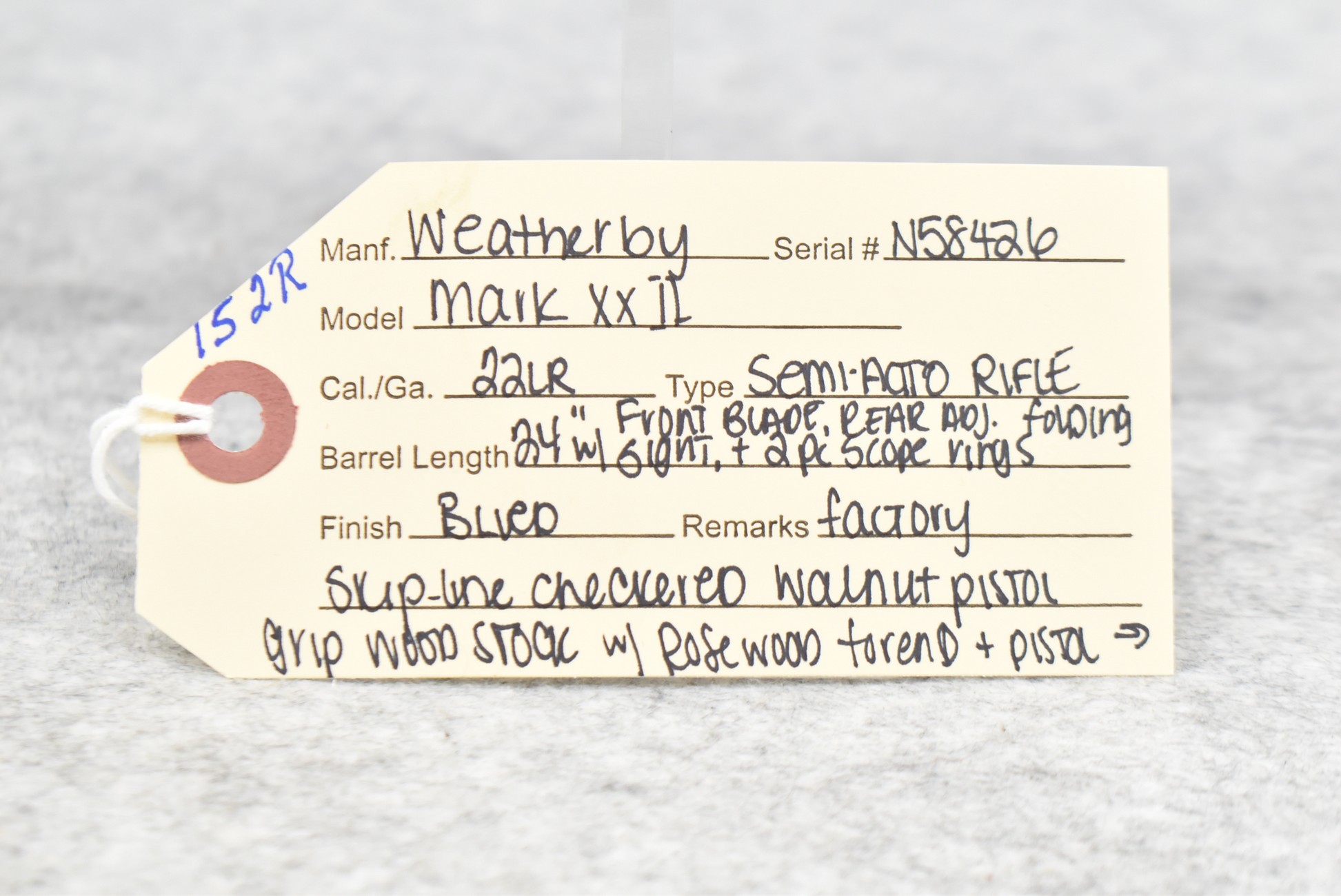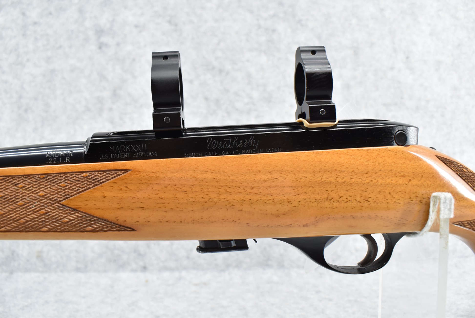 152R. Weatherby – Mod. Mark XXII – 22LR Cal. Semi-Auto Rifle – w/24” Barrel w/Front Blade & Rear Adj. Folding Sight – Blued Finish – w/Factory Skip-Line Checkered Walnut Pistol Grip Wood Stock w/Factory Recoil Pad & Rosewood Forend & Pistol Grip Cap – w/2 Factory Detachable Magazines – w/2pc. Scope Rings – Approx. Only 100,000 Mfg. Between 1964-1988