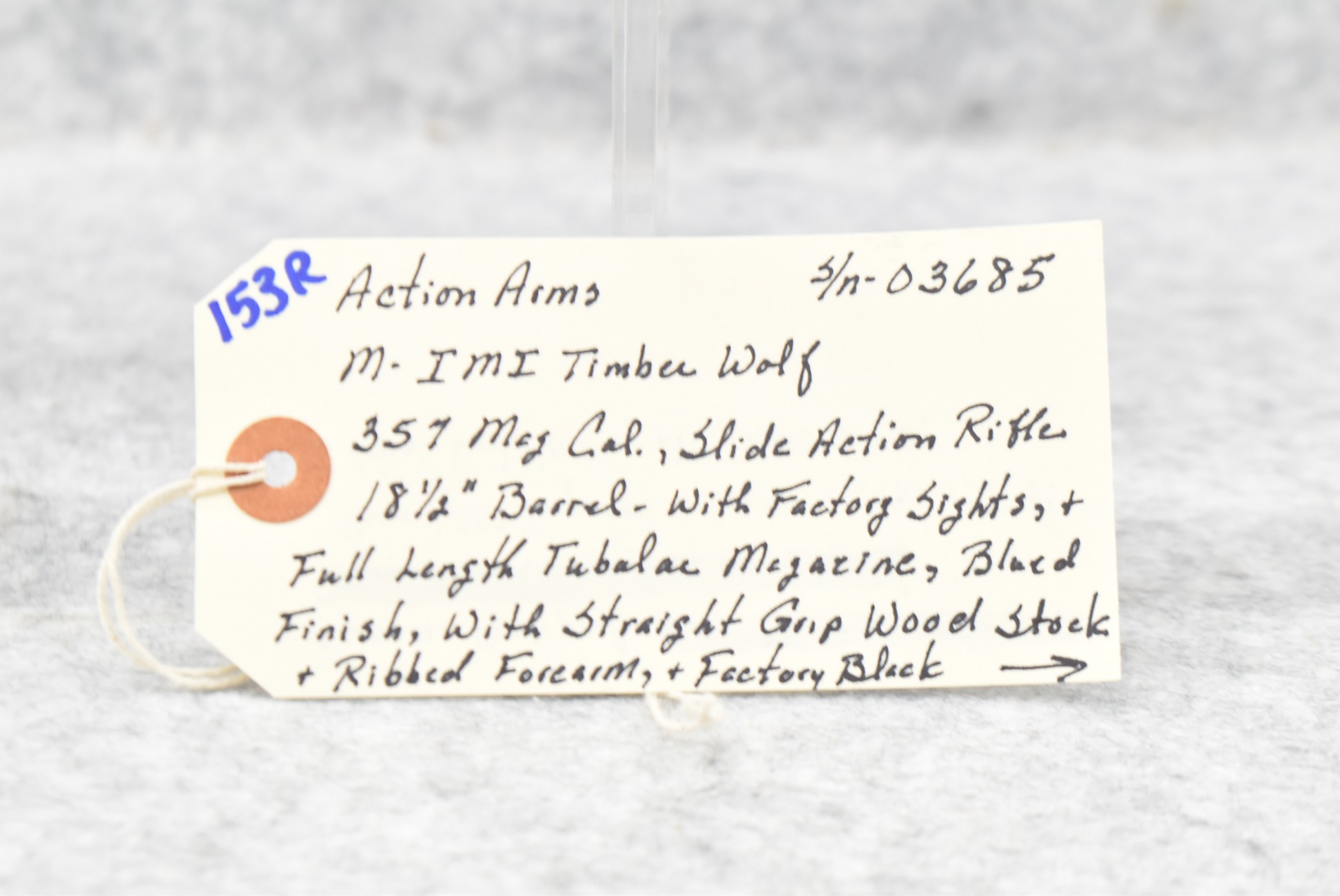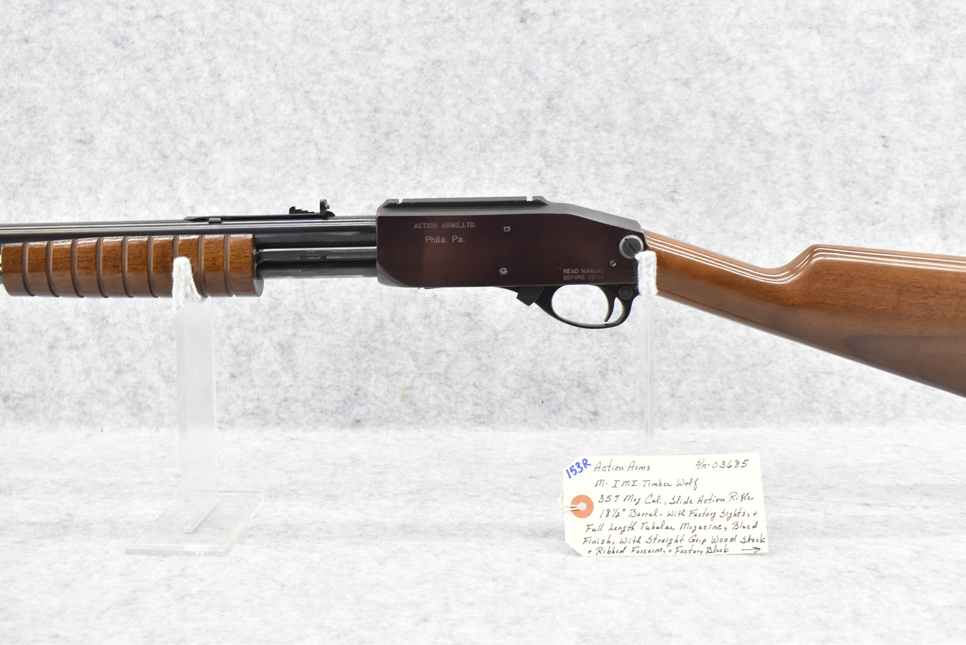 153R. Action Arms – Mod. Timber Wolf – 357 Mag. Cal. Pump Action Rifle – w/18½” Barrel w/Factory Sights – Blued Finish – w/Straight Grip Wood Stock and Ribbed Forearm w/Factory Black Rubber Butt Pad – w/Full Length Tubular Magazine – Less Than 1,000 were Imported Between 1990 and 1991! Actual Production By IM1 Ended in 1989