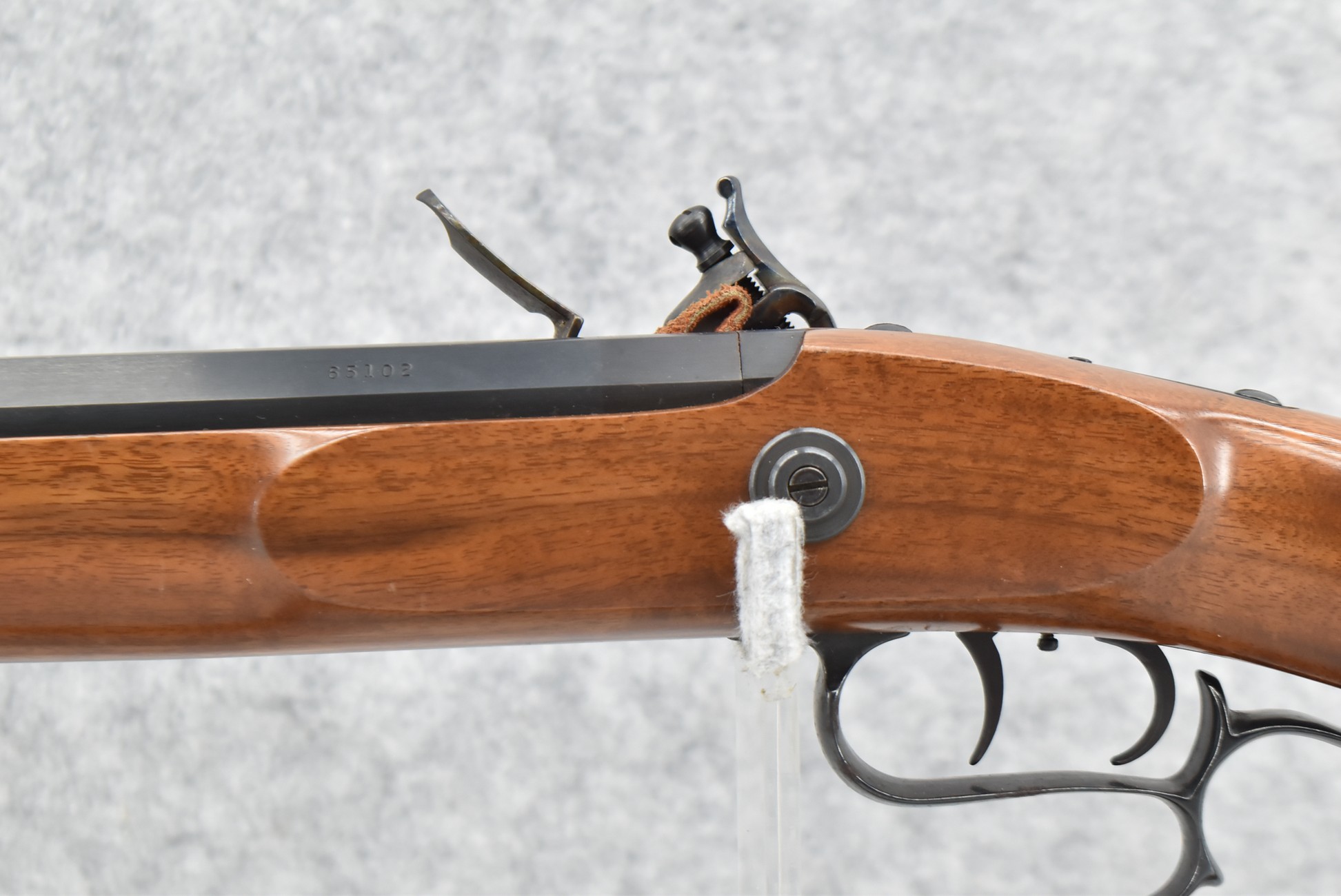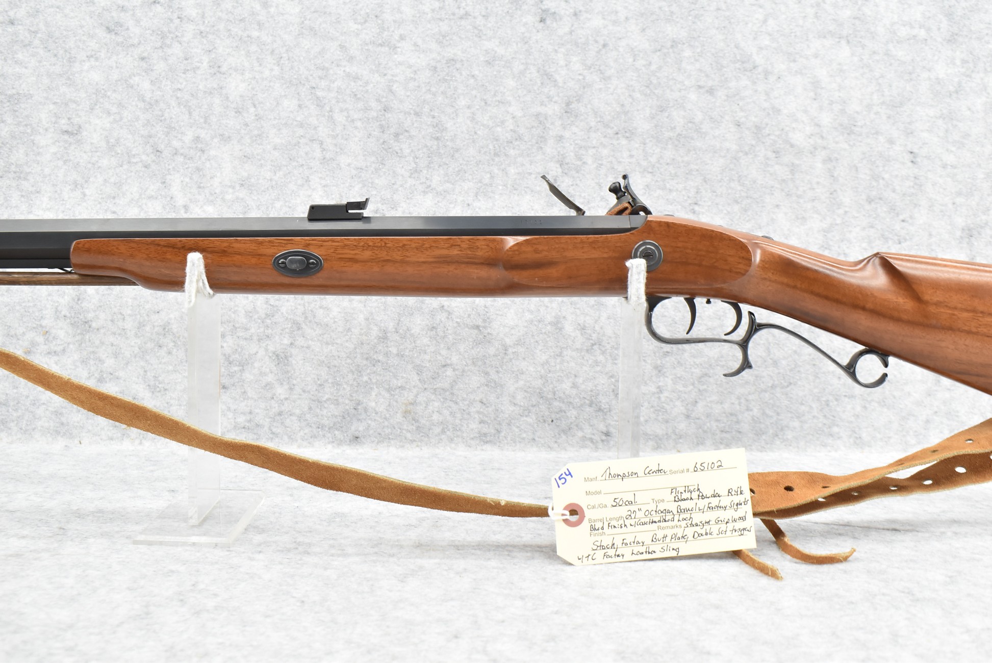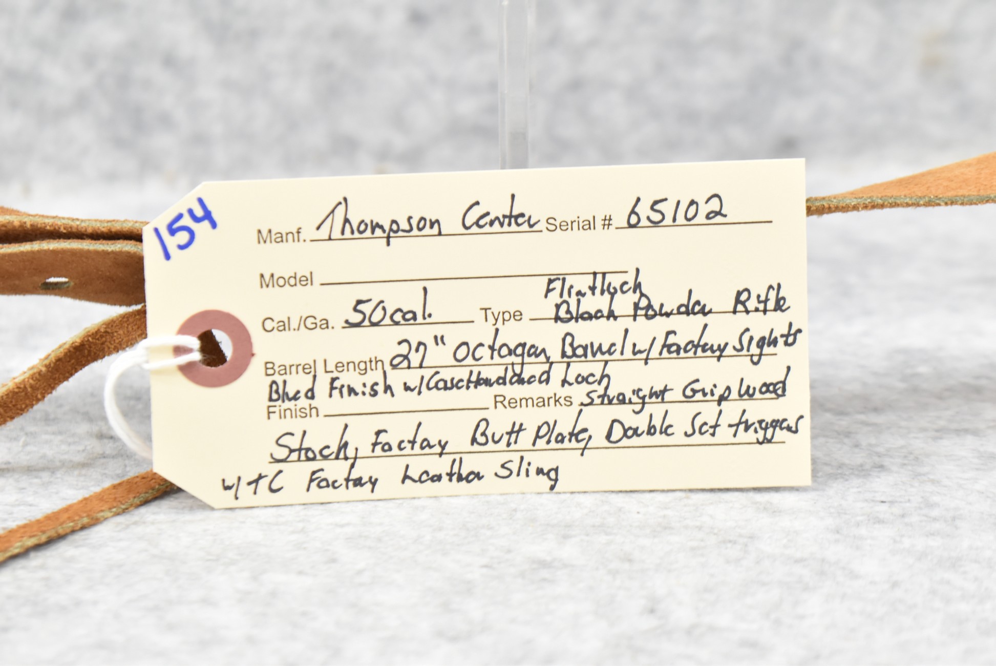 154. Thompson Center – 50 Cal. Flintlock Black Powder Rifle – w/27” Octagon Barrel w/Factory Sights – Blued Finish w/Case Hardened Lock – w/Straight Grip Wood Stock w/Factory Butt Plate – w/Double Set Triggers – w/TC Factory Leather Sling