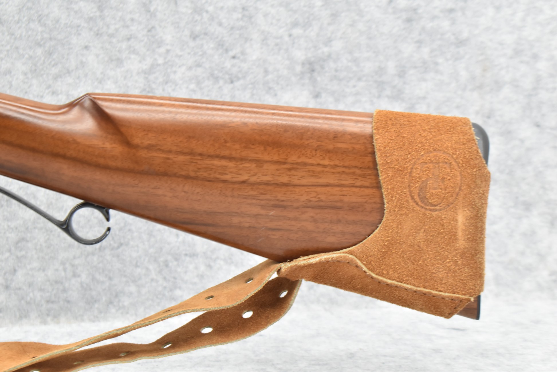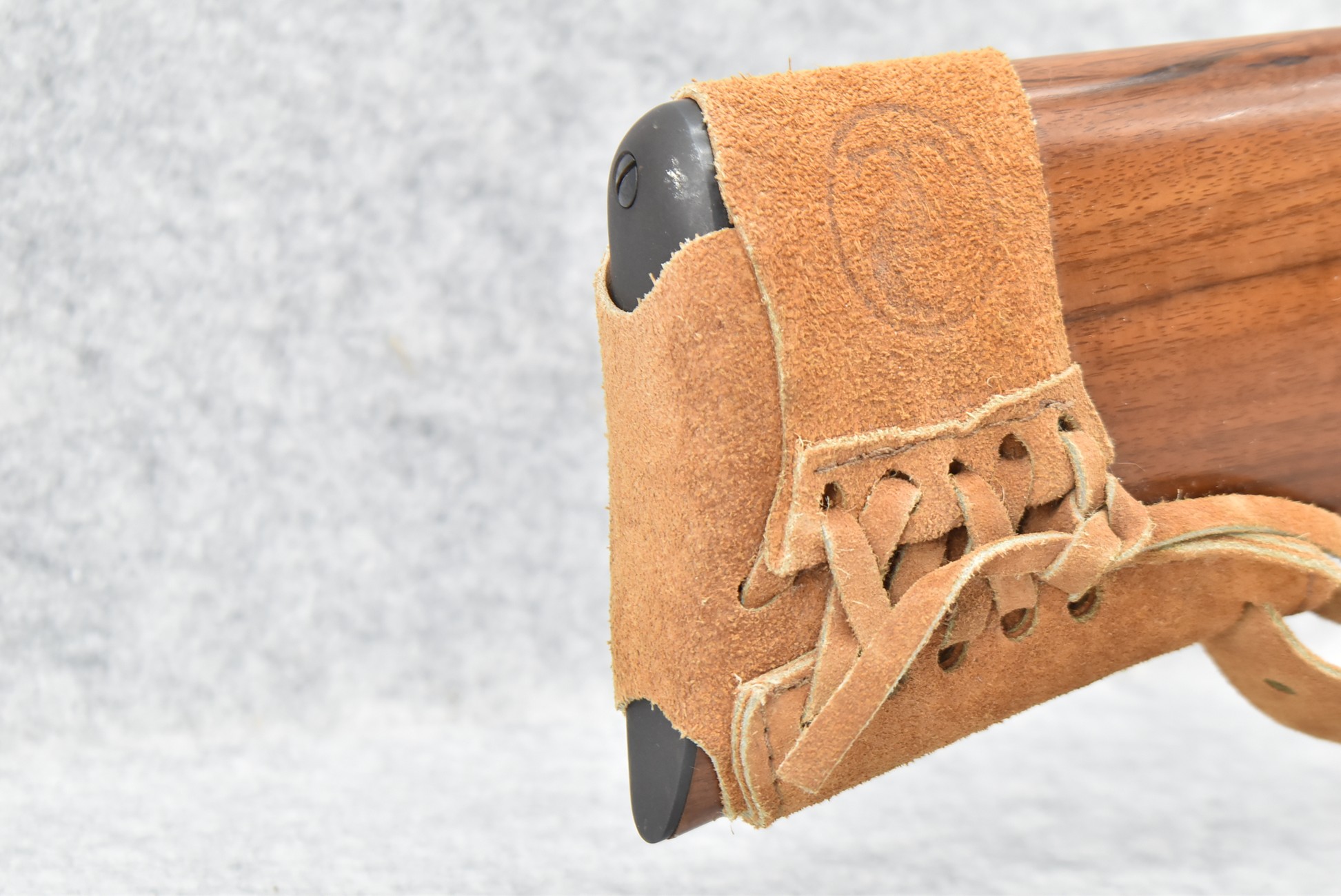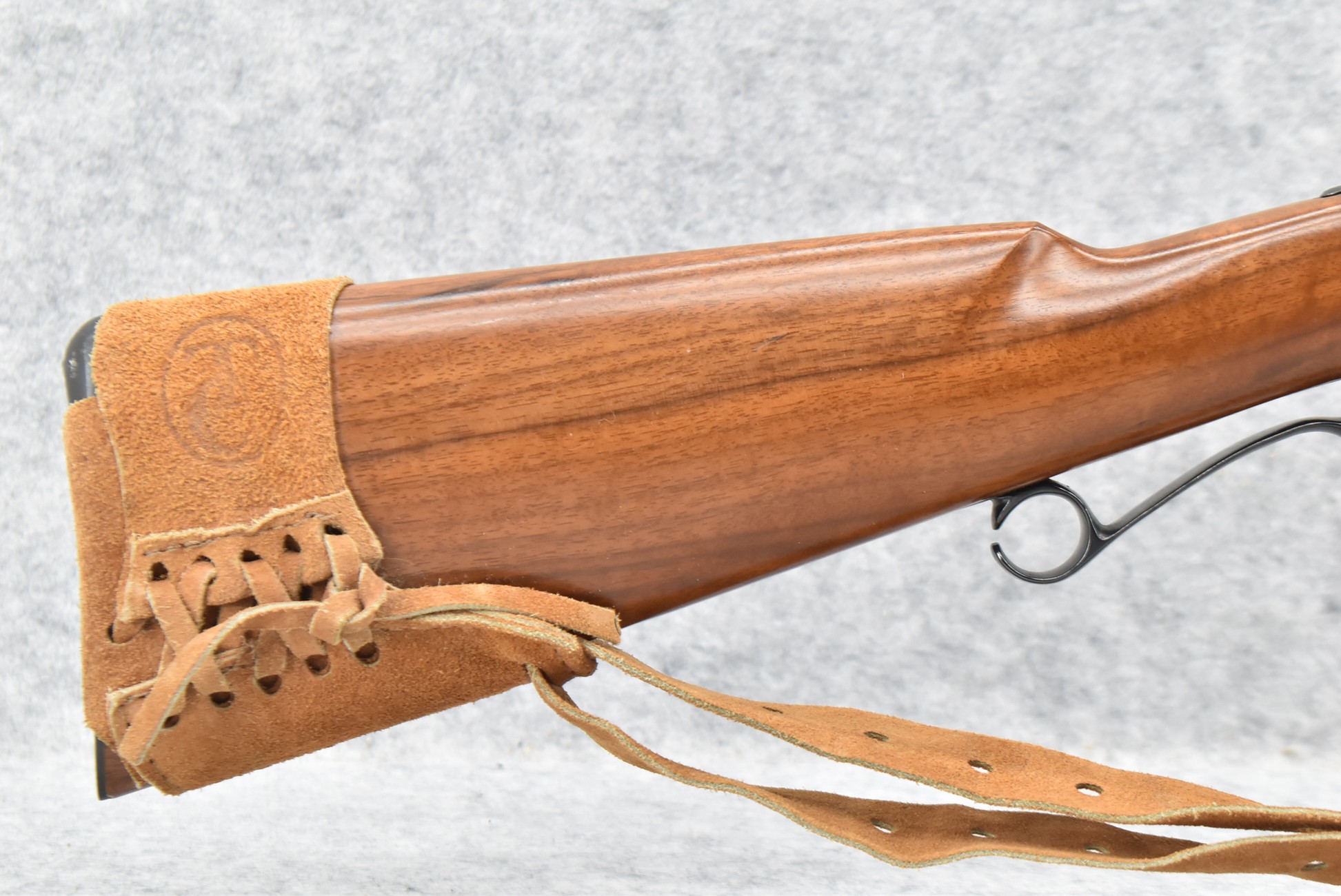 154. Thompson Center – 50 Cal. Flintlock Black Powder Rifle – w/27” Octagon Barrel w/Factory Sights – Blued Finish w/Case Hardened Lock – w/Straight Grip Wood Stock w/Factory Butt Plate – w/Double Set Triggers – w/TC Factory Leather Sling