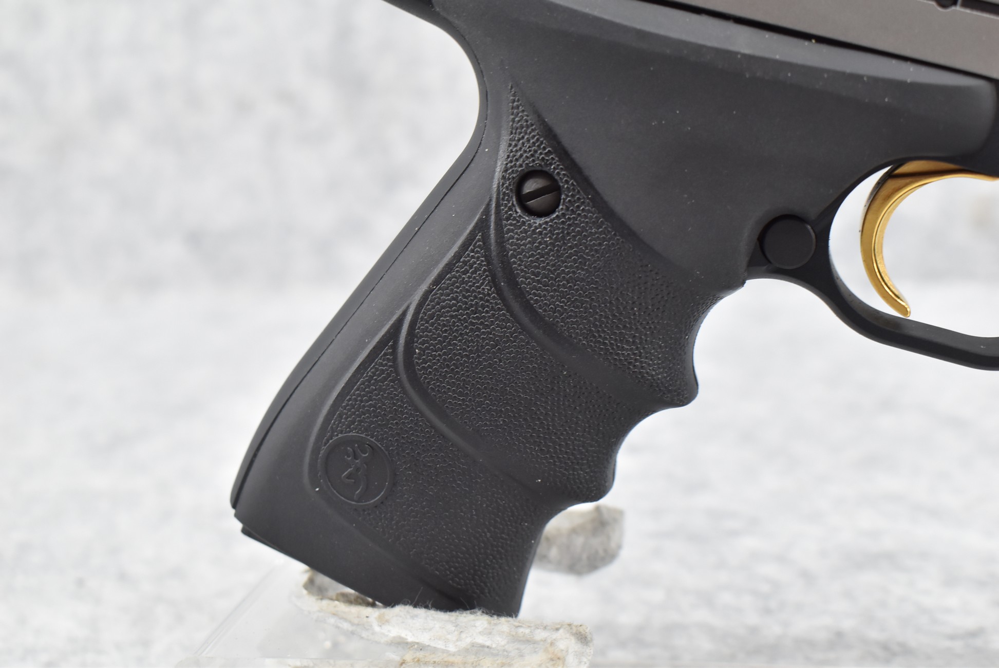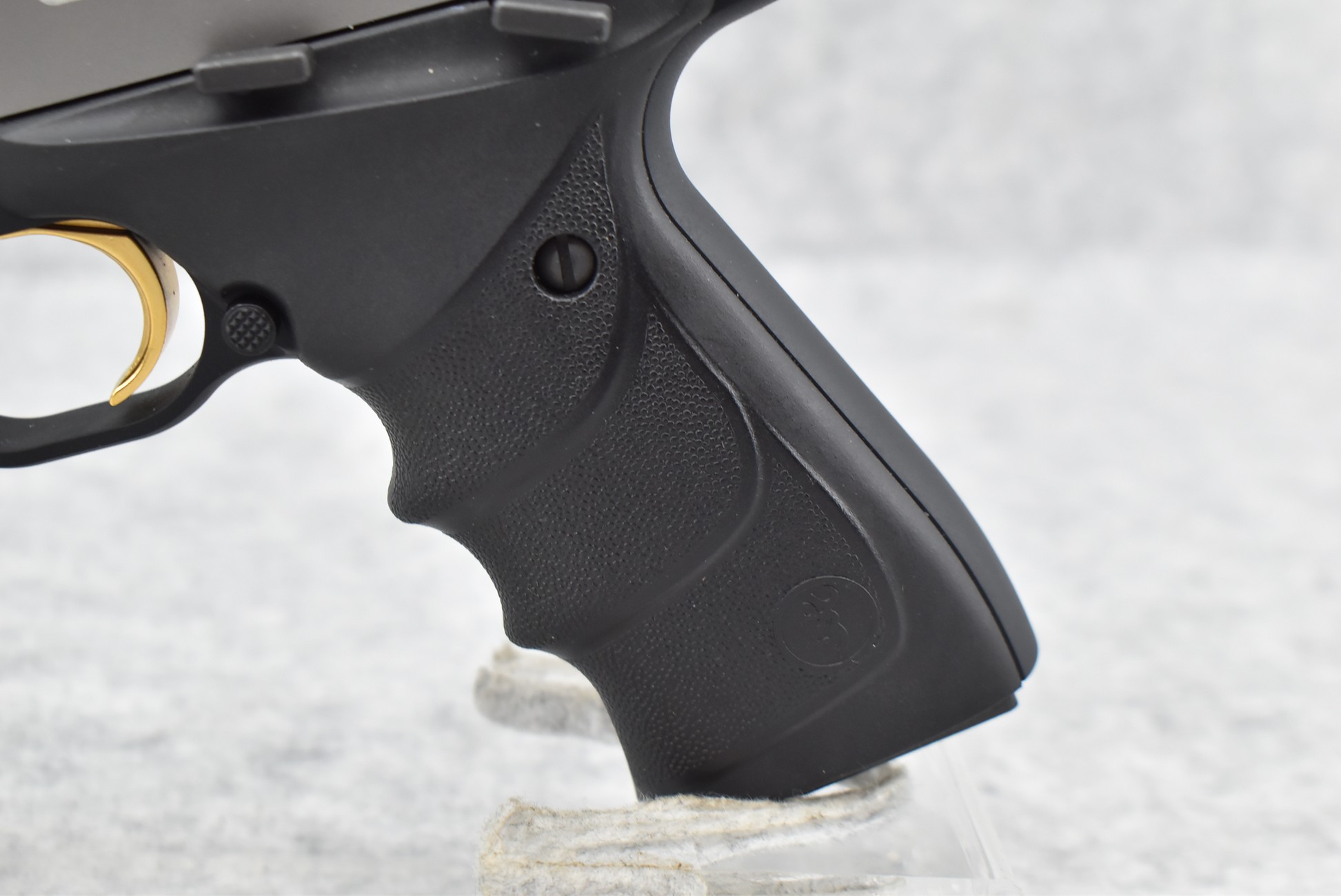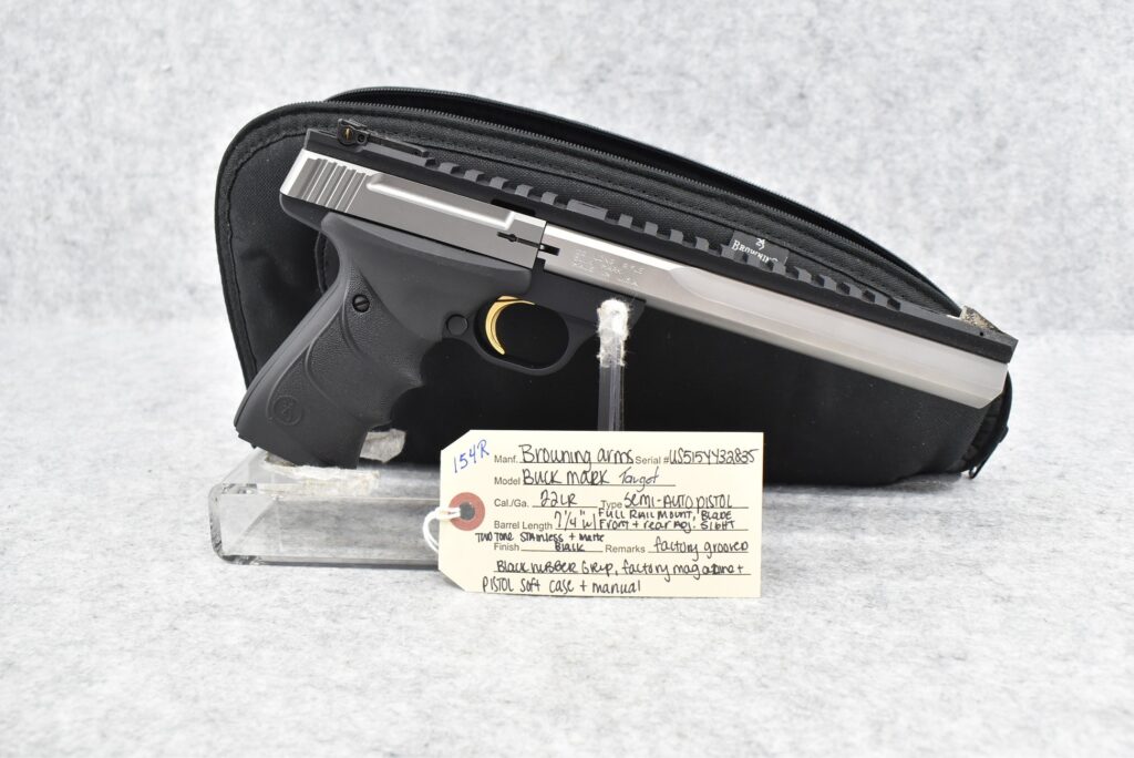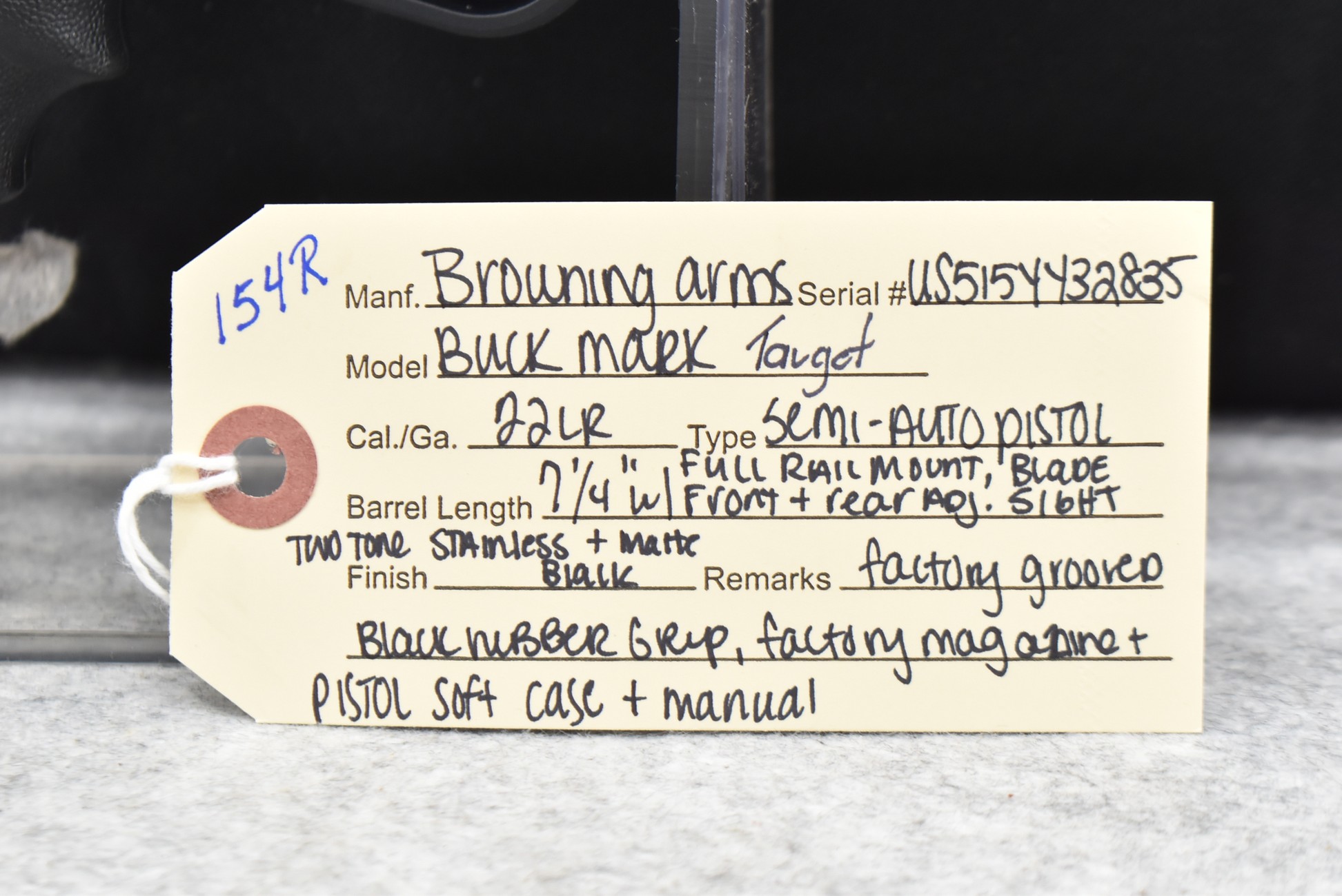 154R. Browning Arms – Mod. Buckmark Target – 22LR Cal. Semi-Auto Pistol – w/7 ¼” Heavy Barrel w/Blade Front & Rear Adj. Sight w/Full Rail Mount – Stainless/Matte Black Two-Tone Finish – w/Factory Grooved Black Rubber Grip – w/Factory Magazine – w/Pistol Soft Case & Manual