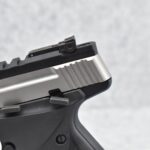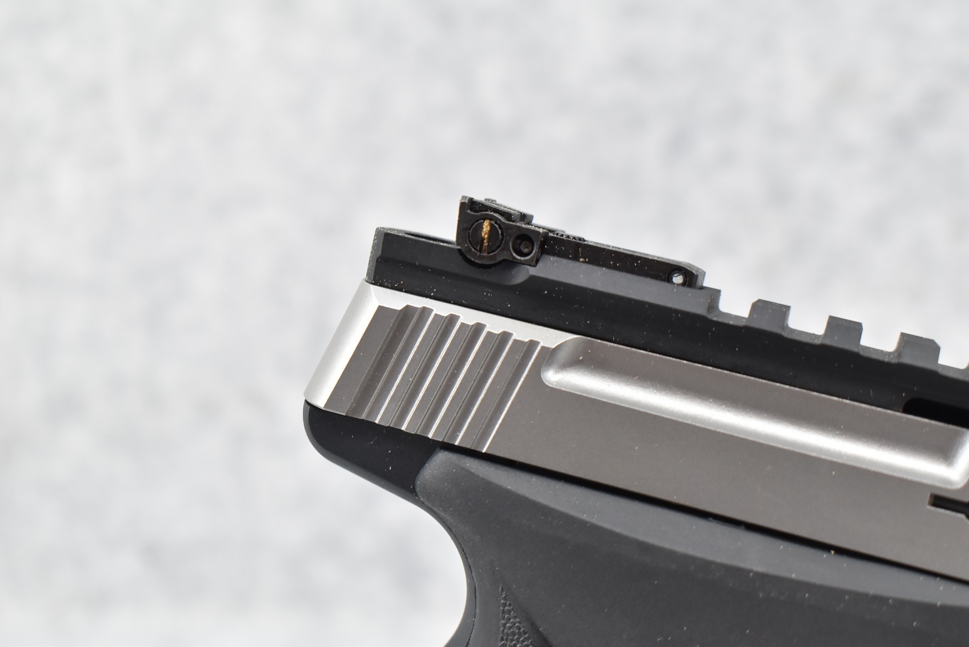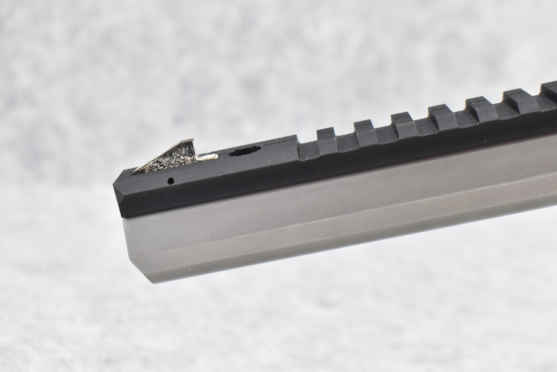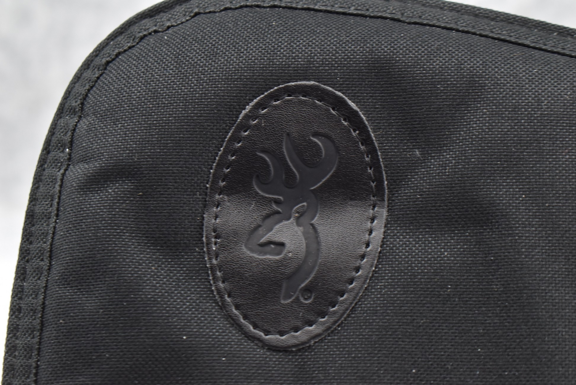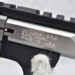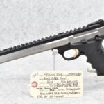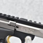 154R. Browning Arms – Mod. Buckmark Target – 22LR Cal. Semi-Auto Pistol – w/7 ¼” Heavy Barrel w/Blade Front & Rear Adj. Sight w/Full Rail Mount – Stainless/Matte Black Two-Tone Finish – w/Factory Grooved Black Rubber Grip – w/Factory Magazine – w/Pistol Soft Case & Manual