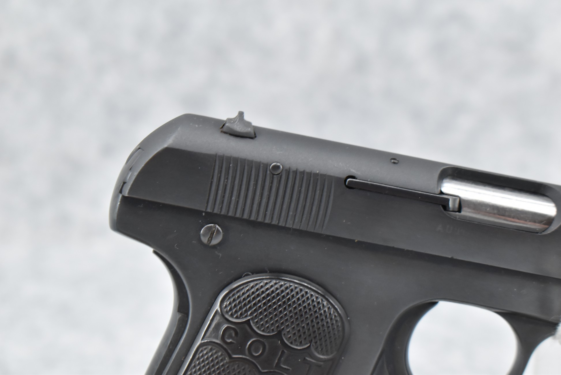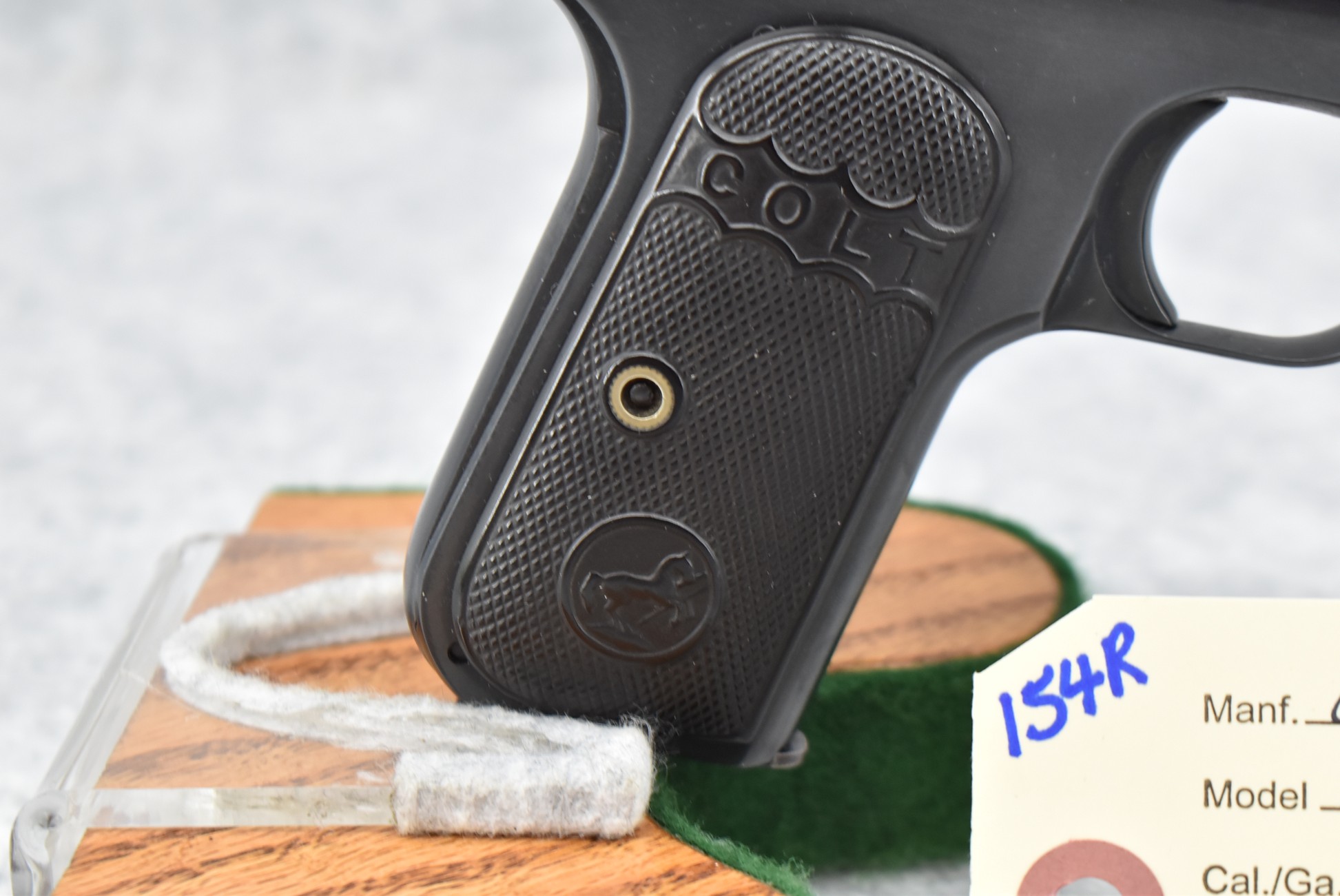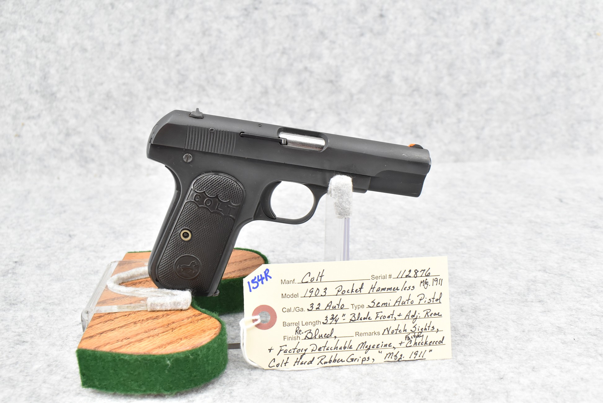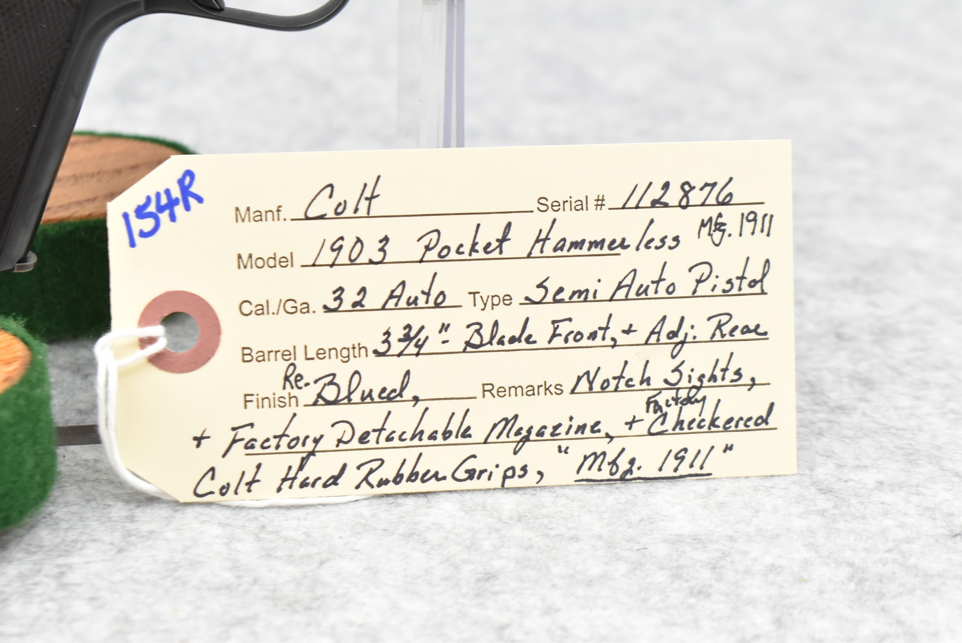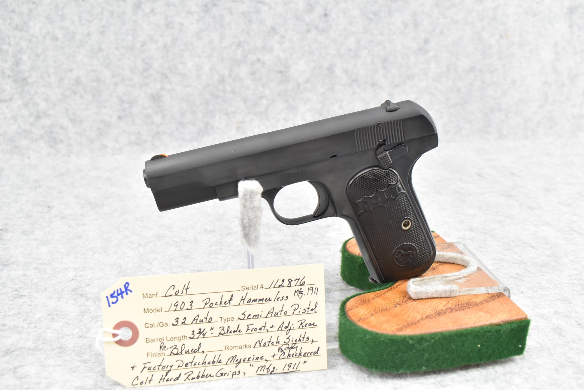 154R. Colt – Mod. 1903 Pocket Hammerless – 32 Auto Semi-Auto Pistol – w/3 ¾” Barrel w/Blade Front & Adj. Rear Notch Sights – Re-Blued Finish – w/Factory Checkered Colt Hard Rubber Grips – w/Factory Detachable Magazine – Mfg. 1911