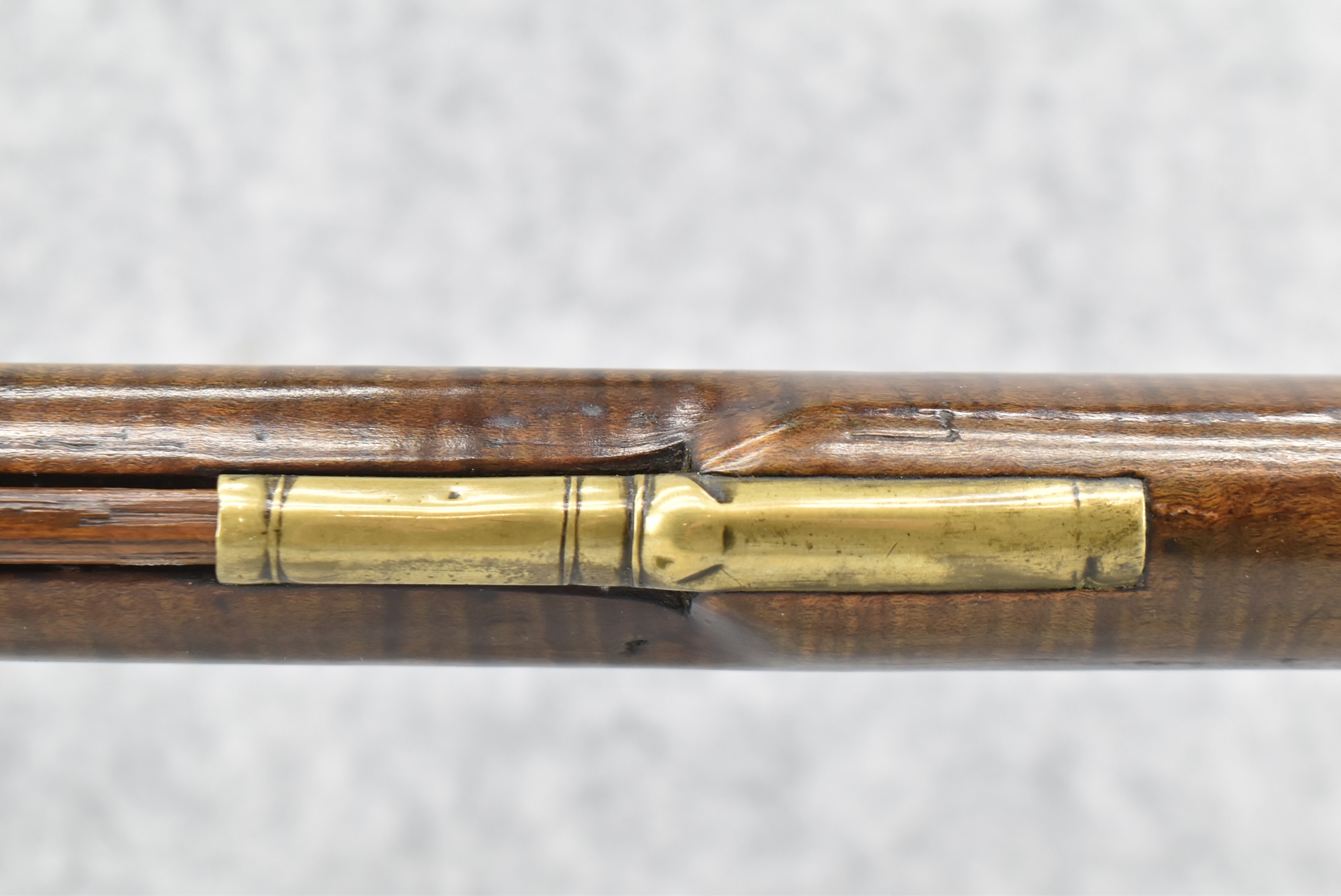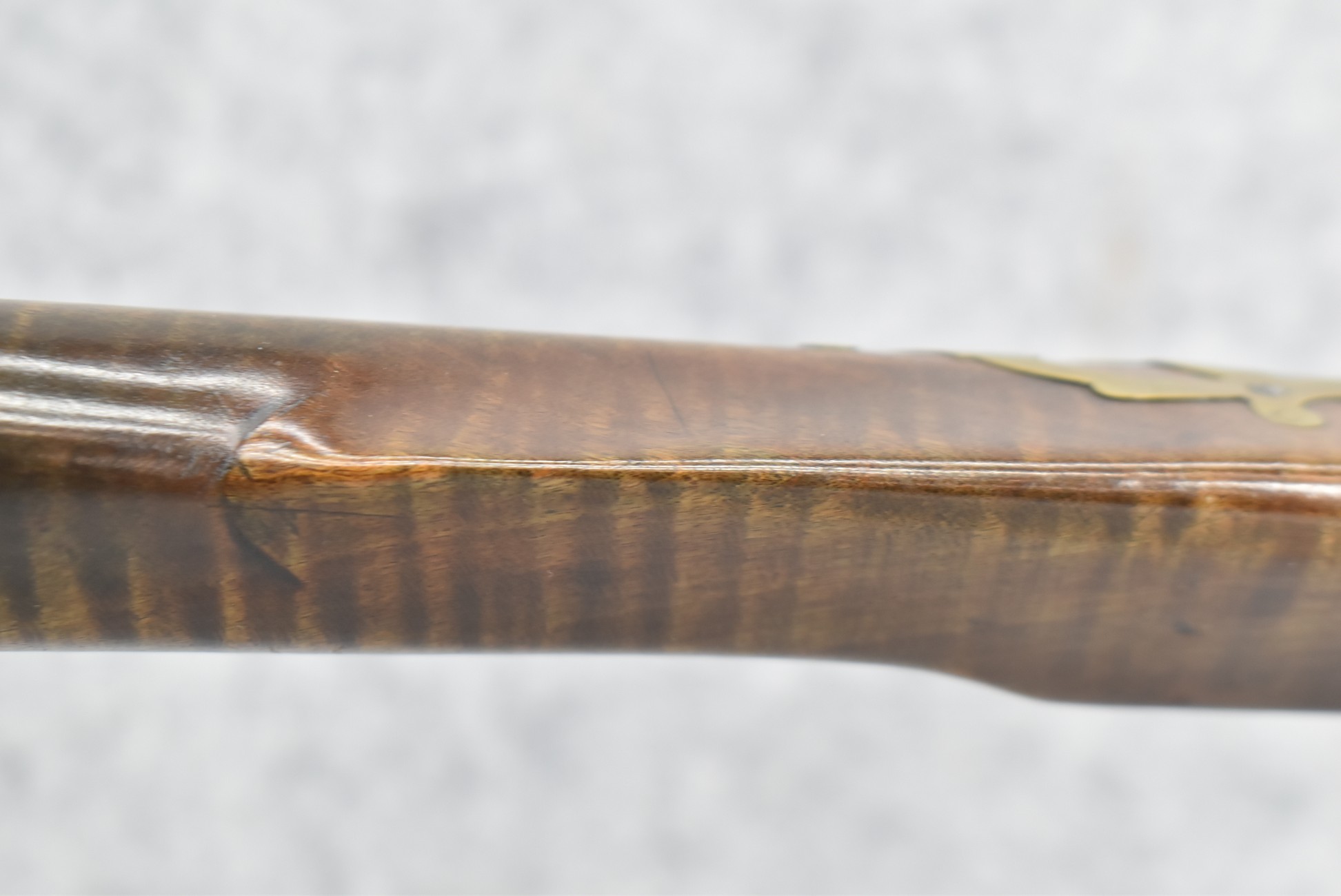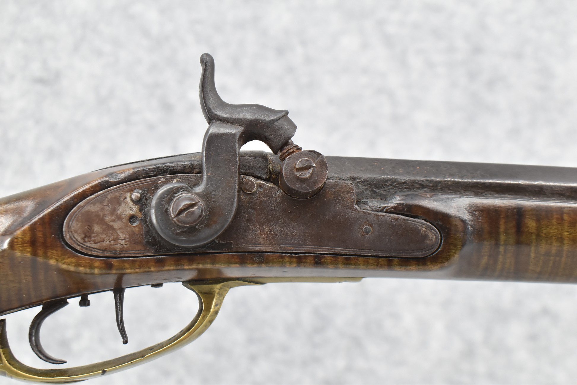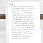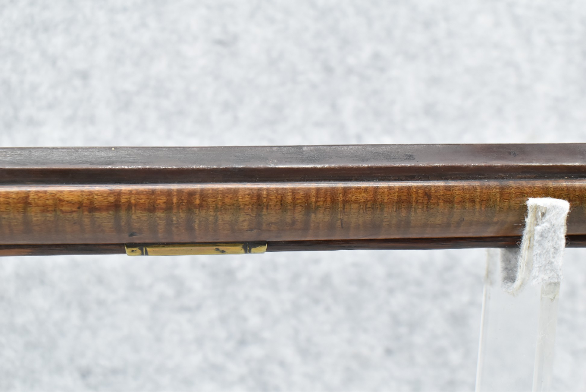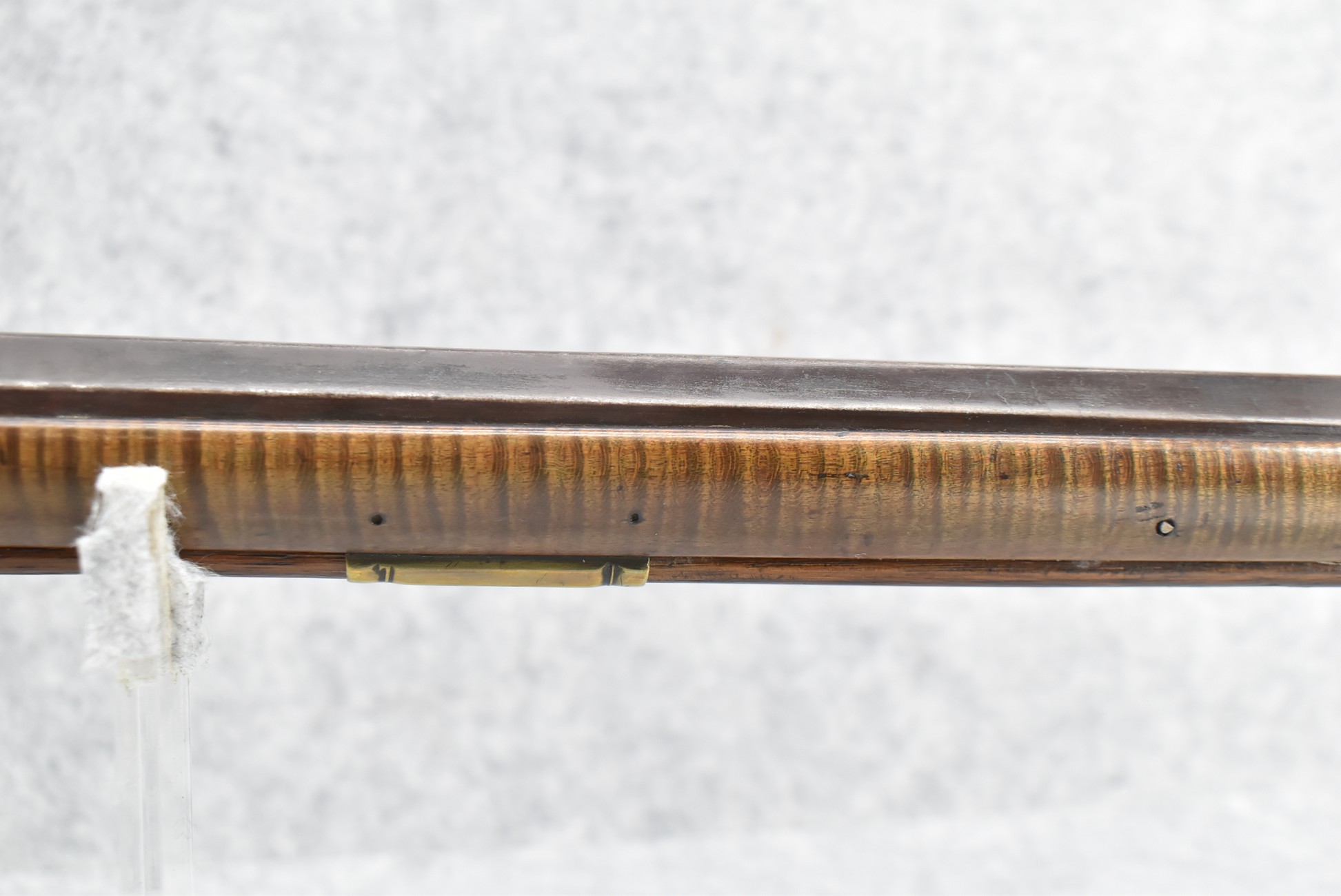 156.        Signed W. Blain Barrel Percussion Kentucky Long Rifle – w/40 Cal. 39” Octagon Barrel w/Front & Rear Barrels Sights – w/Refinished Full Length Wood Stock w/4pc. Engraved Patch Box (Identical Patch Box in “Kentucky Rifle Patch Boxes Vol. 2” by Chandler & Whisker) & Brass Furniture – w/Double Set Triggers – Note:  Crack in Fore Stock – Overall Length of 55” – W. Blain Died in 1852.  In 1823 He Was Located in Brothers Valley Twp., Somerset County & Between 1827-1852 He Was Located in Donegal Twp., Westmoreland County, PA