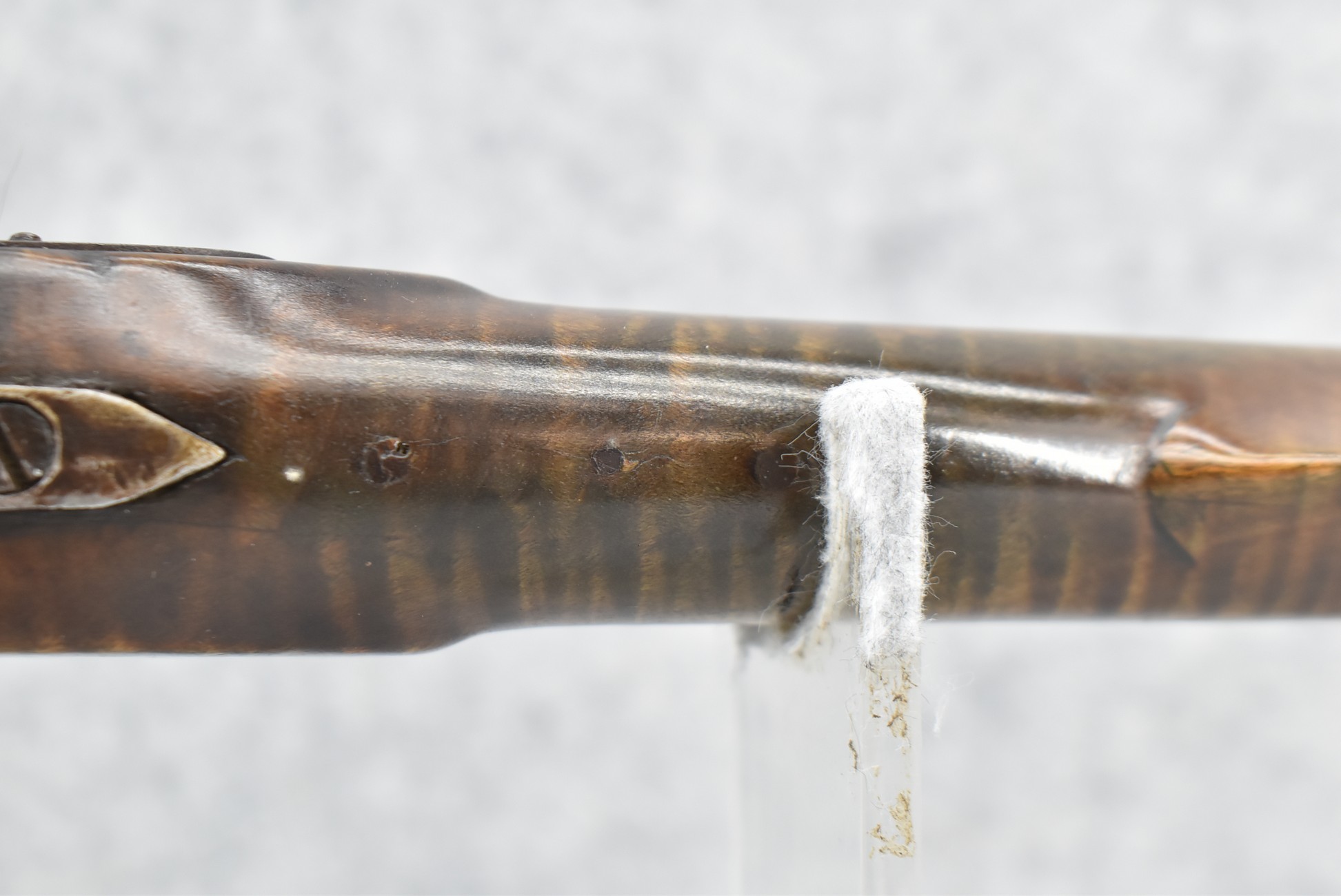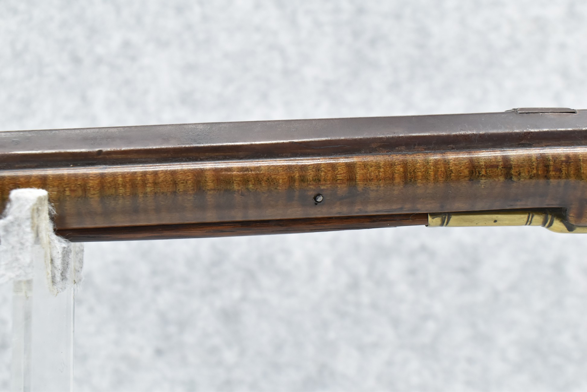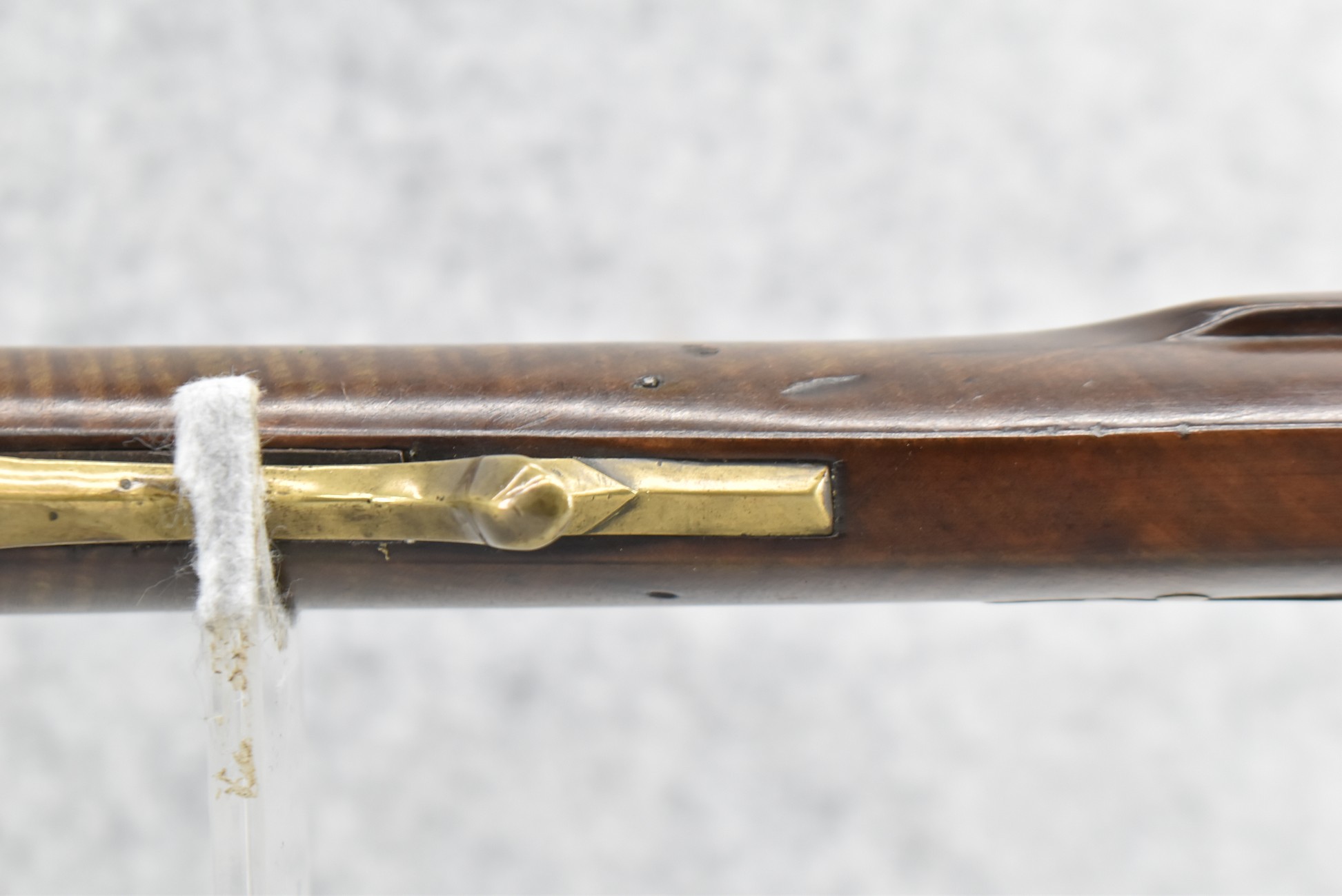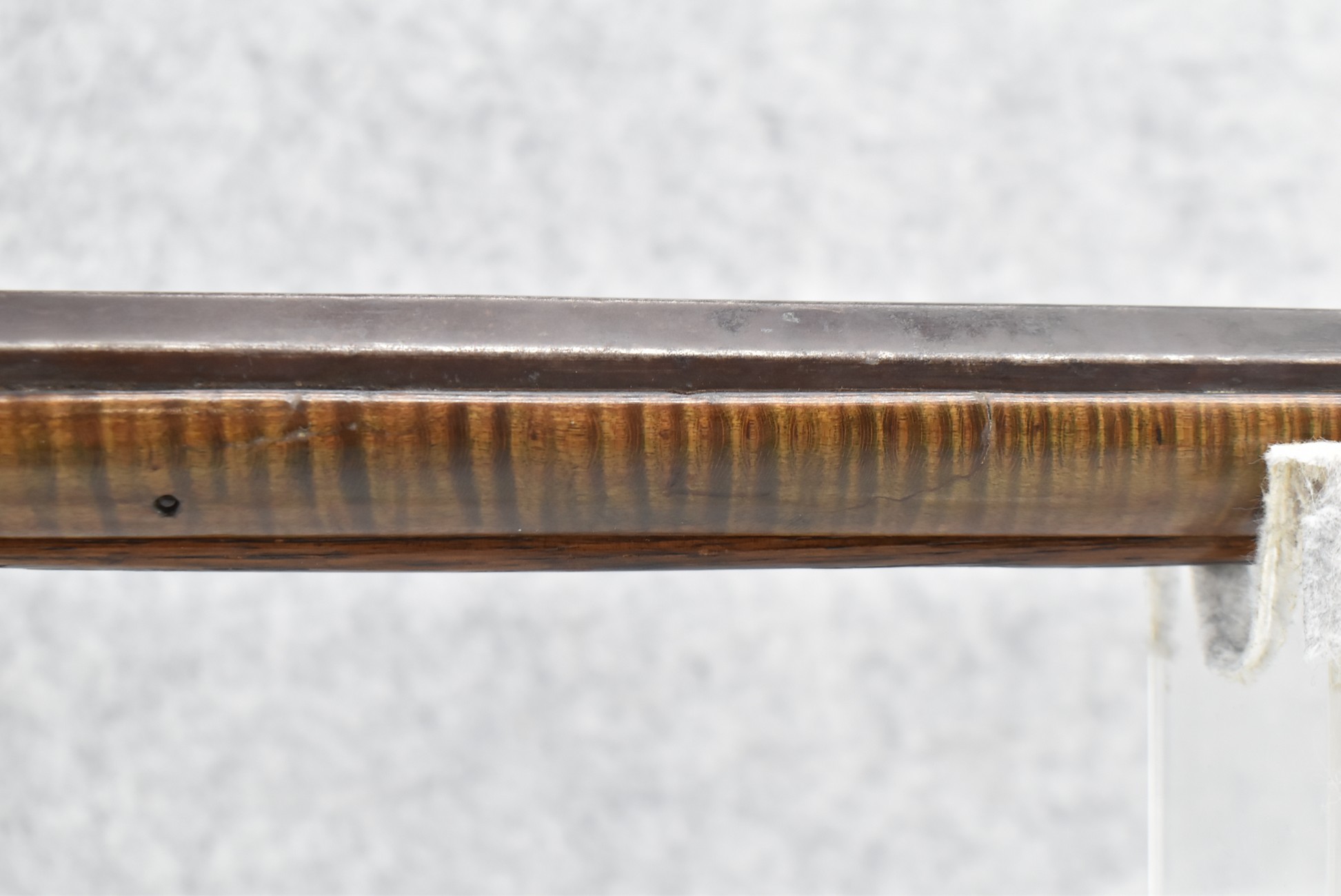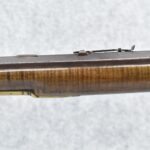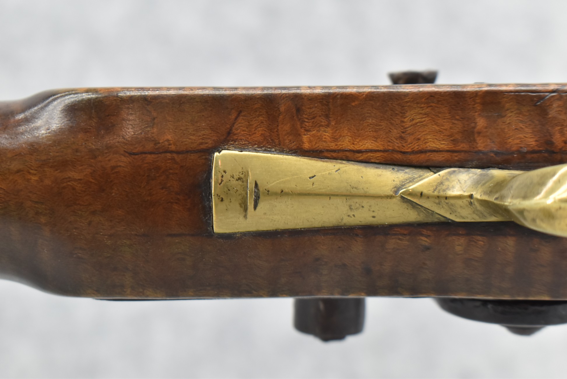 156.        Signed W. Blain Barrel Percussion Kentucky Long Rifle – w/40 Cal. 39” Octagon Barrel w/Front & Rear Barrels Sights – w/Refinished Full Length Wood Stock w/4pc. Engraved Patch Box (Identical Patch Box in “Kentucky Rifle Patch Boxes Vol. 2” by Chandler & Whisker) & Brass Furniture – w/Double Set Triggers – Note:  Crack in Fore Stock – Overall Length of 55” – W. Blain Died in 1852.  In 1823 He Was Located in Brothers Valley Twp., Somerset County & Between 1827-1852 He Was Located in Donegal Twp., Westmoreland County, PA
